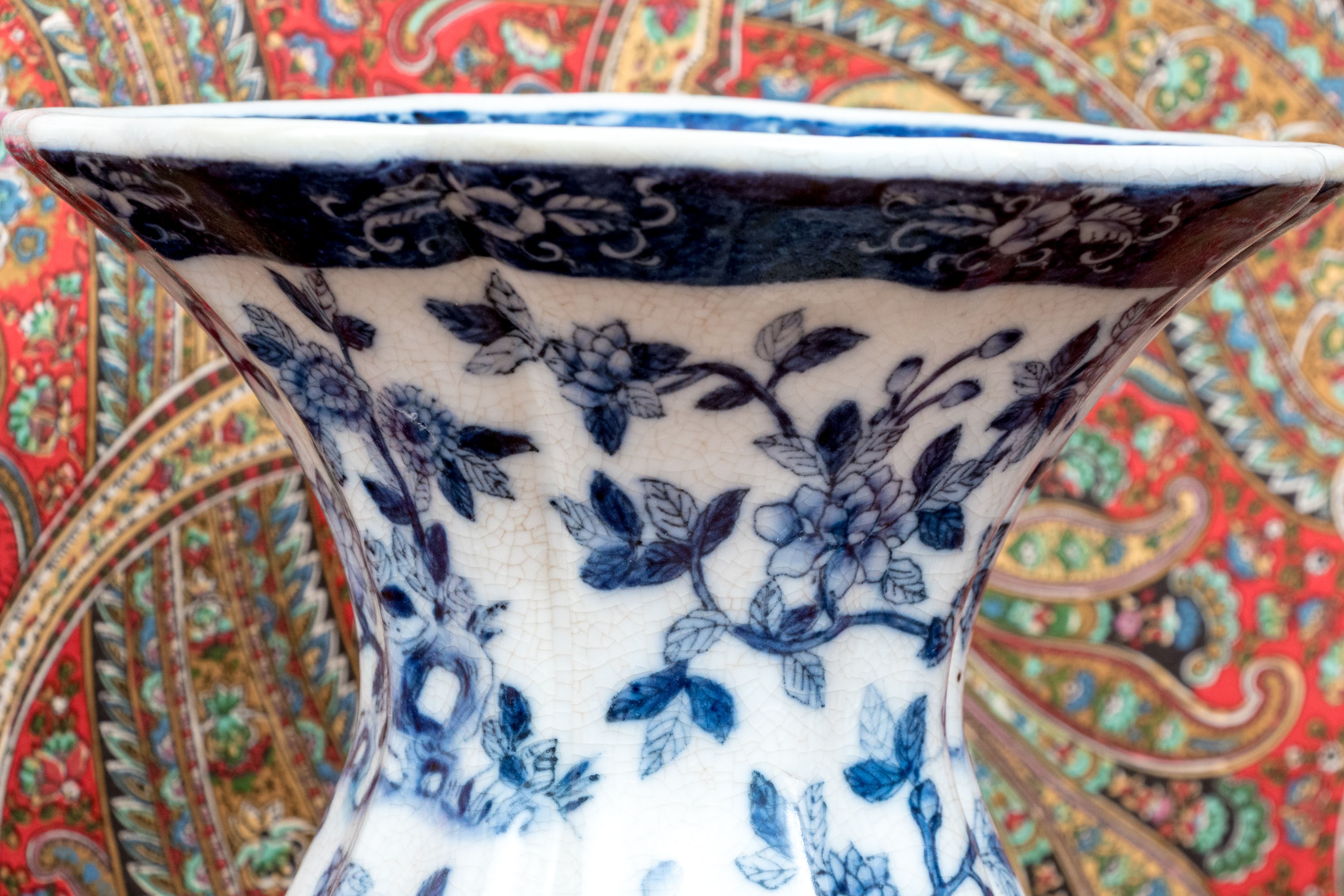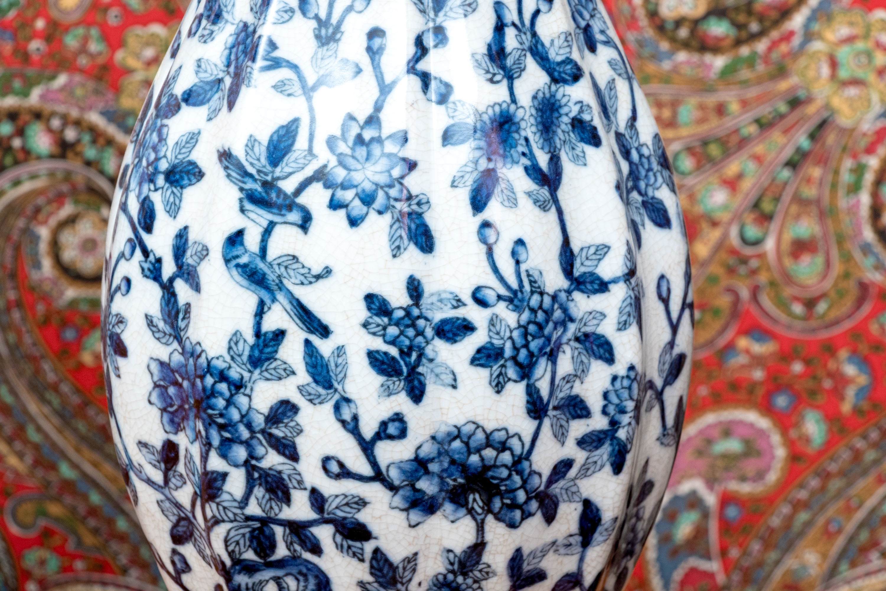 A handsome pair of porcelain vases showcasing wide flared rims and pear bombe form bodies over raised cylindrical bases. Finely decorated with monochromatic blue flowering vines throughout, finished with a darker blue rim and base. Marked underfoot.