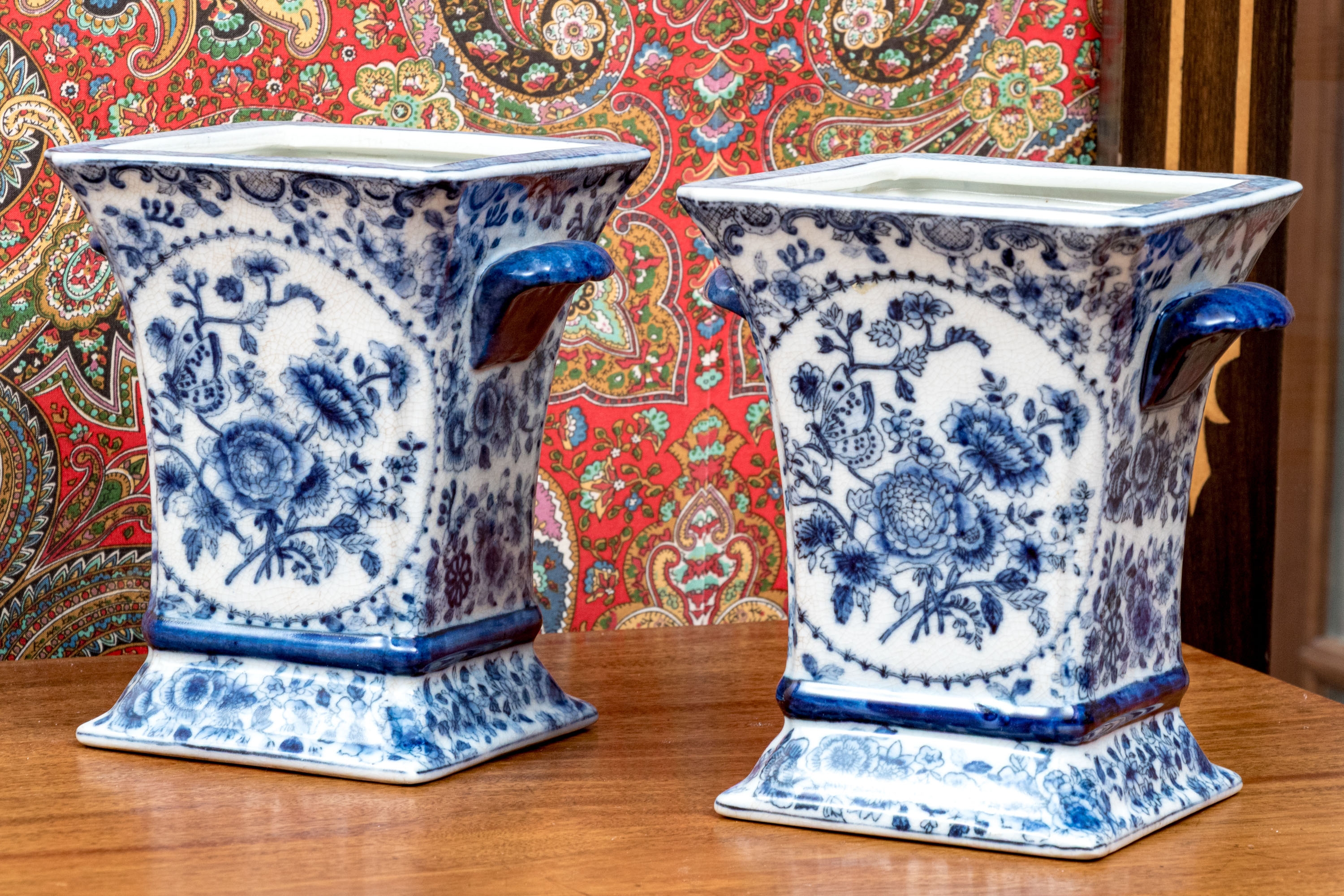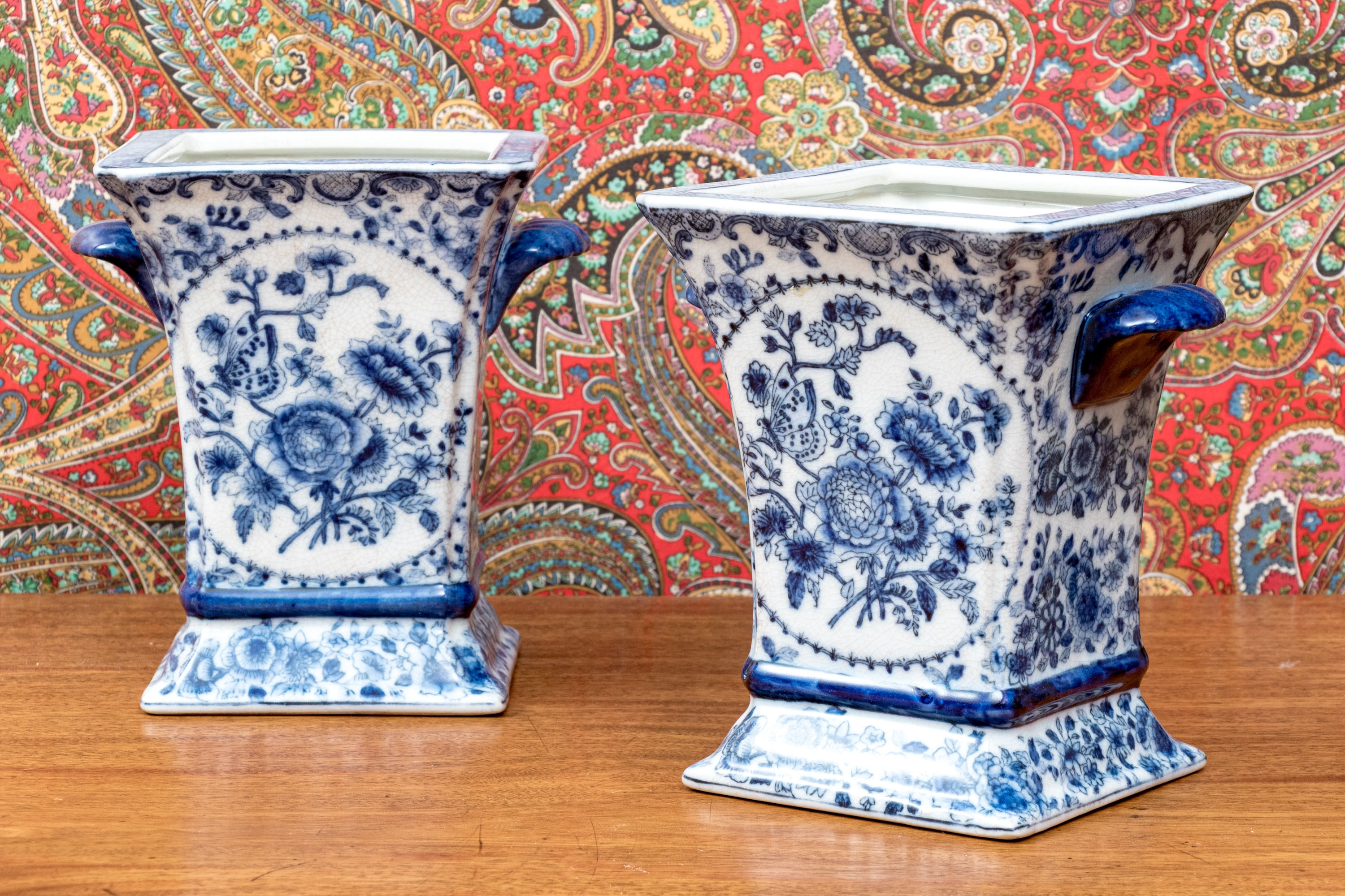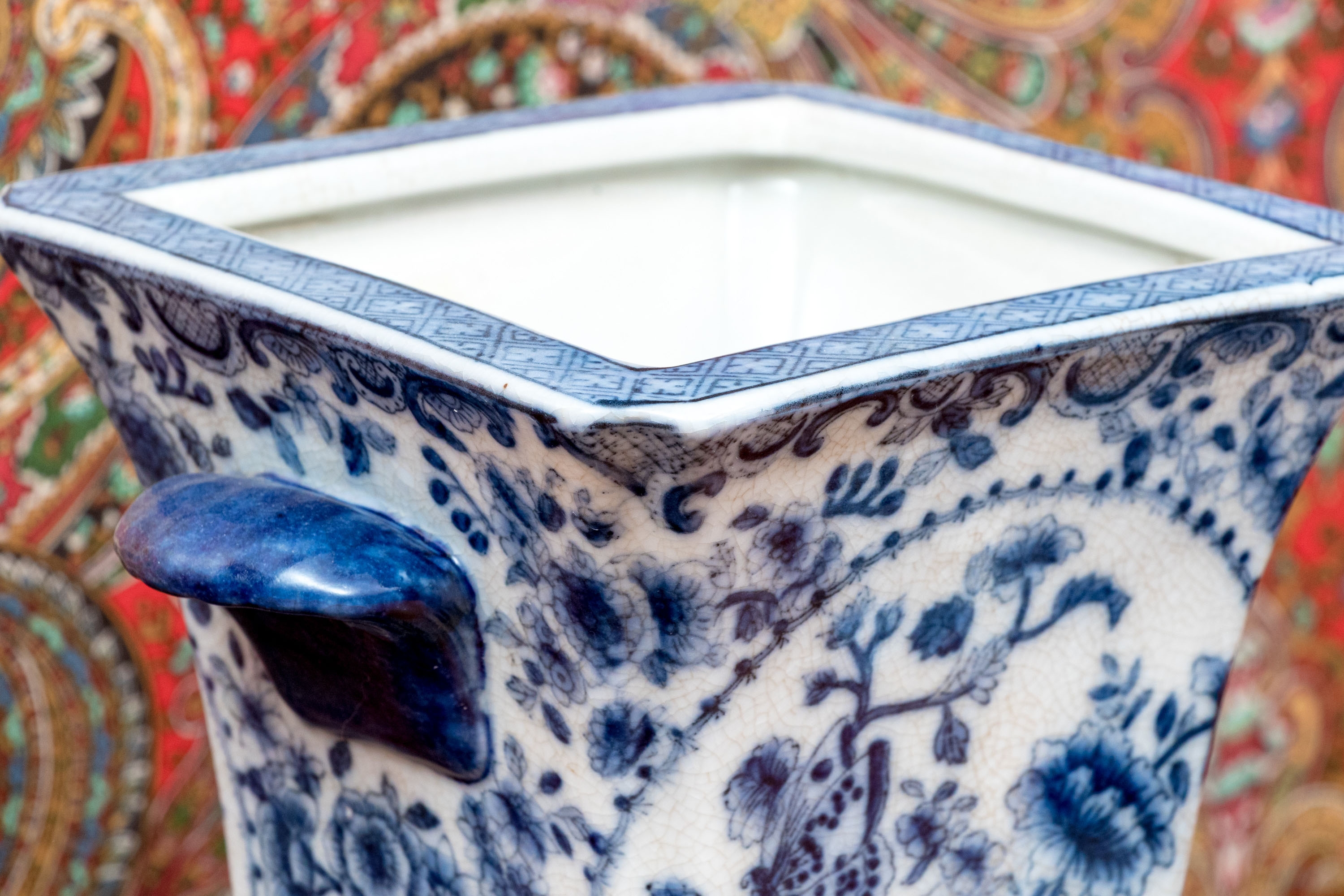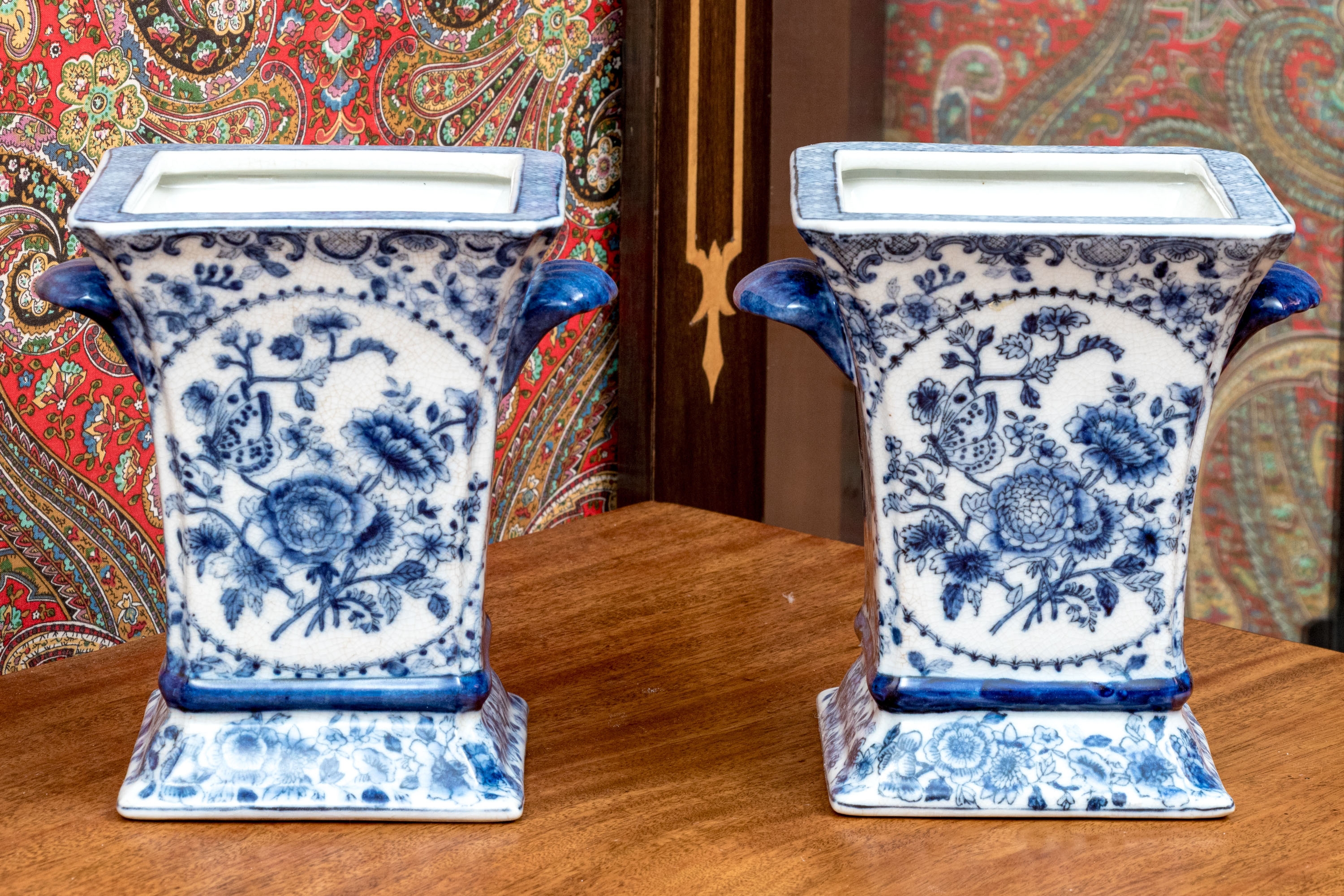 A fabulous pair of export style porcelain vases with tapered rectangular forms over beveled rectangular feet, decorated with twin bracket handles and large center reserves showcasing butterflies on large flowering branches in monochromatic blue underglaze and fine crackle glaze. Marked underfoot.