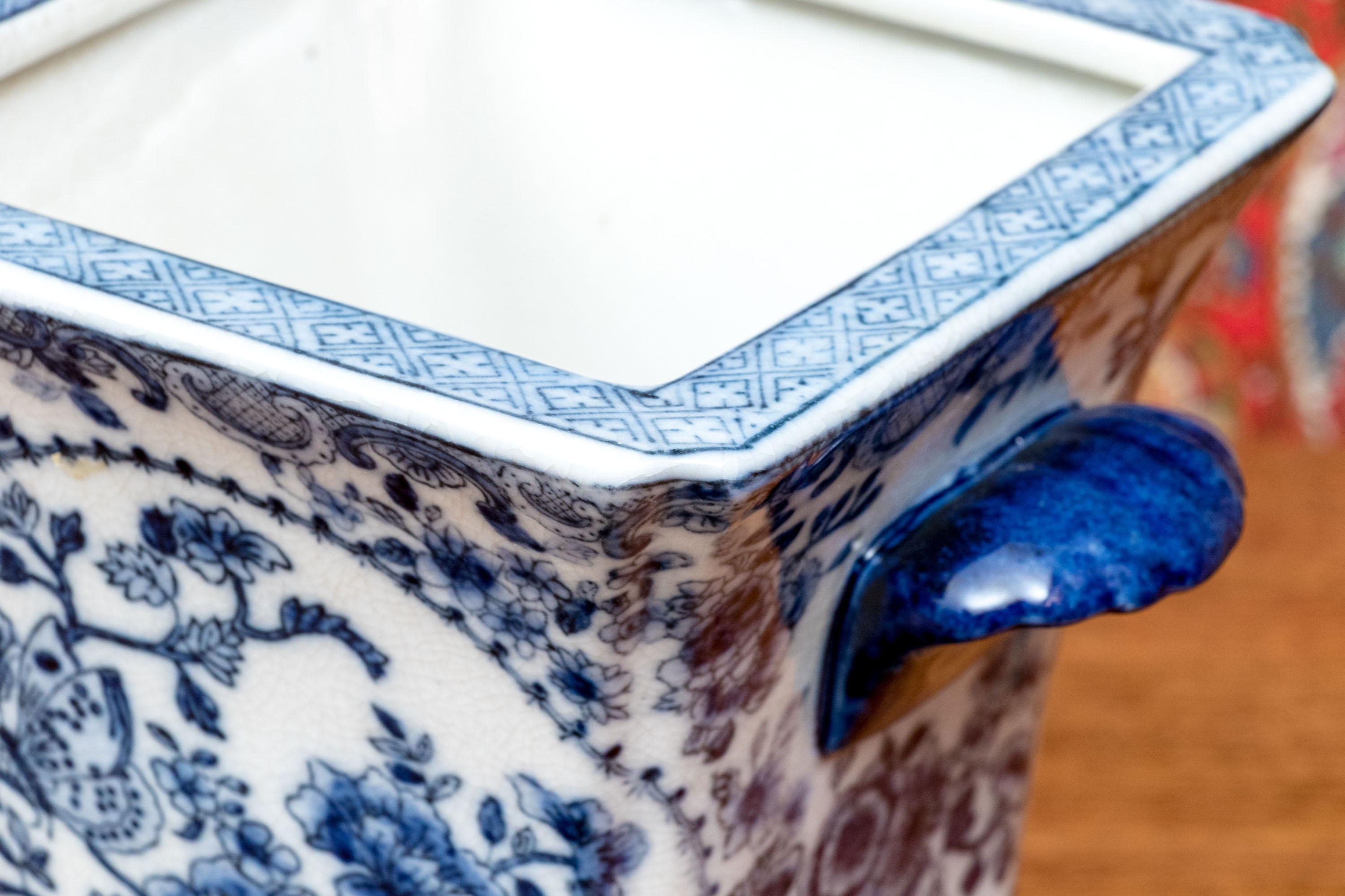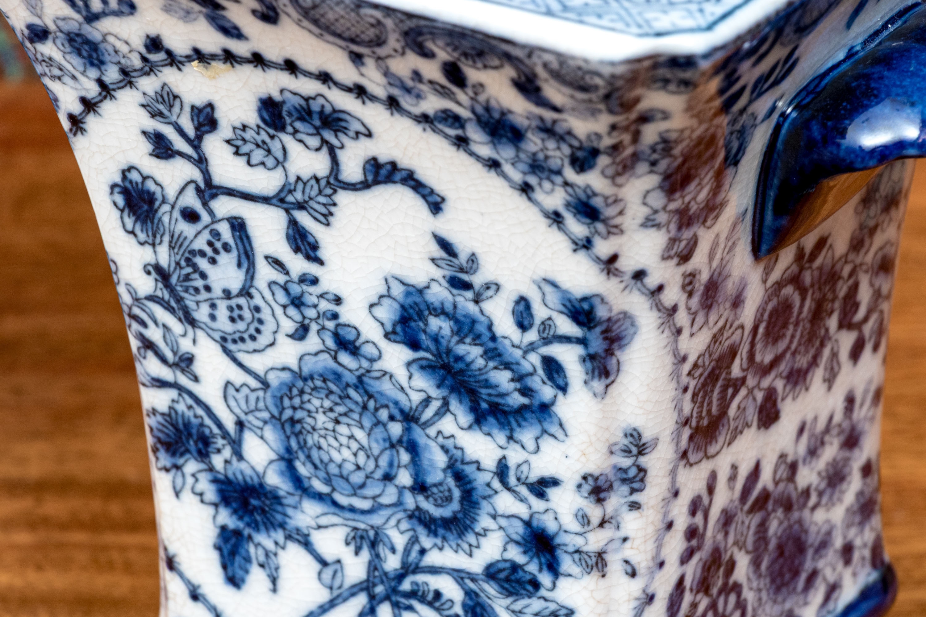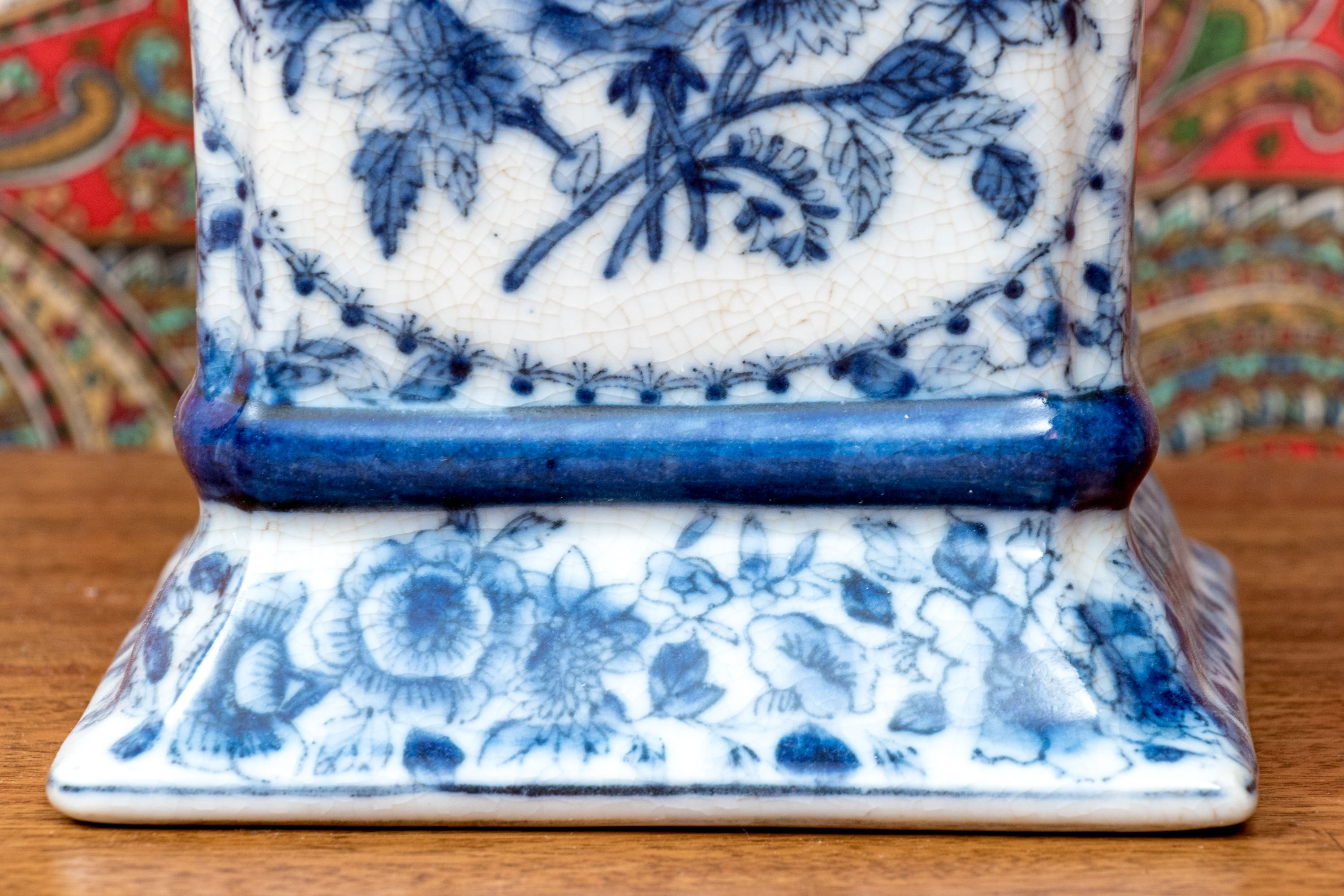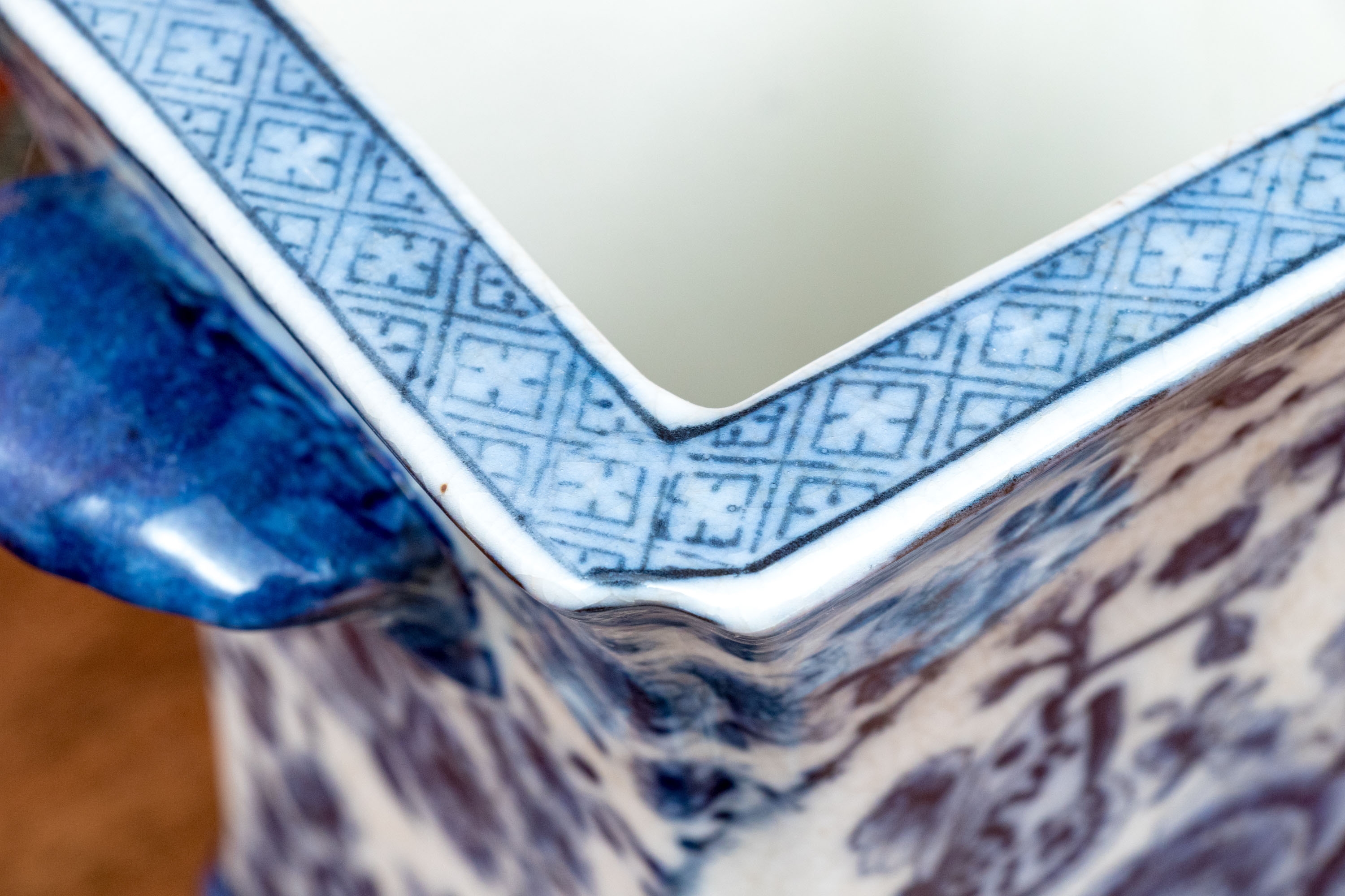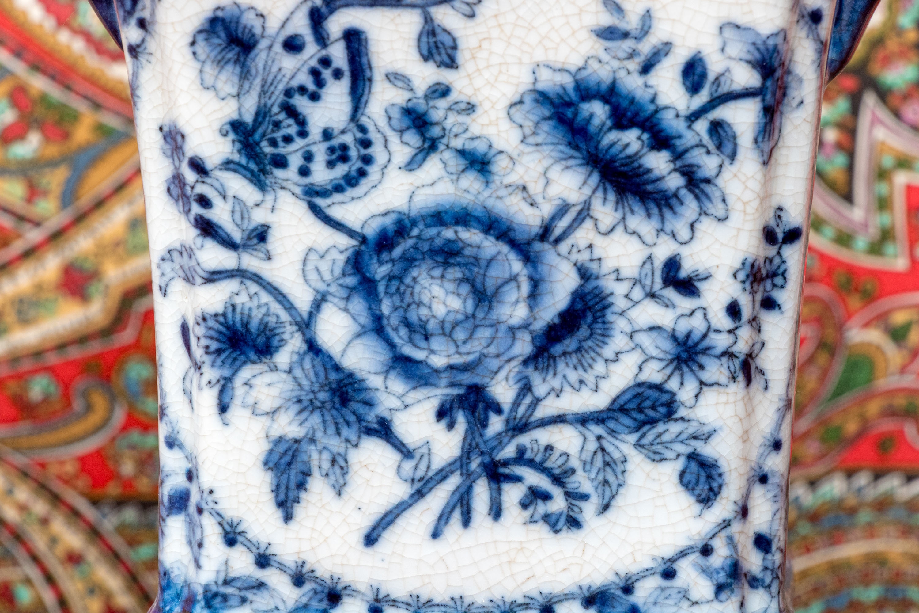 A fabulous pair of export style porcelain vases with tapered rectangular forms over beveled rectangular feet, decorated with twin bracket handles and large center reserves showcasing butterflies on large flowering branches in monochromatic blue underglaze and fine crackle glaze. Marked underfoot.
