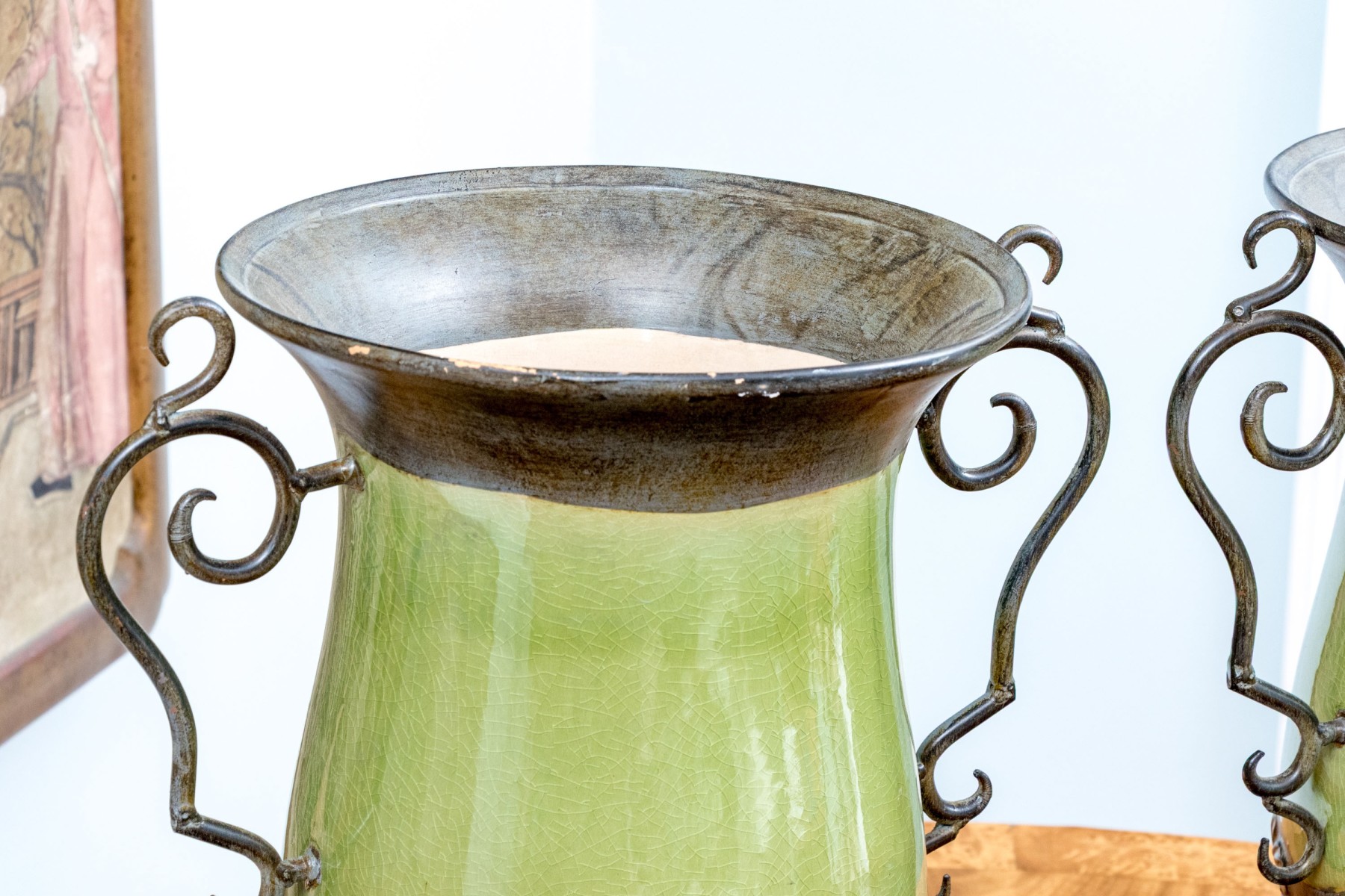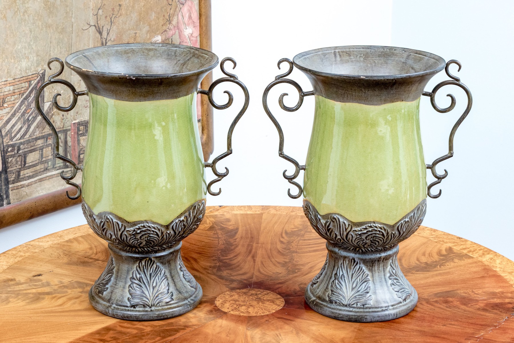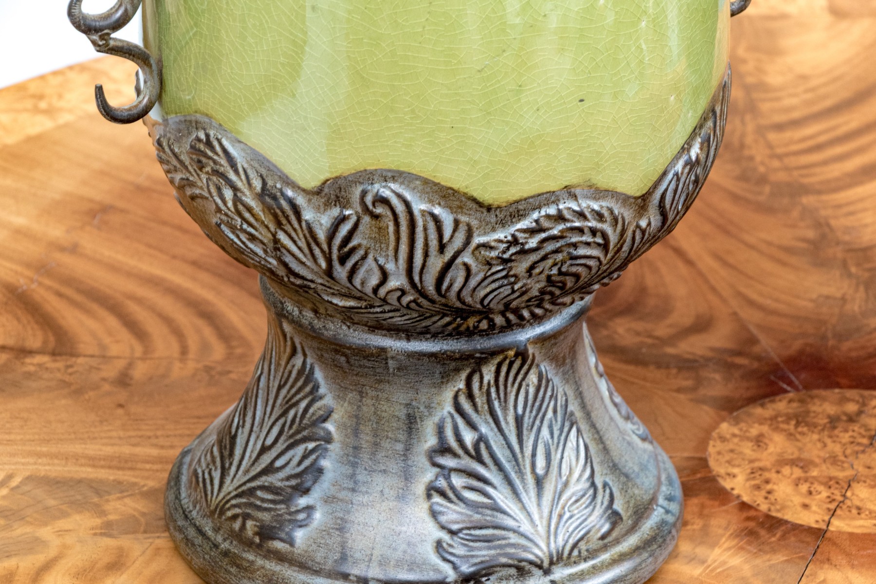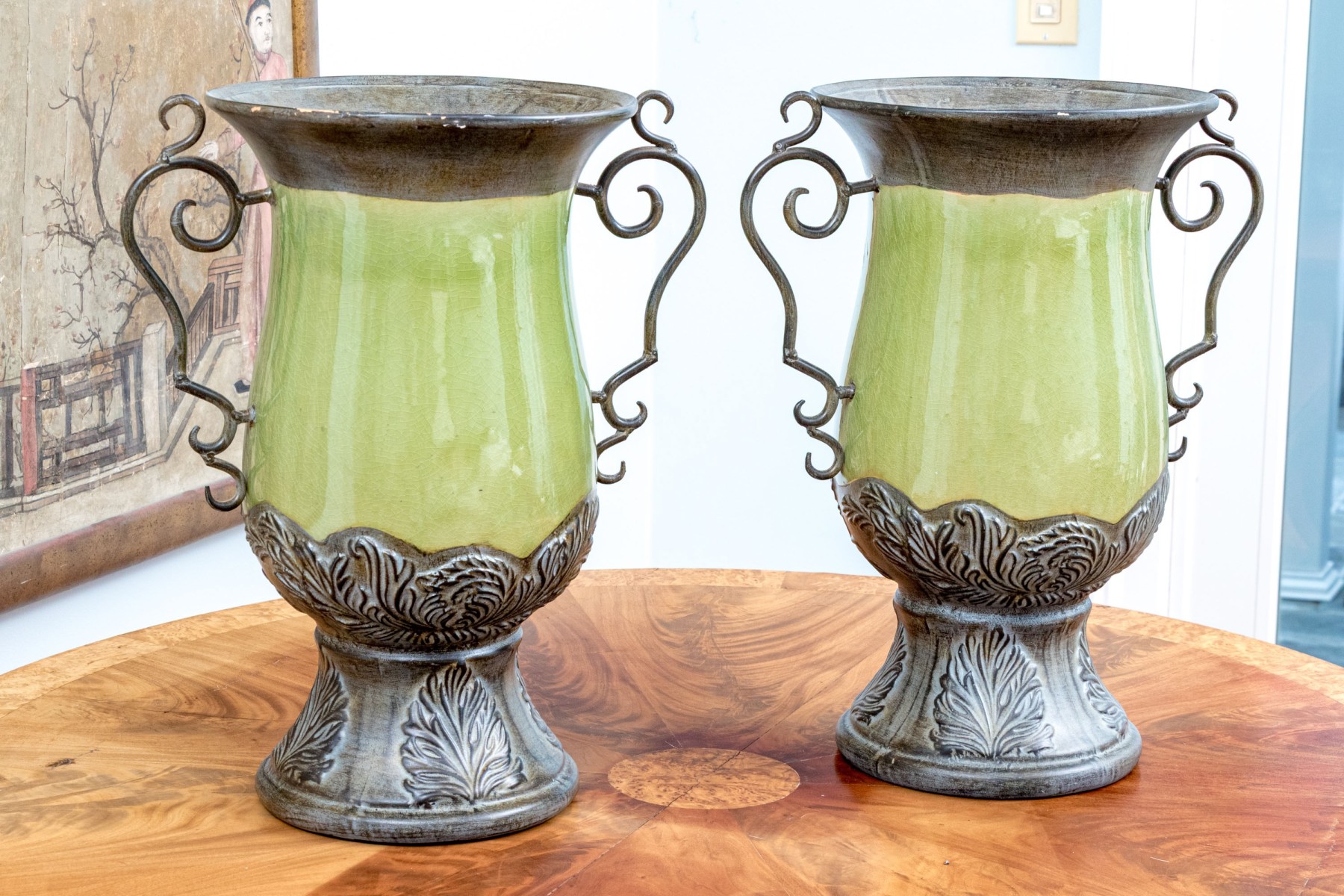 A stylish pair of Neoclassical style vases or urns with metallic finished flared rims, scrolled twin handles, and spring green crackle glazed bodies on metallic pedestal feet with lush foliate relief.