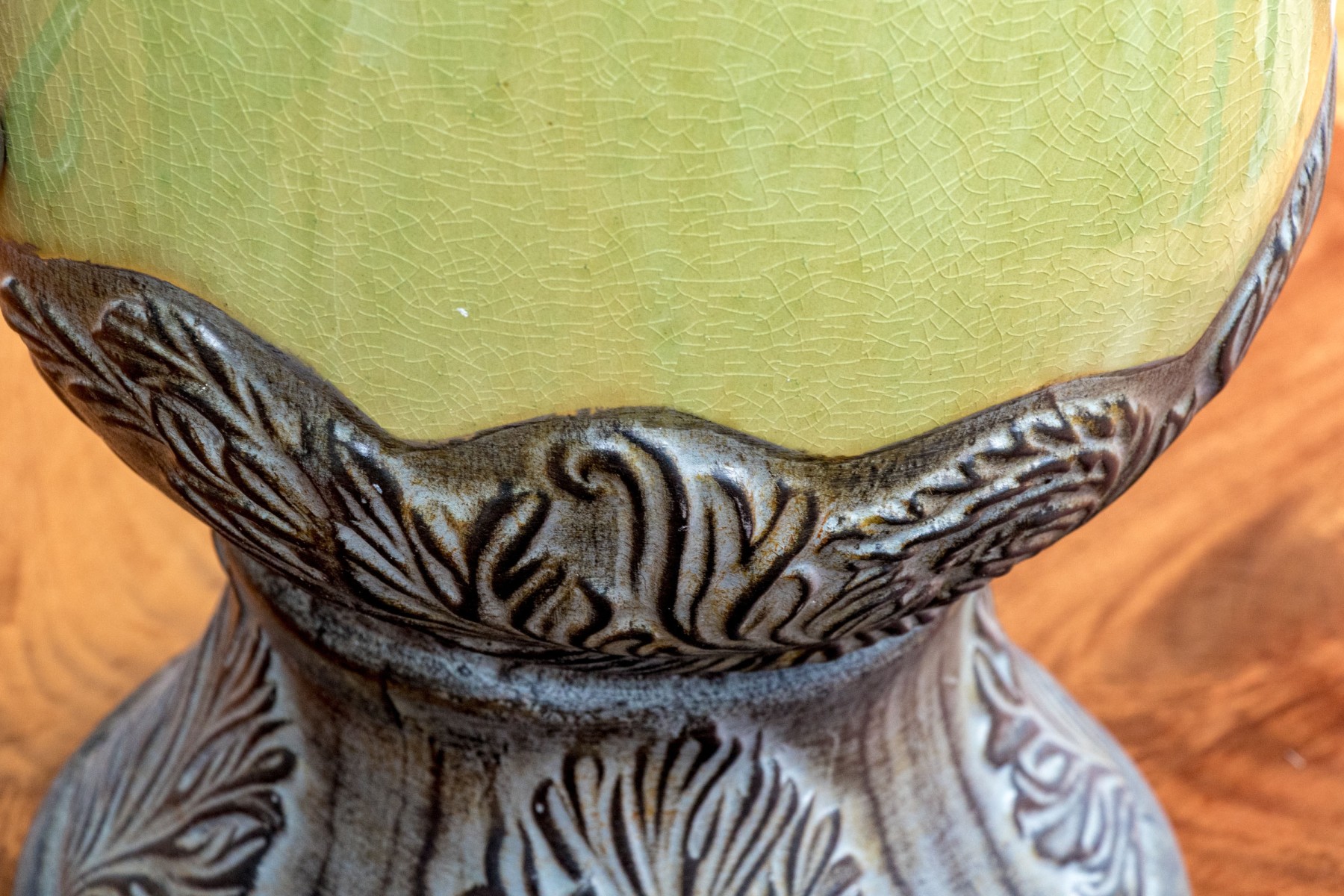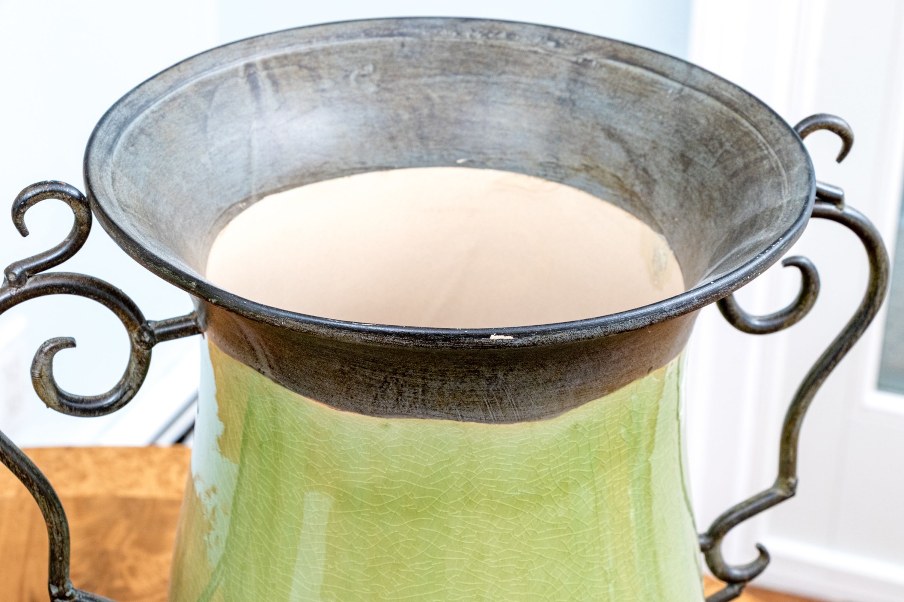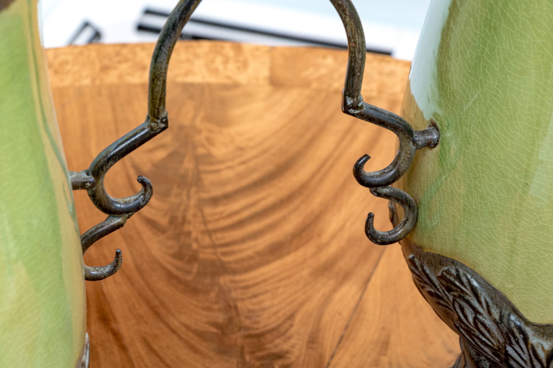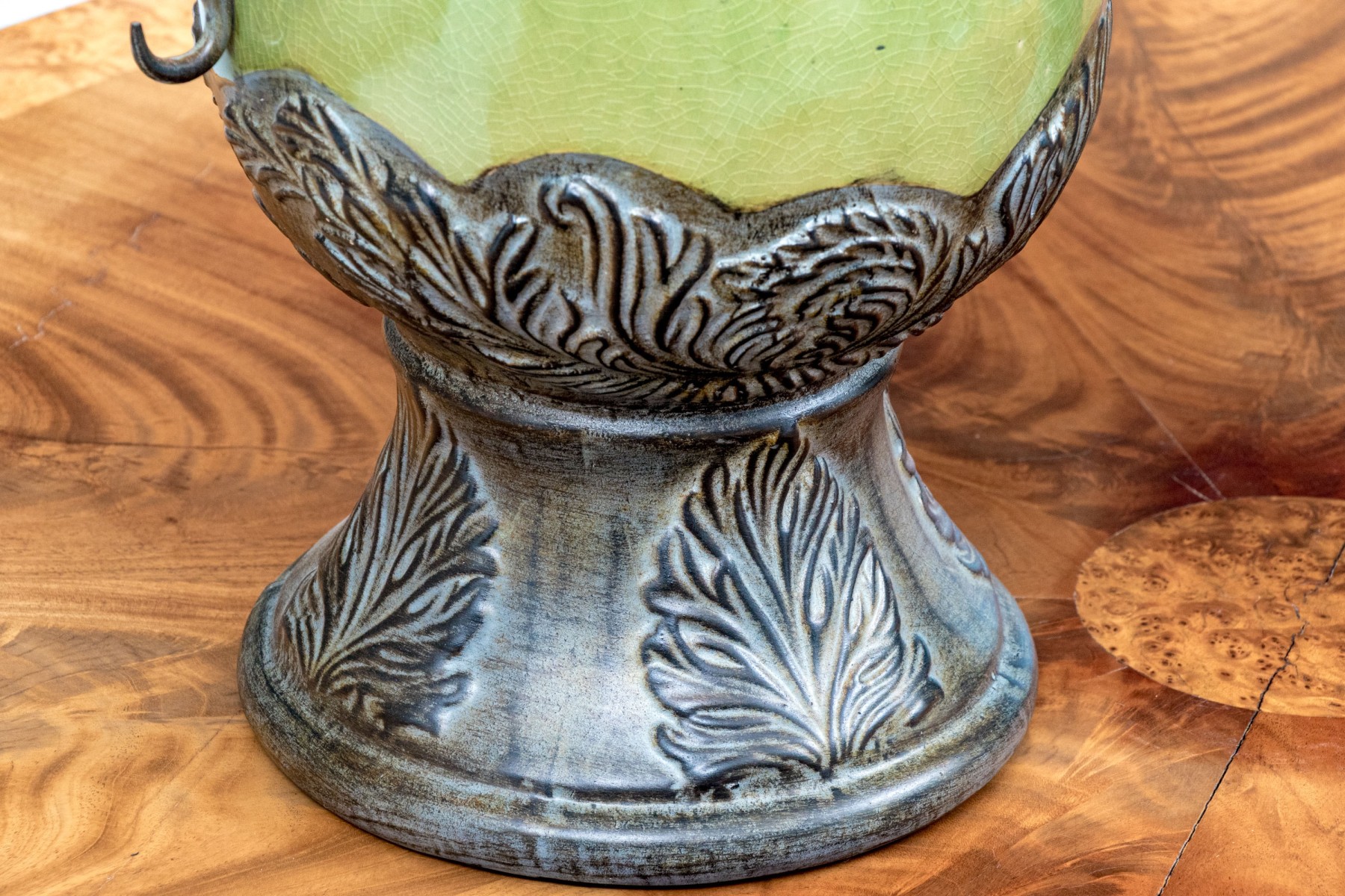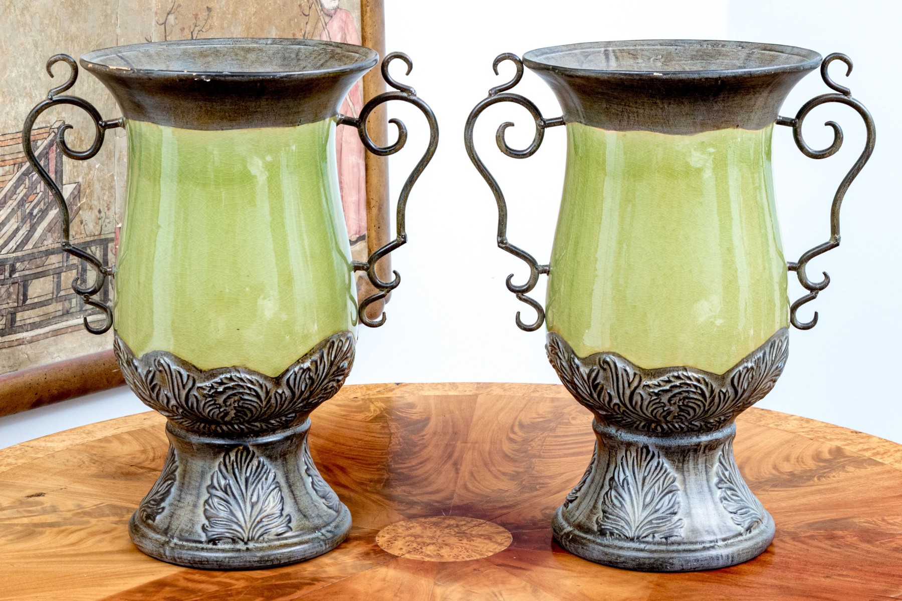 A stylish pair of Neoclassical style vases or urns with metallic finished flared rims, scrolled twin handles, and spring green crackle glazed bodies on metallic pedestal feet with lush foliate relief.