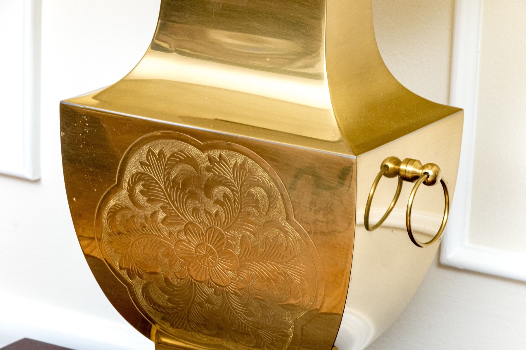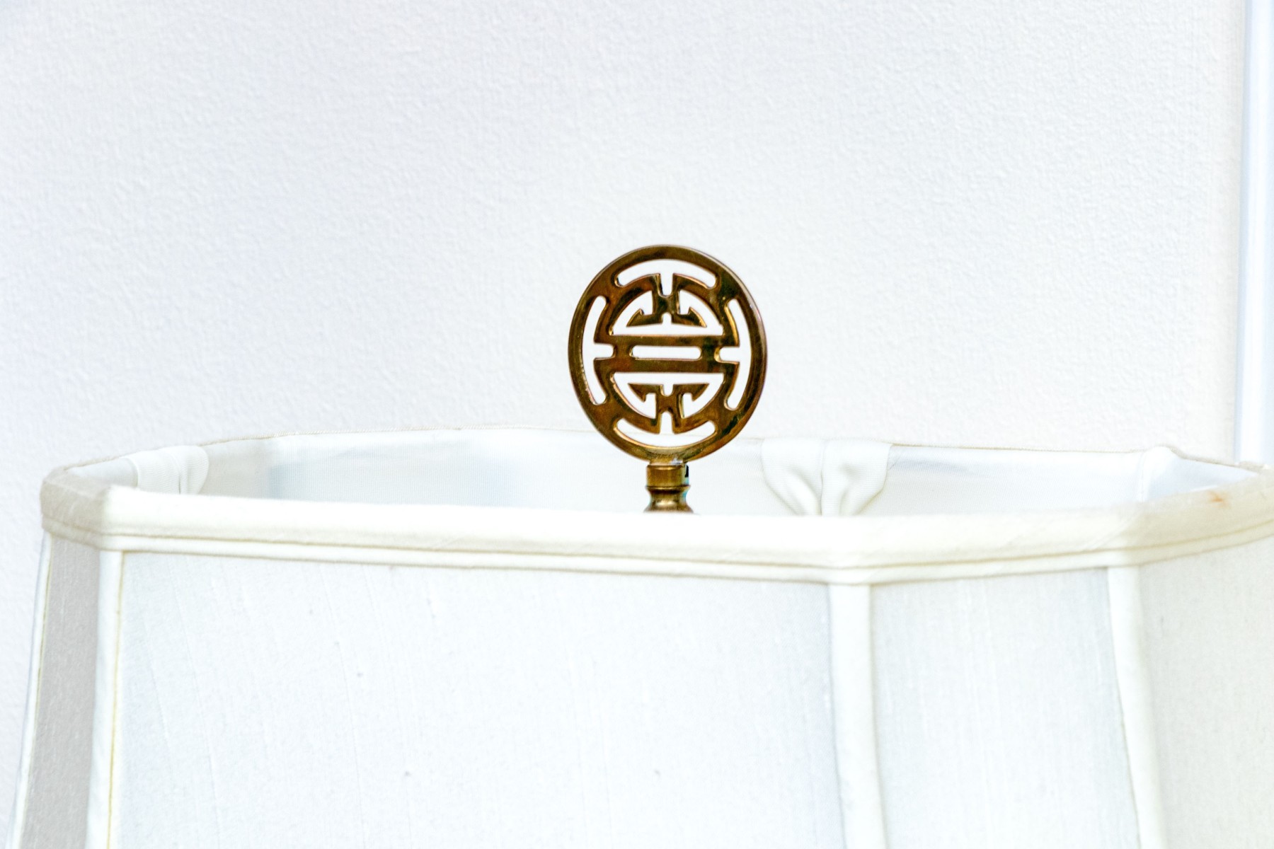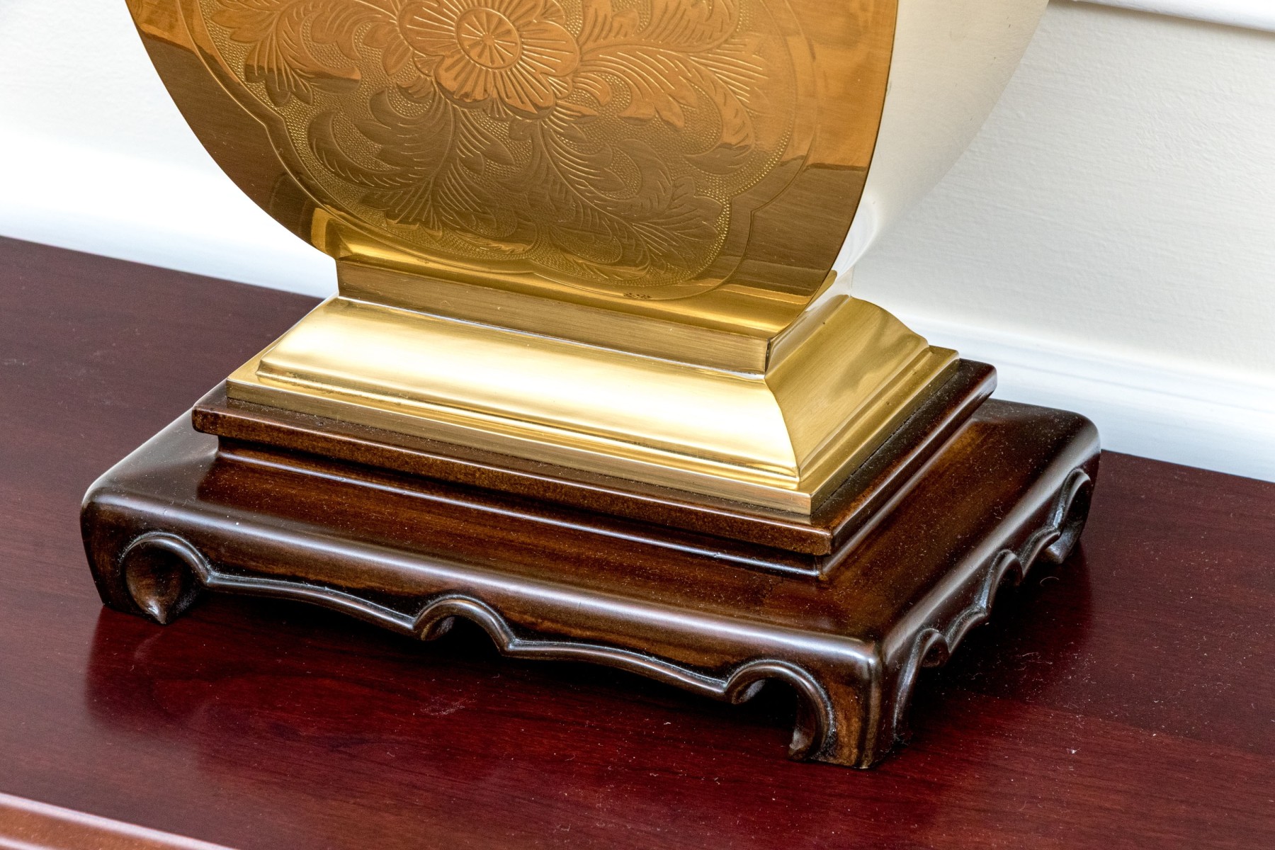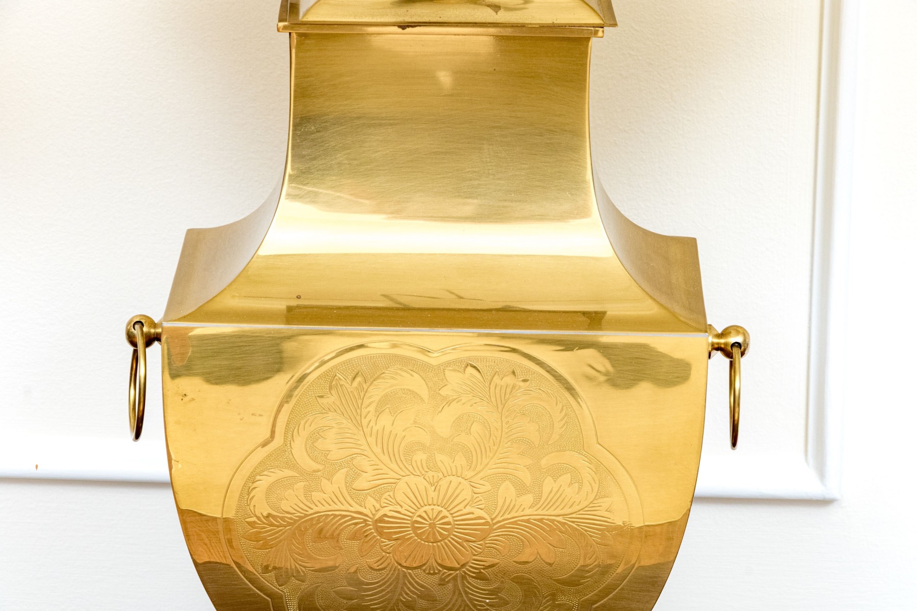 Twin handled footed brass vessel in the manner of a Neolithic vessel on wood stands with shades and Shou emblem brass finials.