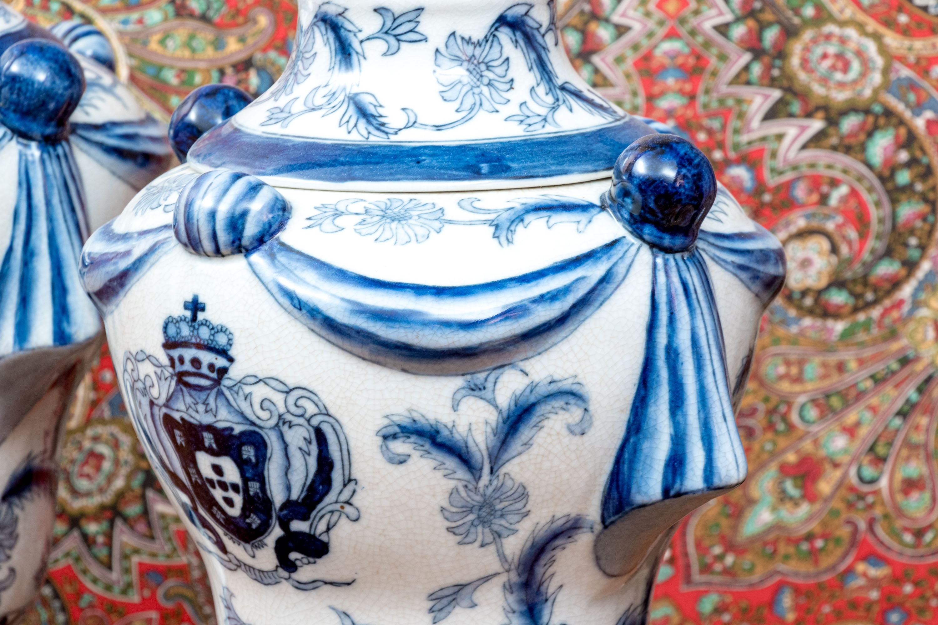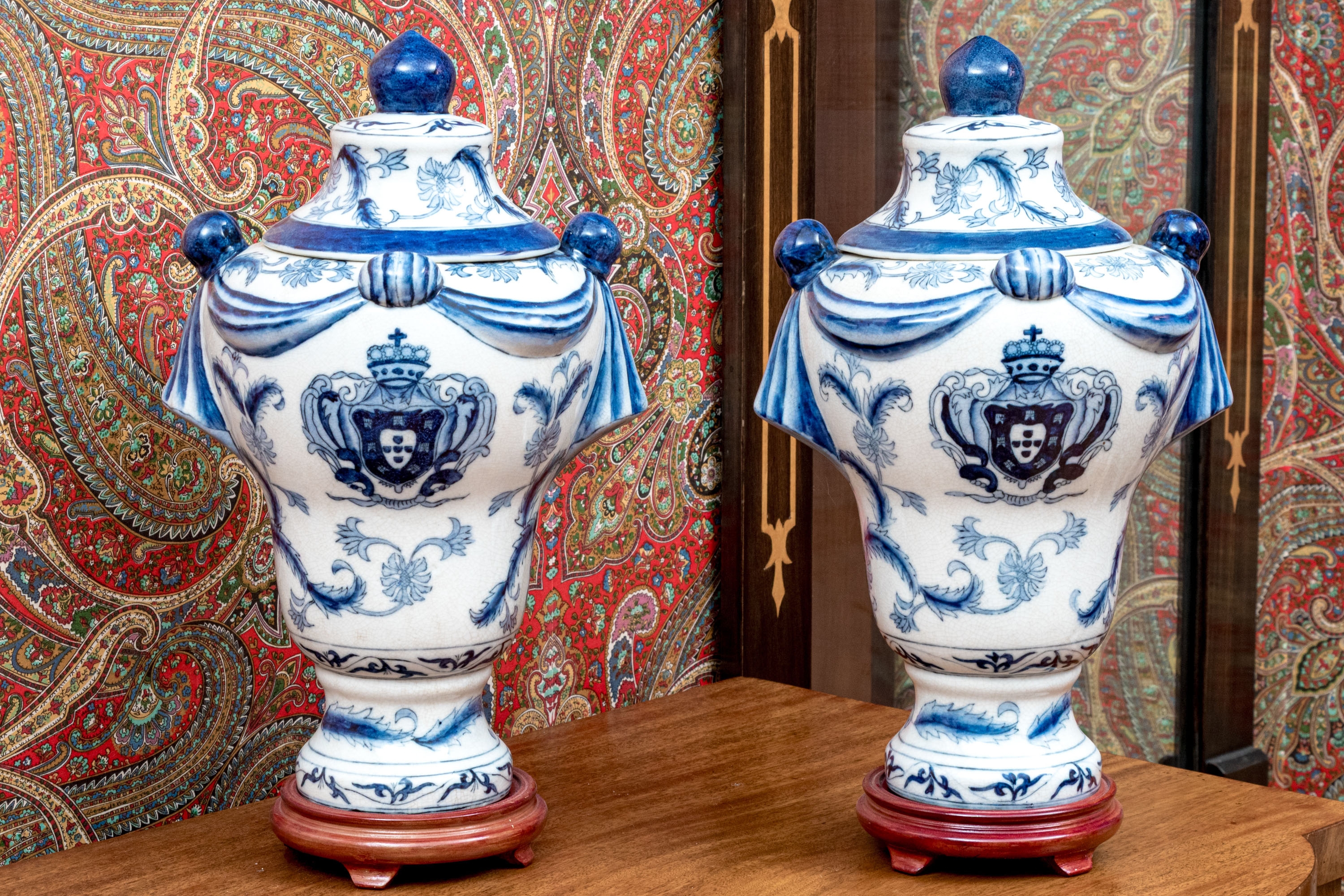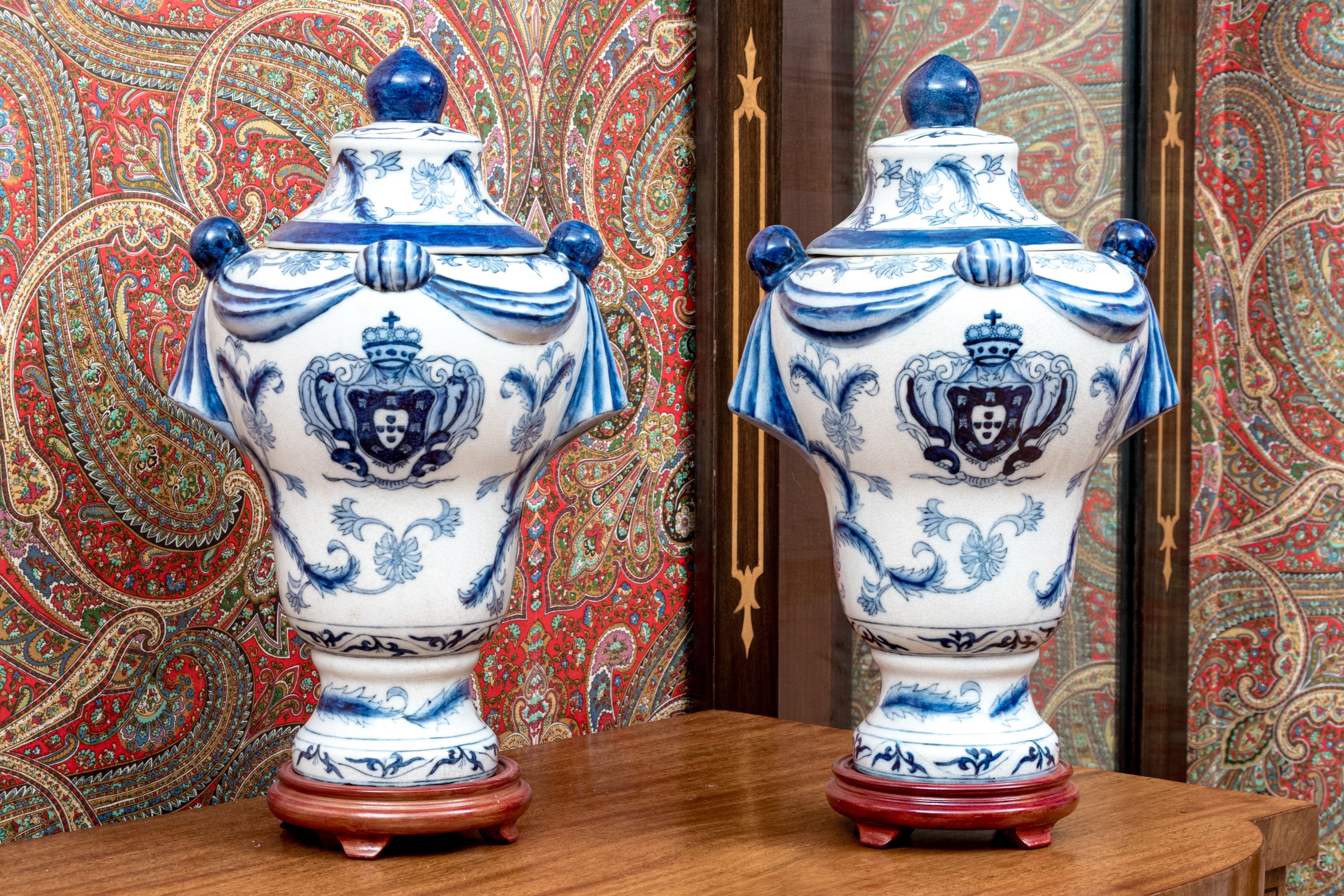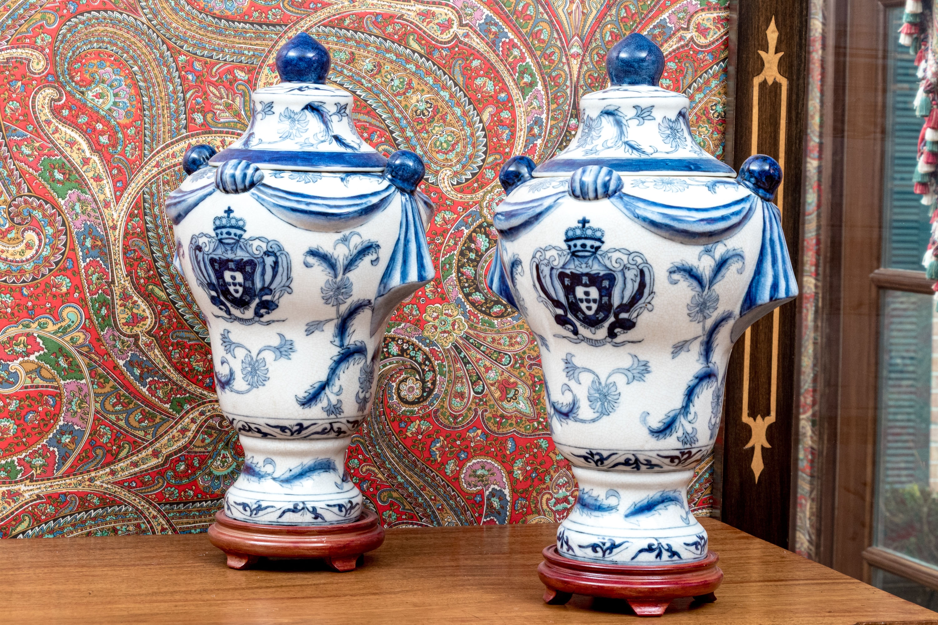 An impressive pair of porcelain urns showcasing large blue sphere finials over bell form lids atop shapely inverted pear bodies with raised feet. The shoulders of the jars are decorated with gorgeous faux drapery, leading to heraldic crowned shields at the center fronts surrounded by elegant scrolled foliage. Marked underfoot. Both jars are raised on fitted red-brown wood stands with feet.