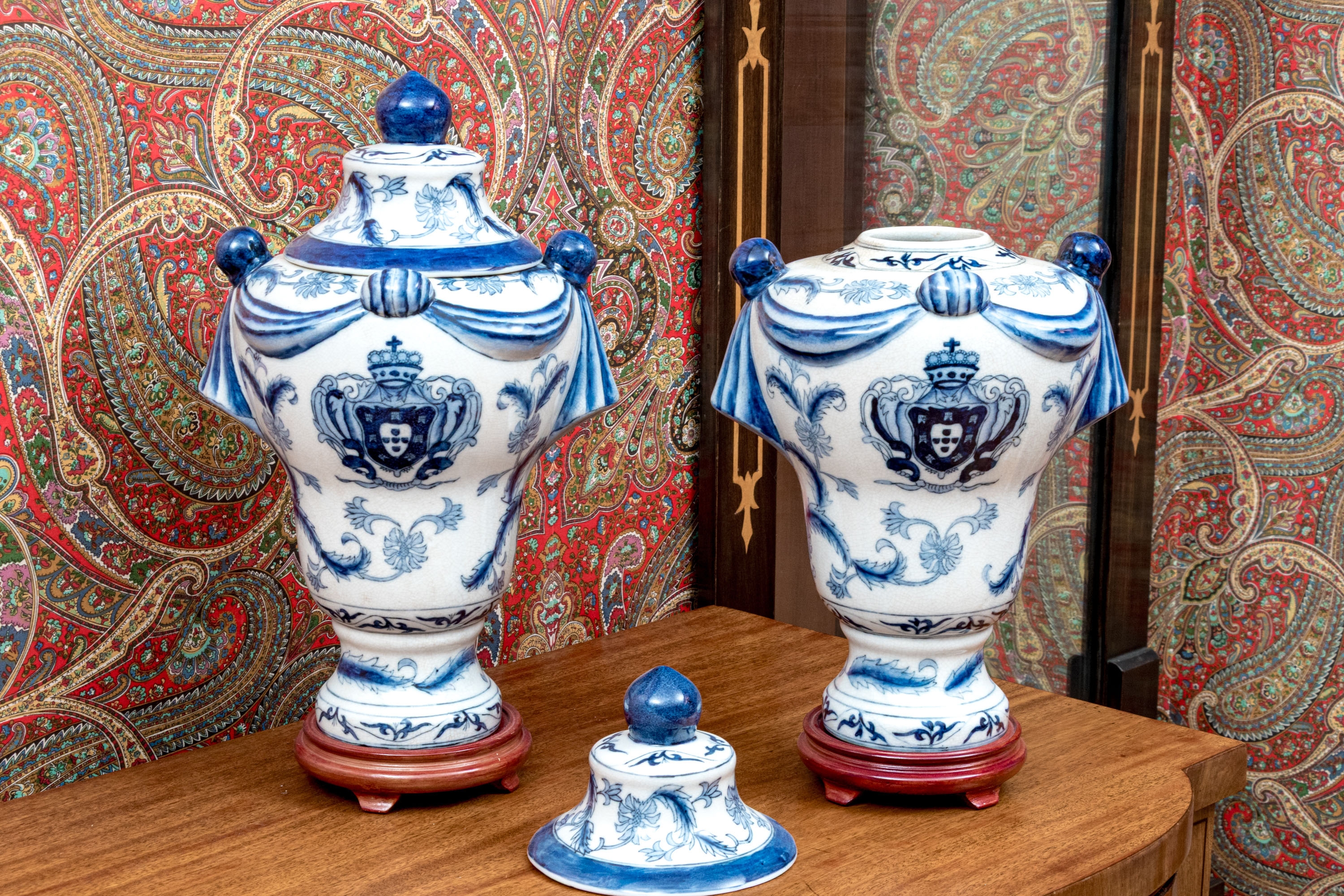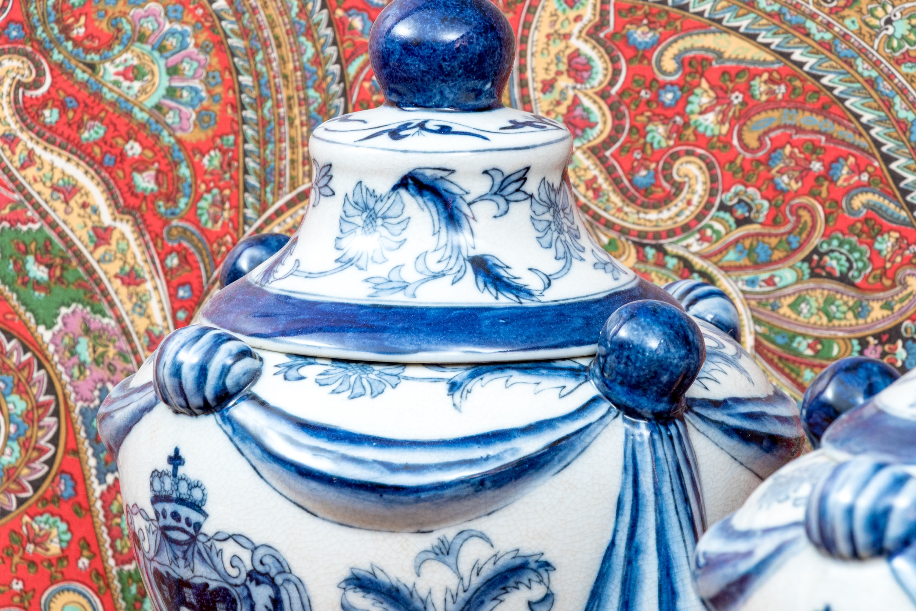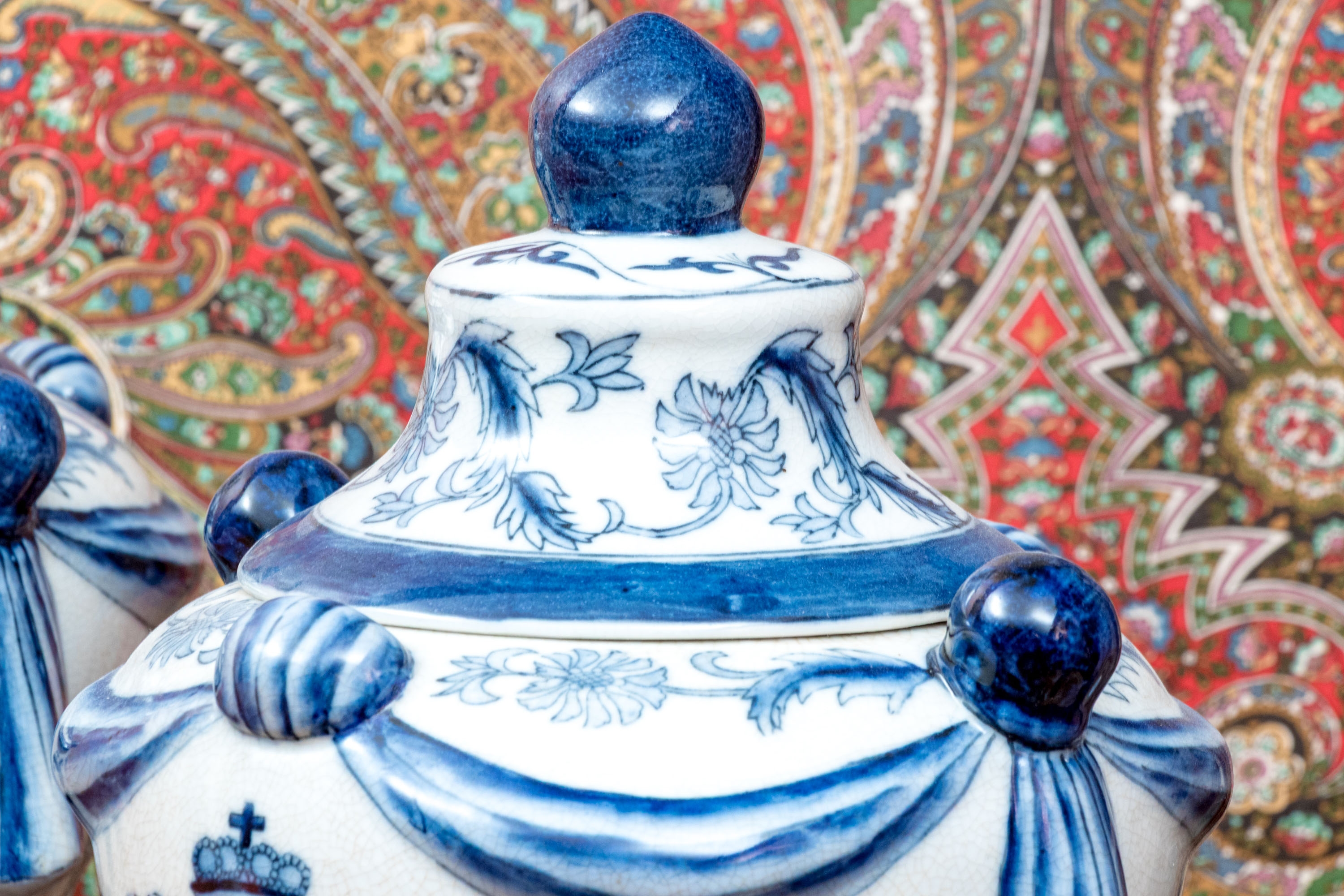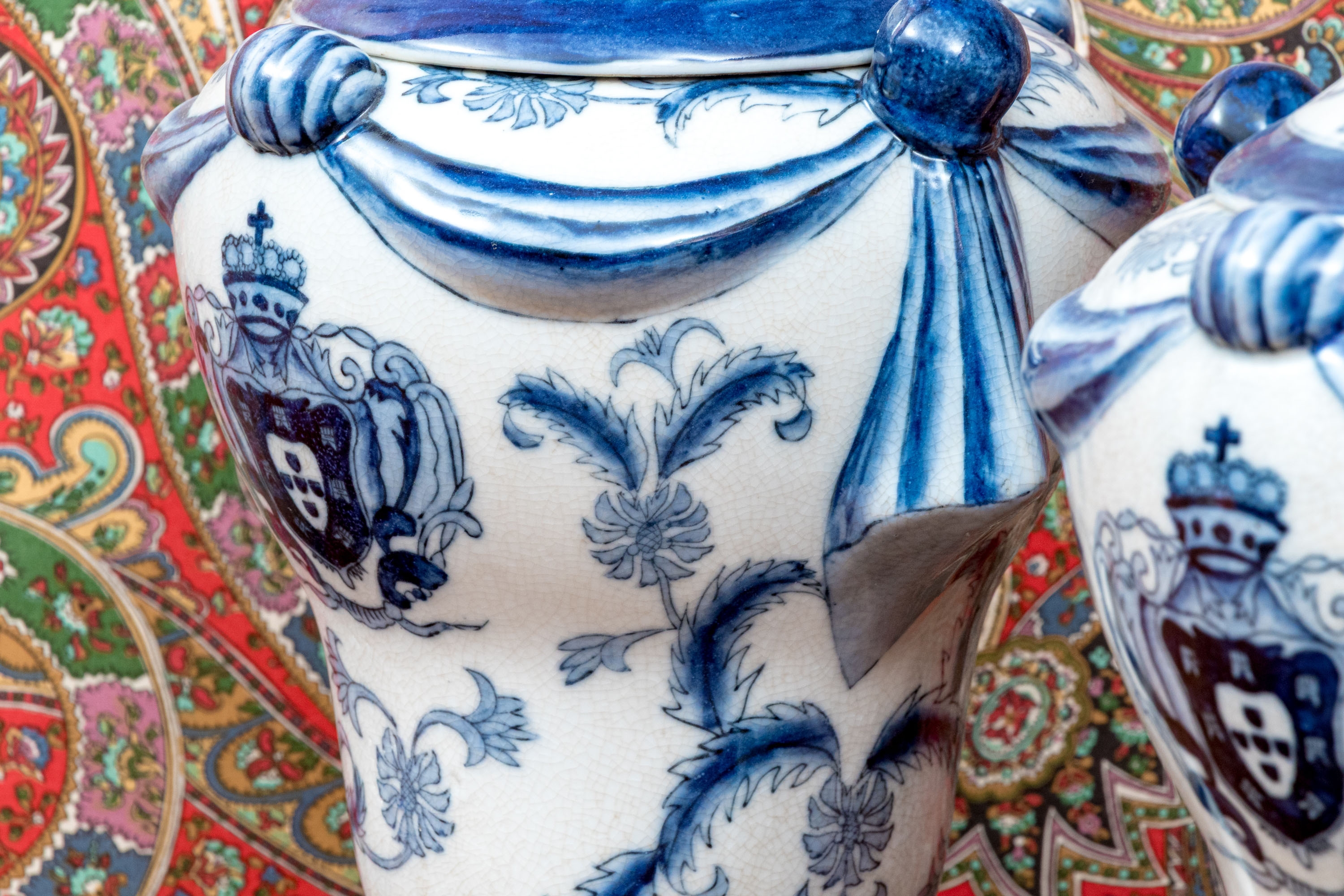 An impressive pair of porcelain urns showcasing large blue sphere finials over bell form lids atop shapely inverted pear bodies with raised feet. The shoulders of the jars are decorated with gorgeous faux drapery, leading to heraldic crowned shields at the center fronts surrounded by elegant scrolled foliage. Marked underfoot. Both jars are raised on fitted red-brown wood stands with feet.