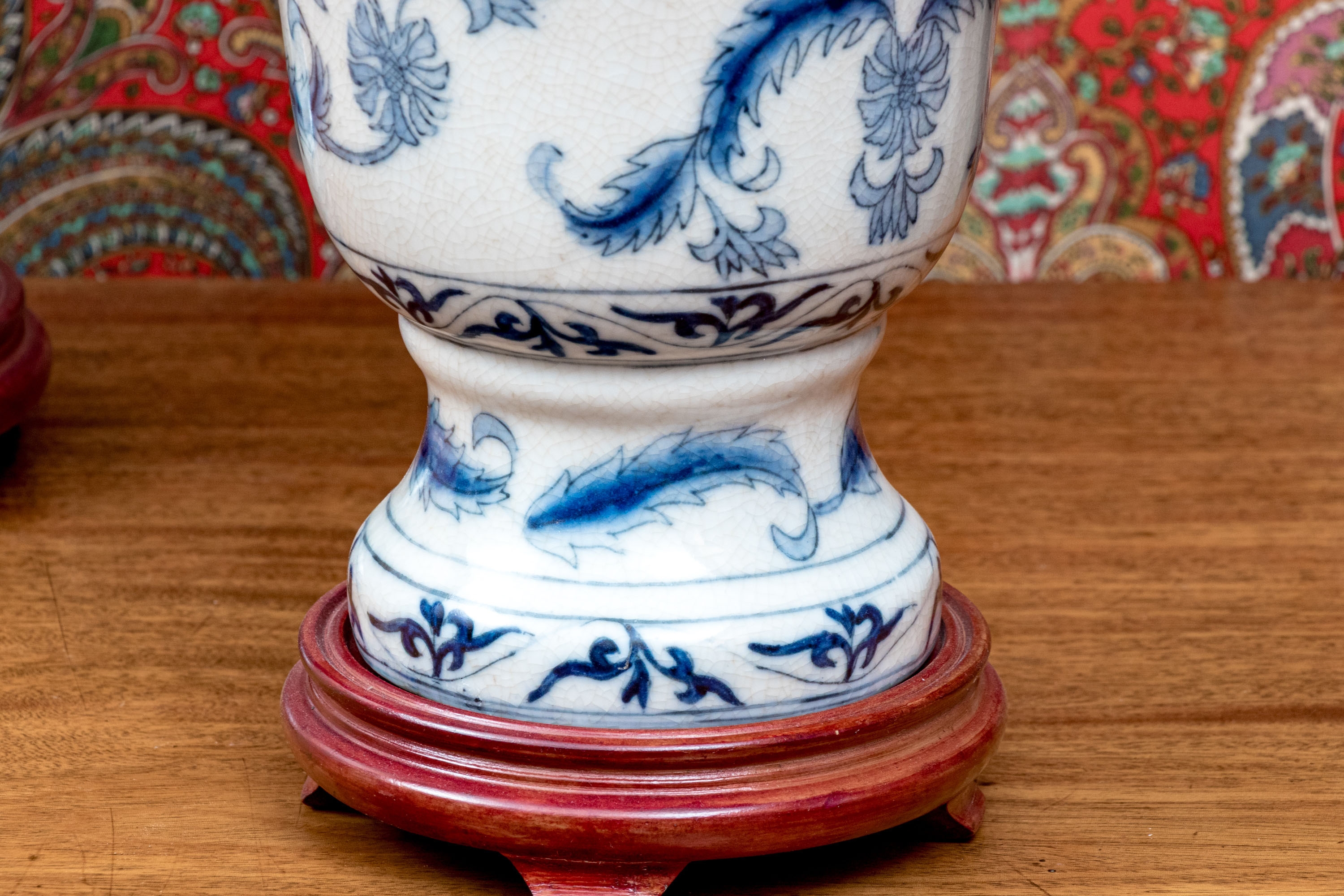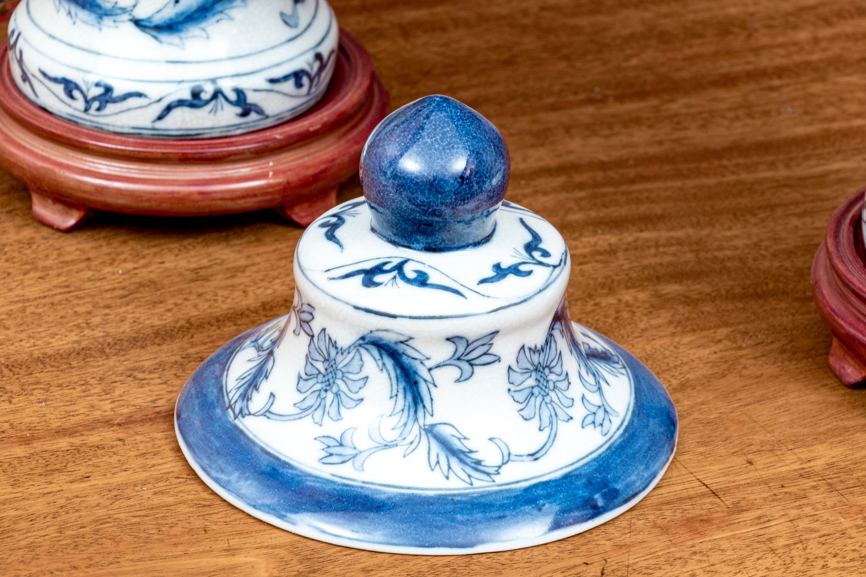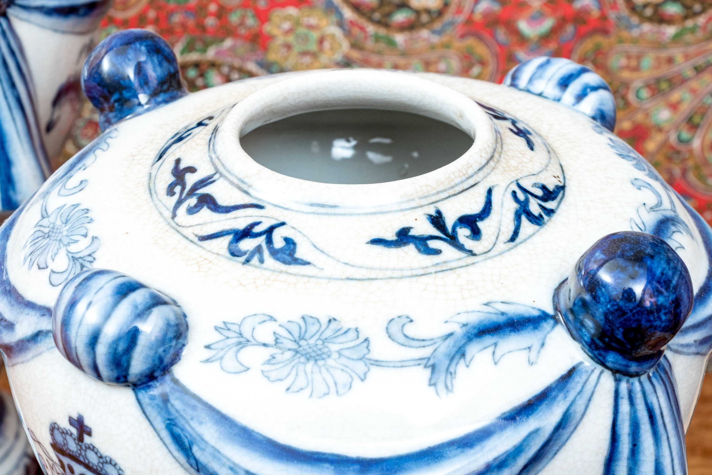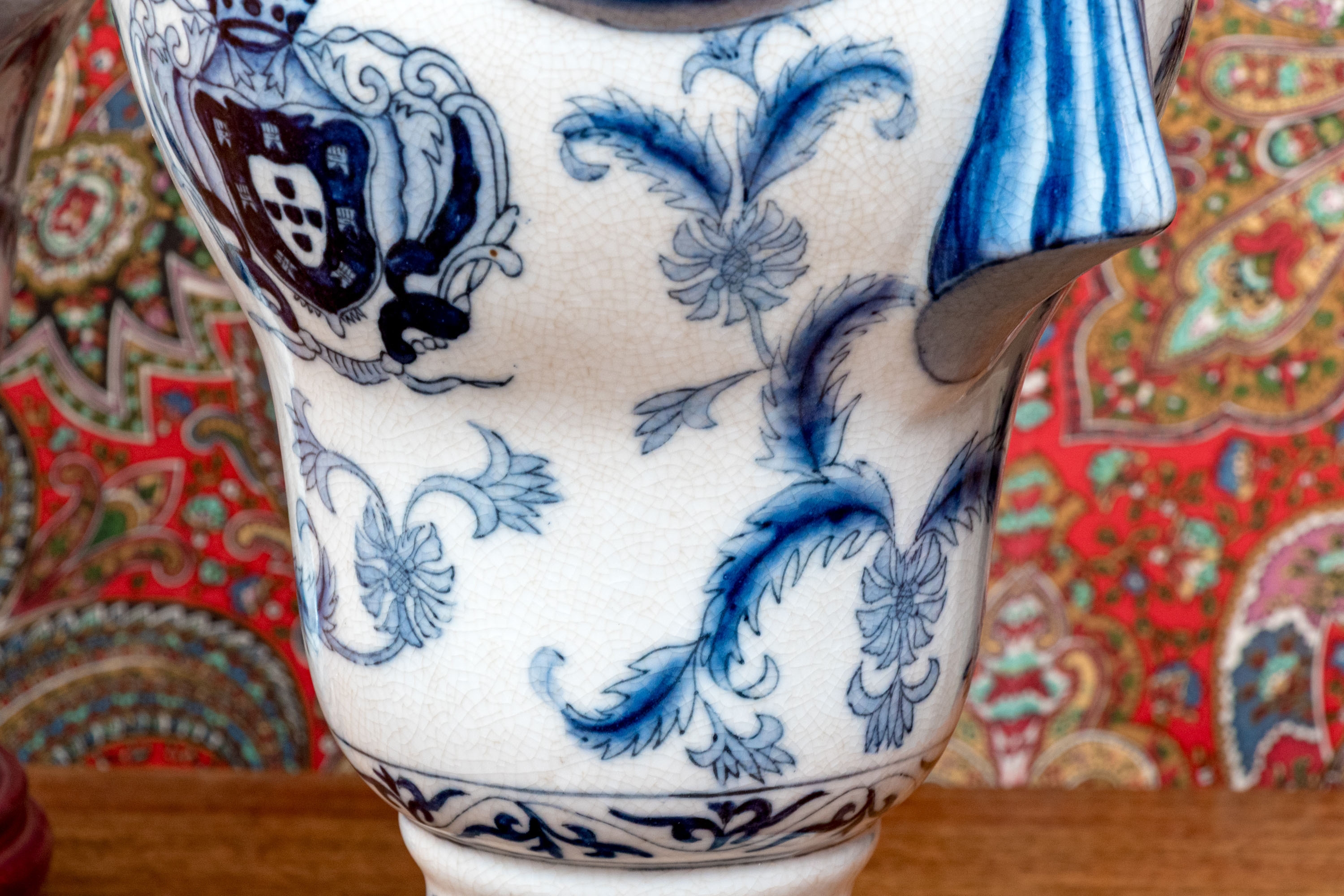 An impressive pair of porcelain urns showcasing large blue sphere finials over bell form lids atop shapely inverted pear bodies with raised feet. The shoulders of the jars are decorated with gorgeous faux drapery, leading to heraldic crowned shields at the center fronts surrounded by elegant scrolled foliage. Marked underfoot. Both jars are raised on fitted red-brown wood stands with feet.