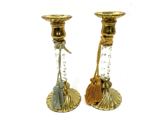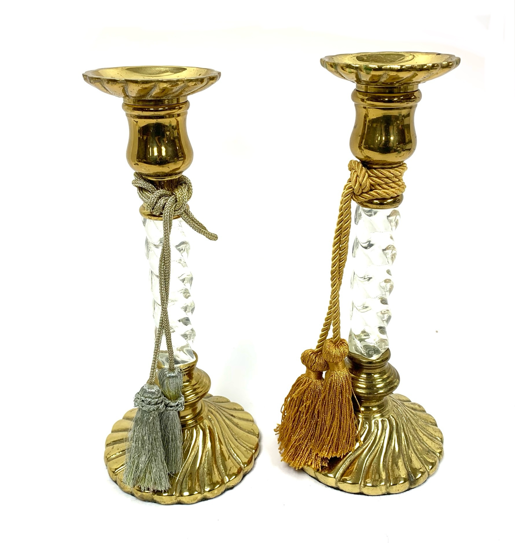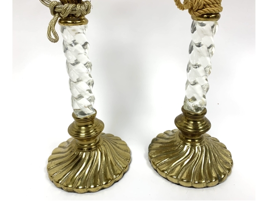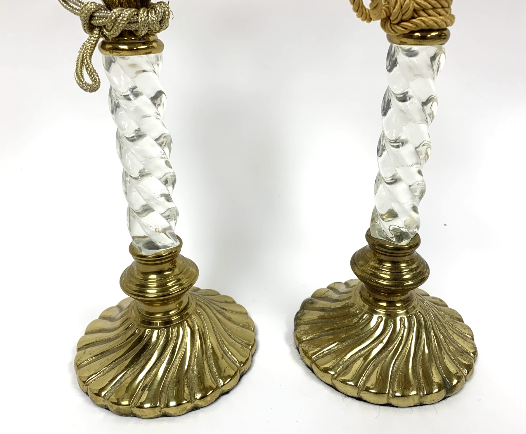 Pair of lucite and brass candle sticks by Decorative Crafts Inc. The candlesticks with fluid lucite spiral twist standards and lacquered brass fluted base and bobeche. Both with different rope tassels tied at the neck.