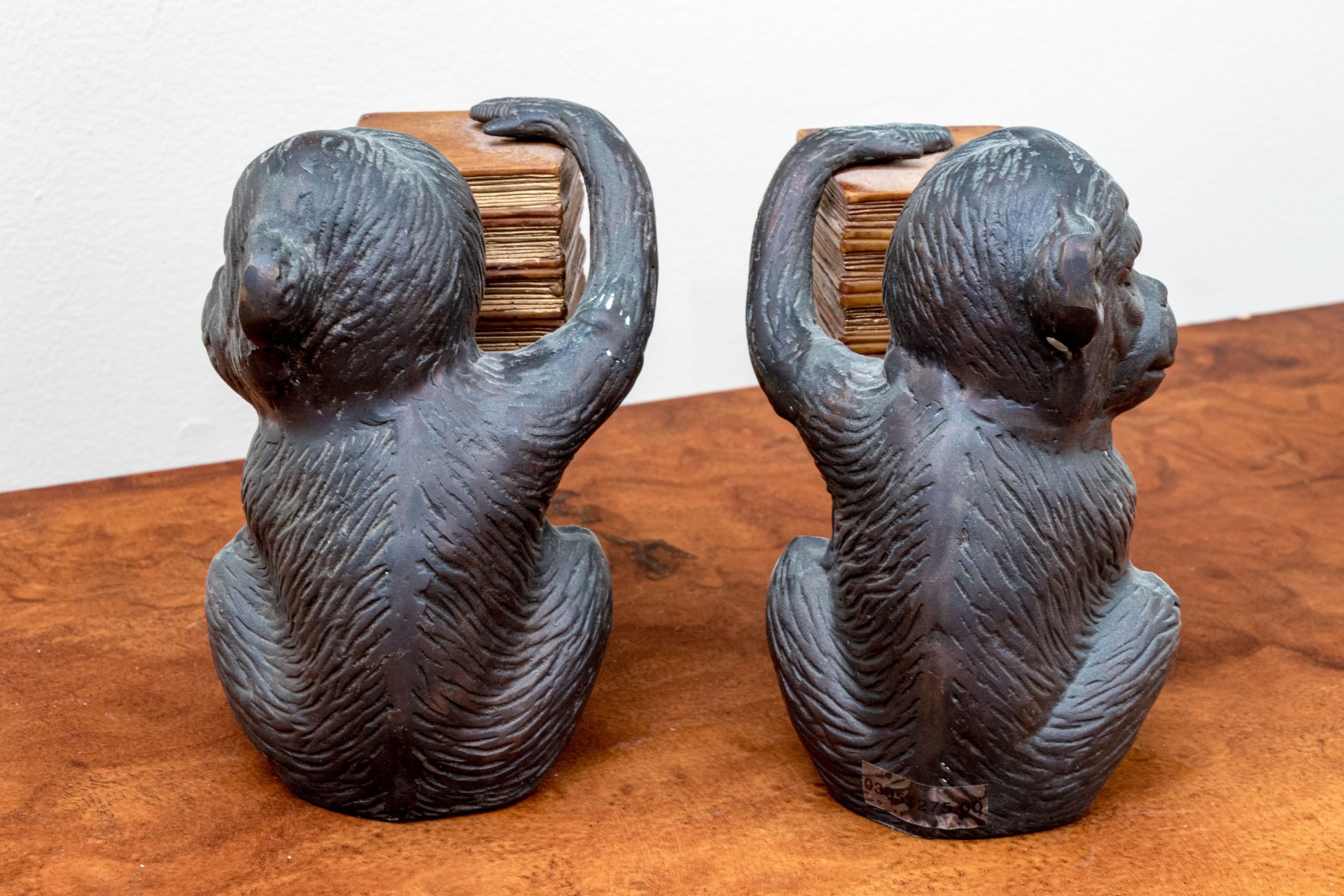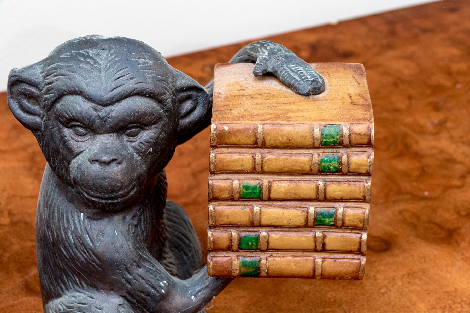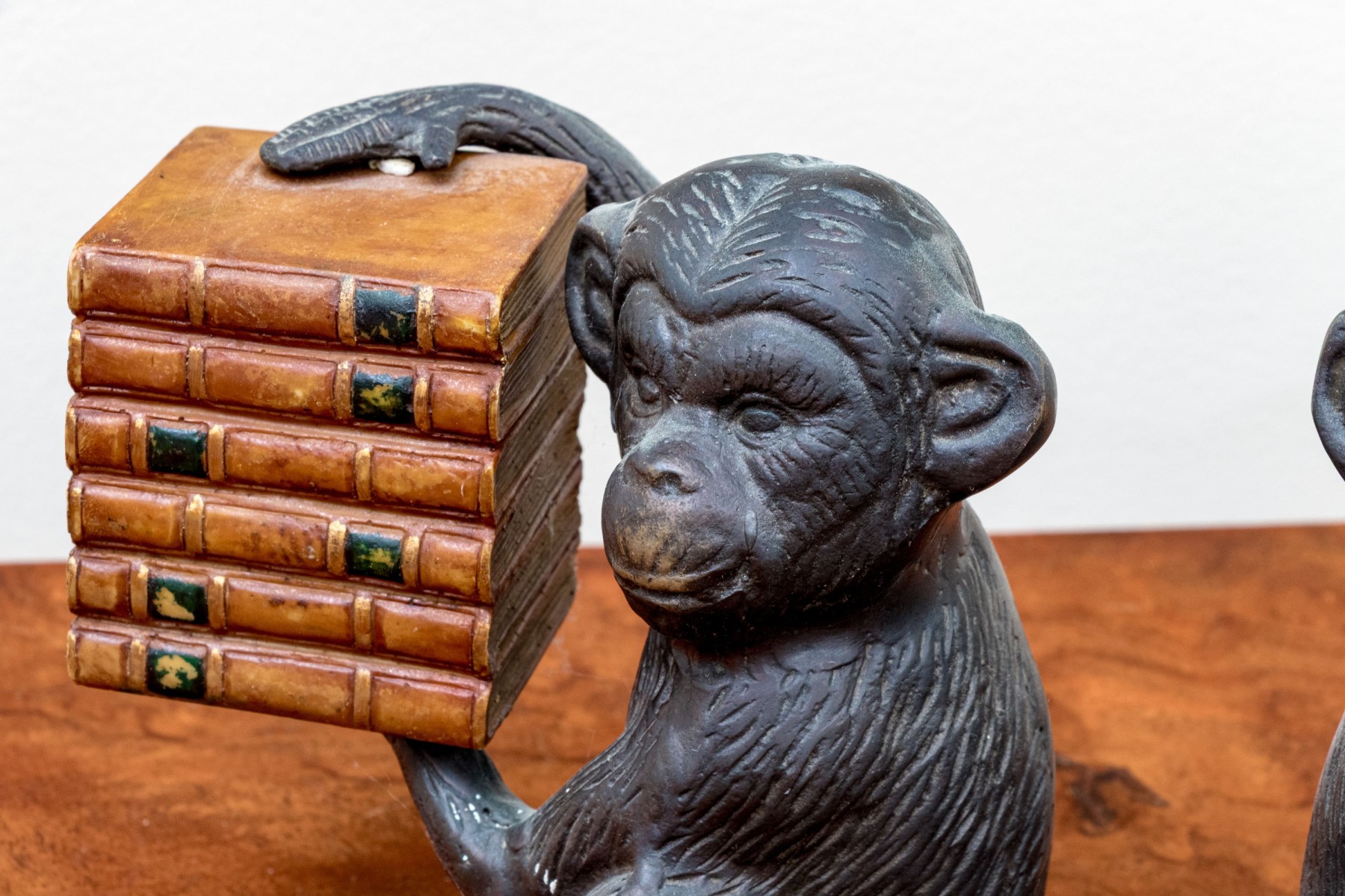 A fun pair of bookends depicting black finished monkeys holding stacks of six brown books with blue and green accents on the spines. Beautifully detailed throughout the faces and fur.