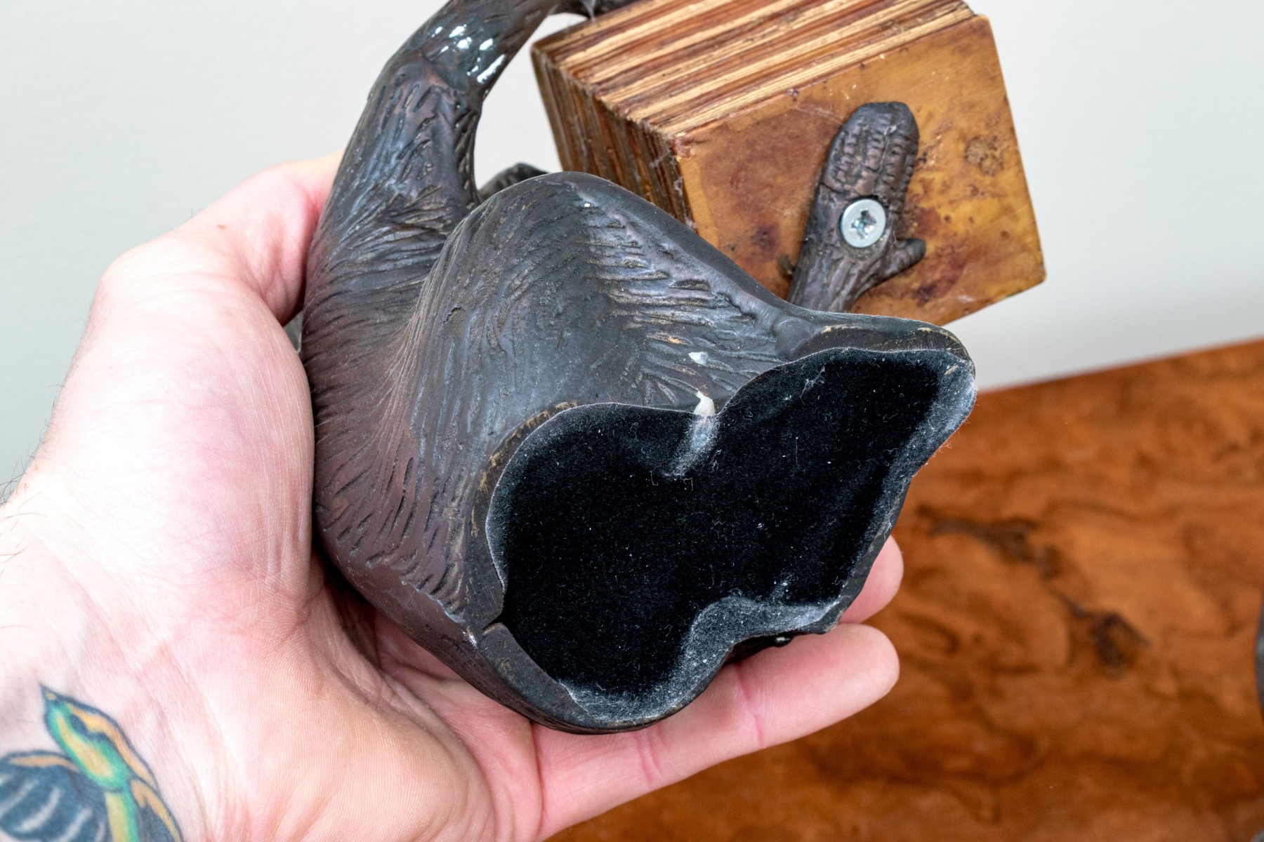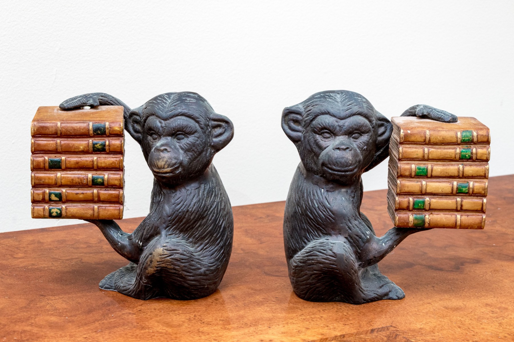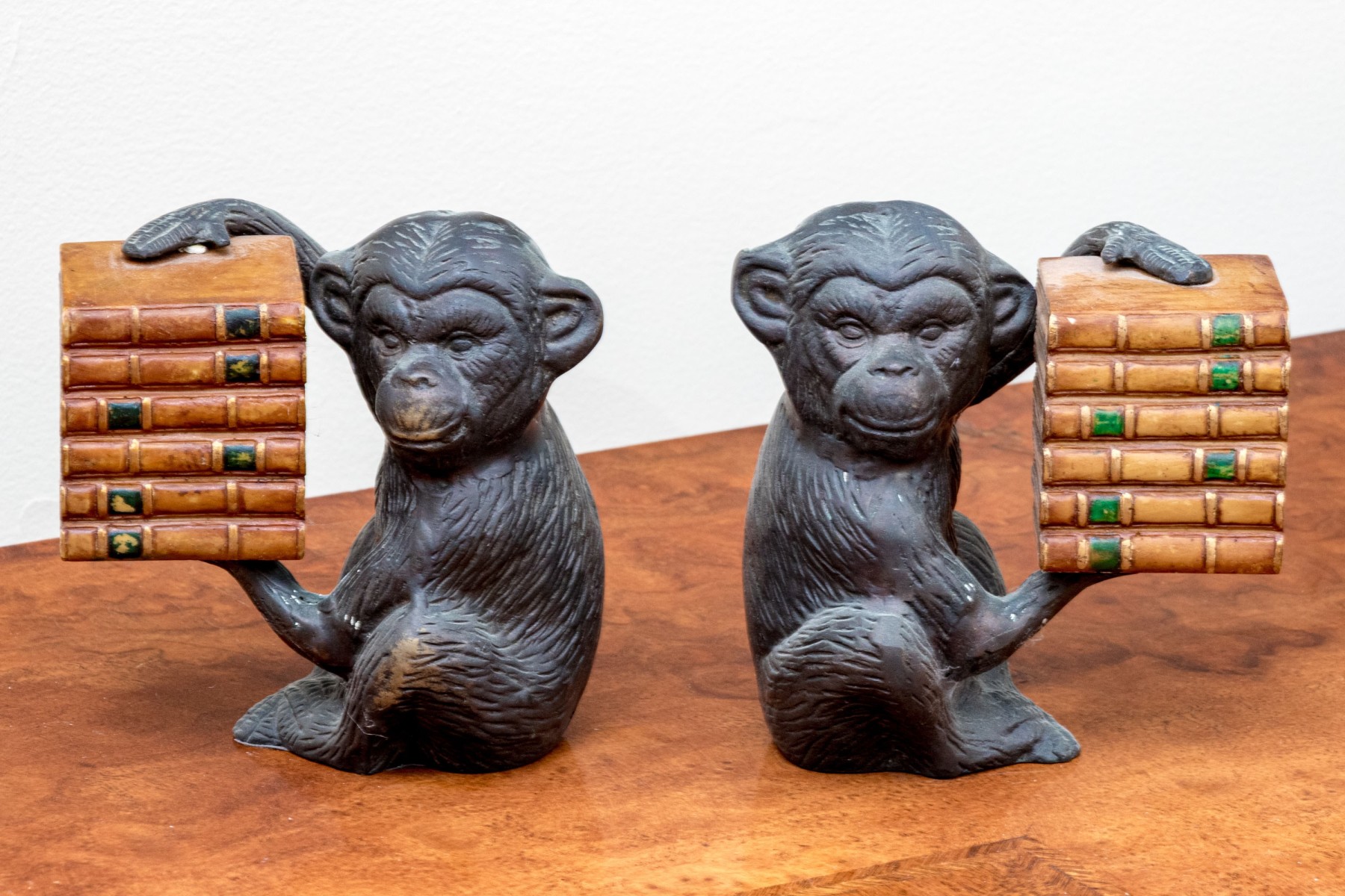 A fun pair of bookends depicting black finished monkeys holding stacks of six brown books with blue and green accents on the spines. Beautifully detailed throughout the faces and fur.