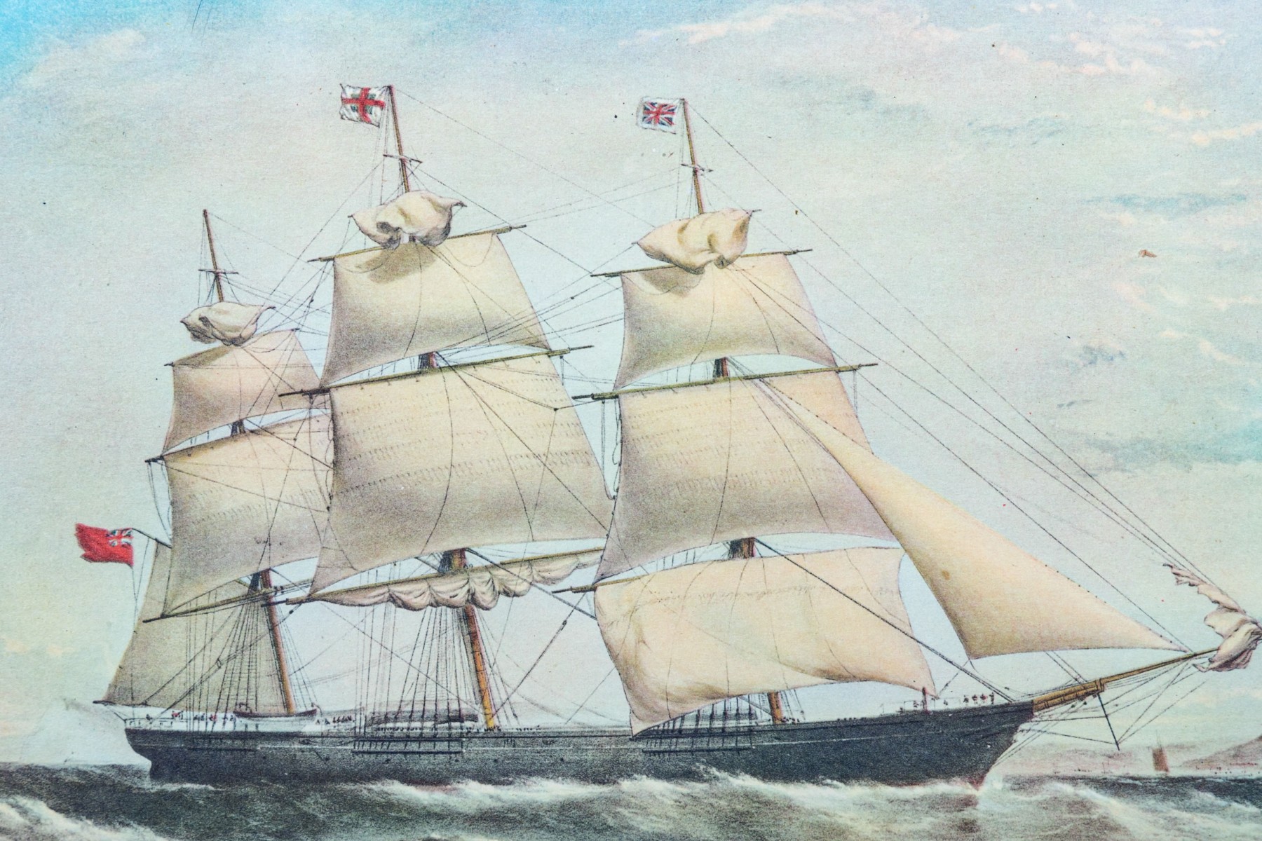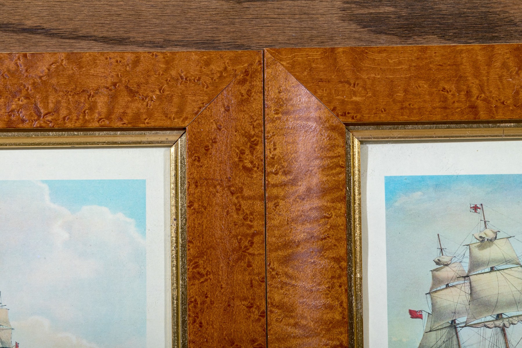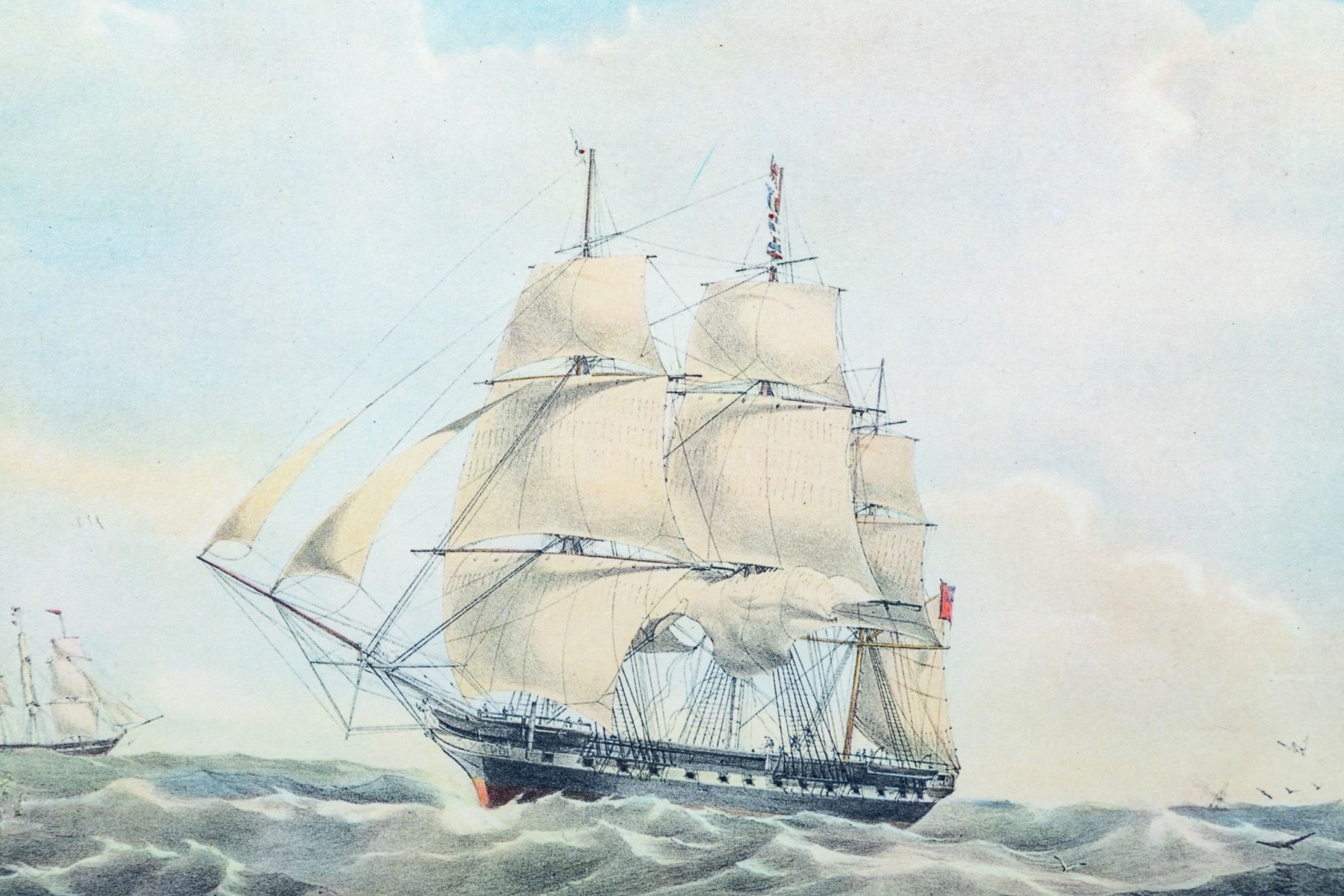 Decorative pair of nautical prints in colors depicting tall ships at sail in rough waters.