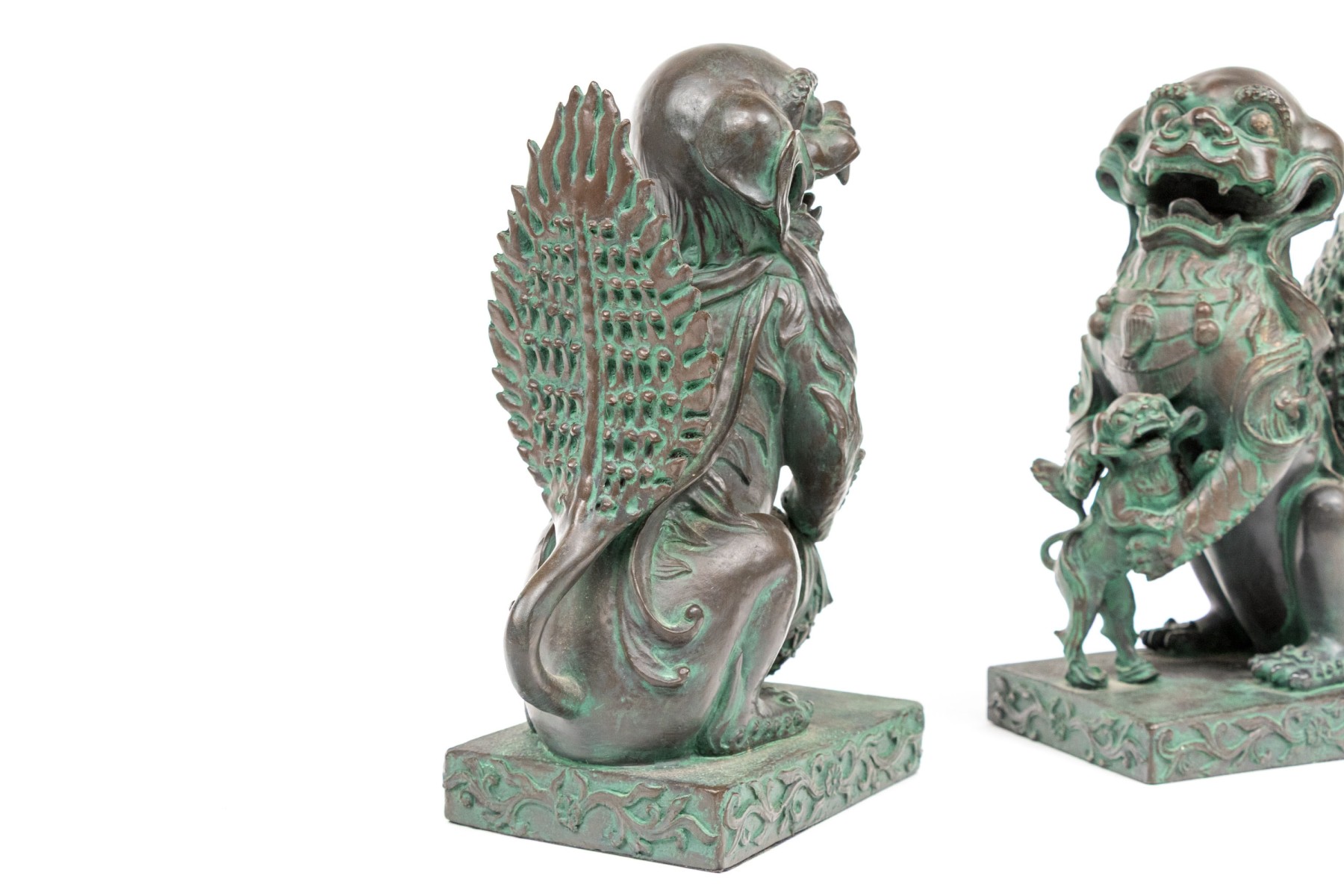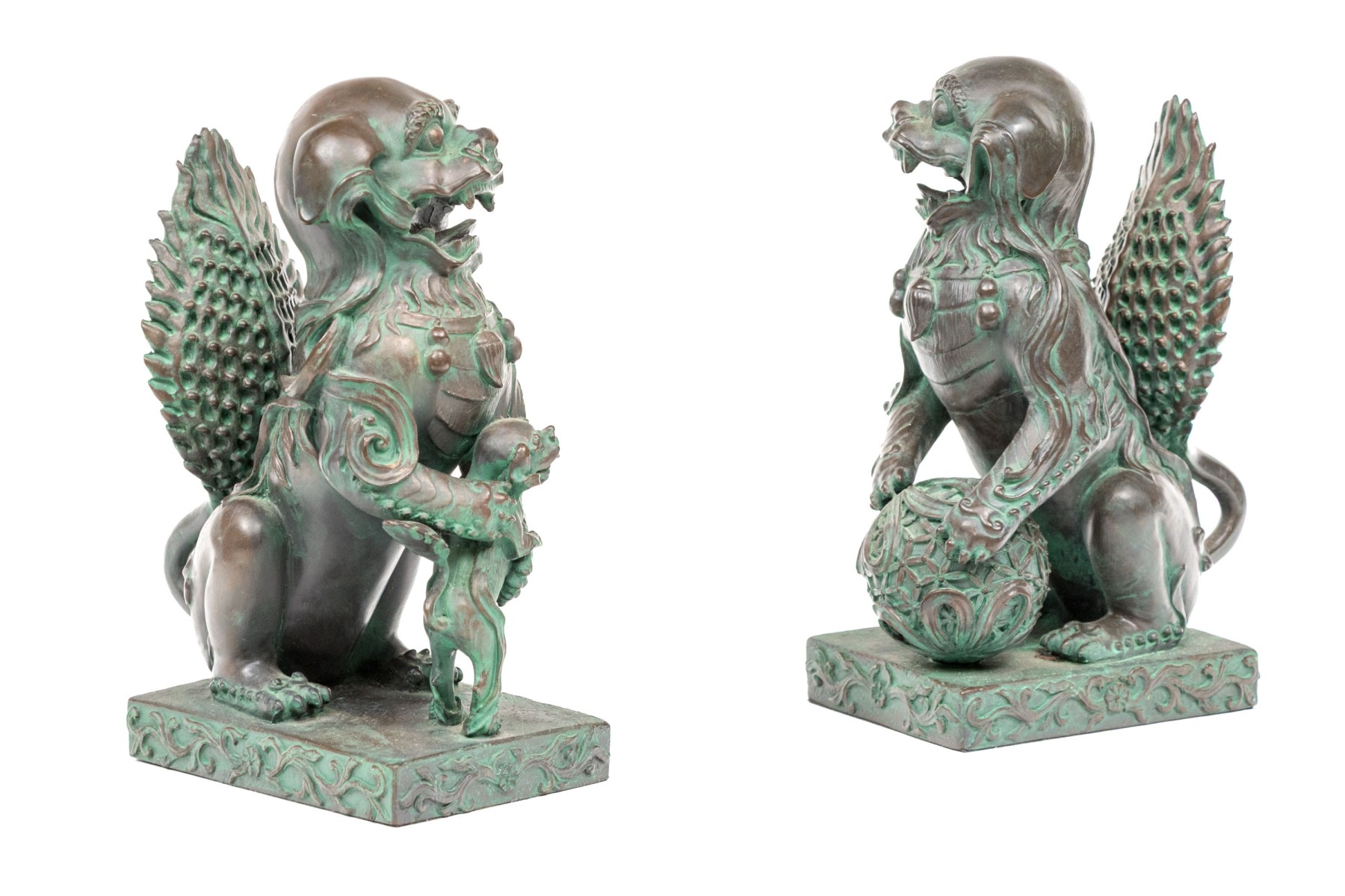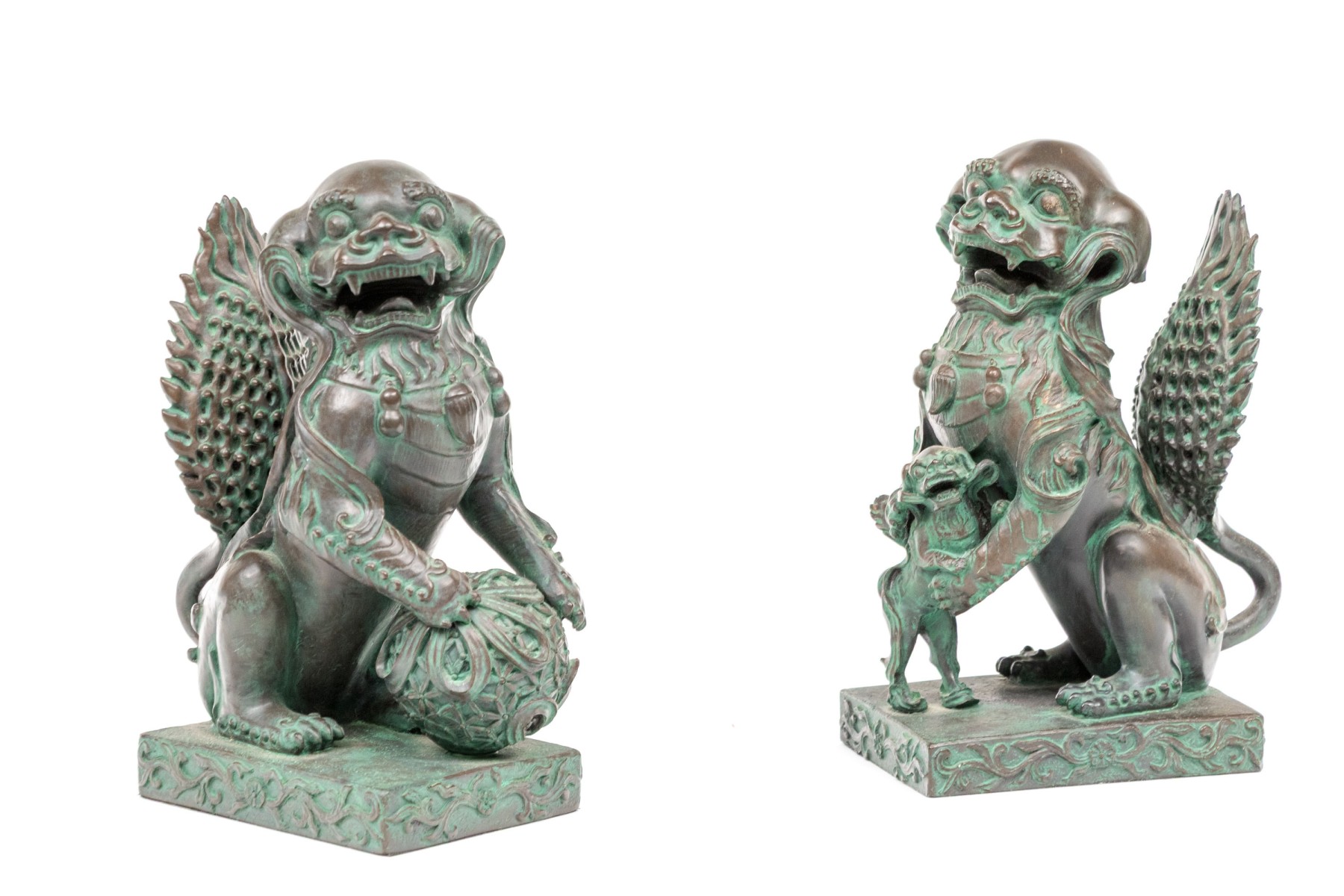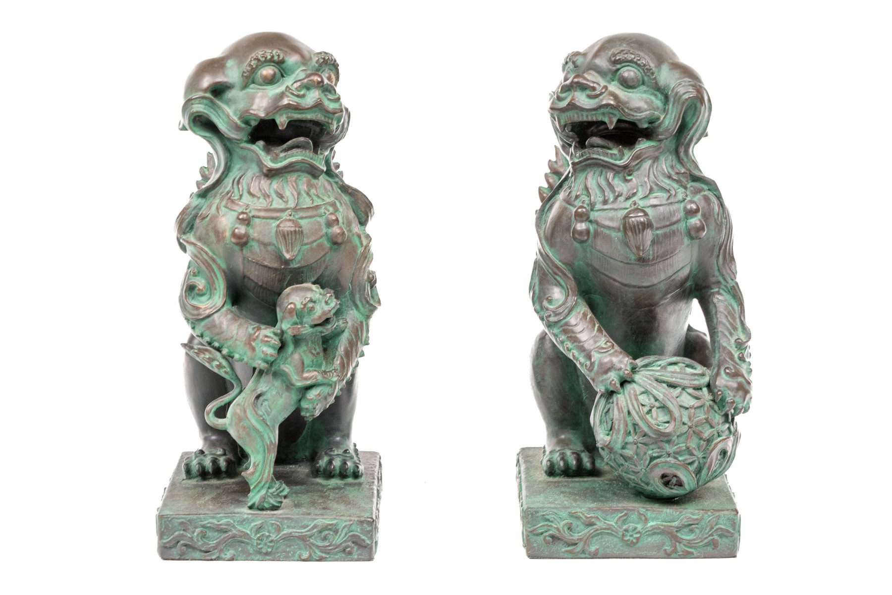 A fabulous pair of decorative resin foo dogs in a rich bronze finish with colorful verdigris accents adding a great sense of depth and texture. The figures include a female with a pup and a male with a decorative sphere, both sitting on hind legs with large, fanning tails at the back.