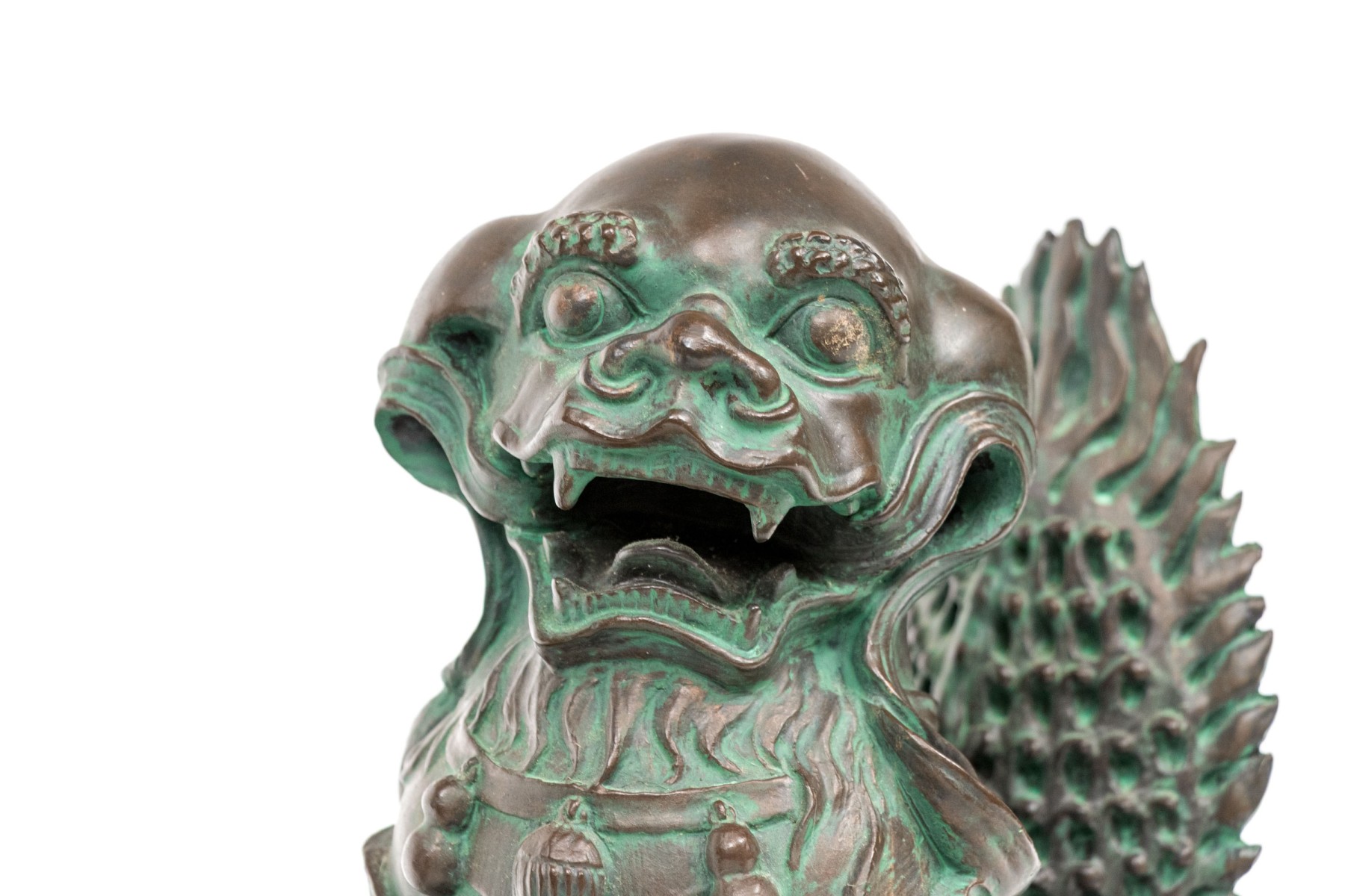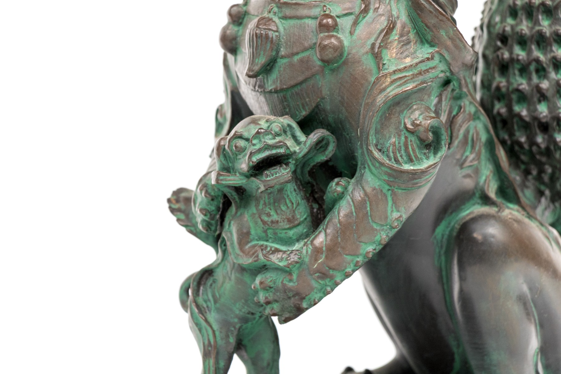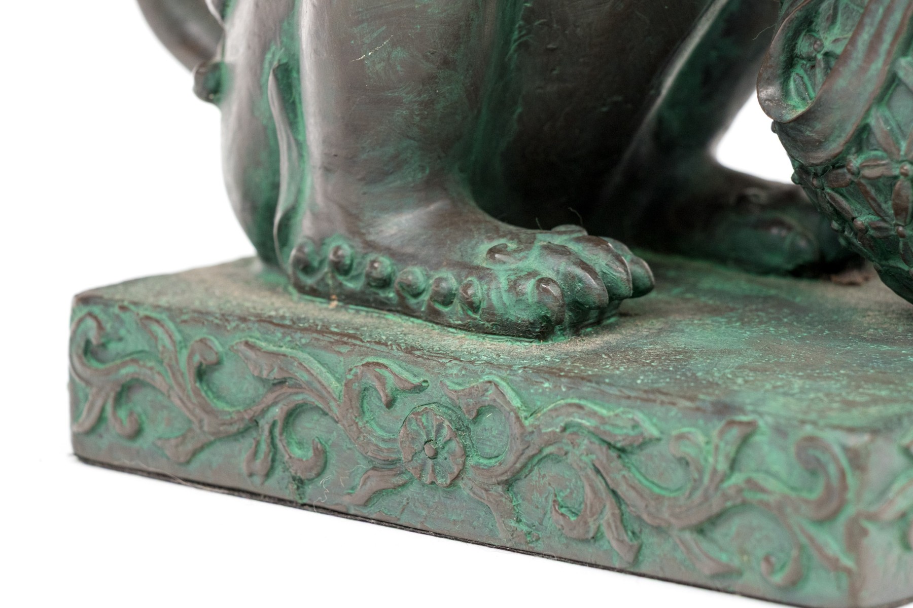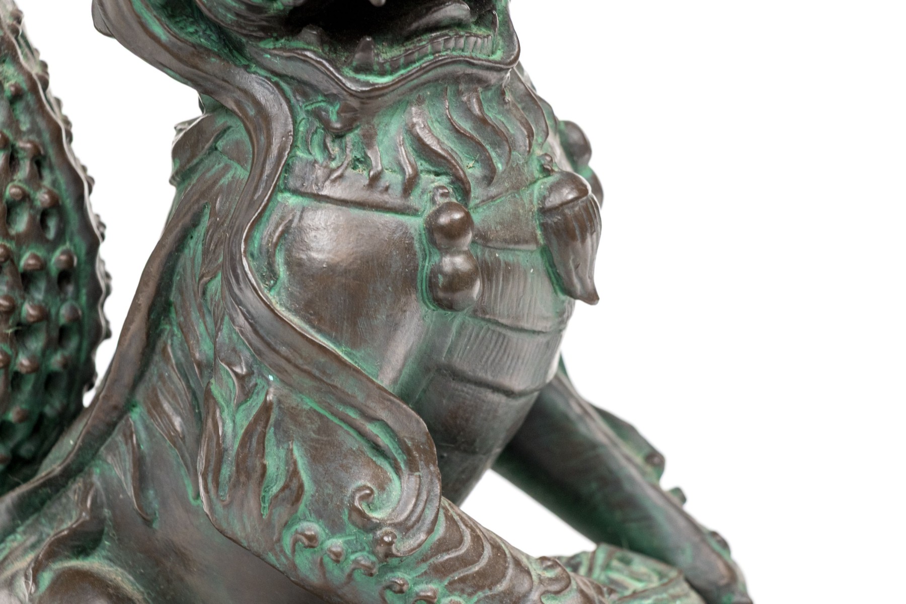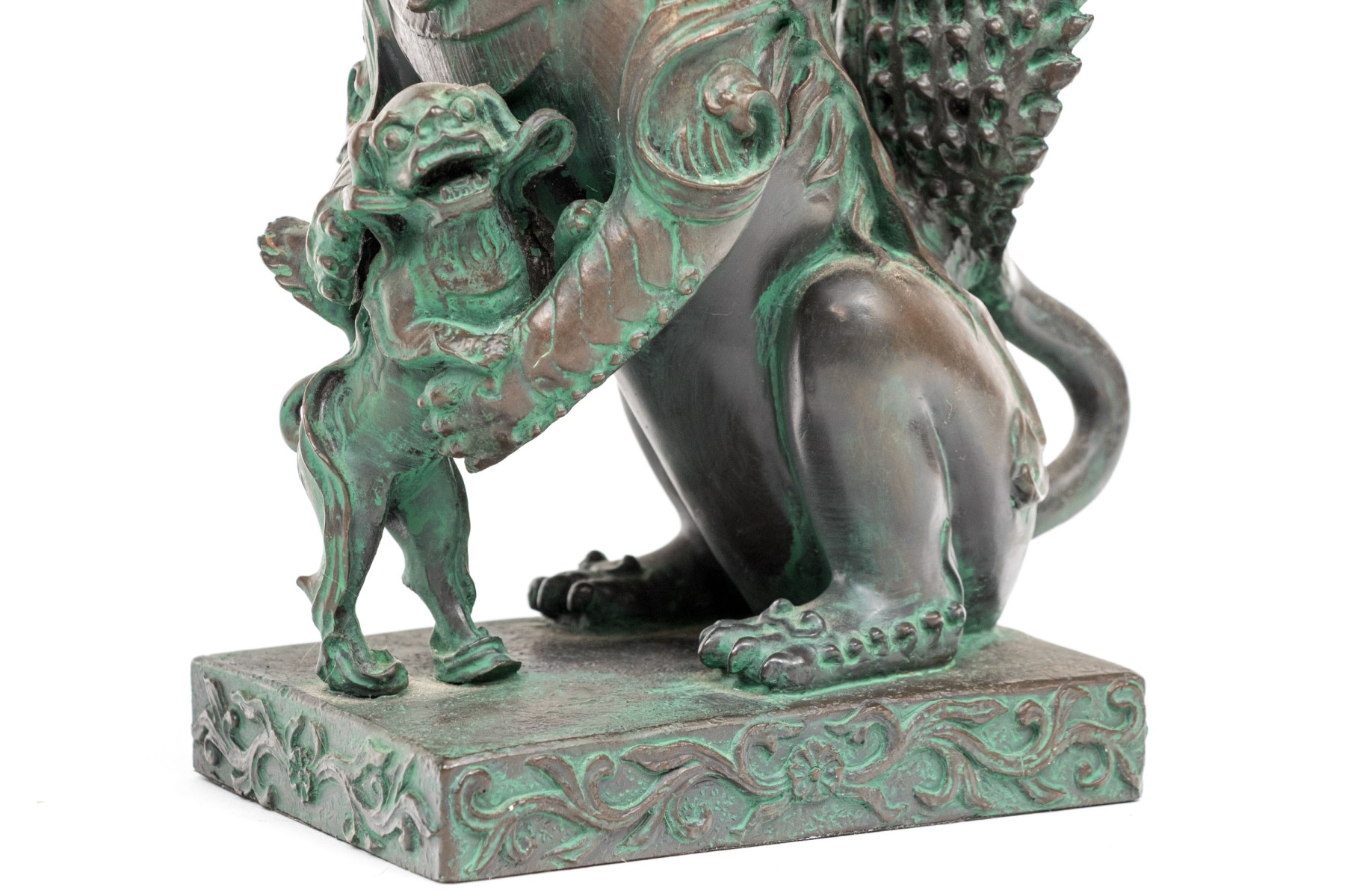 A fabulous pair of decorative resin foo dogs in a rich bronze finish with colorful verdigris accents adding a great sense of depth and texture. The figures include a female with a pup and a male with a decorative sphere, both sitting on hind legs with large, fanning tails at the back.