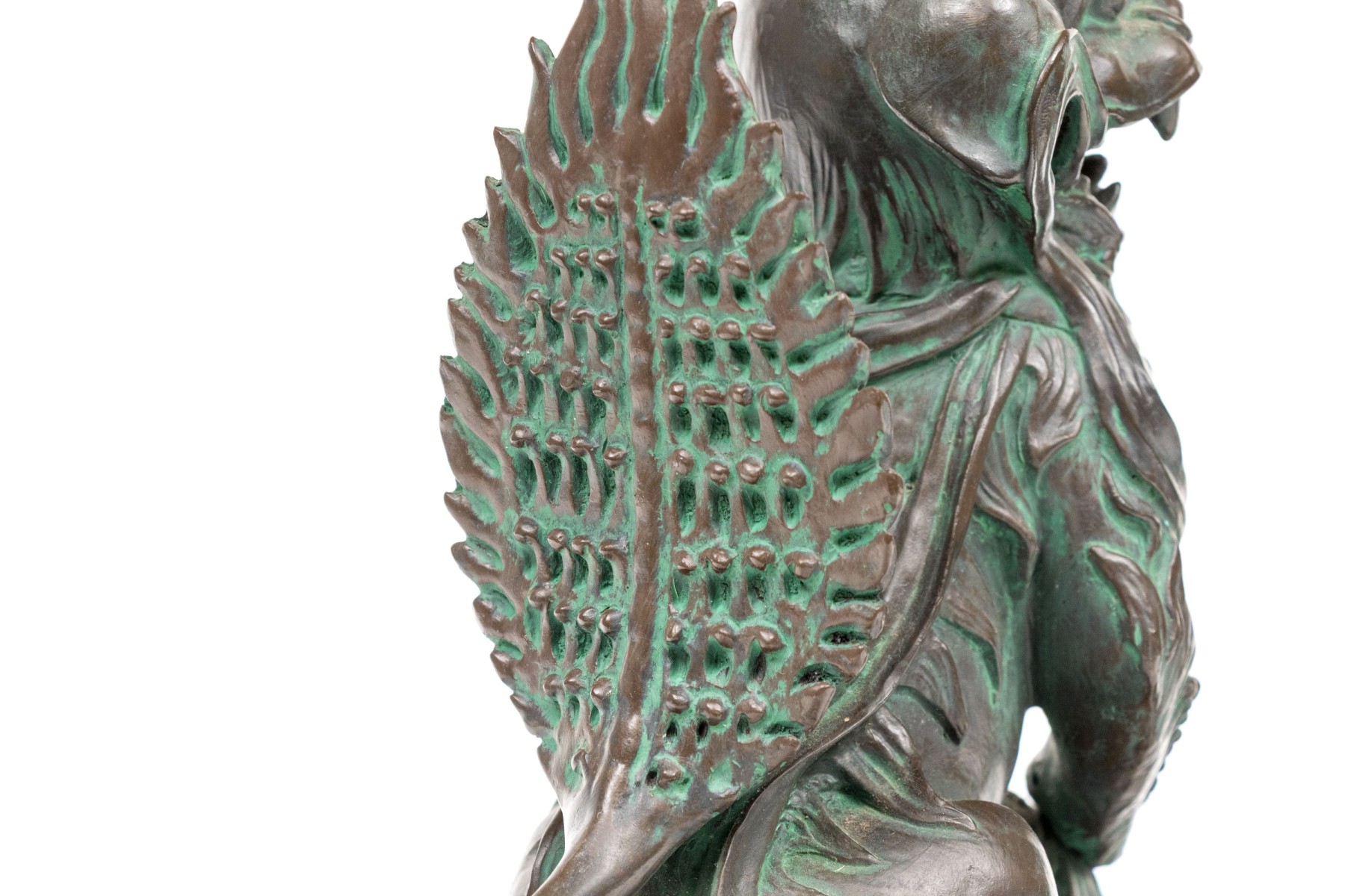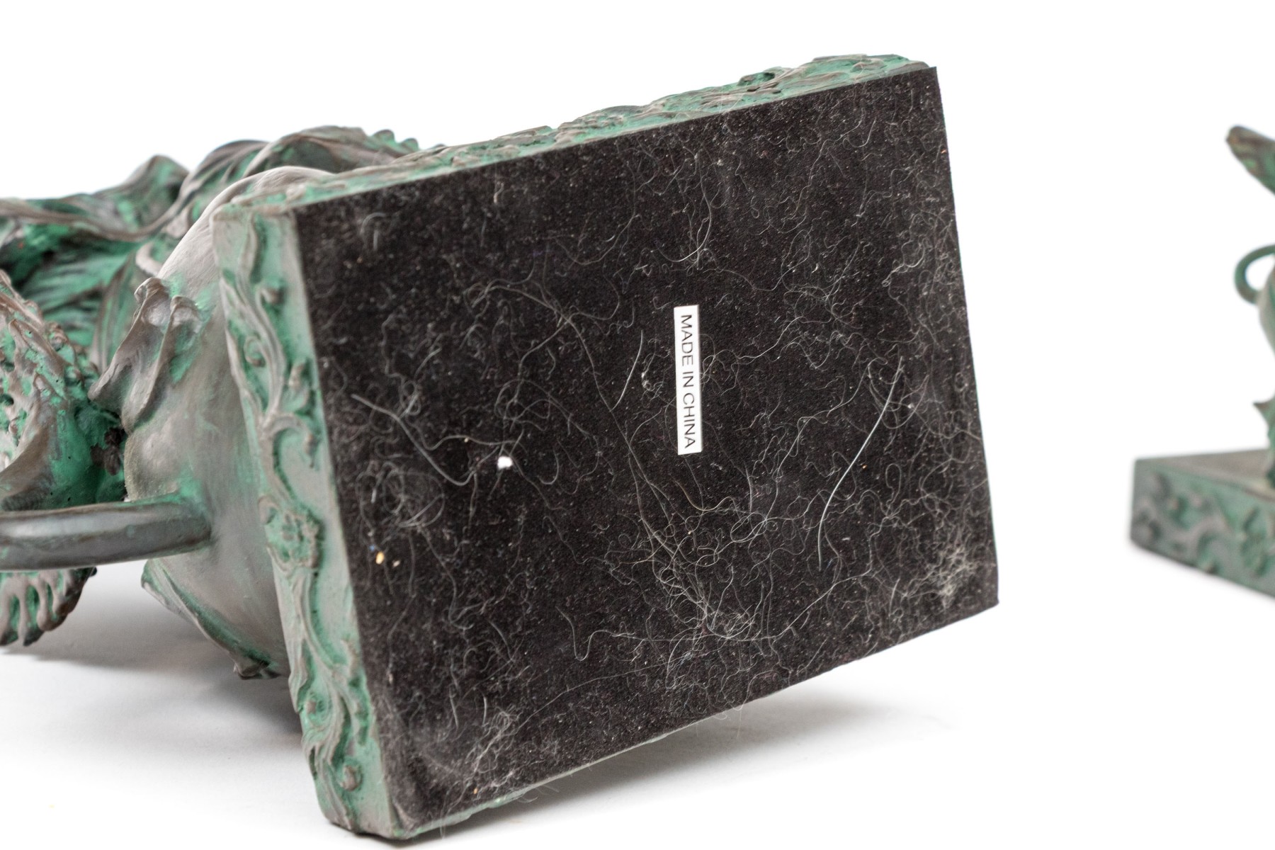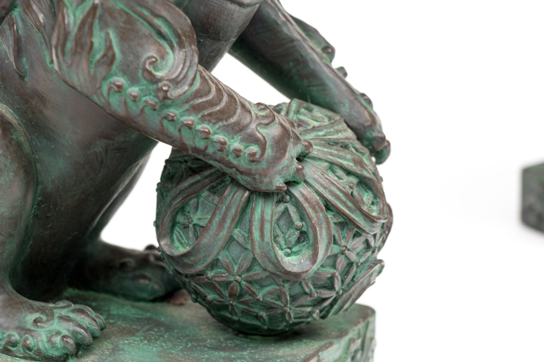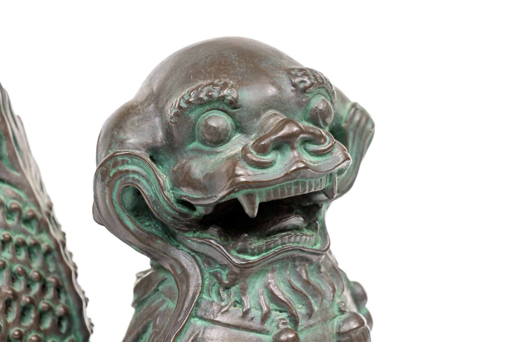 A fabulous pair of decorative resin foo dogs in a rich bronze finish with colorful verdigris accents adding a great sense of depth and texture. The figures include a female with a pup and a male with a decorative sphere, both sitting on hind legs with large, fanning tails at the back.