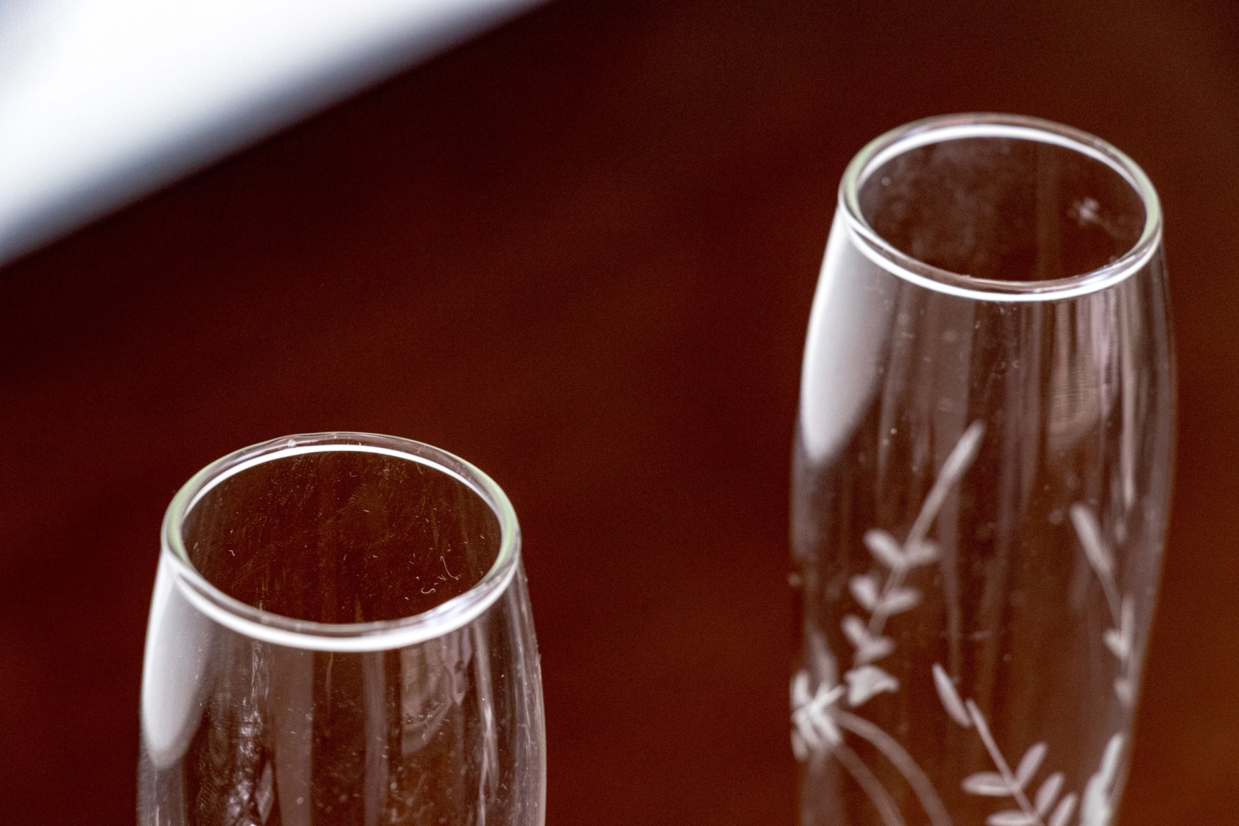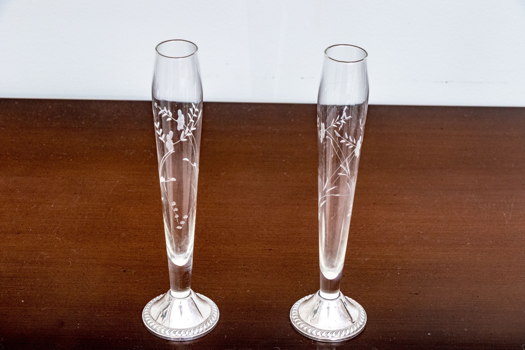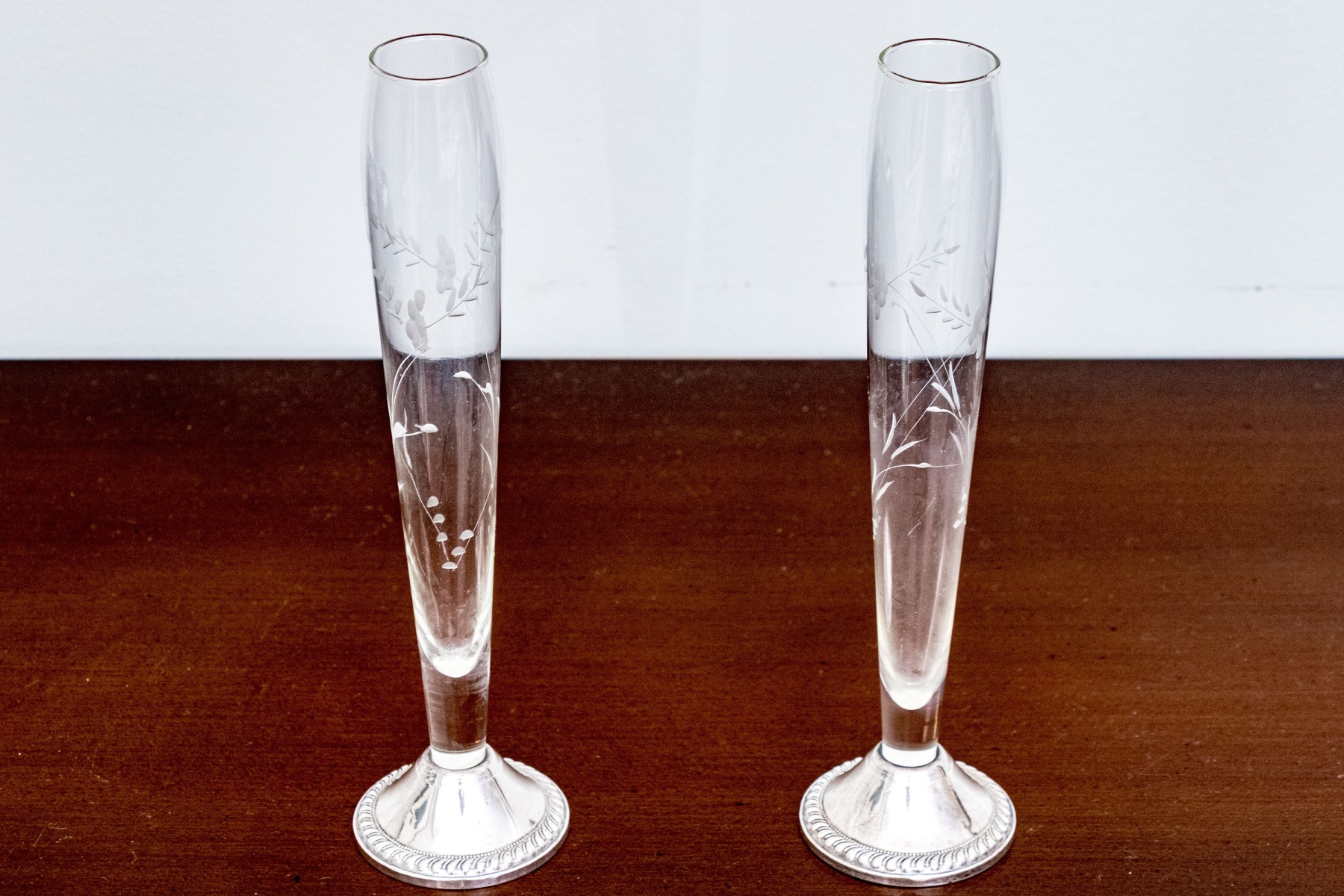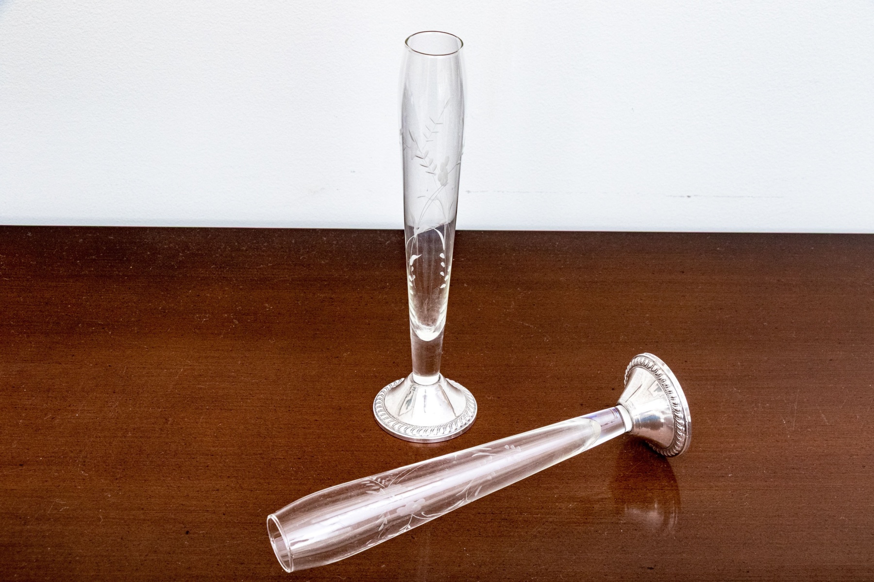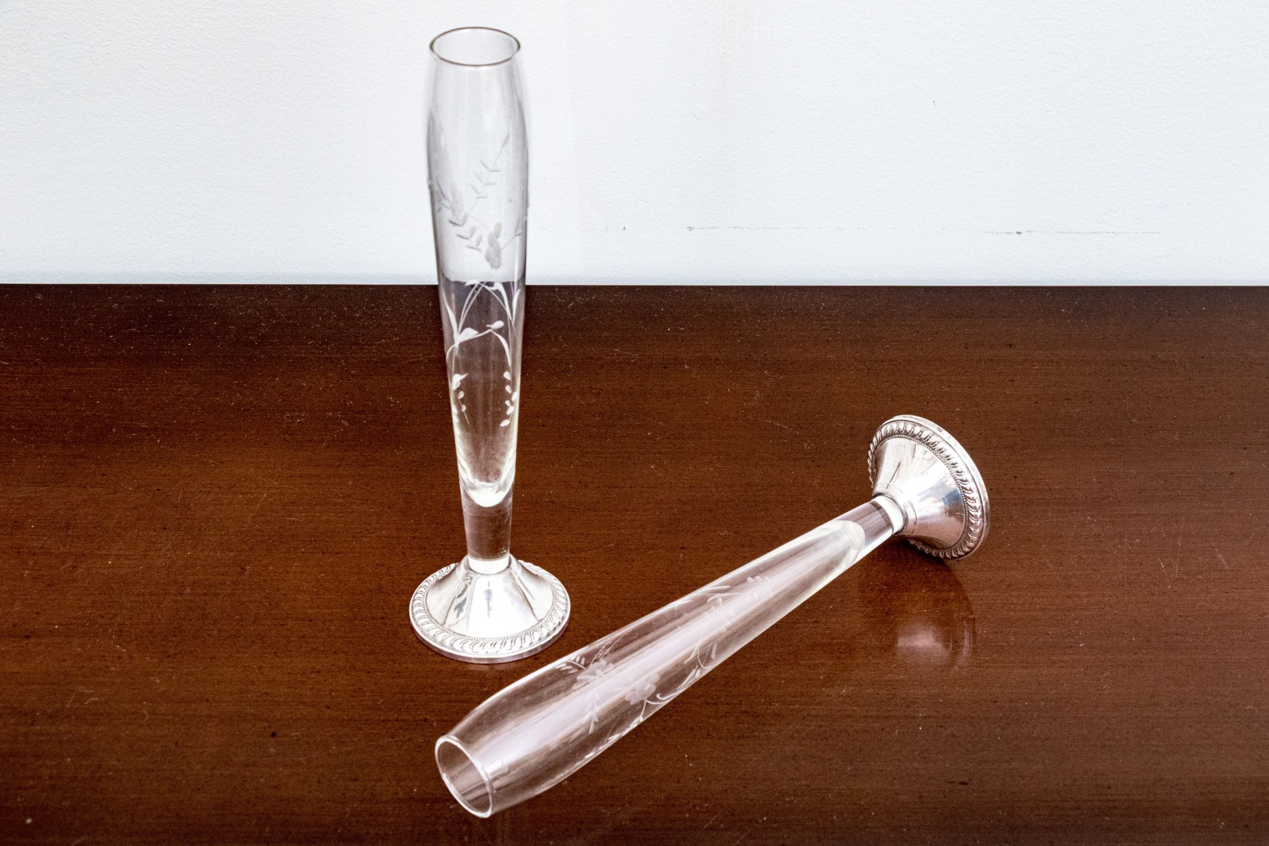 Marked underfoot, the sterling weighted etched glass bud vases feature elegantly etched glass foliate motifs. Both are wonderfully formed and designed.