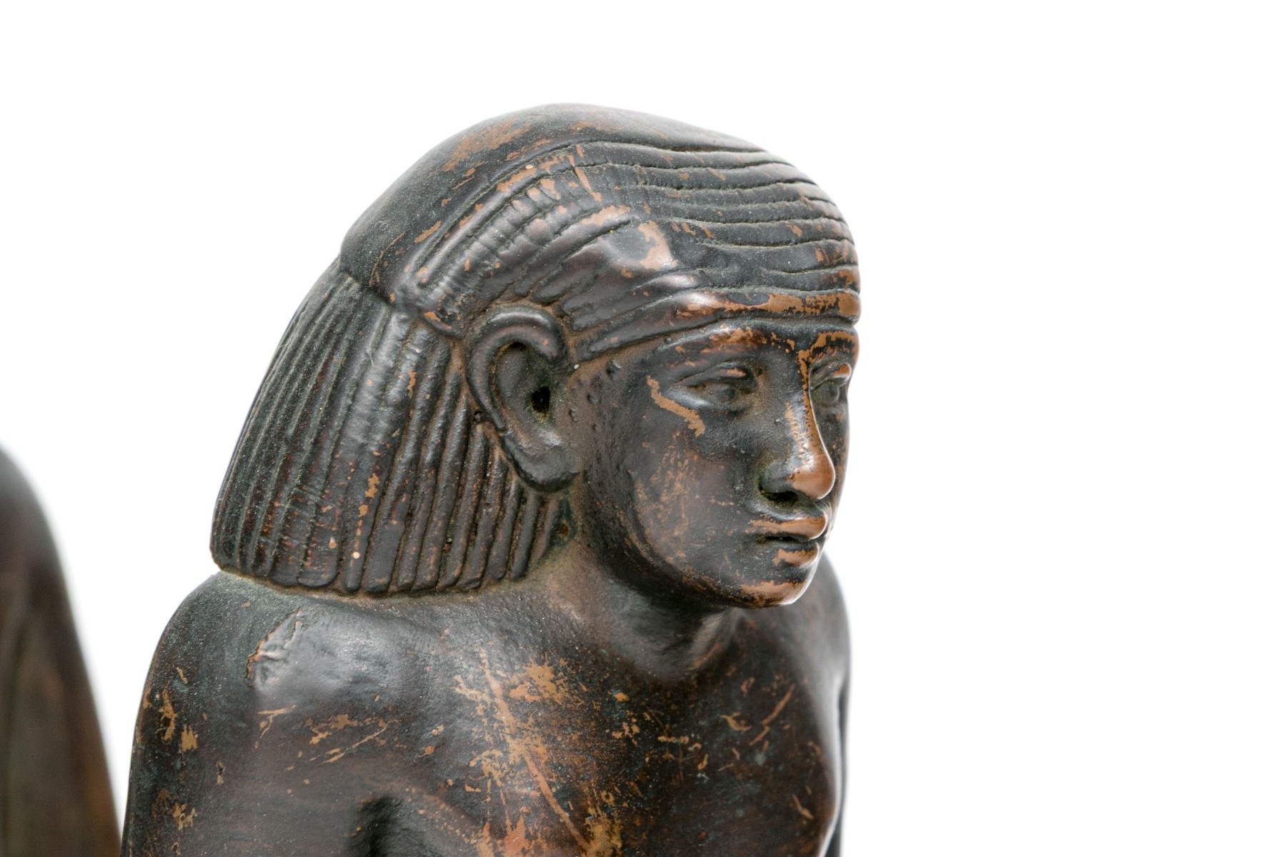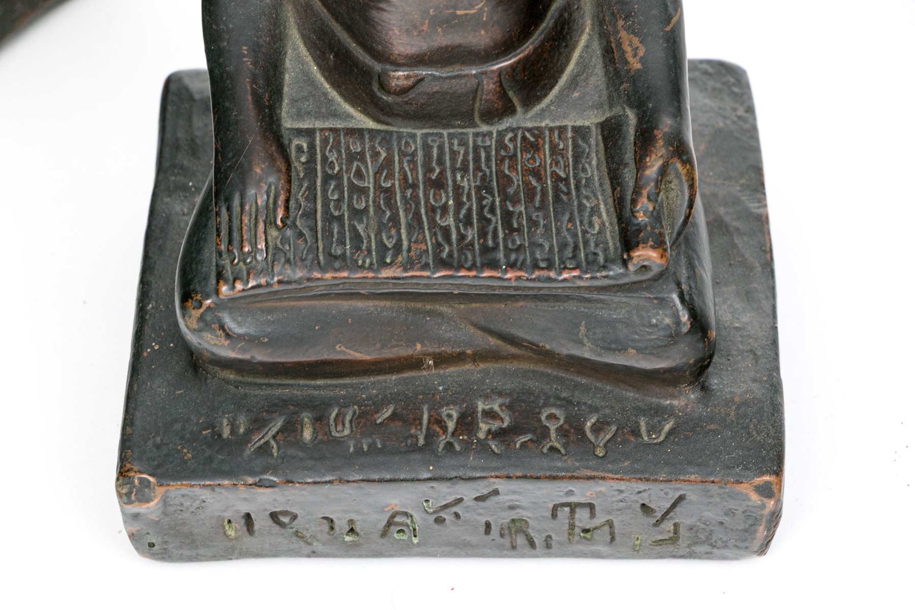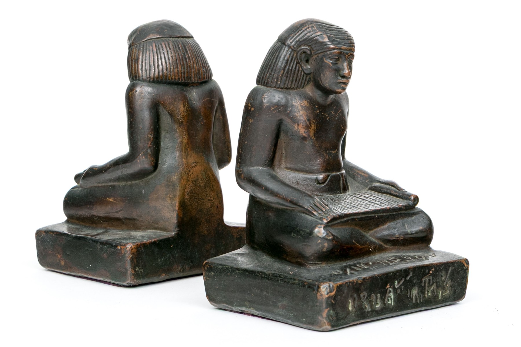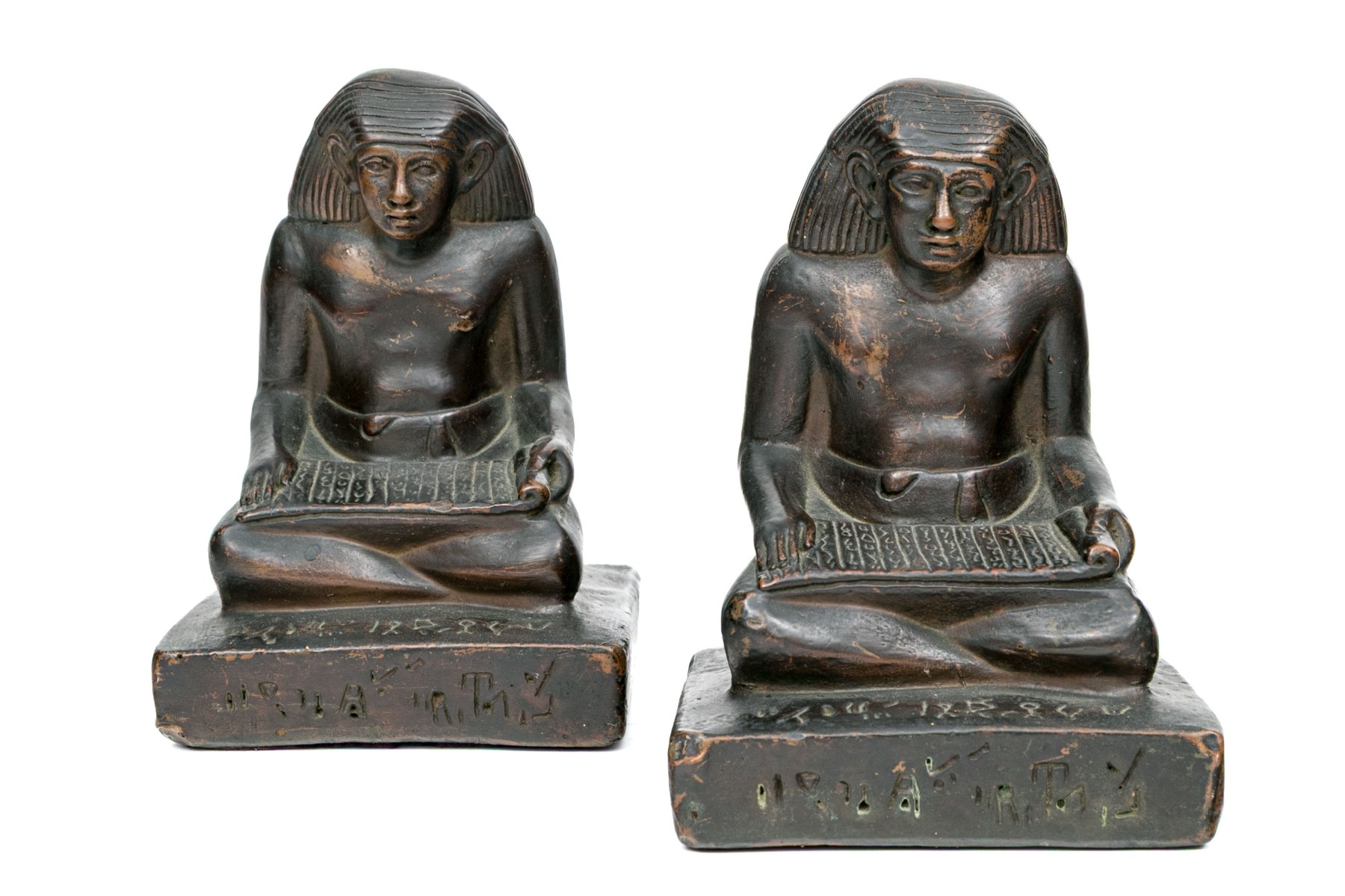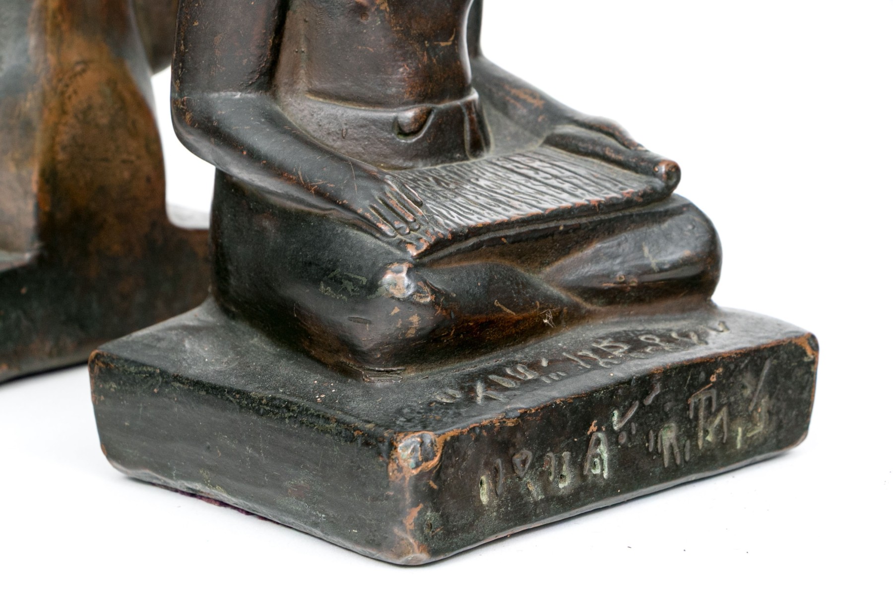 A stylish pair of Egyptian Revival style copper clad bookends. Both in the form of seated figures on square bases.