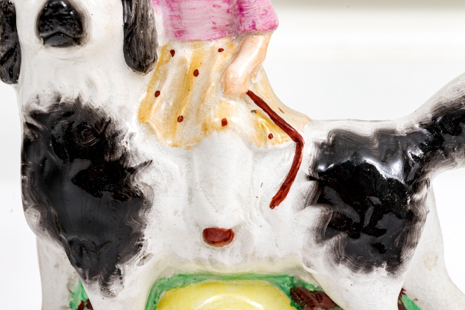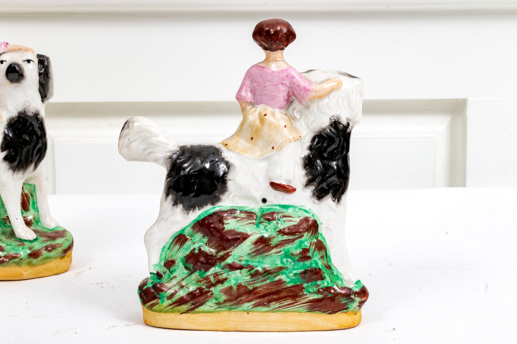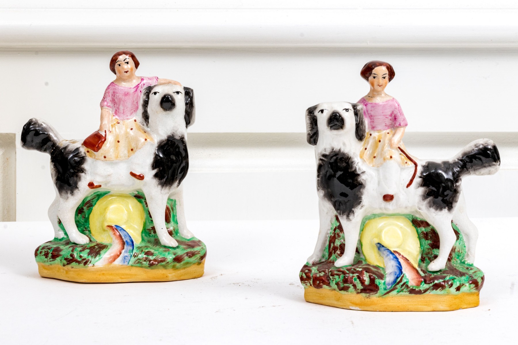 A delightful pair of English ceramic figures of girls with short red hair wearing pink blouses and orange dotted skirts riding atop black and white dogs over green naturalistic bases, large sun hats propped up below the dogs' bellies. The figures are delightfully detailed in vibrant color with a fun aesthetic. Marked underfoot.