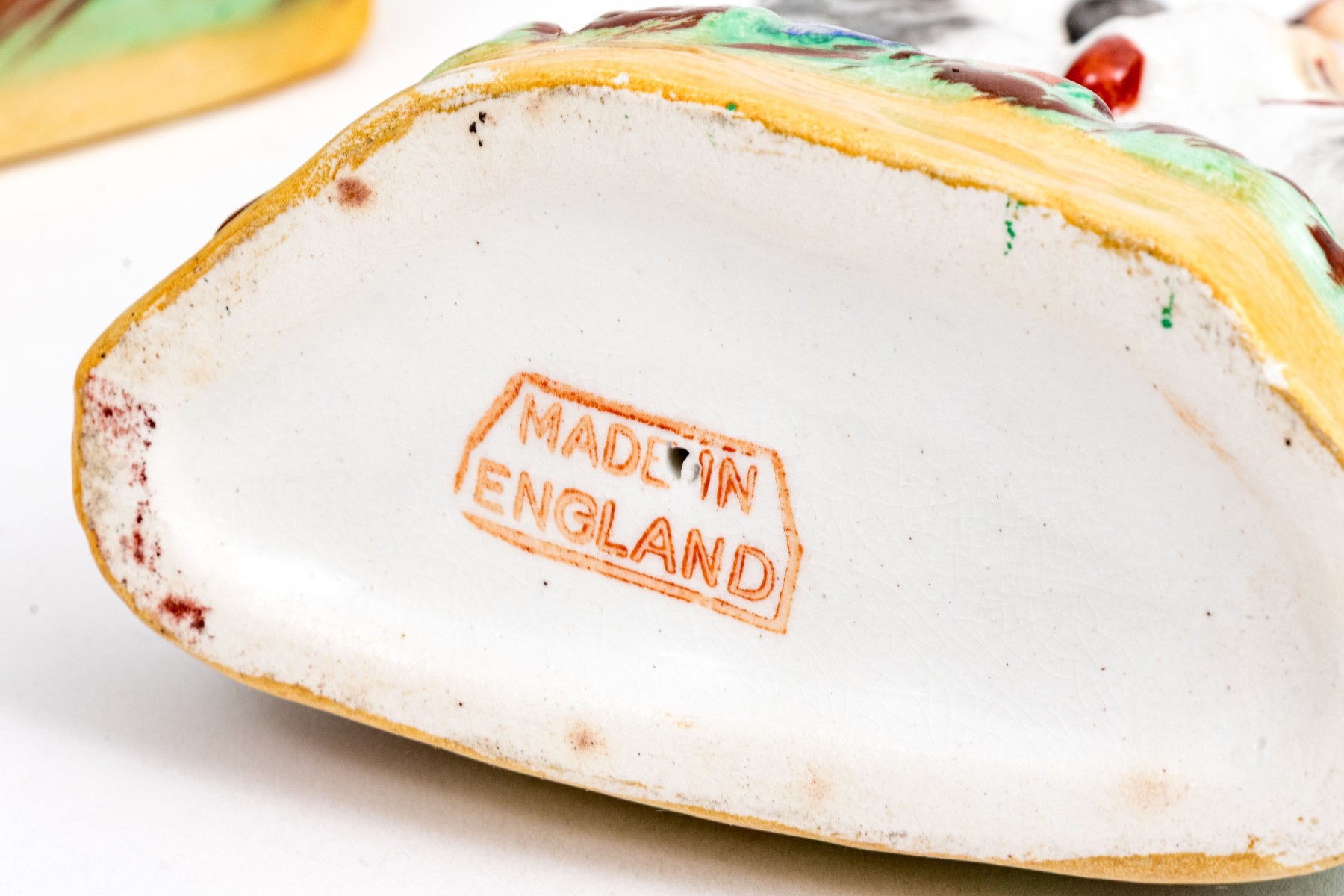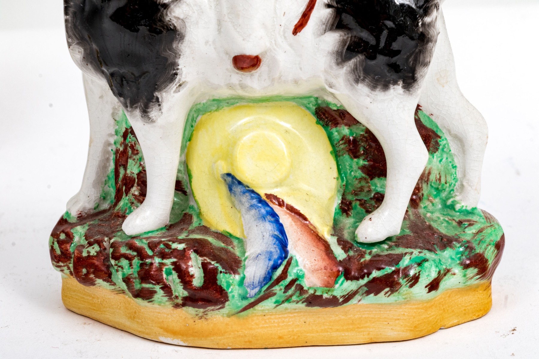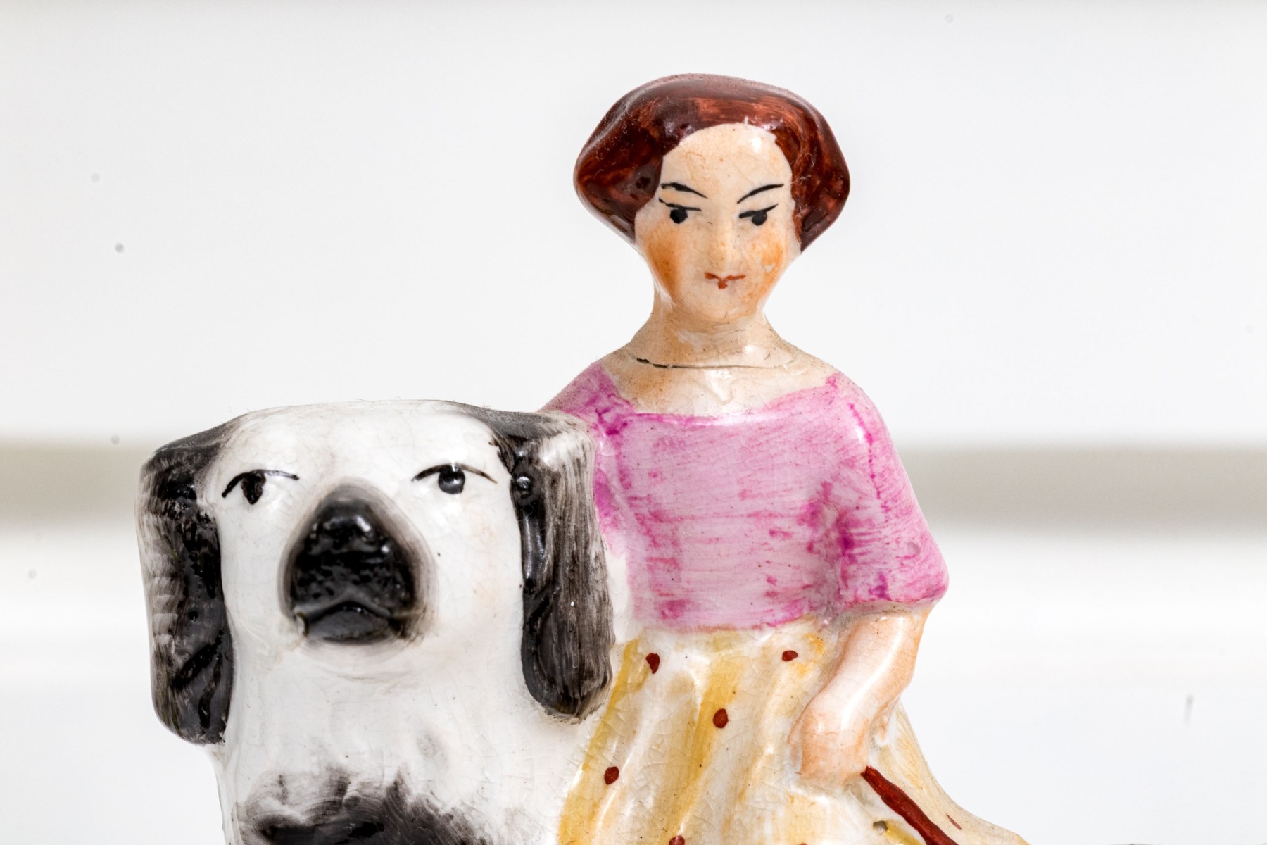 A delightful pair of English ceramic figures of girls with short red hair wearing pink blouses and orange dotted skirts riding atop black and white dogs over green naturalistic bases, large sun hats propped up below the dogs' bellies. The figures are delightfully detailed in vibrant color with a fun aesthetic. Marked underfoot.