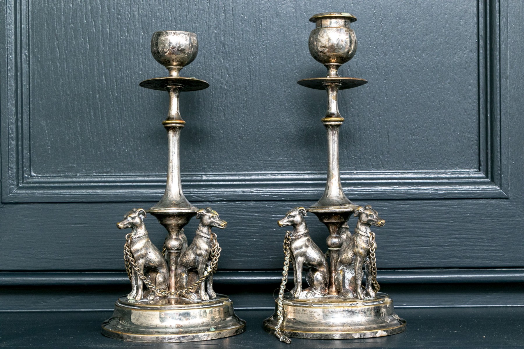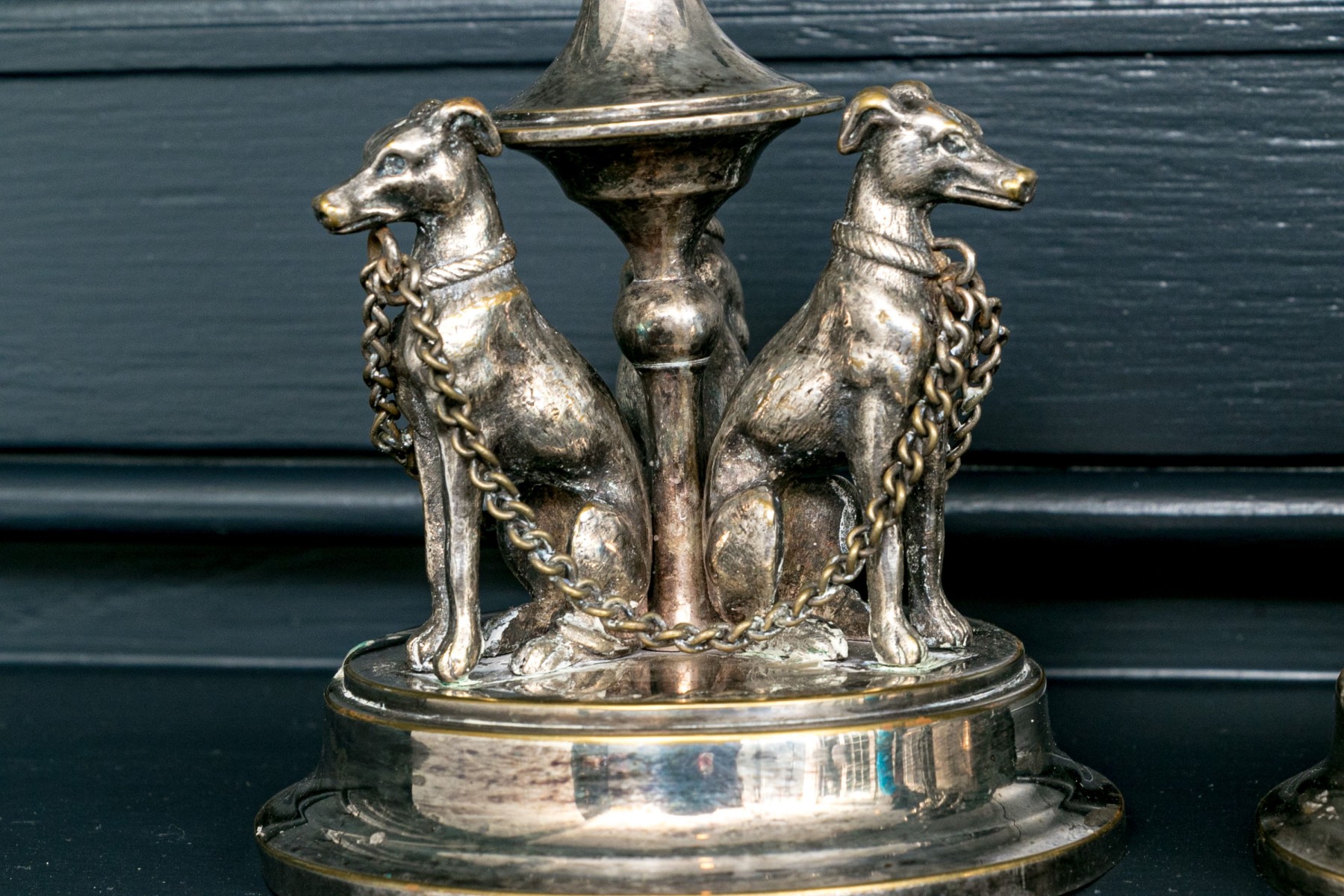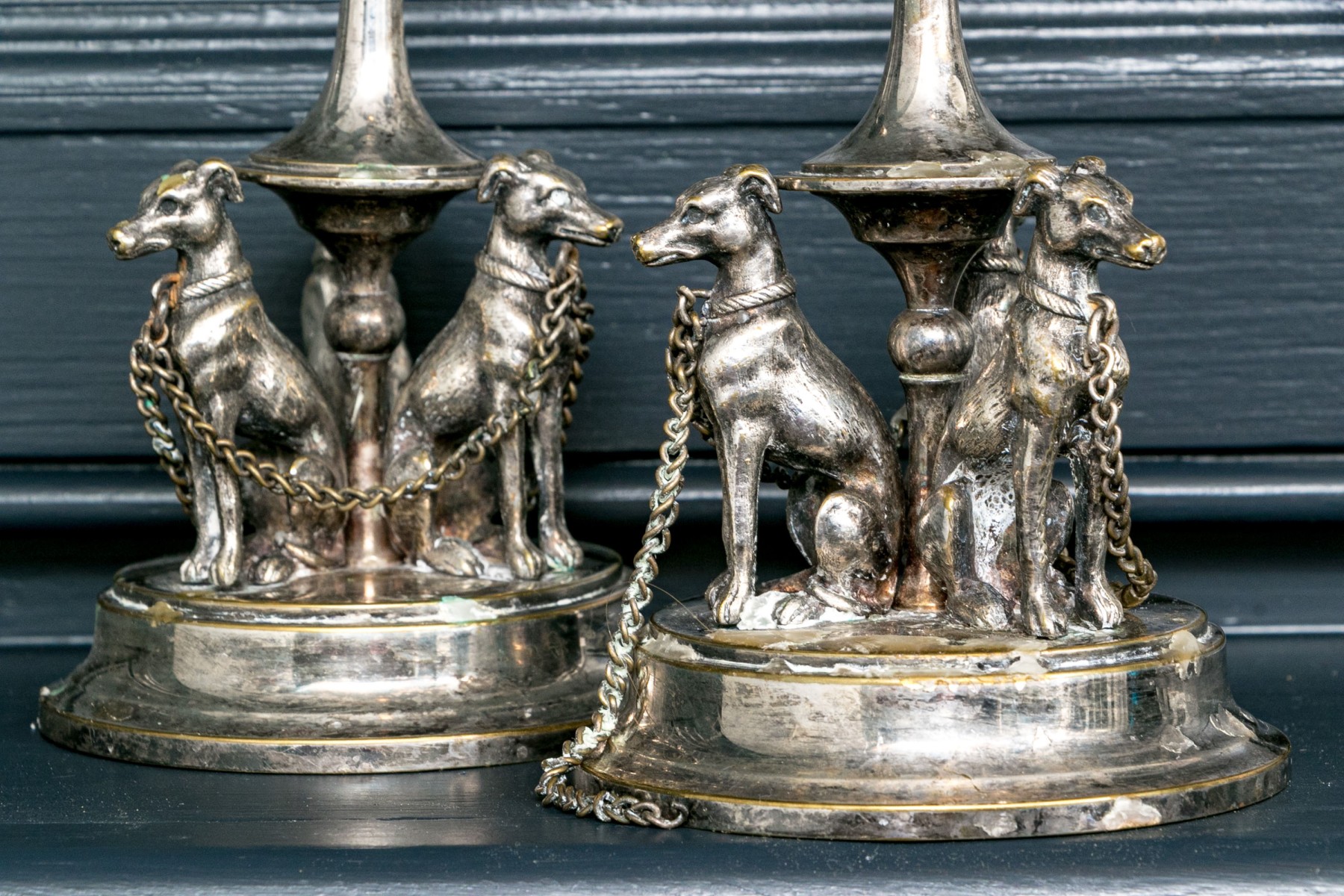 A stately pair of English silver plated candlesticks each sporting a goblet-shaped sconce over an elegantly banded column leading to a tiered, circular base guarded by a trio of figural greyhound dogs connected by chains around the collars.