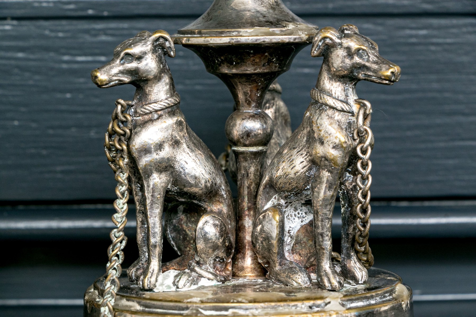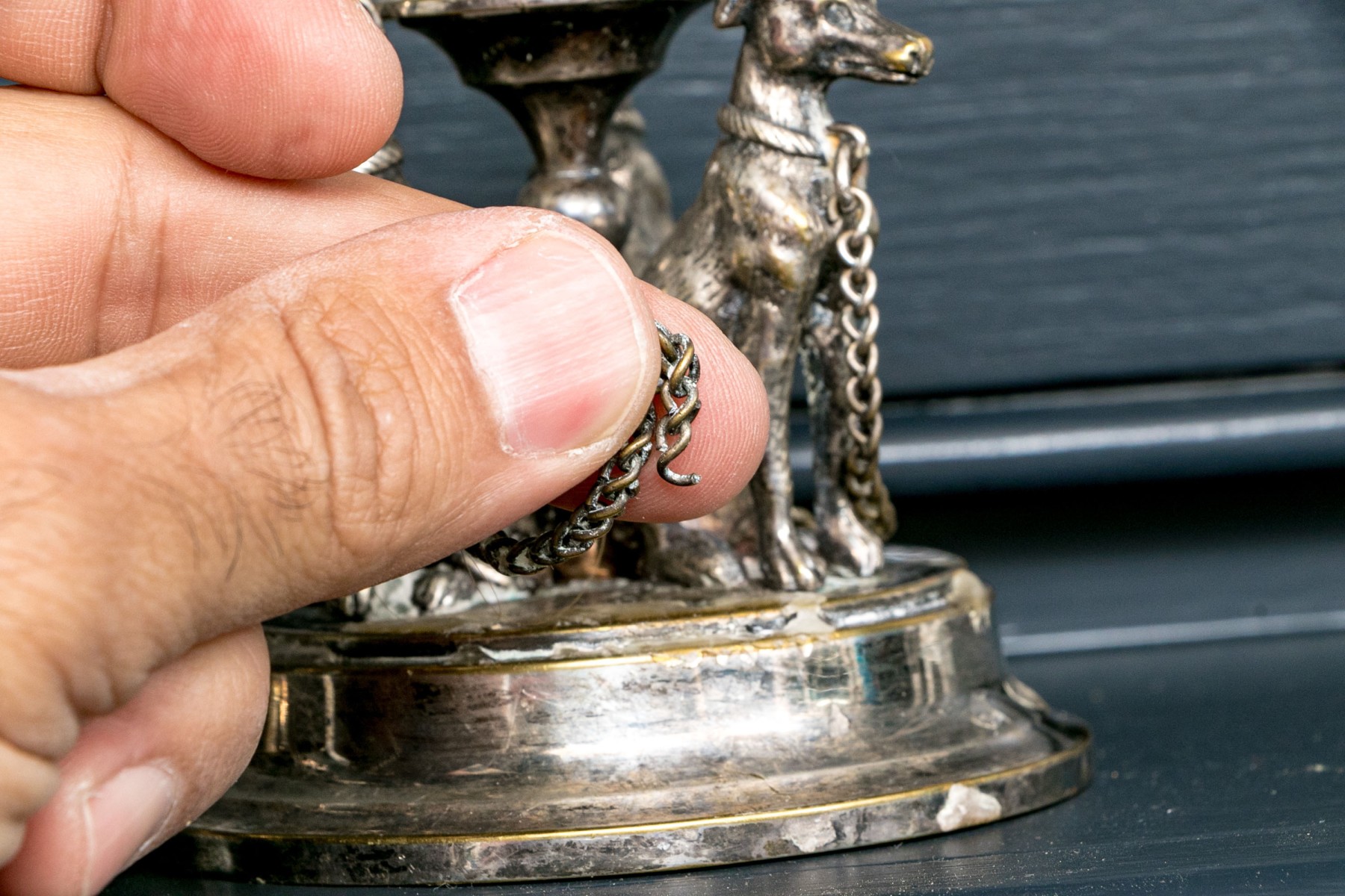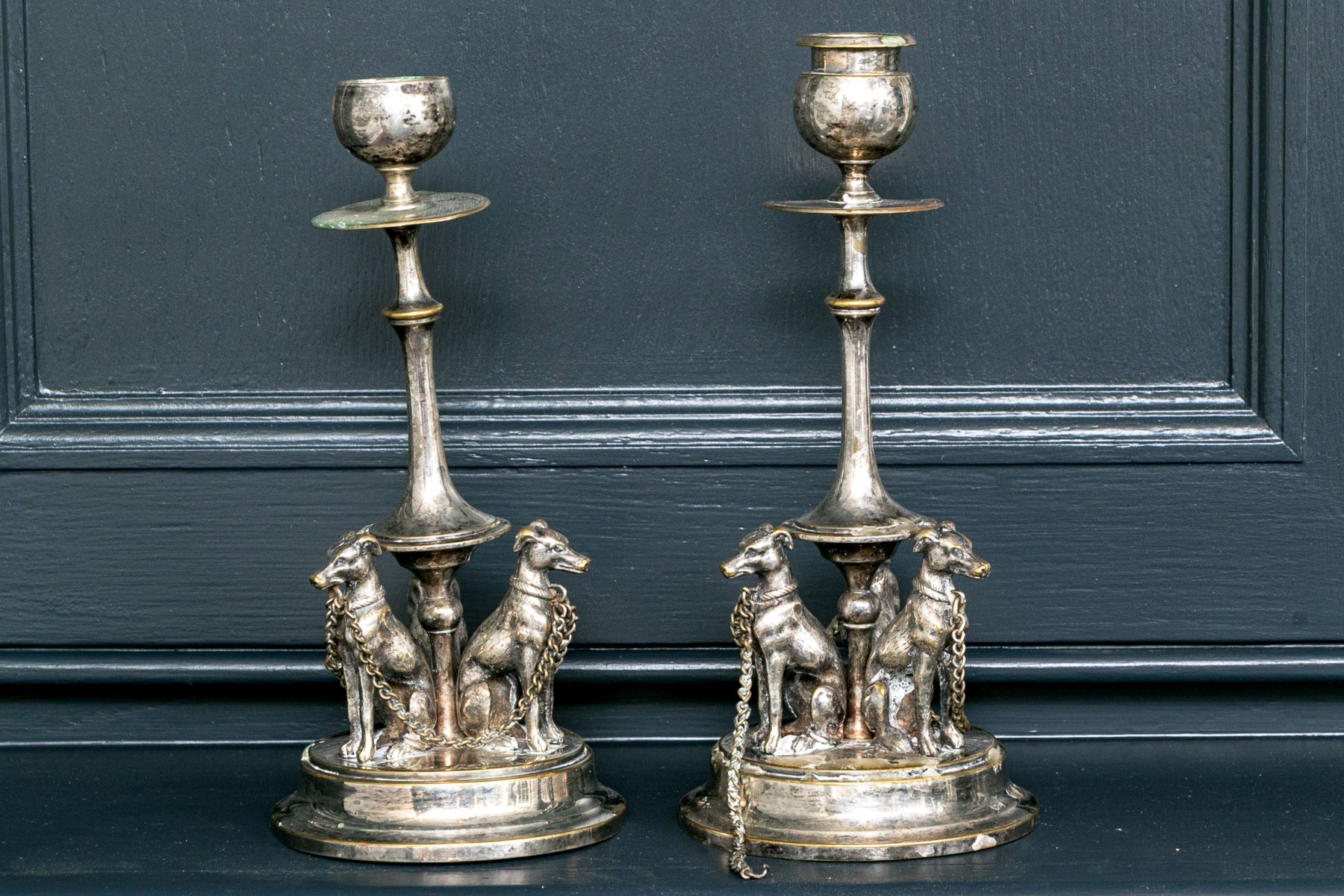 A stately pair of English silver plated candlesticks each sporting a goblet-shaped sconce over an elegantly banded column leading to a tiered, circular base guarded by a trio of figural greyhound dogs connected by chains around the collars.