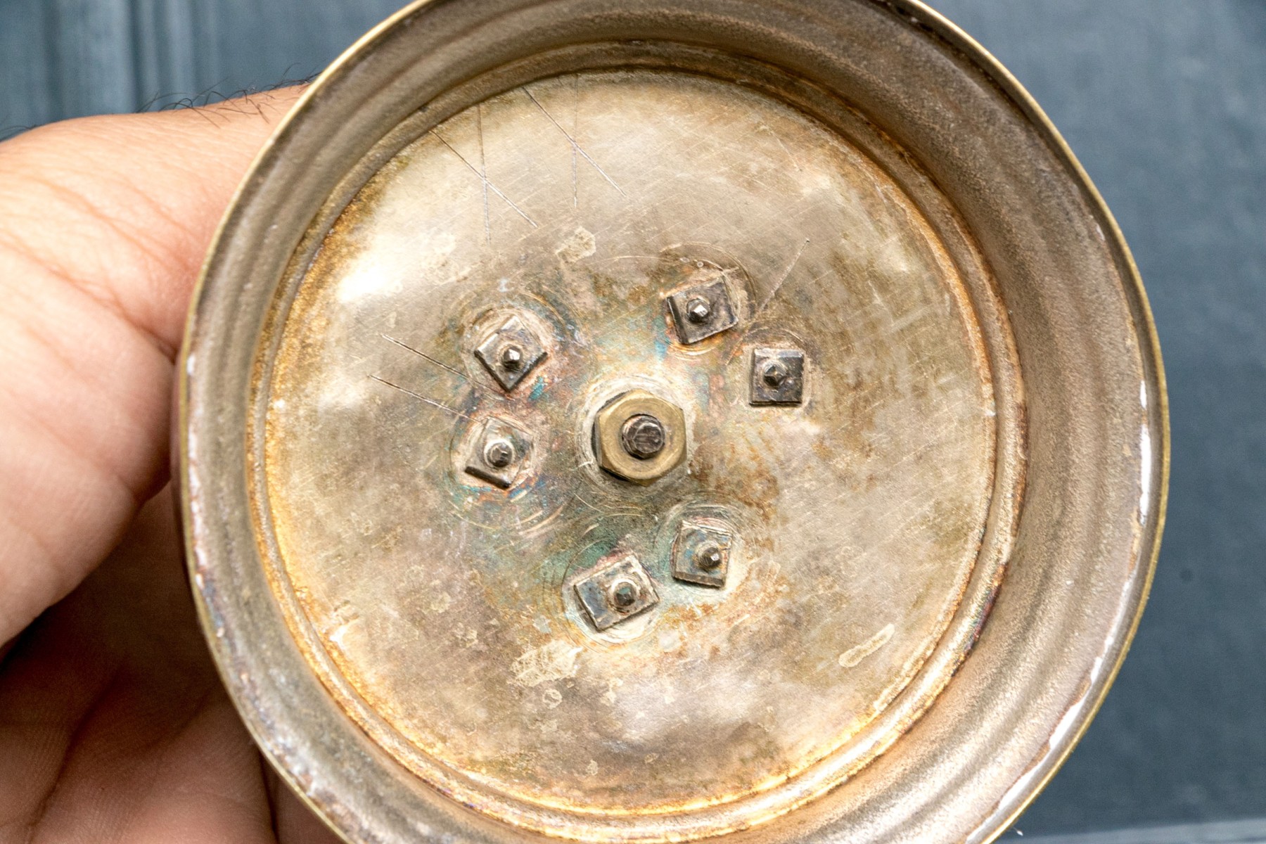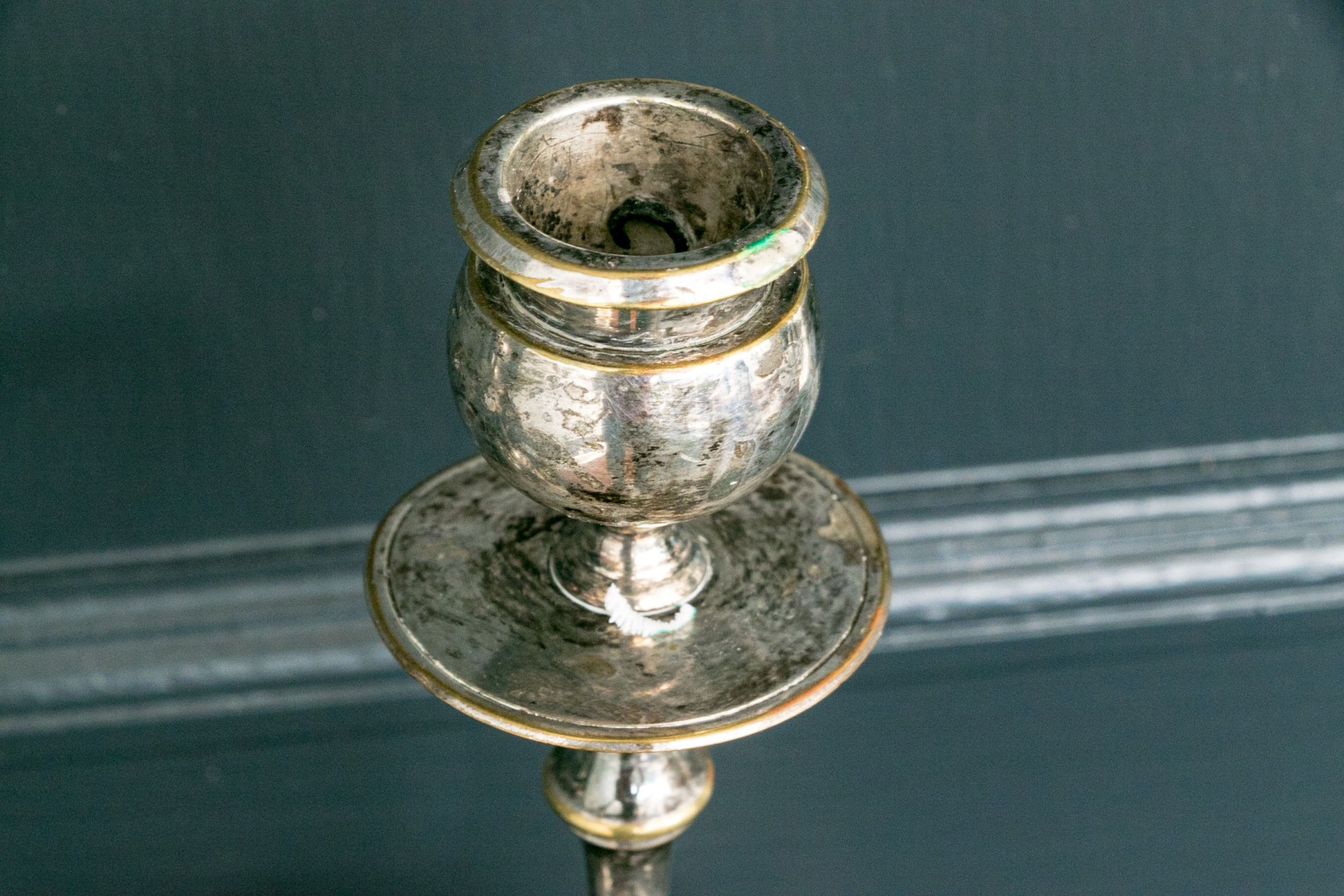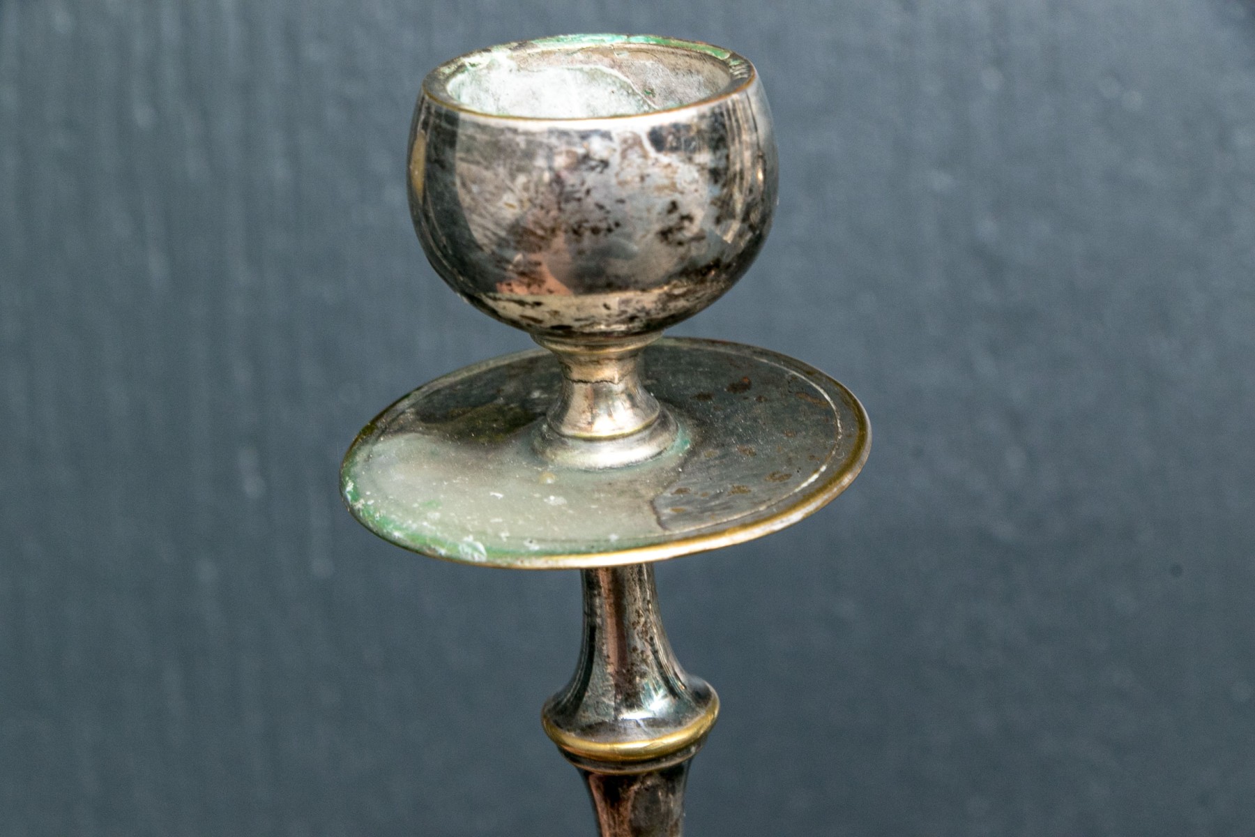 One candlestick appears to have a nozzle insert which could not be removed while the second was lacking the insert. There are bends and each are heavily tarnished. The chains on one between the dogs is off and may be able to be repaired or can be left as is. Despite wear, a beautifully designed pair with plenty more life to live.