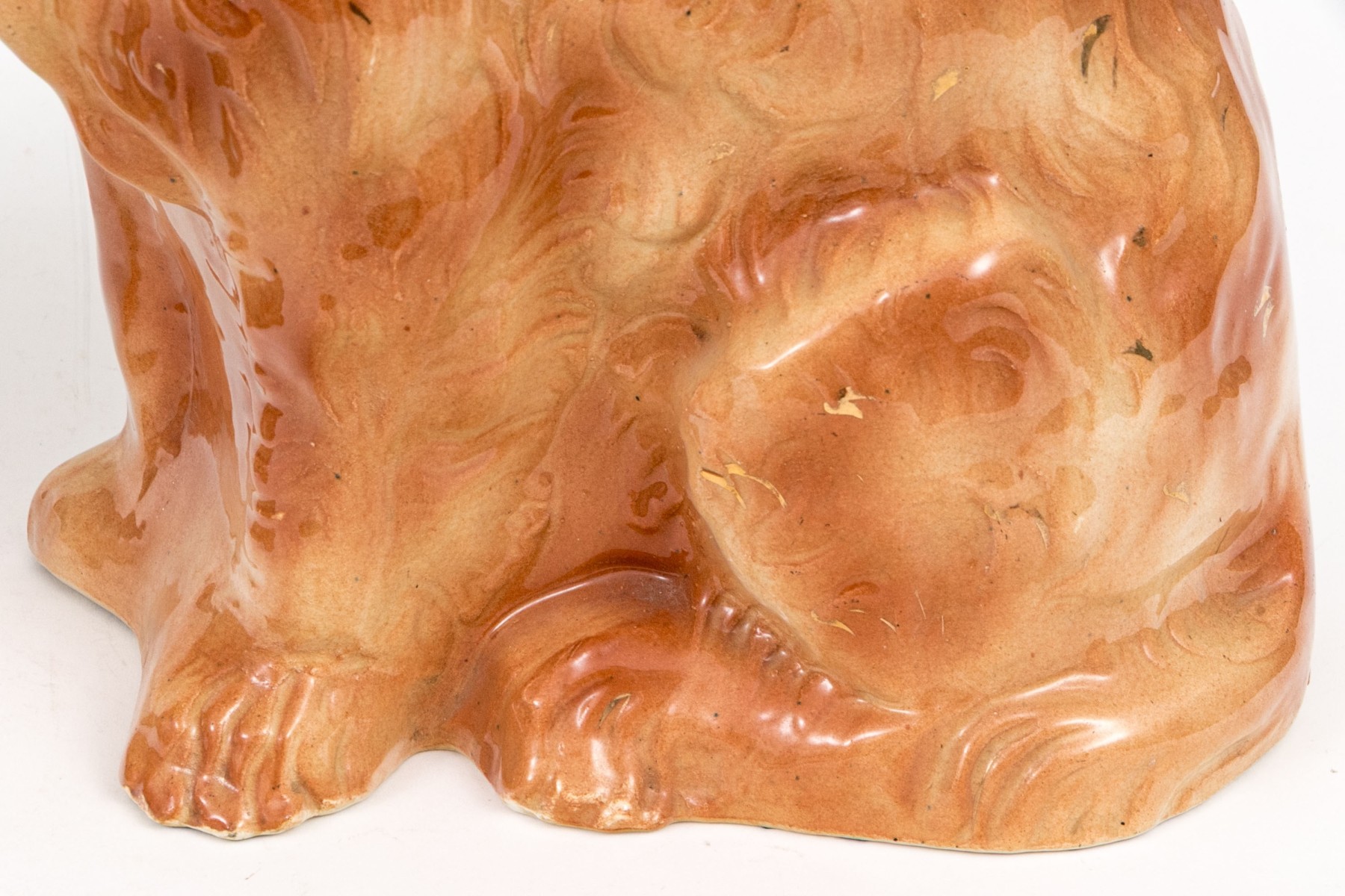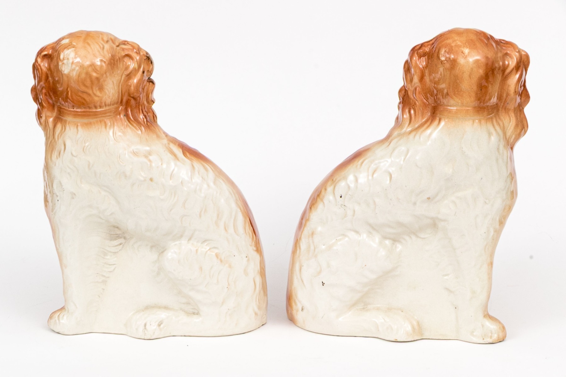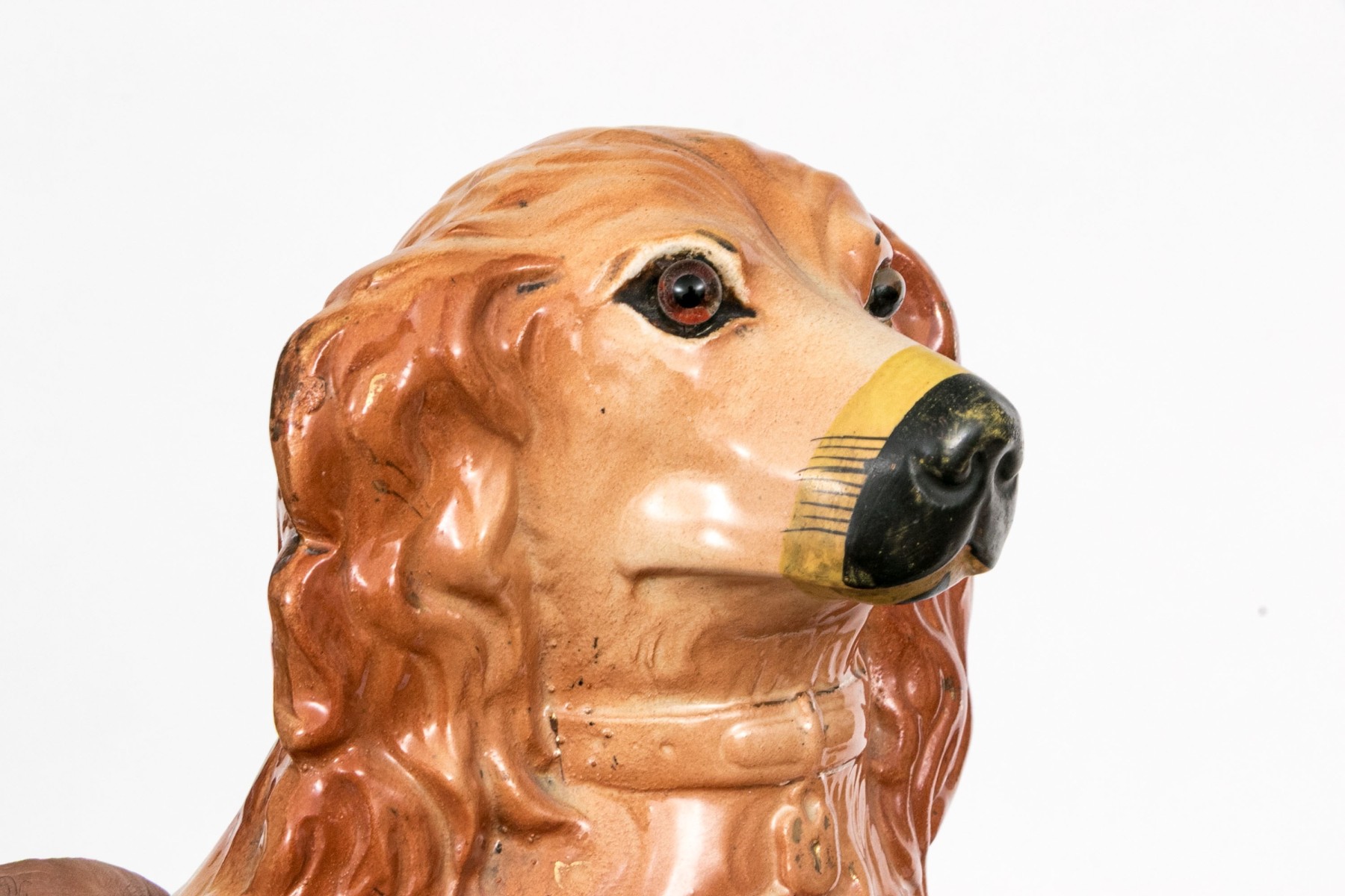 Wonderfully painted in red to orange hued tones. Each with chain collars and leashes with lockets to their collars. Both depicted seated with heads turned inwards and feature inlaid glass eyes.