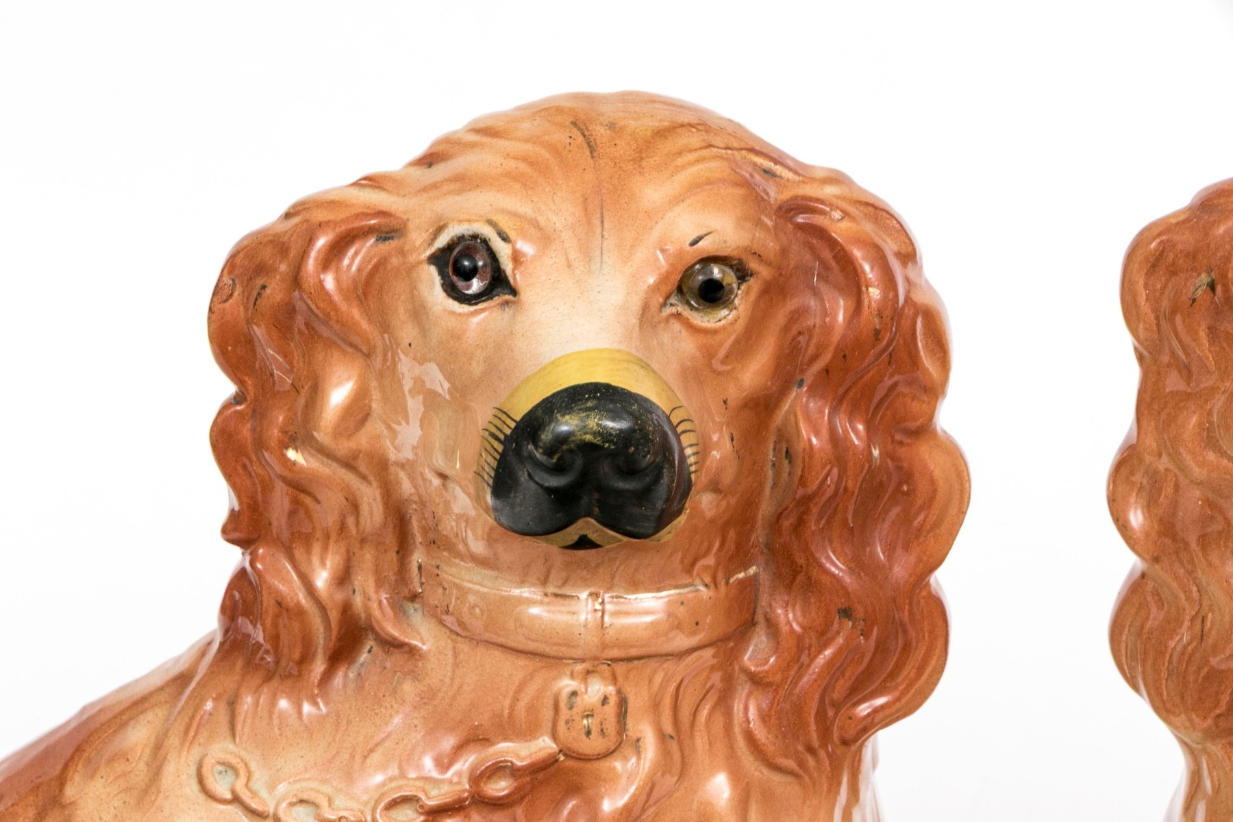 Wonderfully painted in red to orange hued tones. Each with chain collars and leashes with lockets to their collars. Both depicted seated with heads turned inwards and feature inlaid glass eyes.