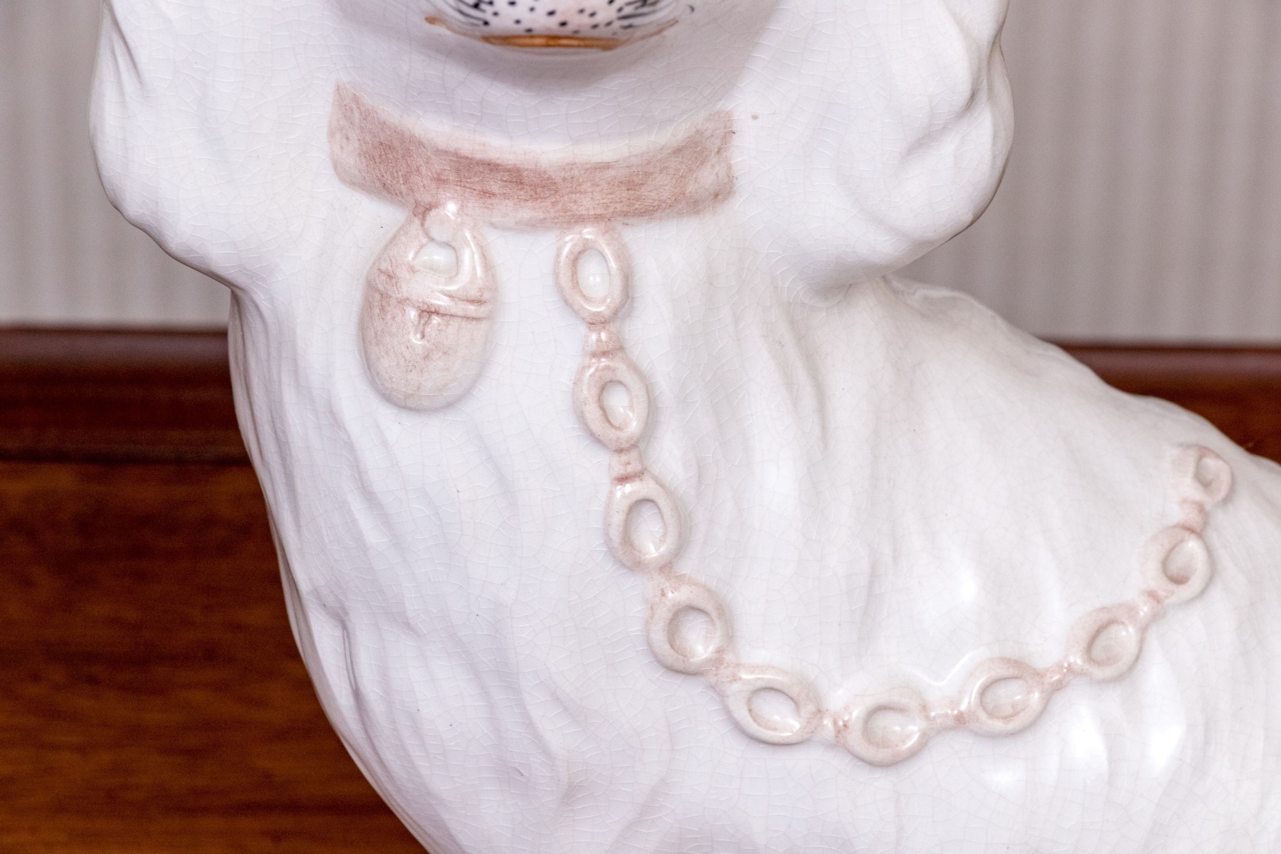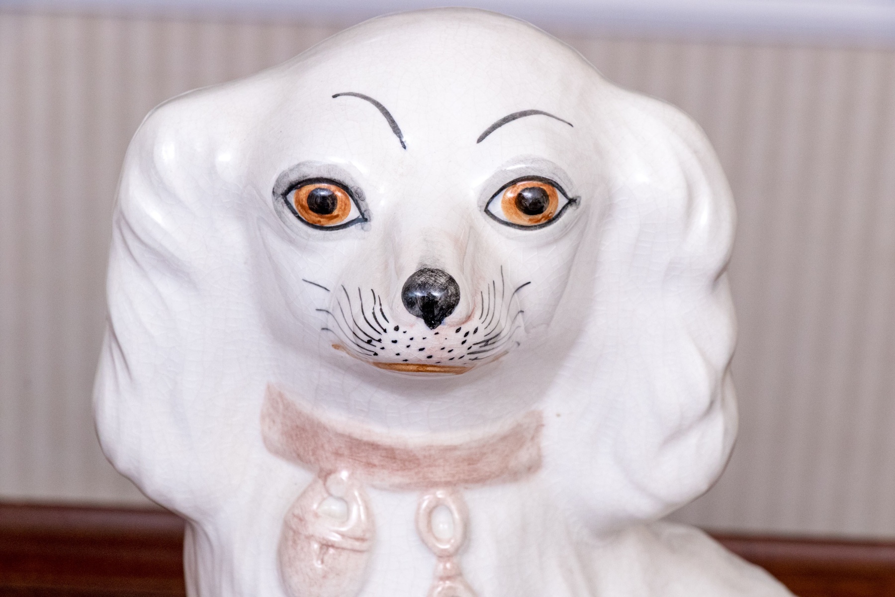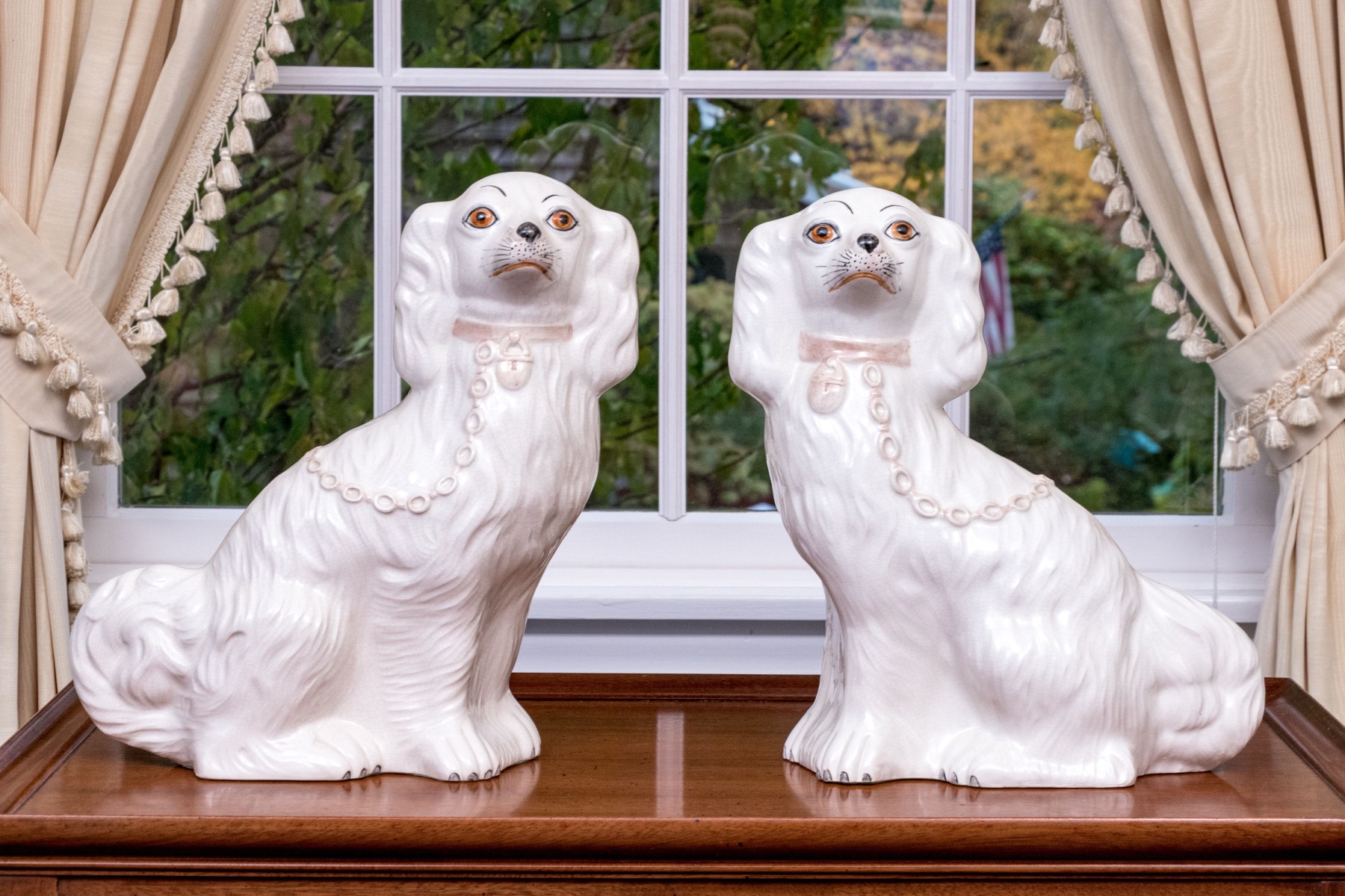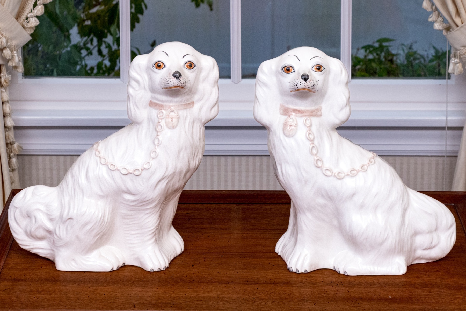 A fabulous pair of classic English Staffordshire hand-painted ceramic spaniel dogs both appearing seated with heads turned in opposing directions. Each spaniel appears well groomed, with chain collars and chain leashes.
