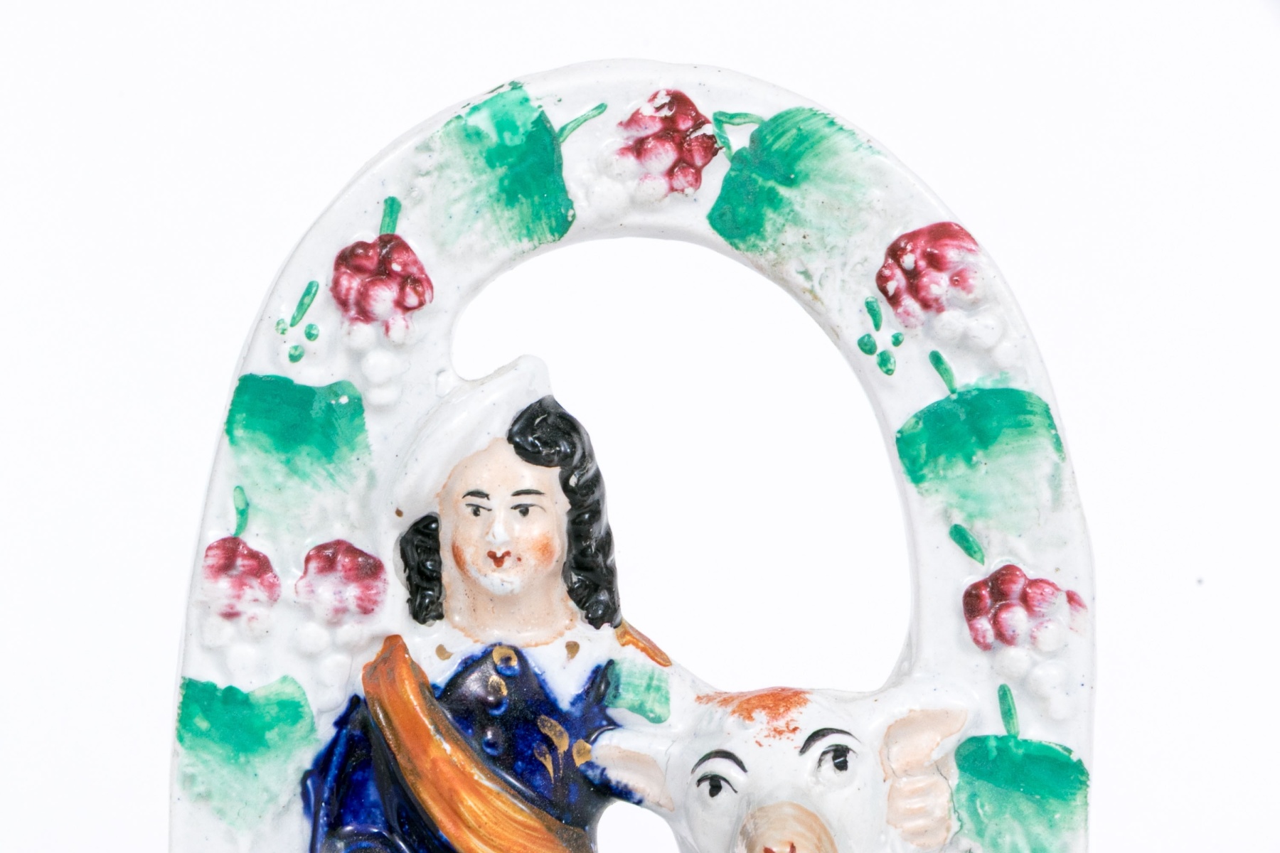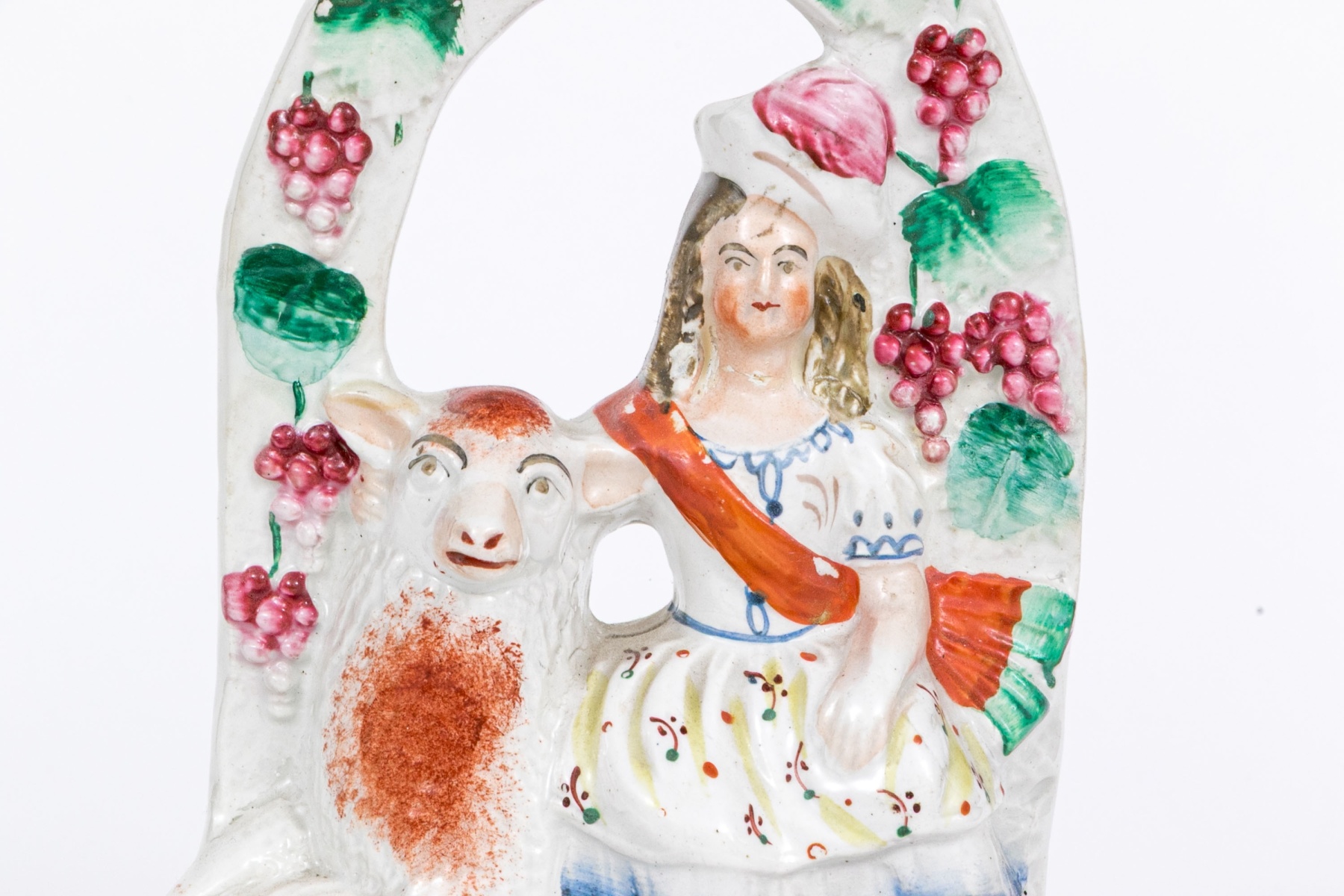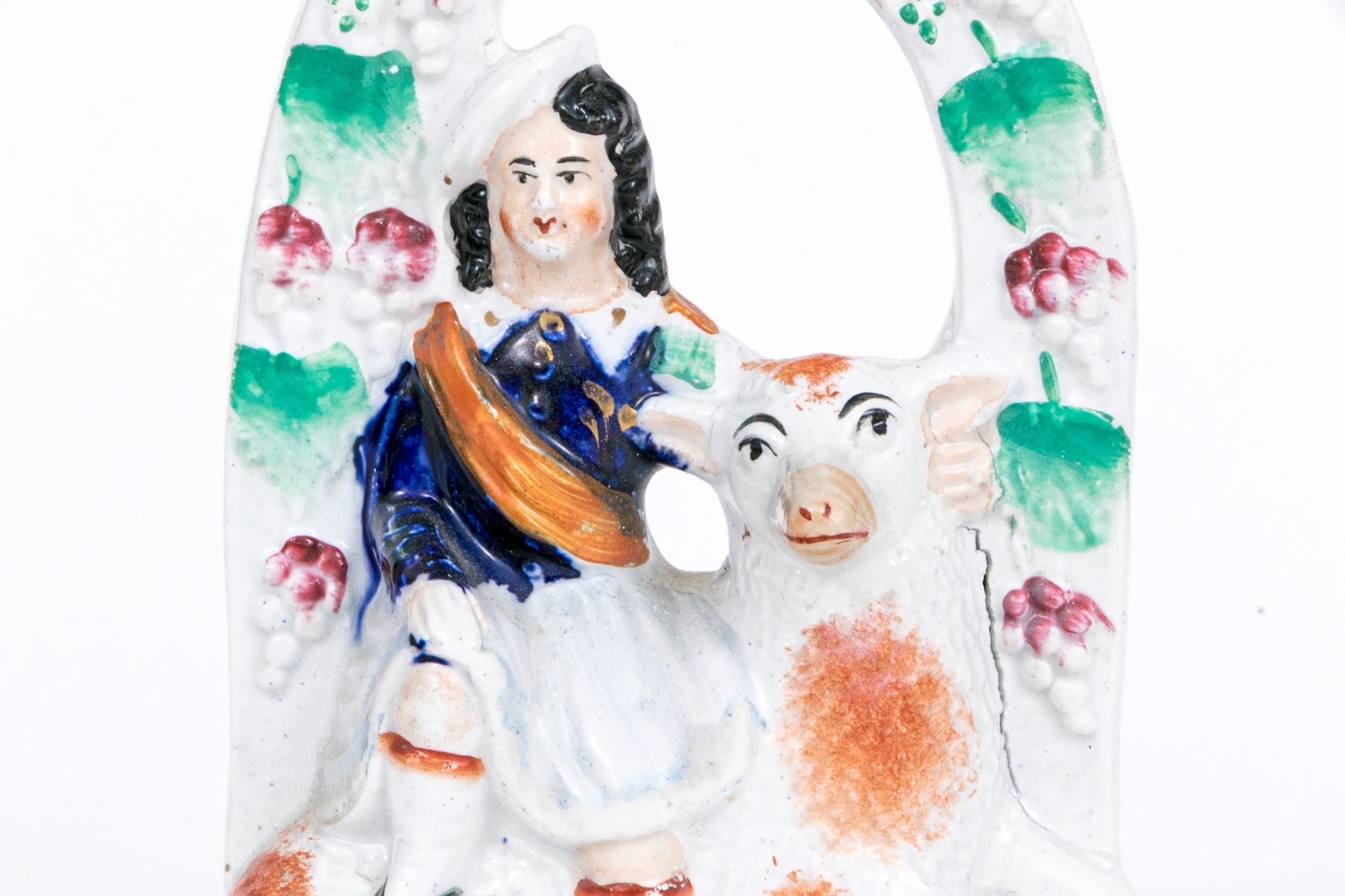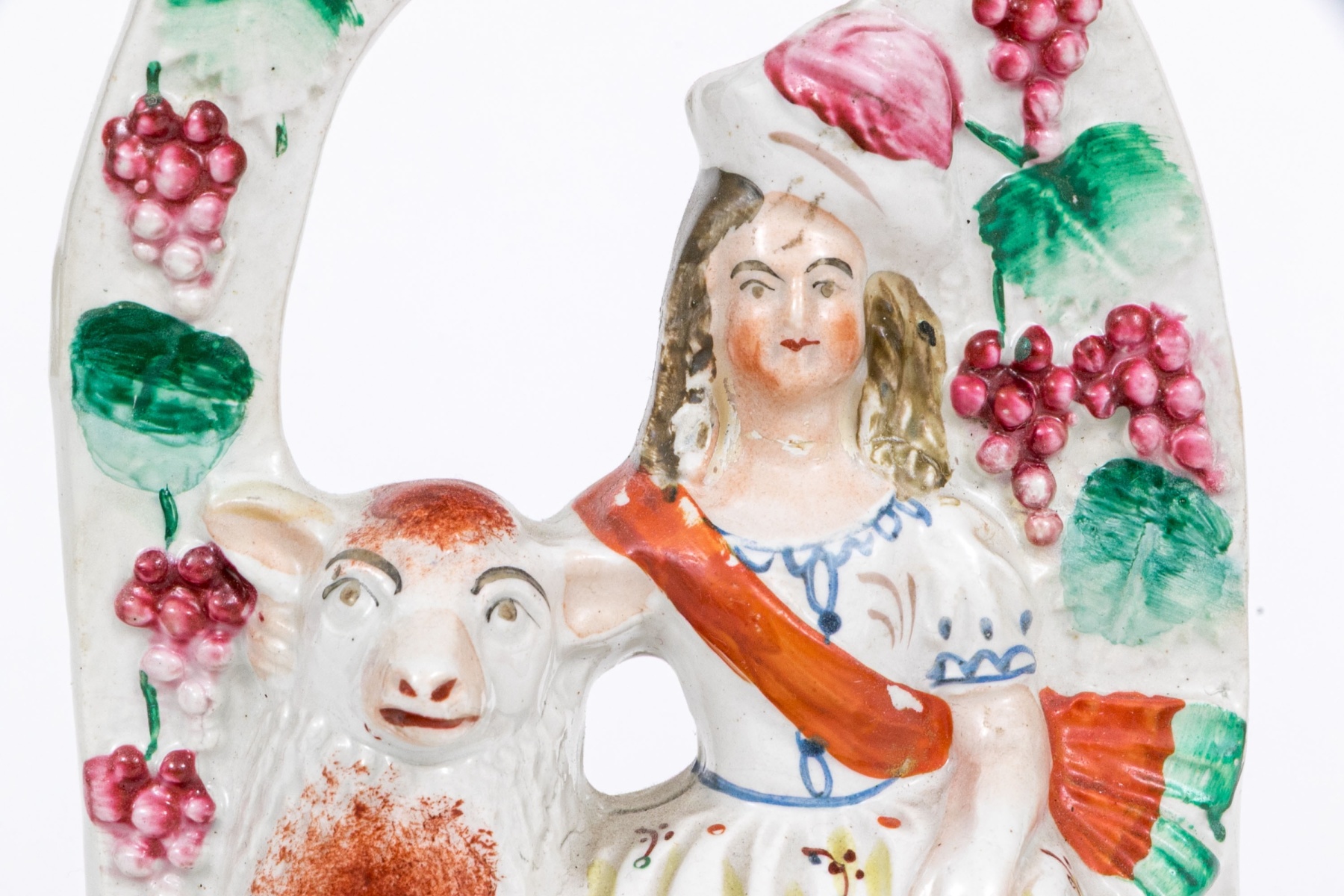Comprised of one figure with long dark hair and an orange/red hued sash across her chest, seated on a resting cow with red patches, with foliate decorated arched trellis. Together with a second of the same form with woman in white ground dress with orange sash and feathered hat.