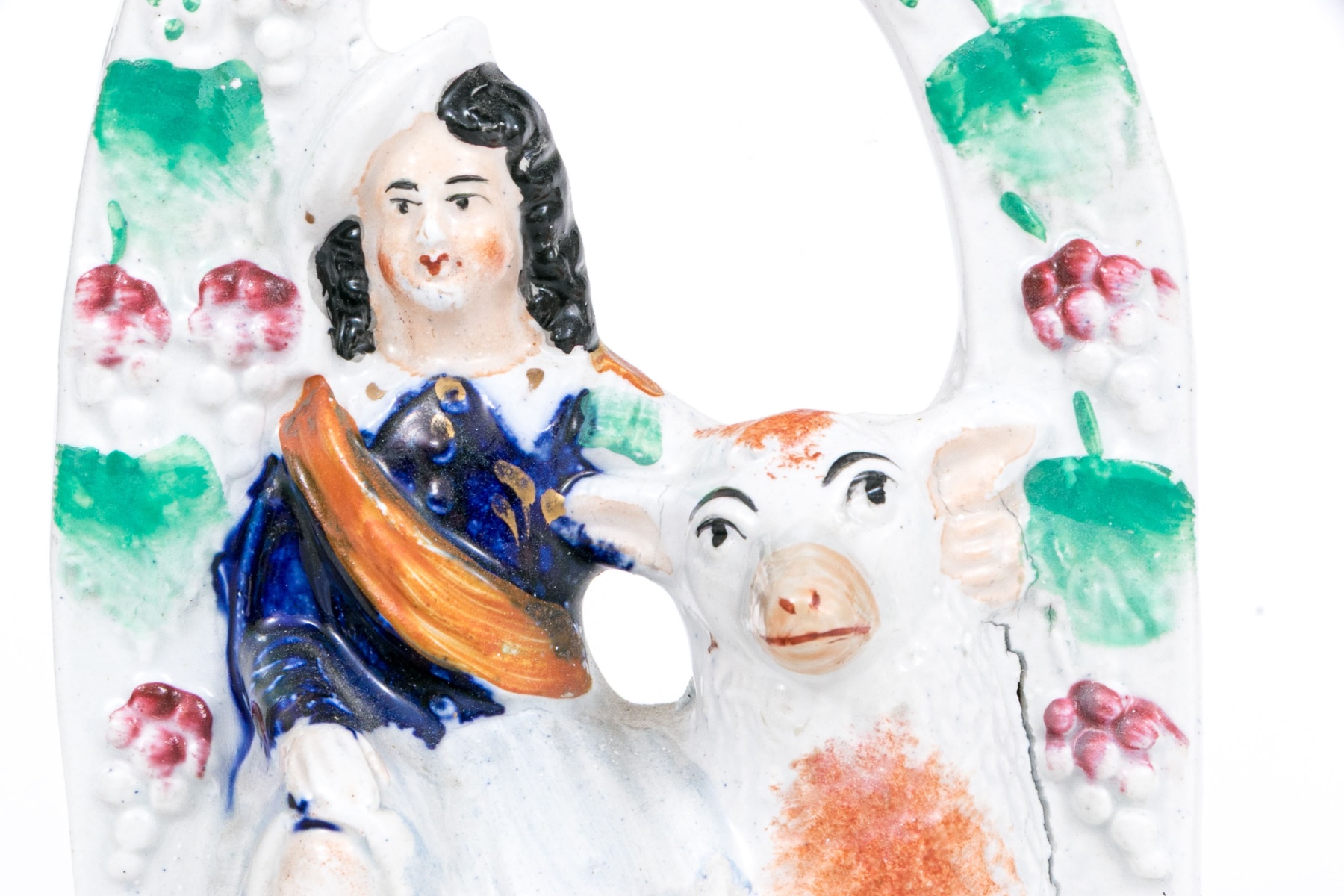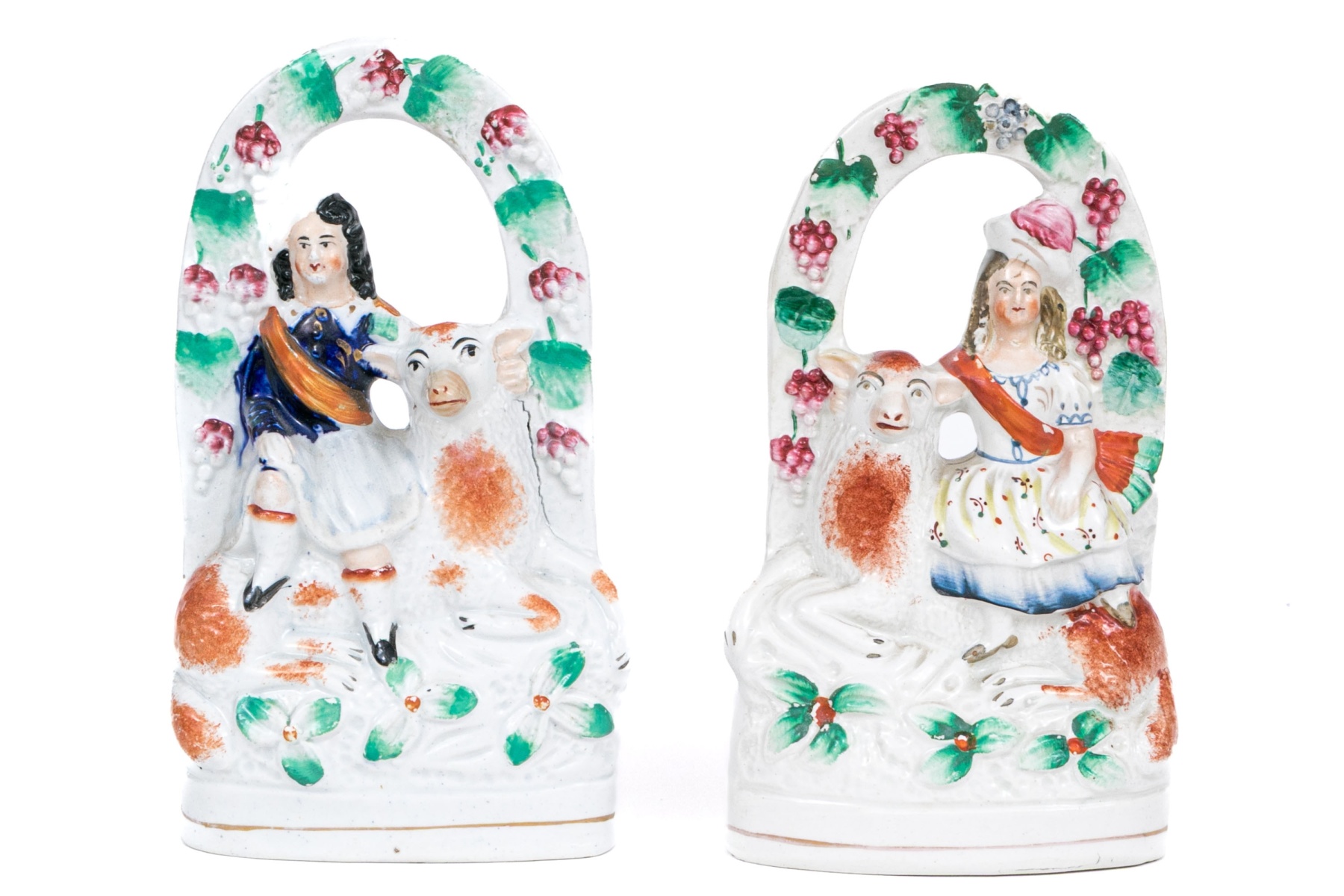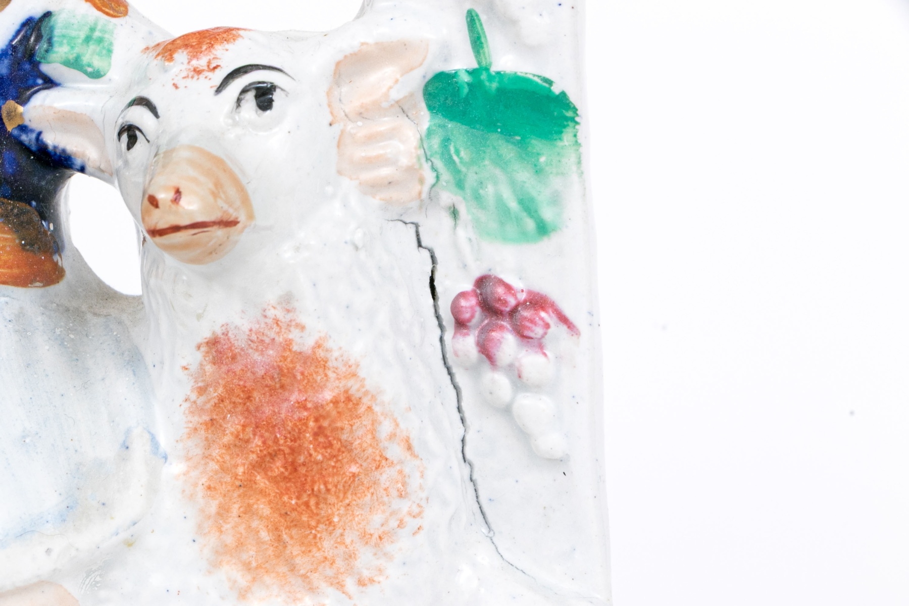 Comprised of one figure with long dark hair and an orange/red hued sash across her chest, seated on a resting cow with red patches, with foliate decorated arched trellis. Together with a second of the same form with woman in white ground dress with orange sash and feathered hat.