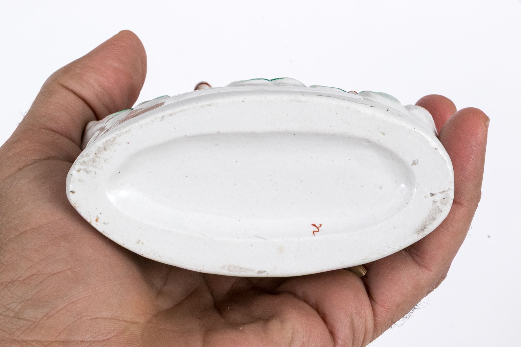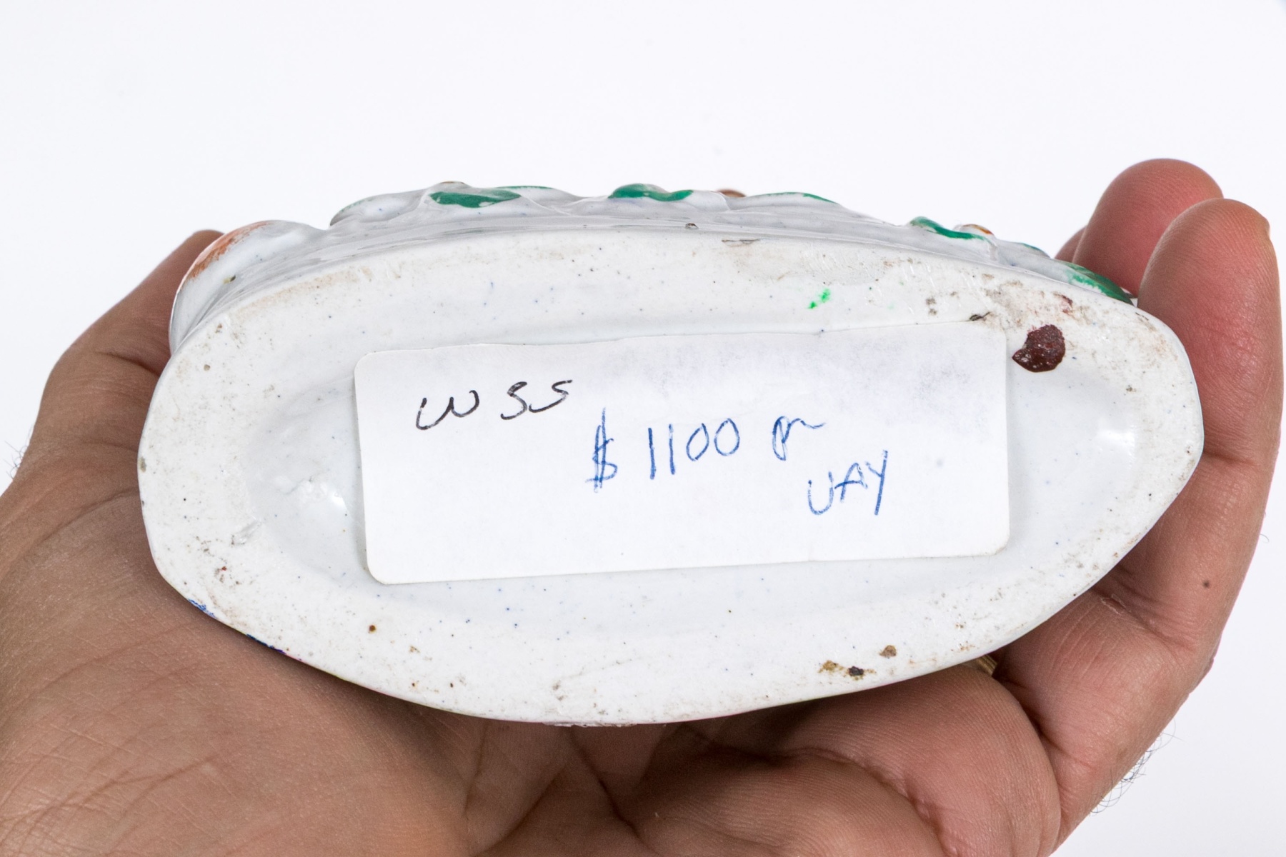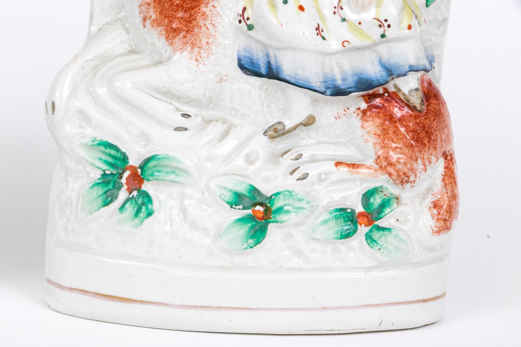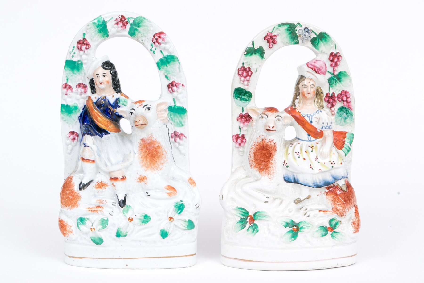 Comprised of one figure with long dark hair and an orange/red hued sash across her chest, seated on a resting cow with red patches, with foliate decorated arched trellis. Together with a second of the same form with woman in white ground dress with orange sash and feathered hat.