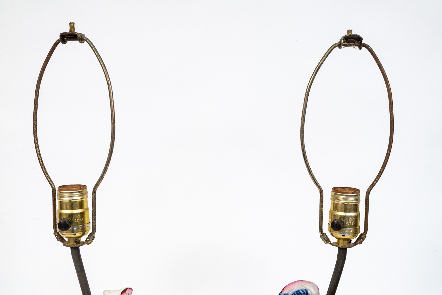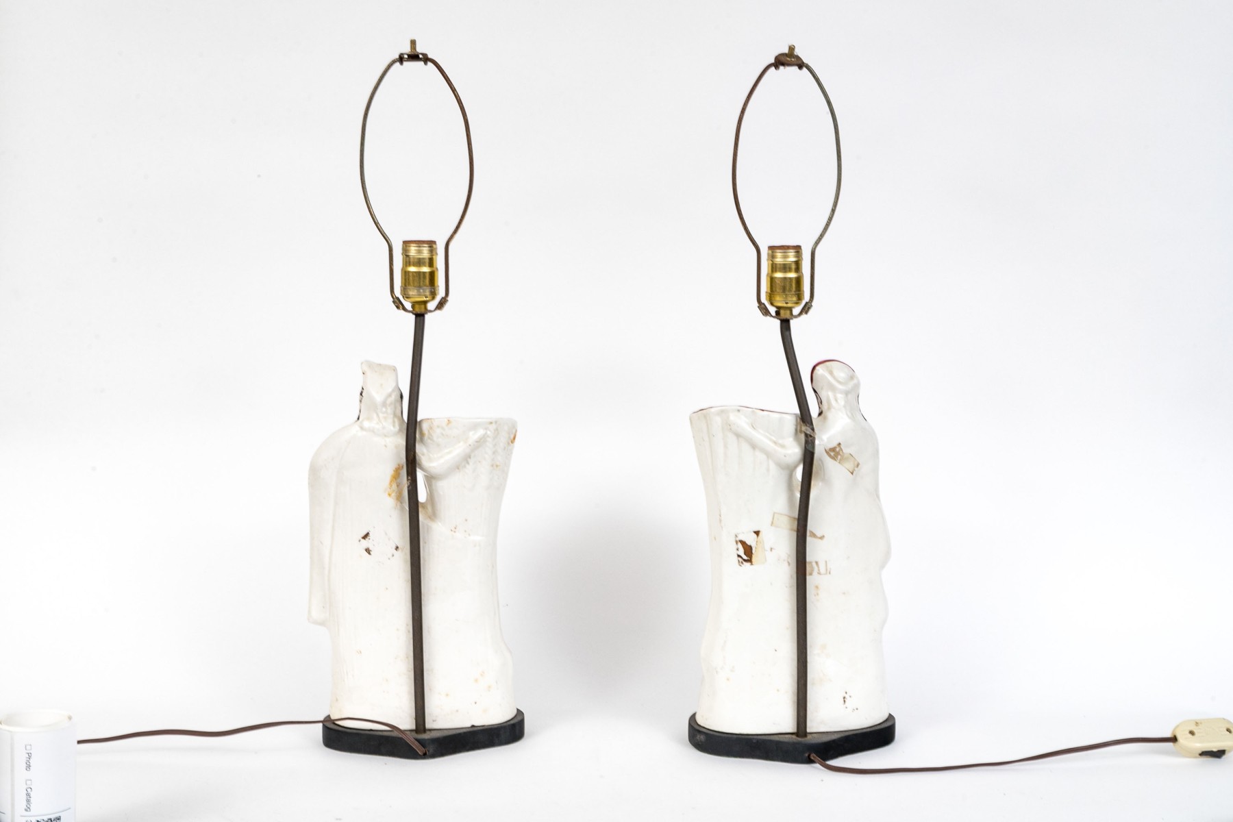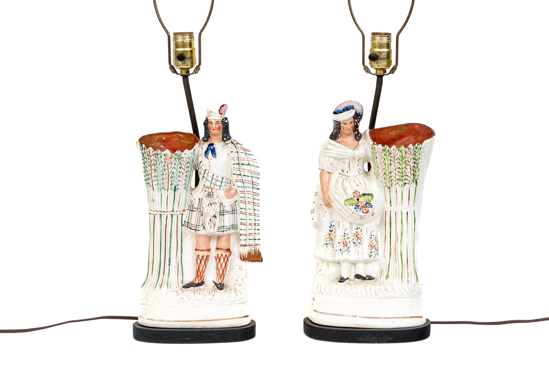 Comprised of a pair of Highlander with wheat sheaf spill vases that are hand painted and mounted and lamps. Lacking shades