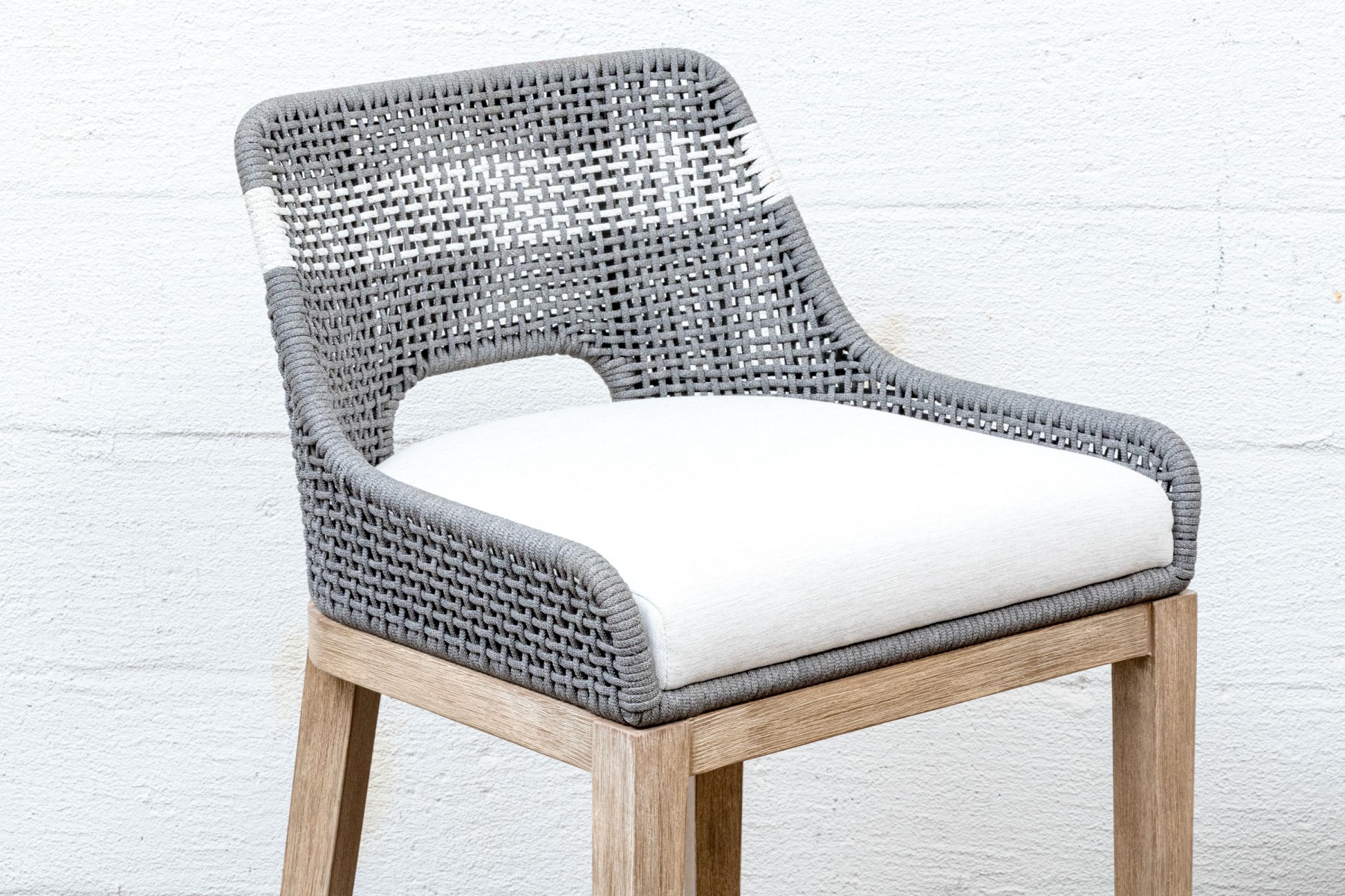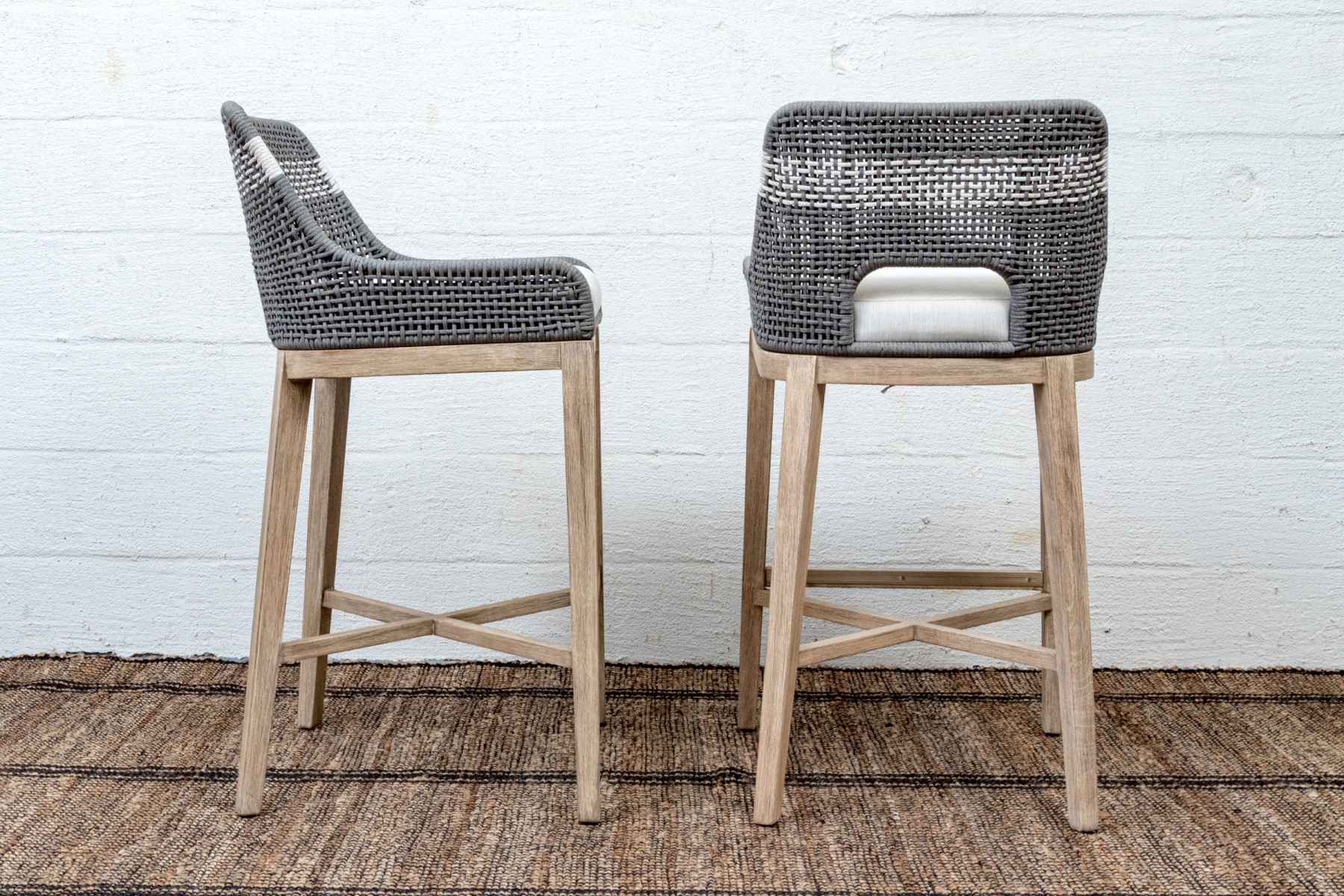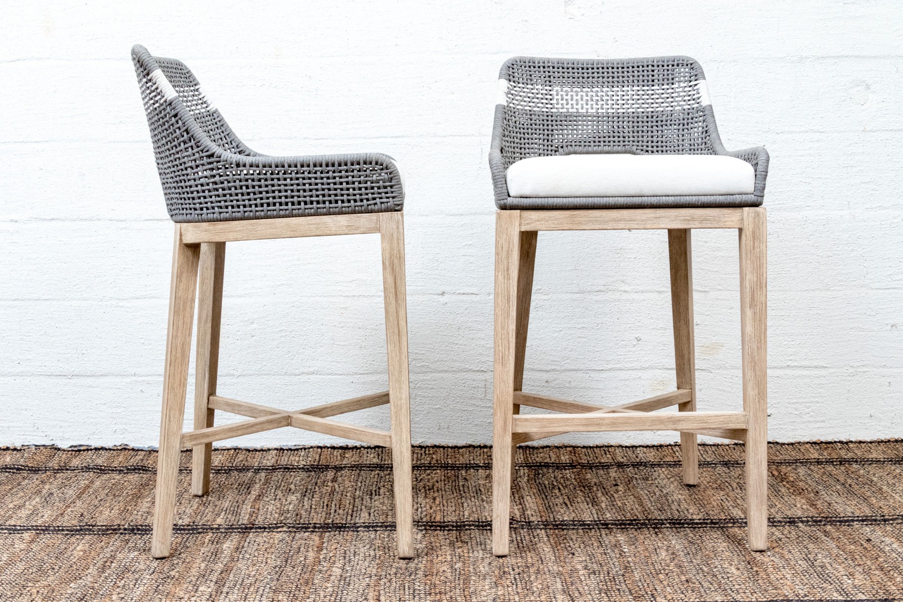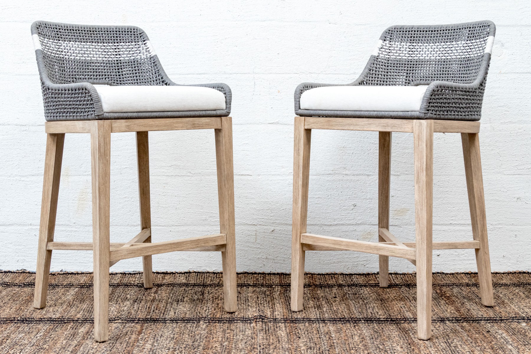 A handsome pair of Essentials For Living "Tapestry Outdoor" barstools with stylish all-weather gray and white woven backs sporting open arches at the bottoms. Fitted with loose white seat cushions and raised on natural teak bases with tapered legs, X-stretchers, and footrest bars along the fronts.