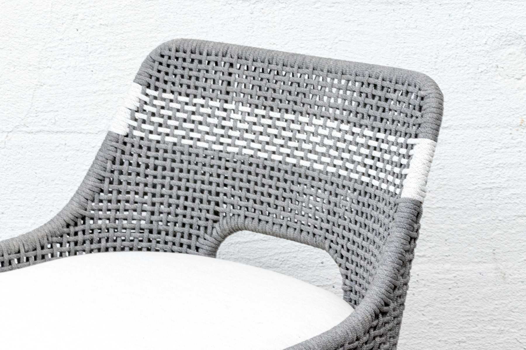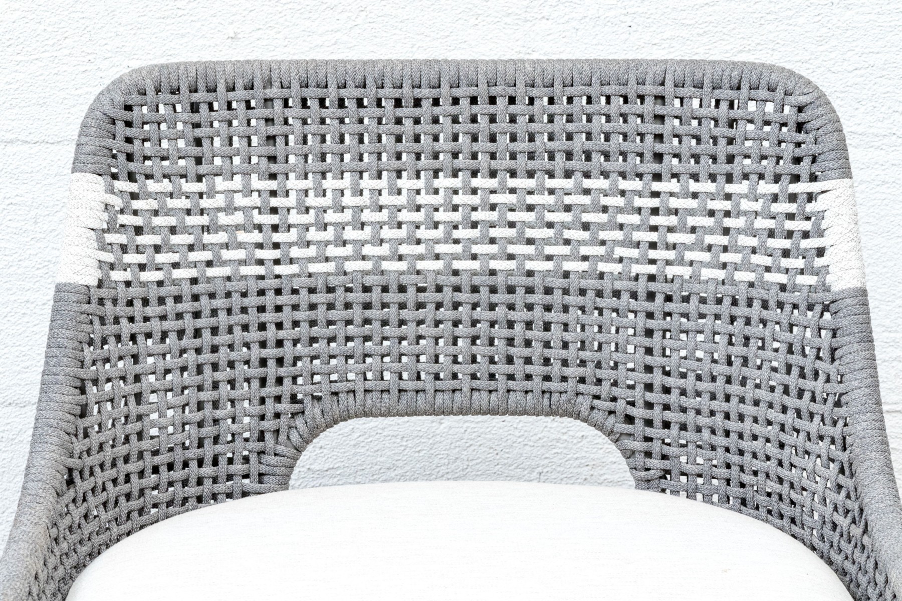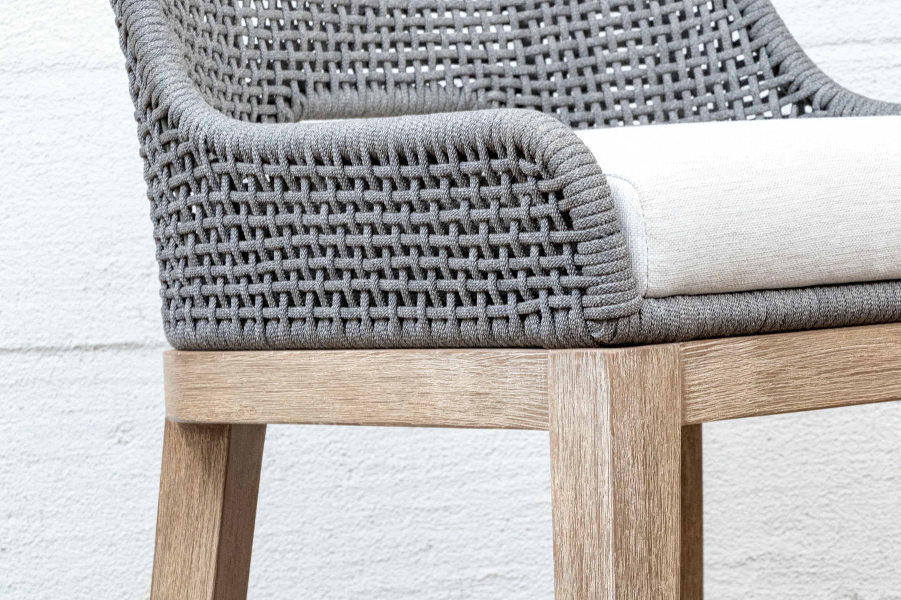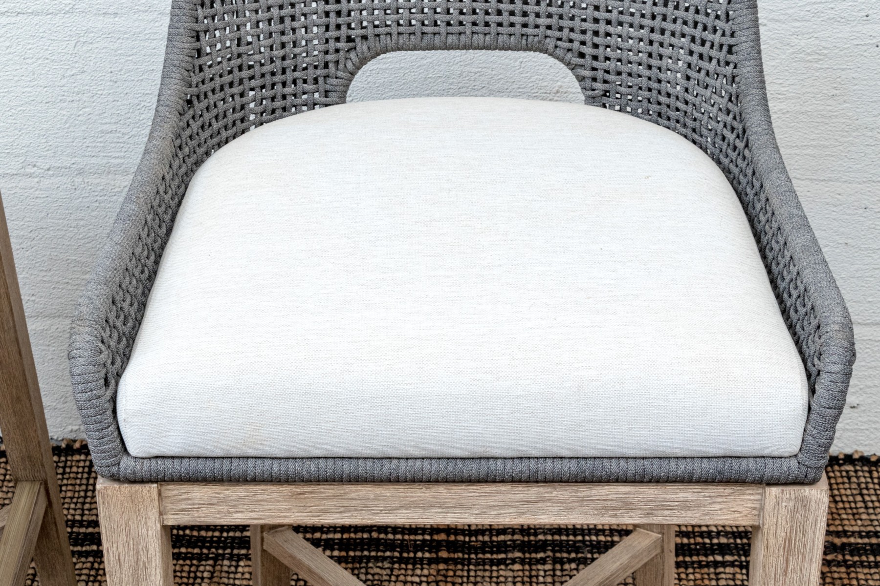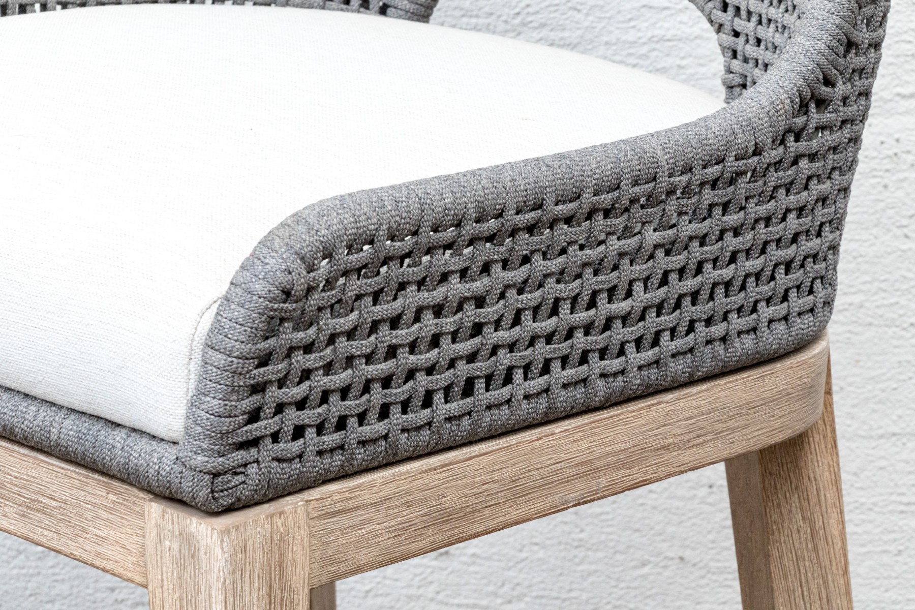 A handsome pair of Essentials For Living "Tapestry Outdoor" barstools with stylish all-weather gray and white woven backs sporting open arches at the bottoms. Fitted with loose white seat cushions and raised on natural teak bases with tapered legs, X-stretchers, and footrest bars along the fronts.