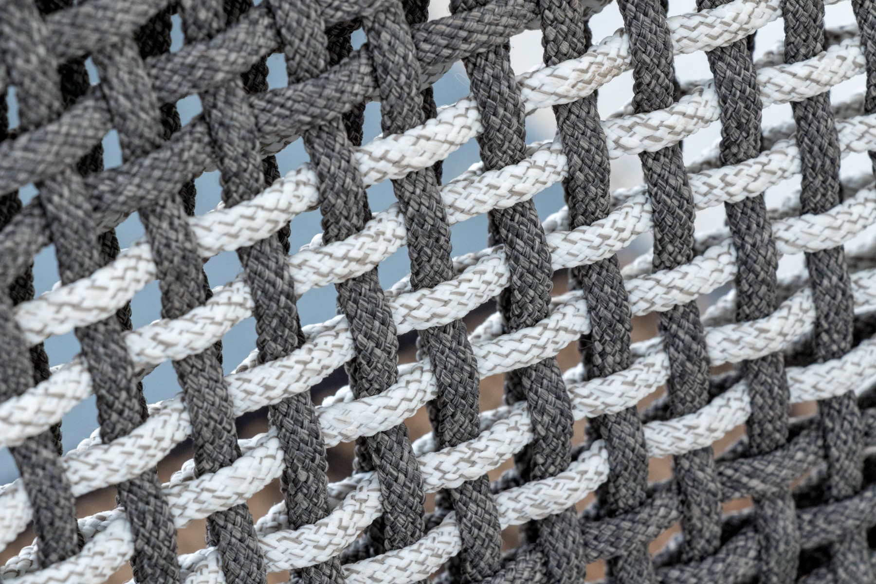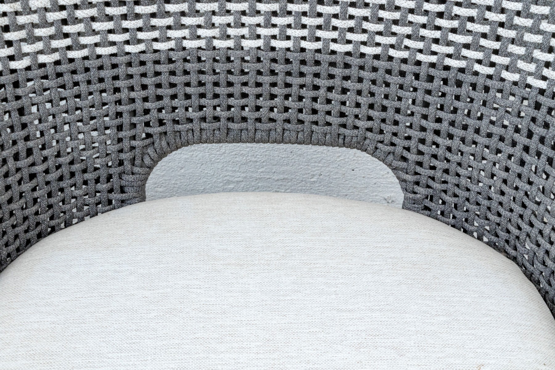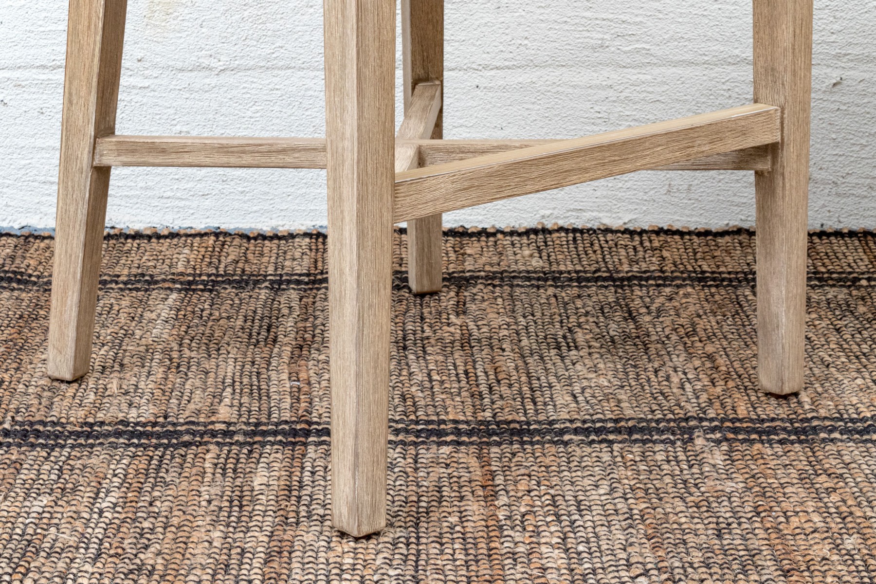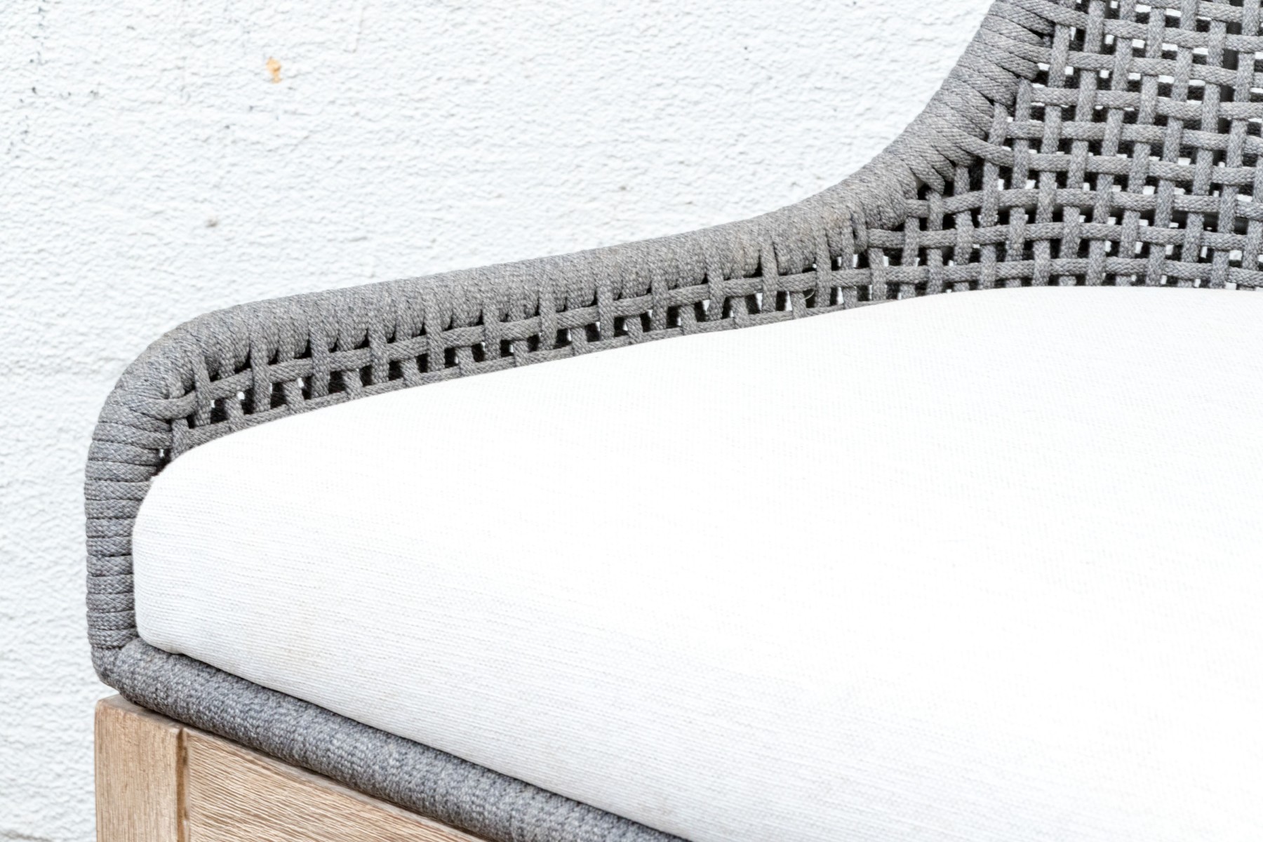 A handsome pair of Essentials For Living "Tapestry Outdoor" barstools with stylish all-weather gray and white woven backs sporting open arches at the bottoms. Fitted with loose white seat cushions and raised on natural teak bases with tapered legs, X-stretchers, and footrest bars along the fronts.