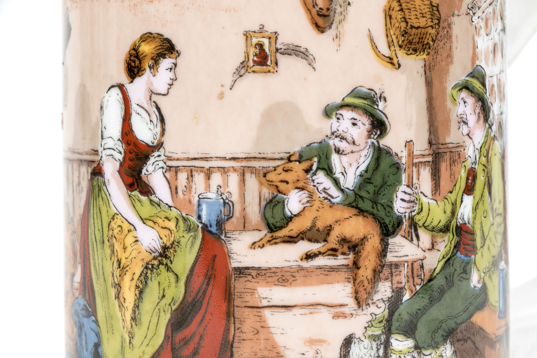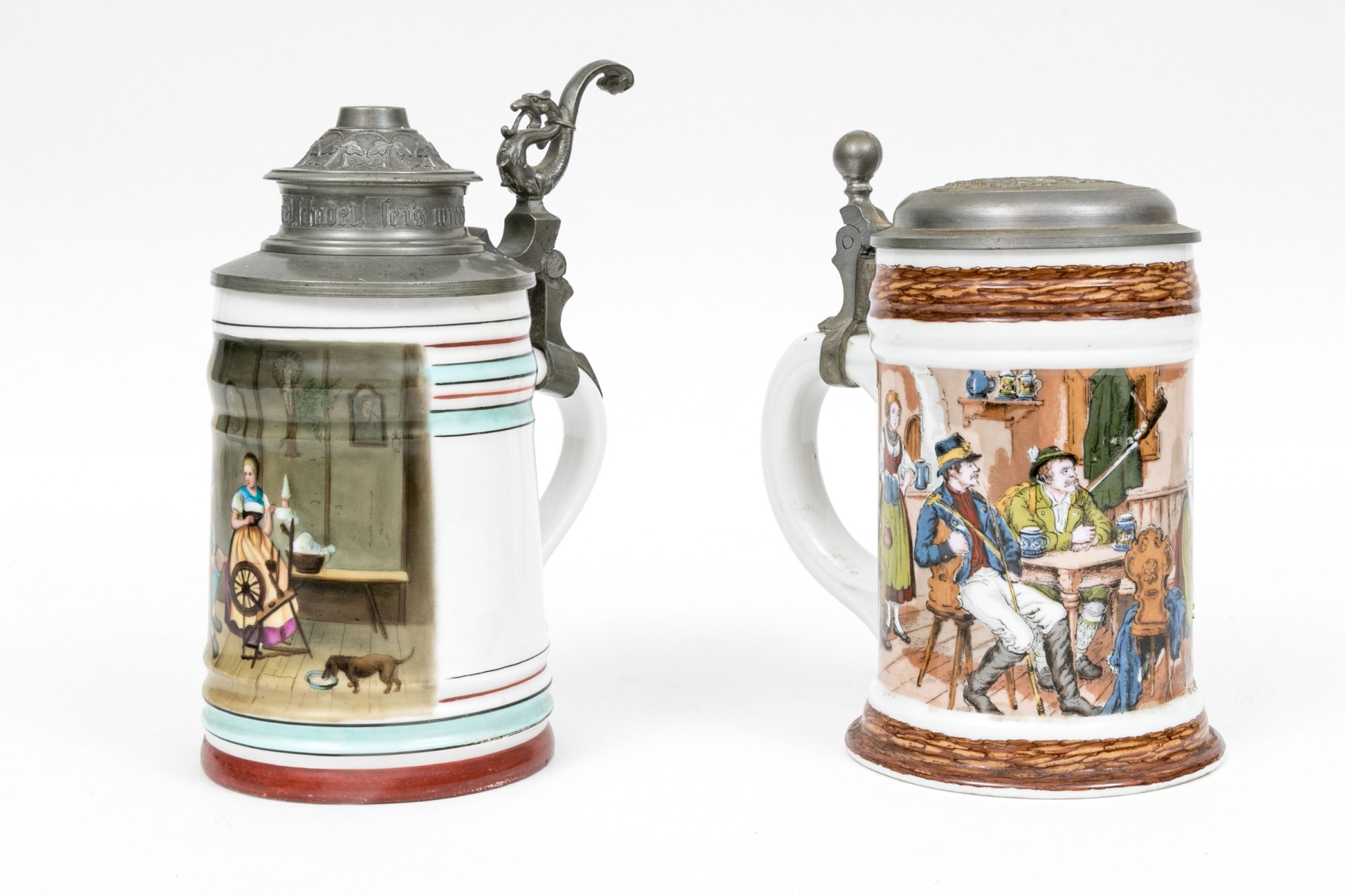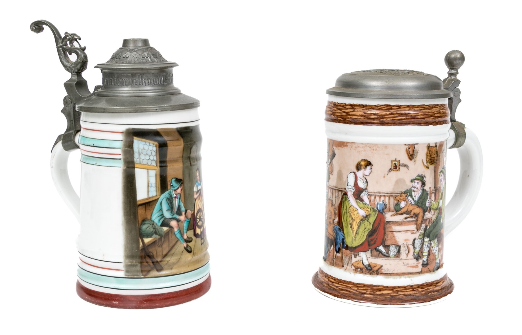 Pair of fabulous German lithopane steins, with scenes in the bottom of the stein