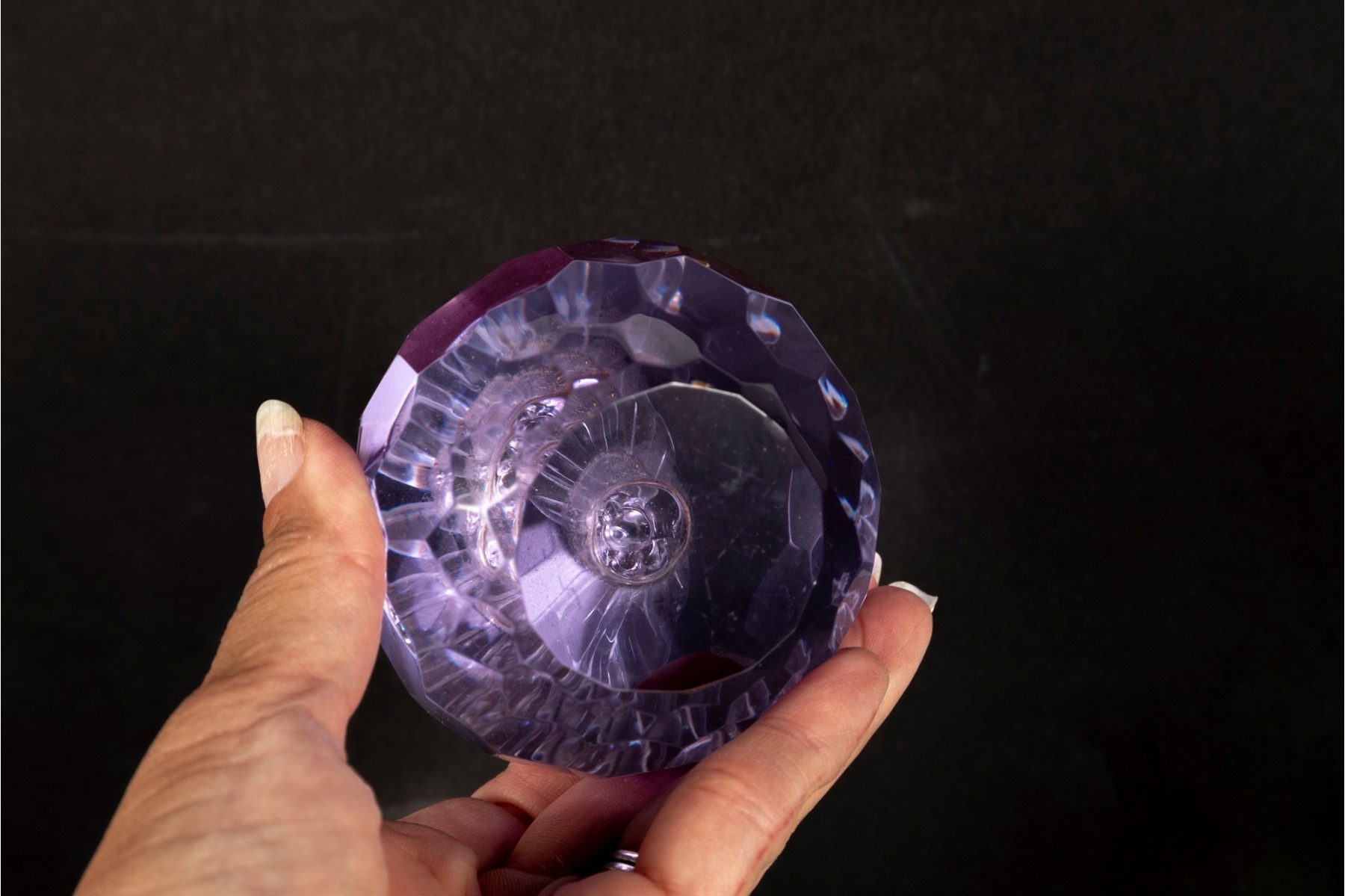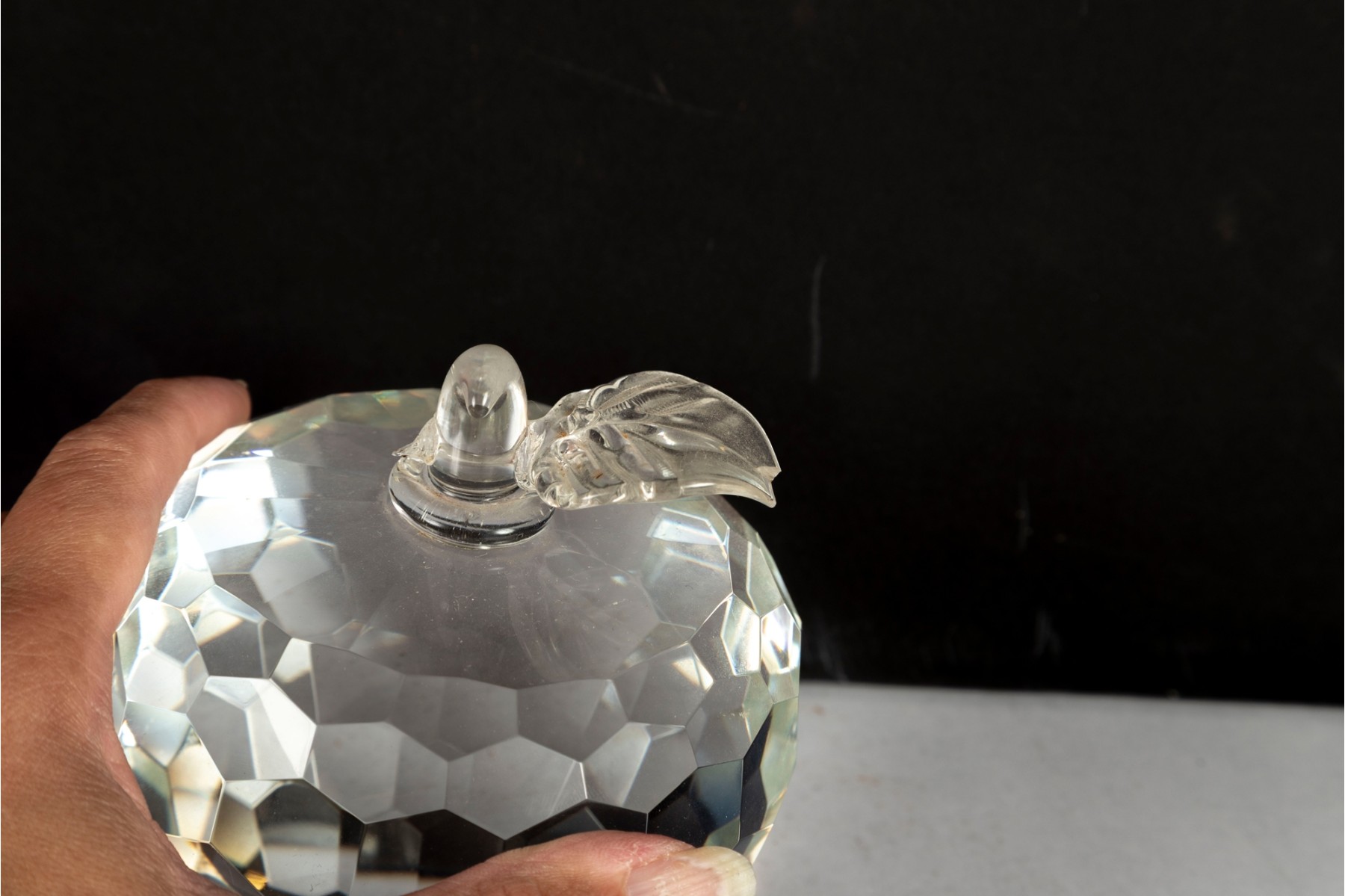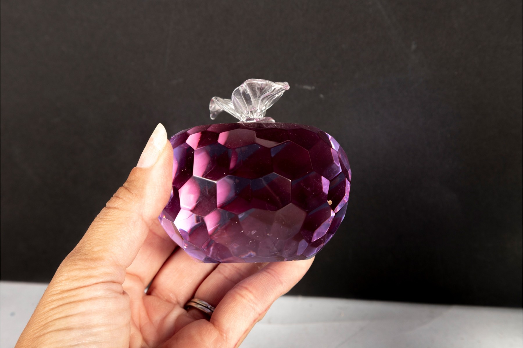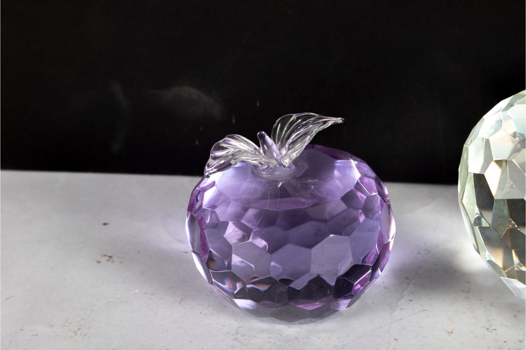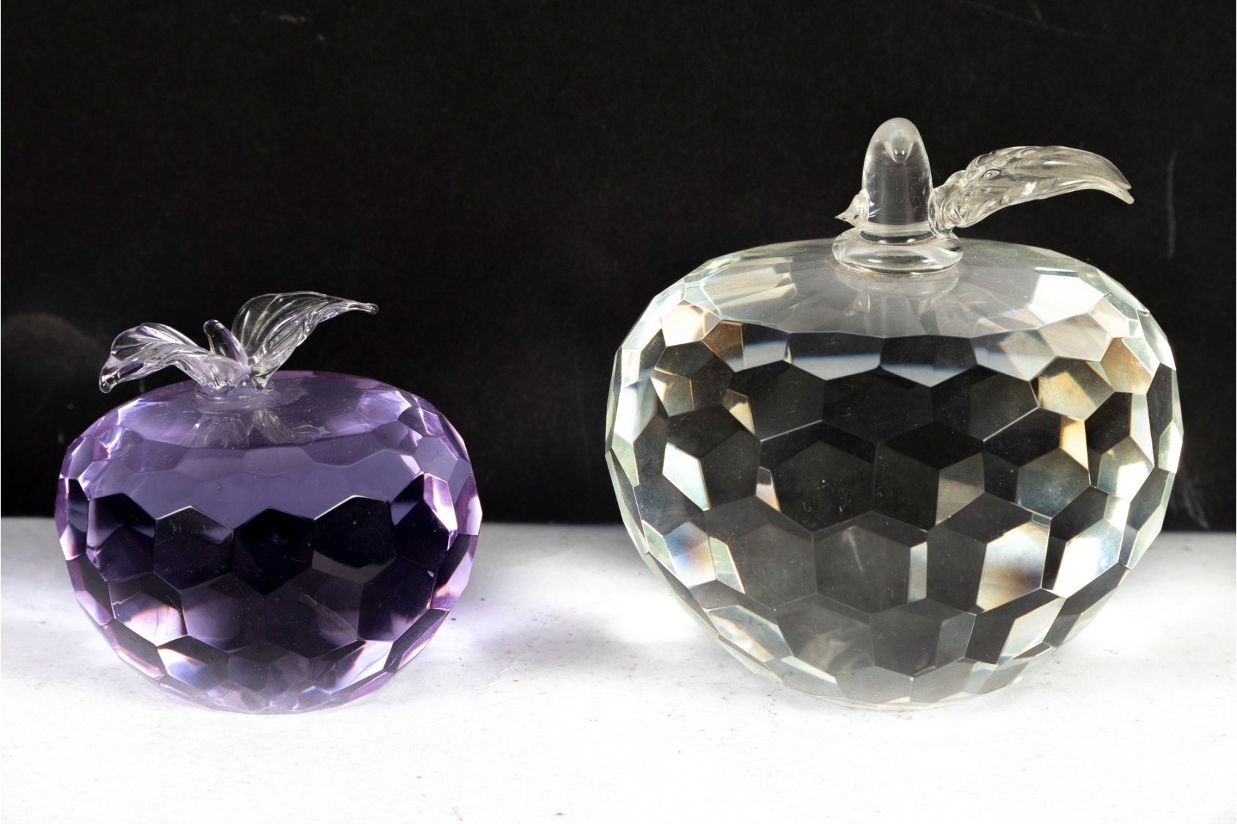 Pair of decorative faceted crystal apple paperweights, one in clear and one in amethyst purple. Each features finely detailed glass leaf accents and a polished, multi-faceted surface that reflects light beautifully.