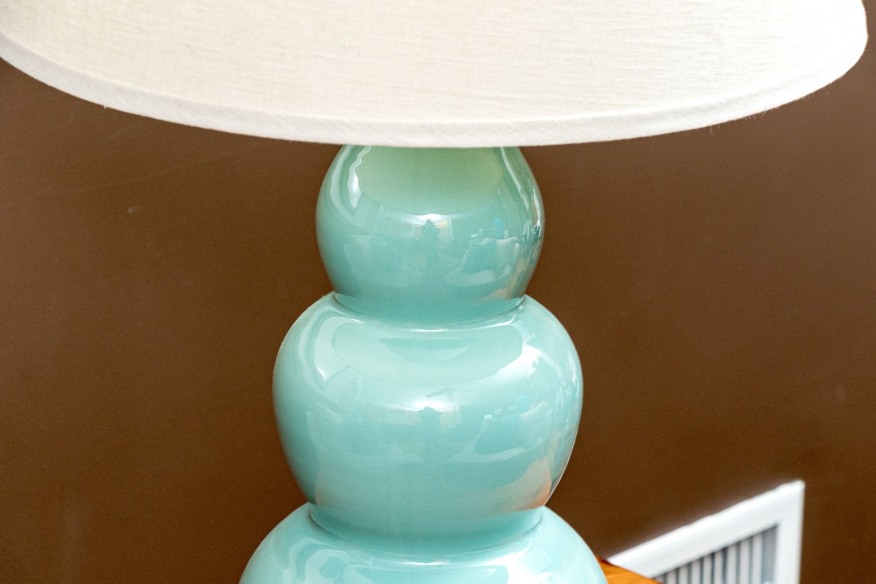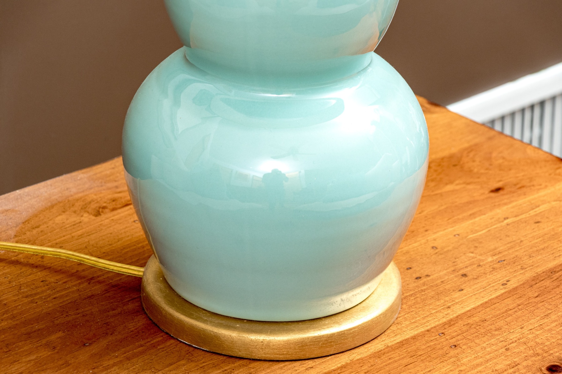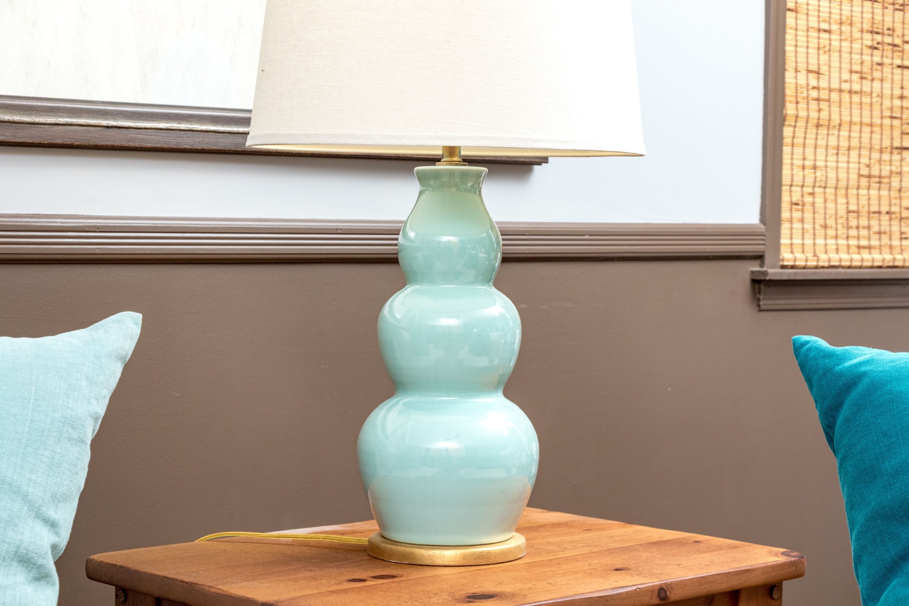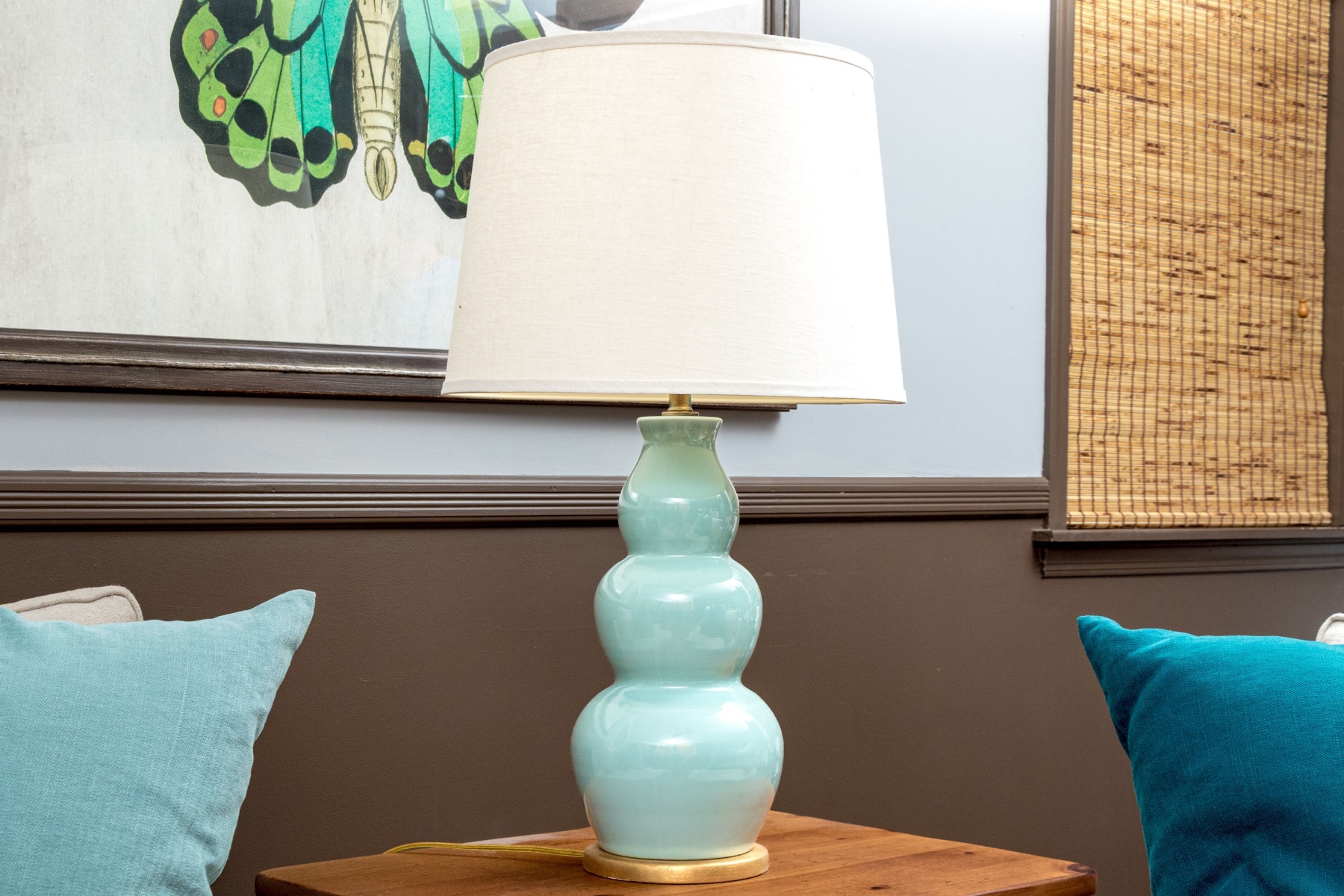 A stylish pair of Festoni table lamps featuring classic ceramic triple gourd forms glazed celadon blue and mounted to circular gilt bases. Surmounted by white empire/drum shades.