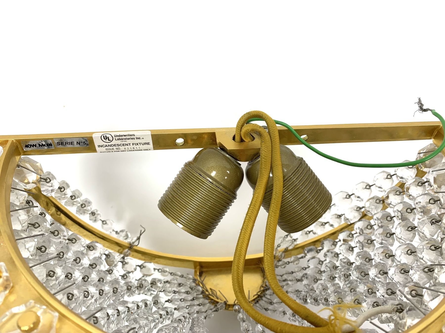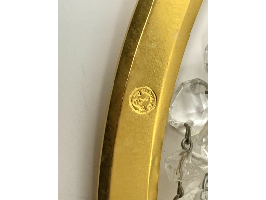Deep demilune gilt bronze twin light sconces with the company stamp on the side of each frame. Marked Series No.5. The frames with demilune and knob terminals. The tops are set with crystal palmettes and pendant crystal prisms. Crystal chains with graduated faceted beads fall from the top to the bottom frame.