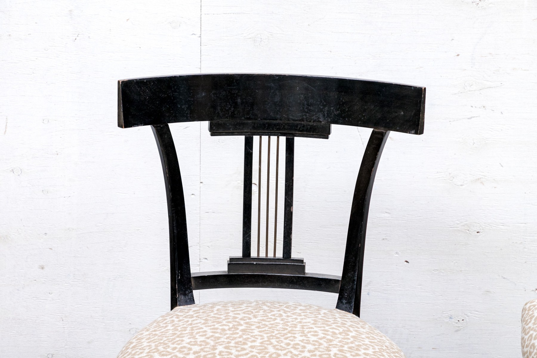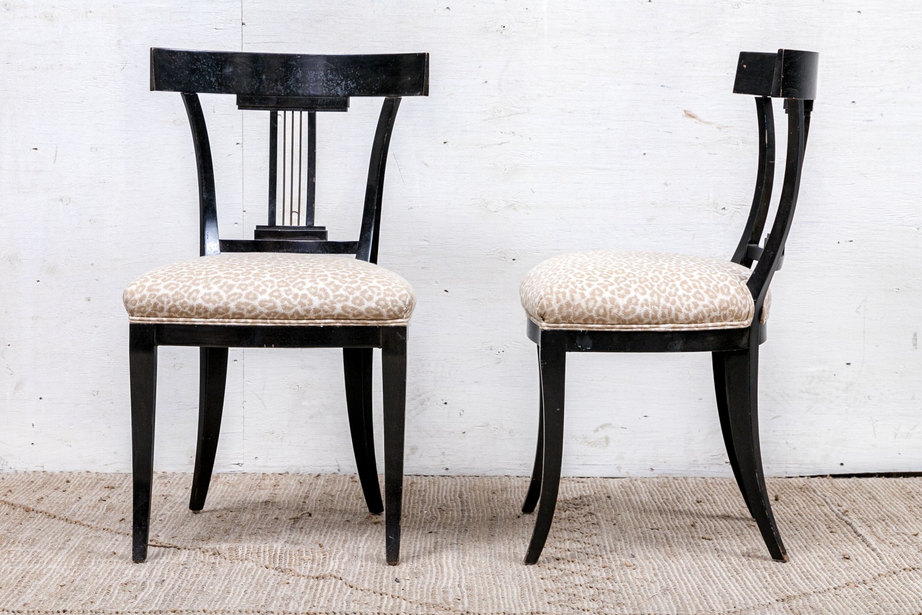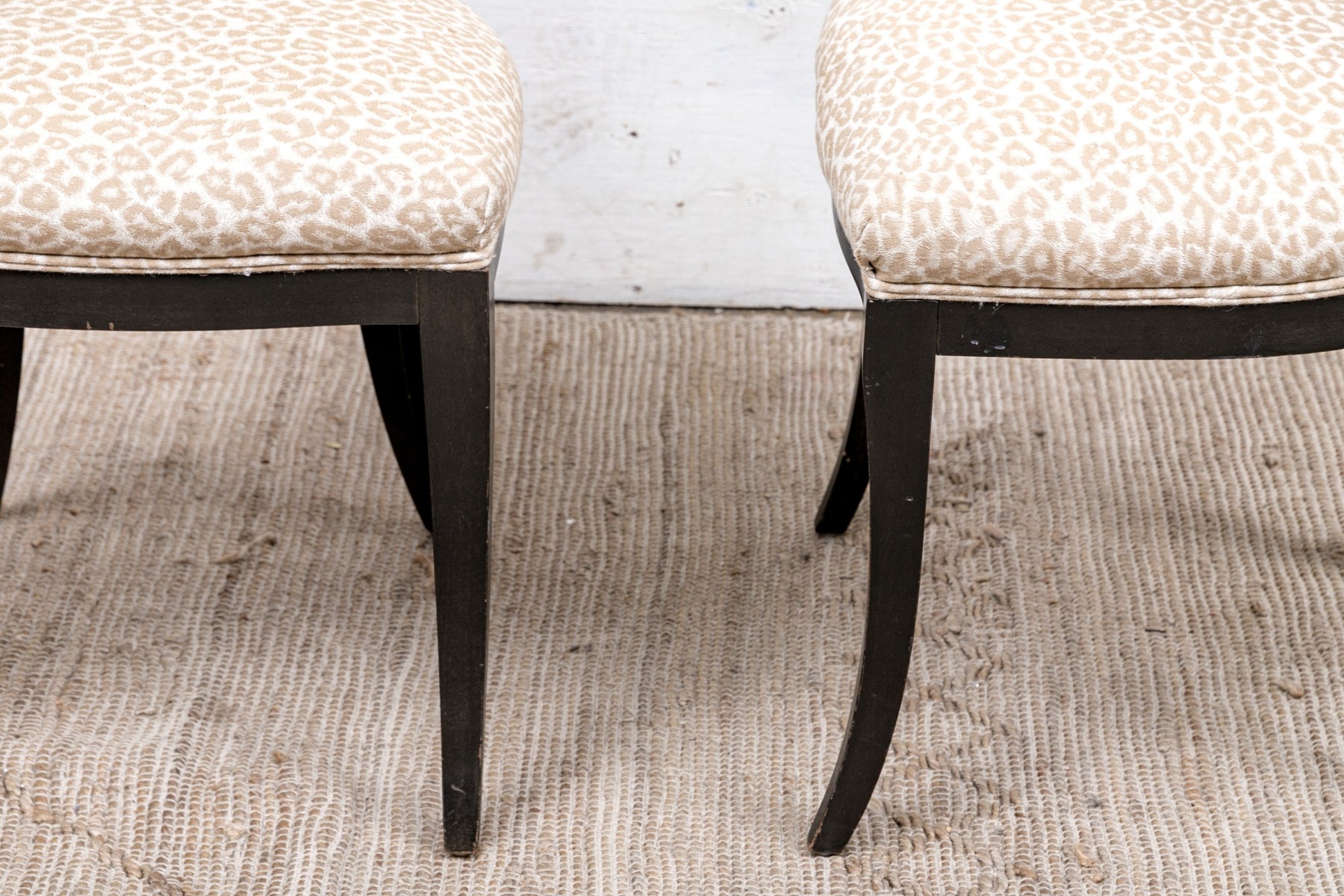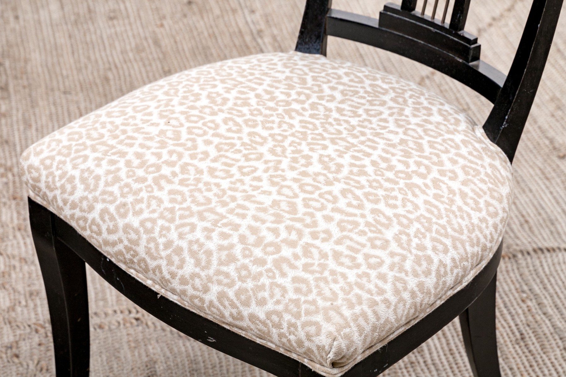 Both chairs stand upon carved and ebonized legs, with the front legs curved forward and back legs curved back. Both chairs have upholstered faux leopard seats. The seat backs with pair of ebonized poles flanking a pair of brass inset poles making the back splat. The top rail is curved.