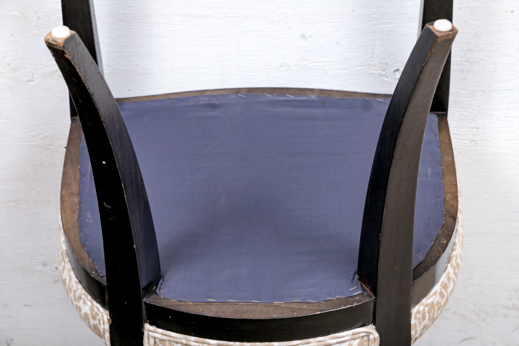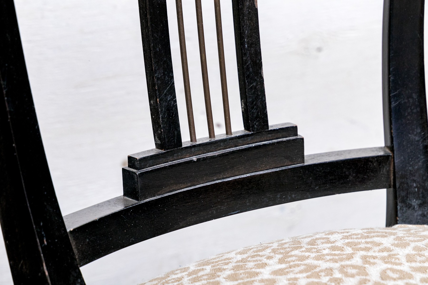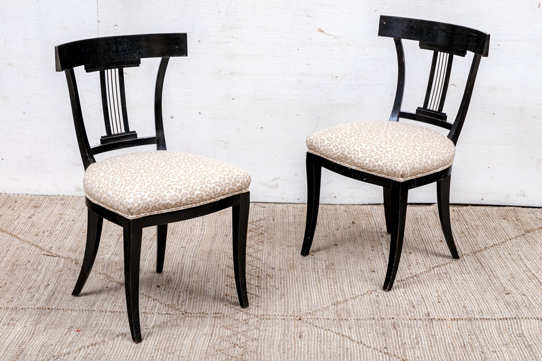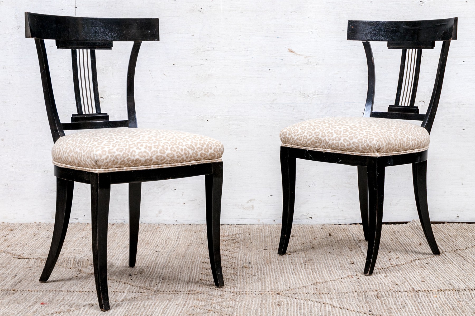 Both chairs stand upon carved and ebonized legs, with the front legs curved forward and back legs curved back. Both chairs have upholstered faux leopard seats. The seat backs with pair of ebonized poles flanking a pair of brass inset poles making the back splat. The top rail is curved.