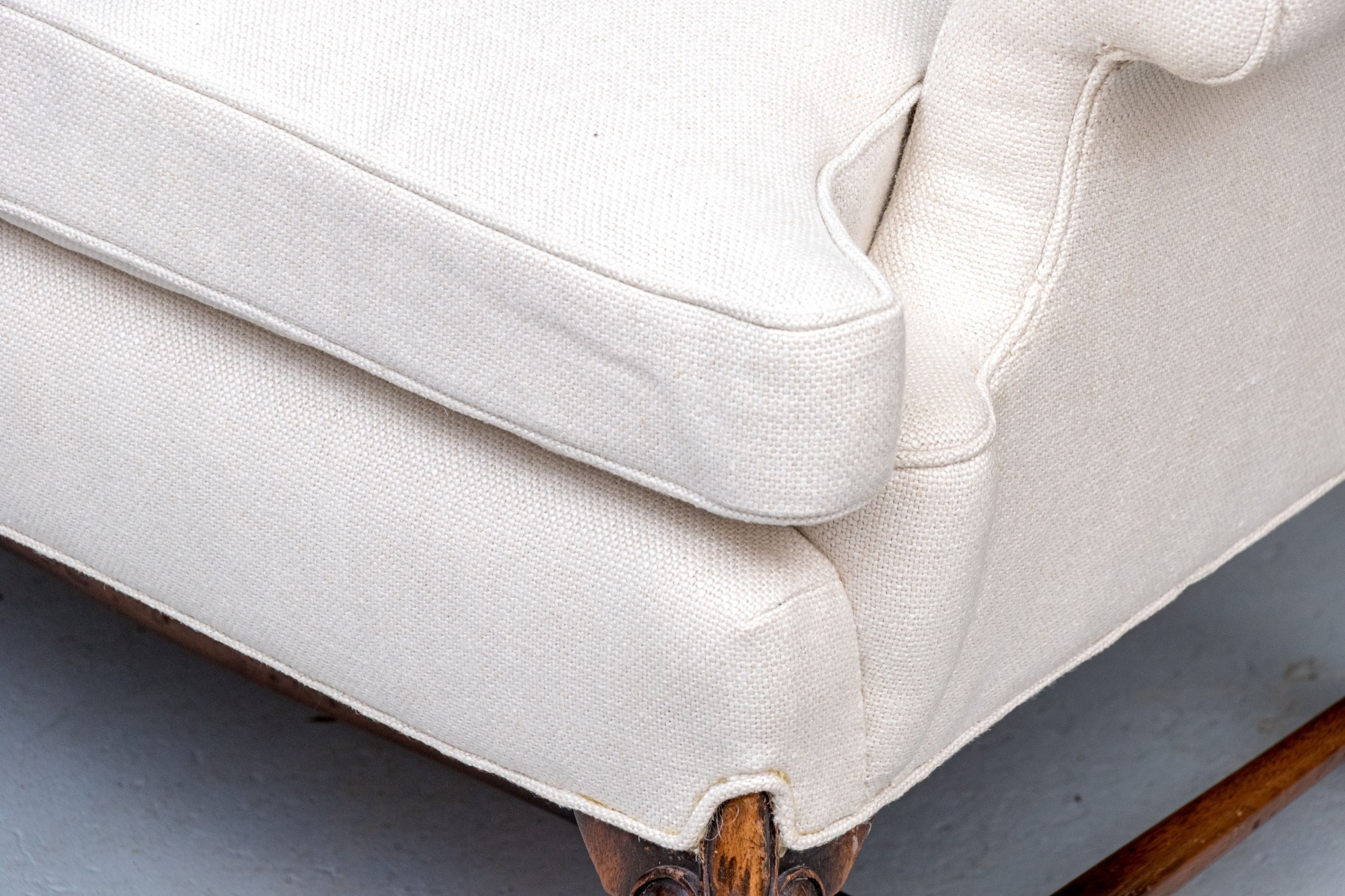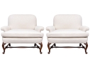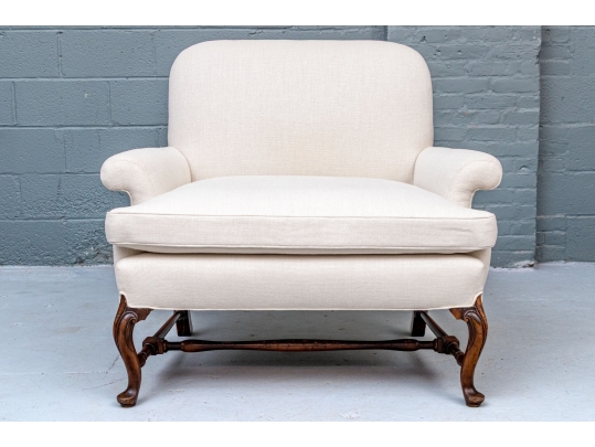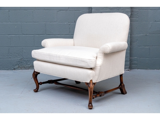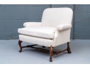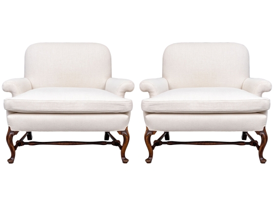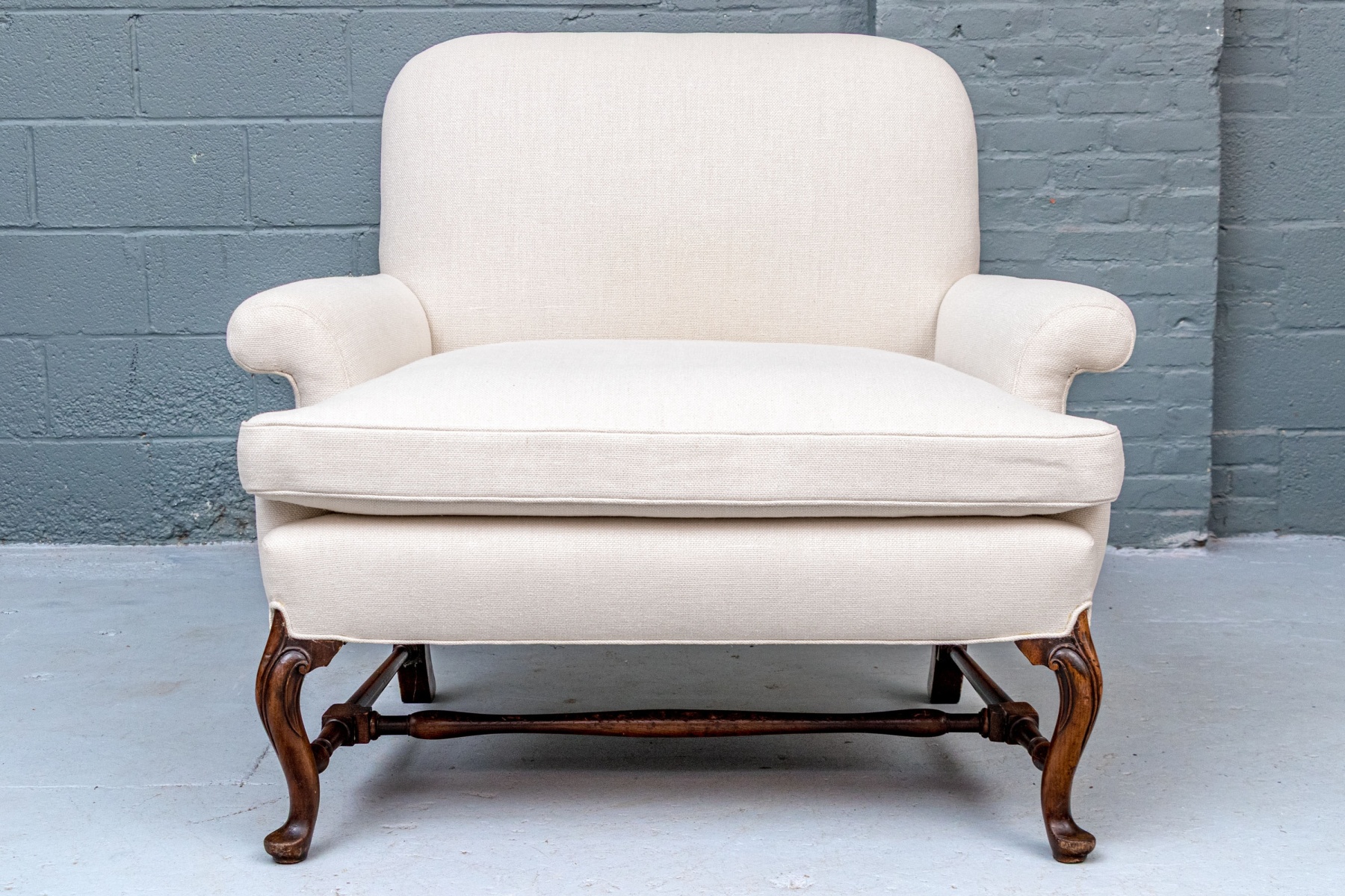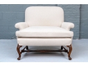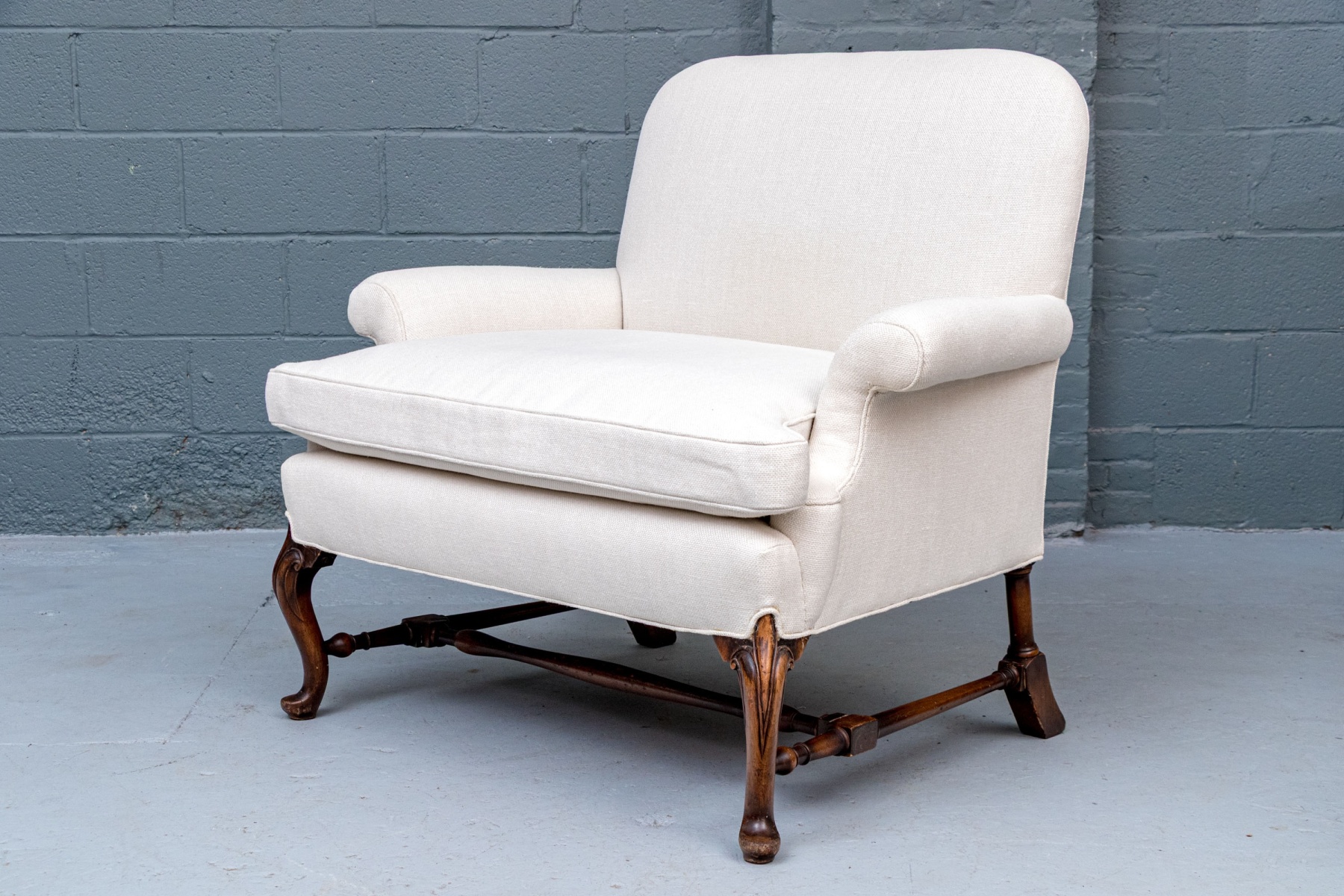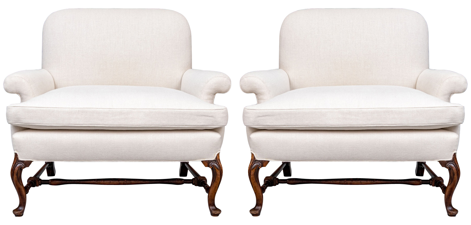Pair of fine quality chairs and a half with curved back, rolled arms, piped seams throughout, loose pillow seat, tight back and upholstered in a creamy white woven fabric. The chairs with turned H-form stretcher and resting on carved front cabriole legs and shaped back feet.