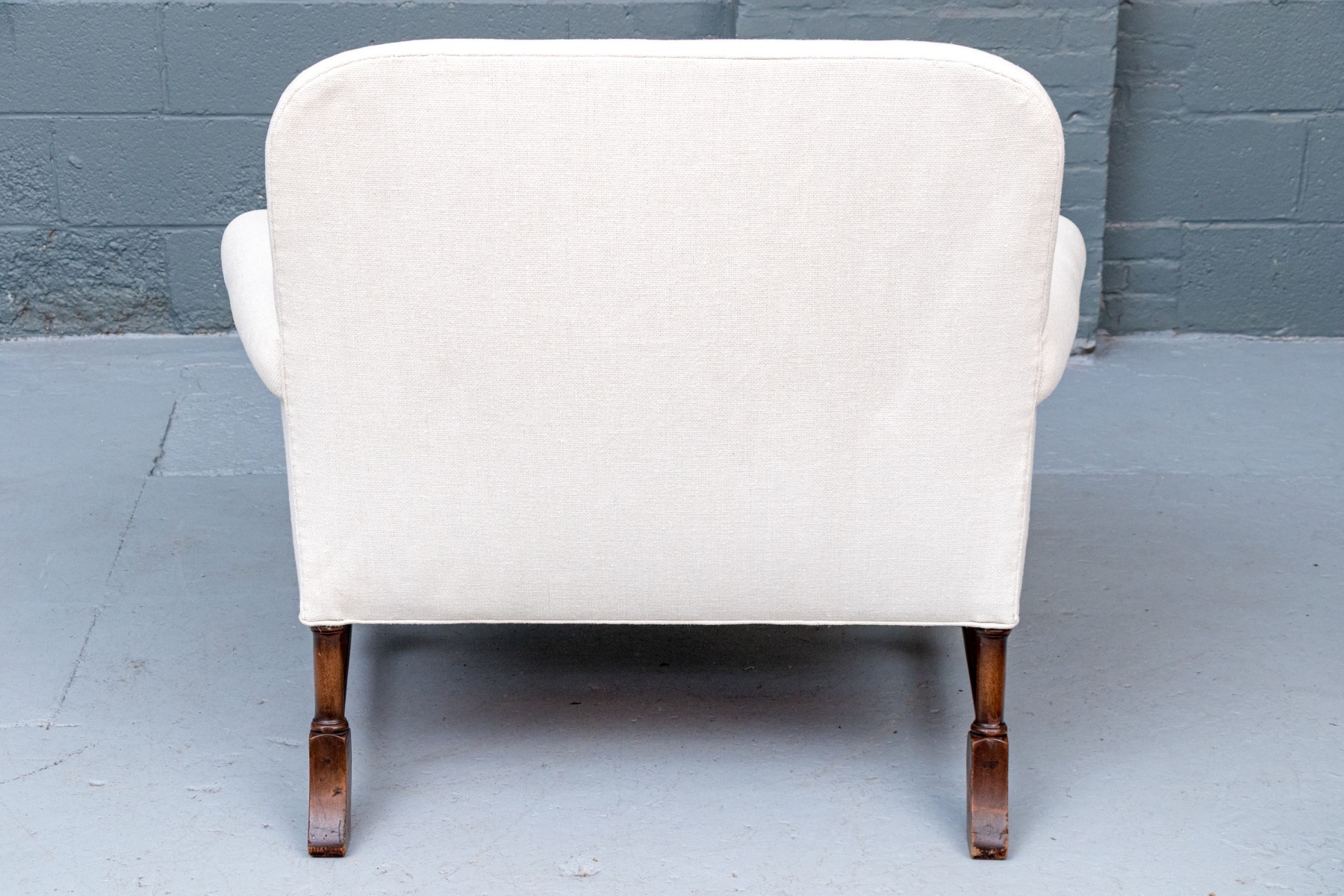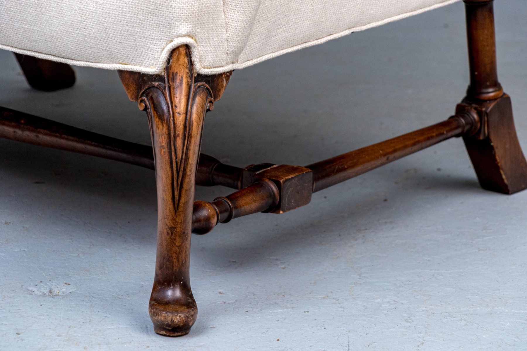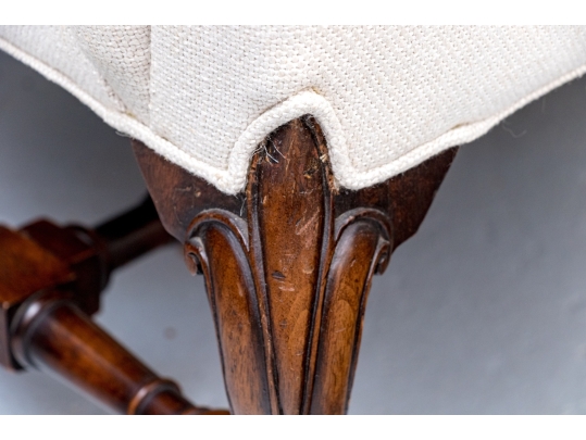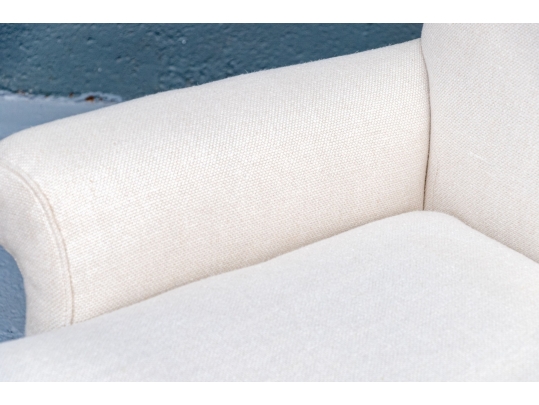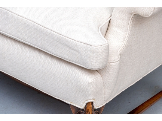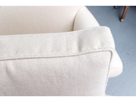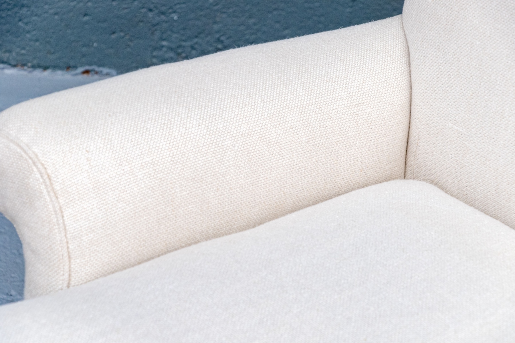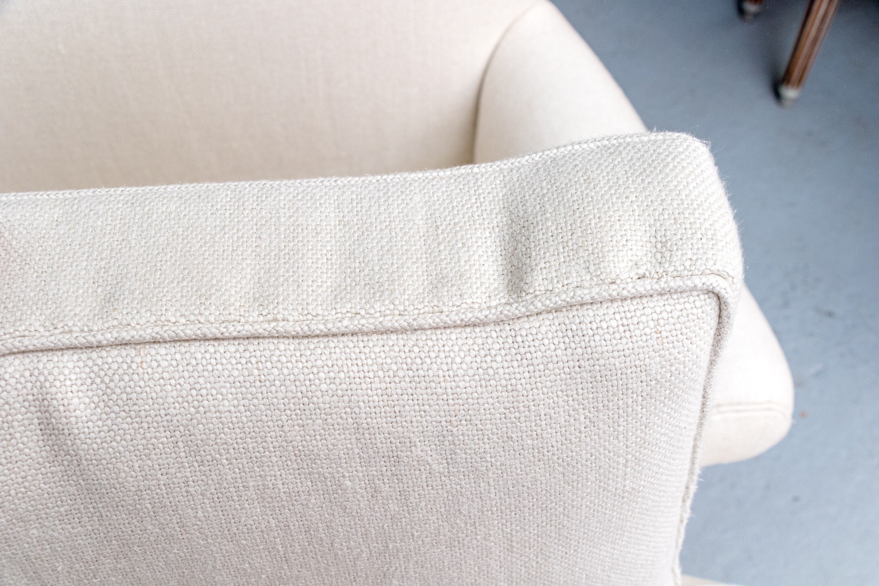 Pair of fine quality chairs and a half with curved back, rolled arms, piped seams throughout, loose pillow seat, tight back and upholstered in a creamy white woven fabric. The chairs with turned H-form stretcher and resting on carved front cabriole legs and shaped back feet.
