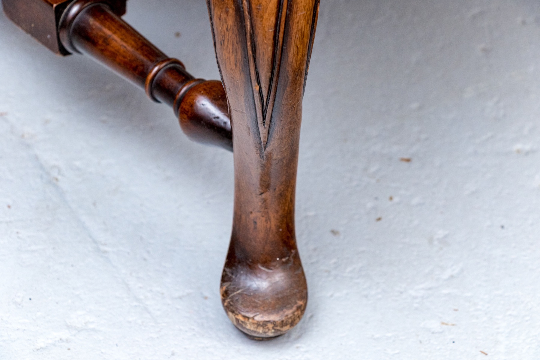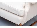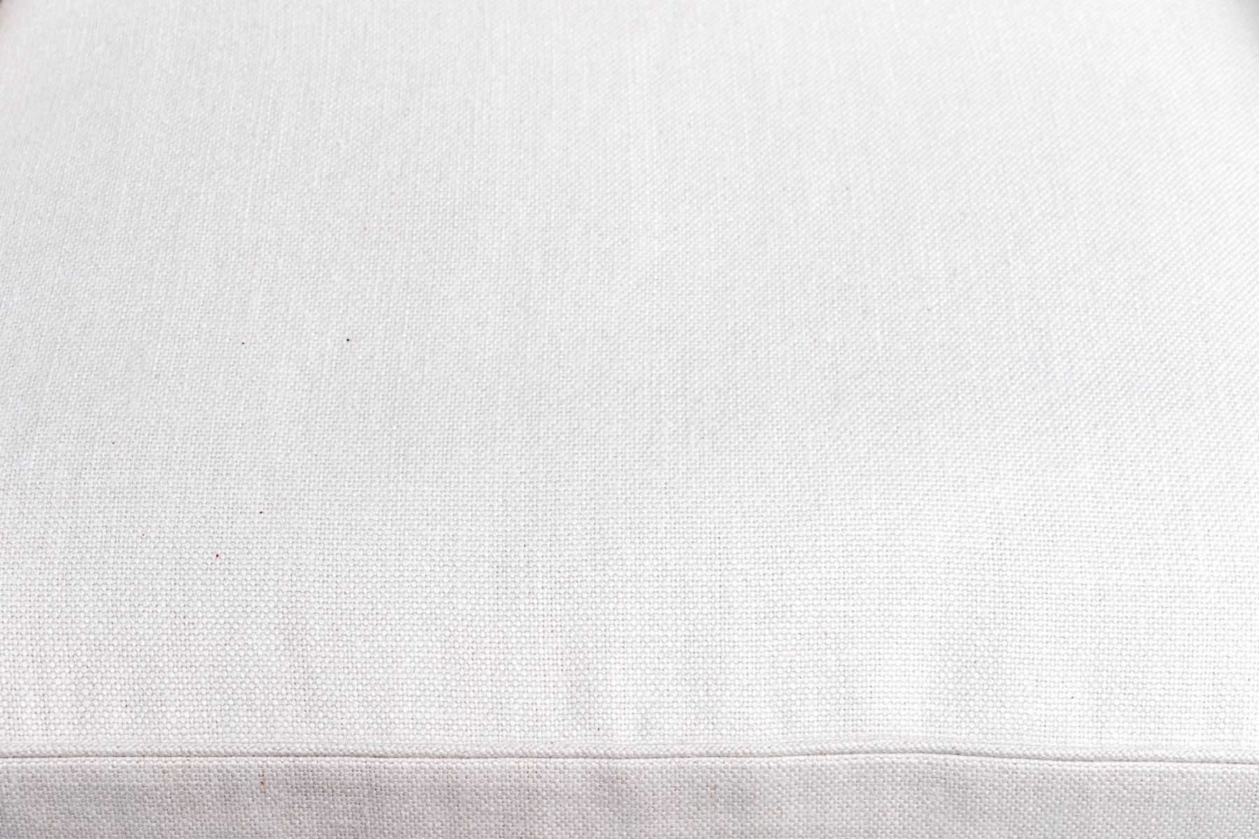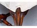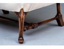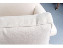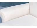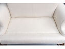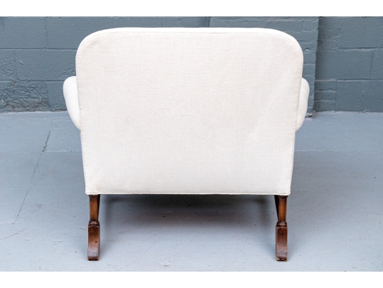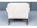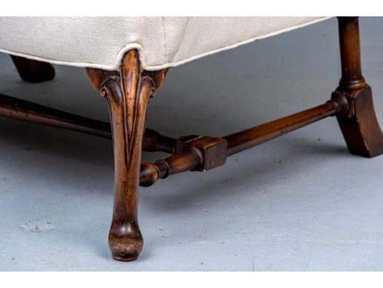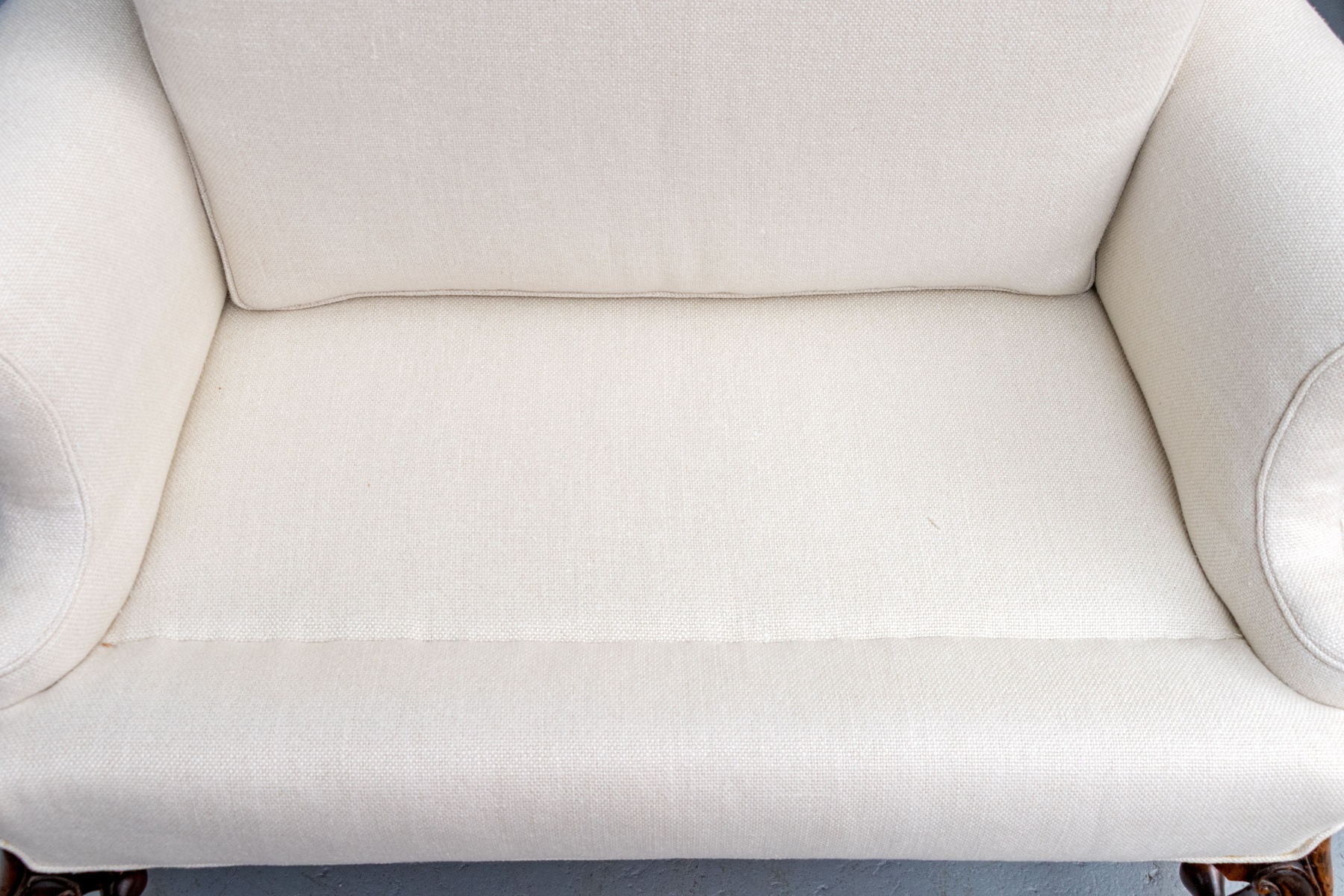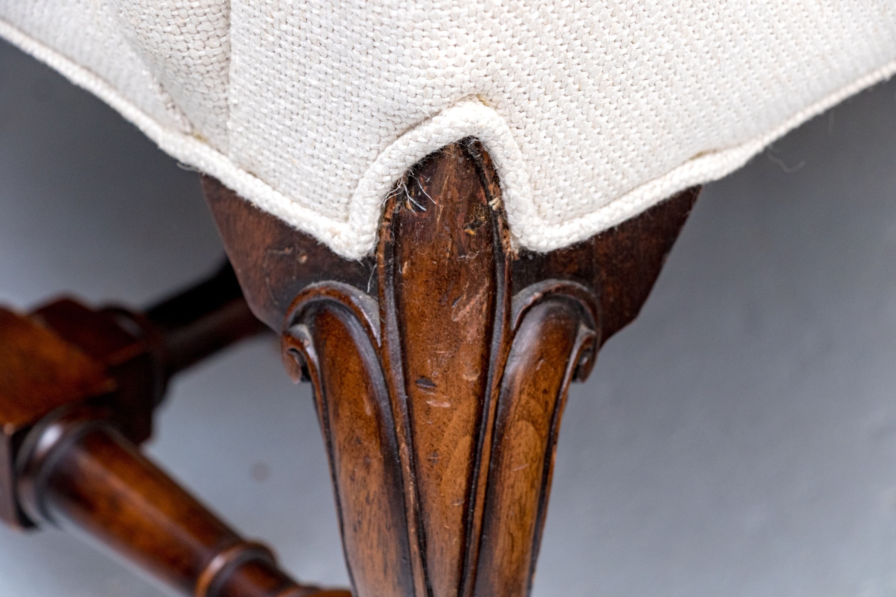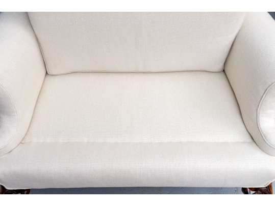 Pair of fine quality chairs and a half with curved back, rolled arms, piped seams throughout, loose pillow seat, tight back and upholstered in a creamy white woven fabric. The chairs with turned H-form stretcher and resting on carved front cabriole legs and shaped back feet.