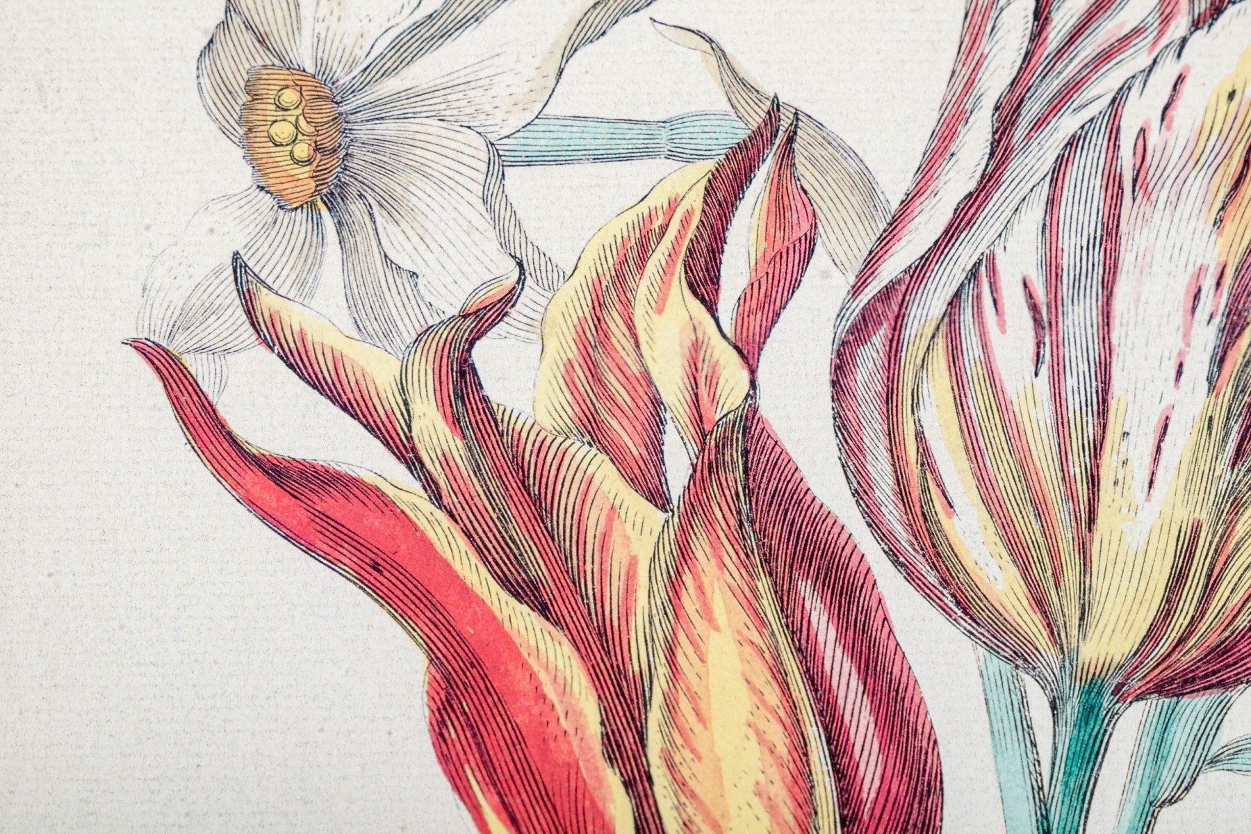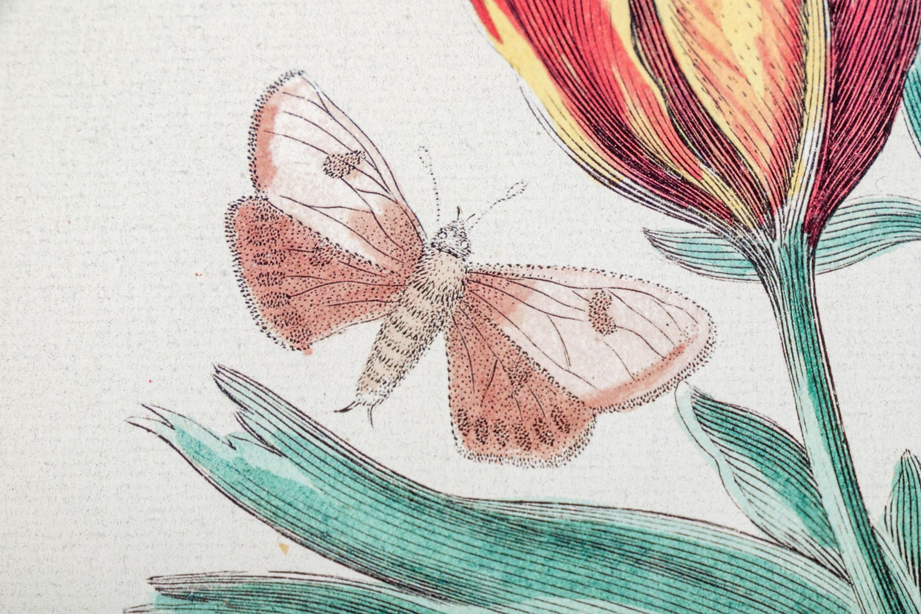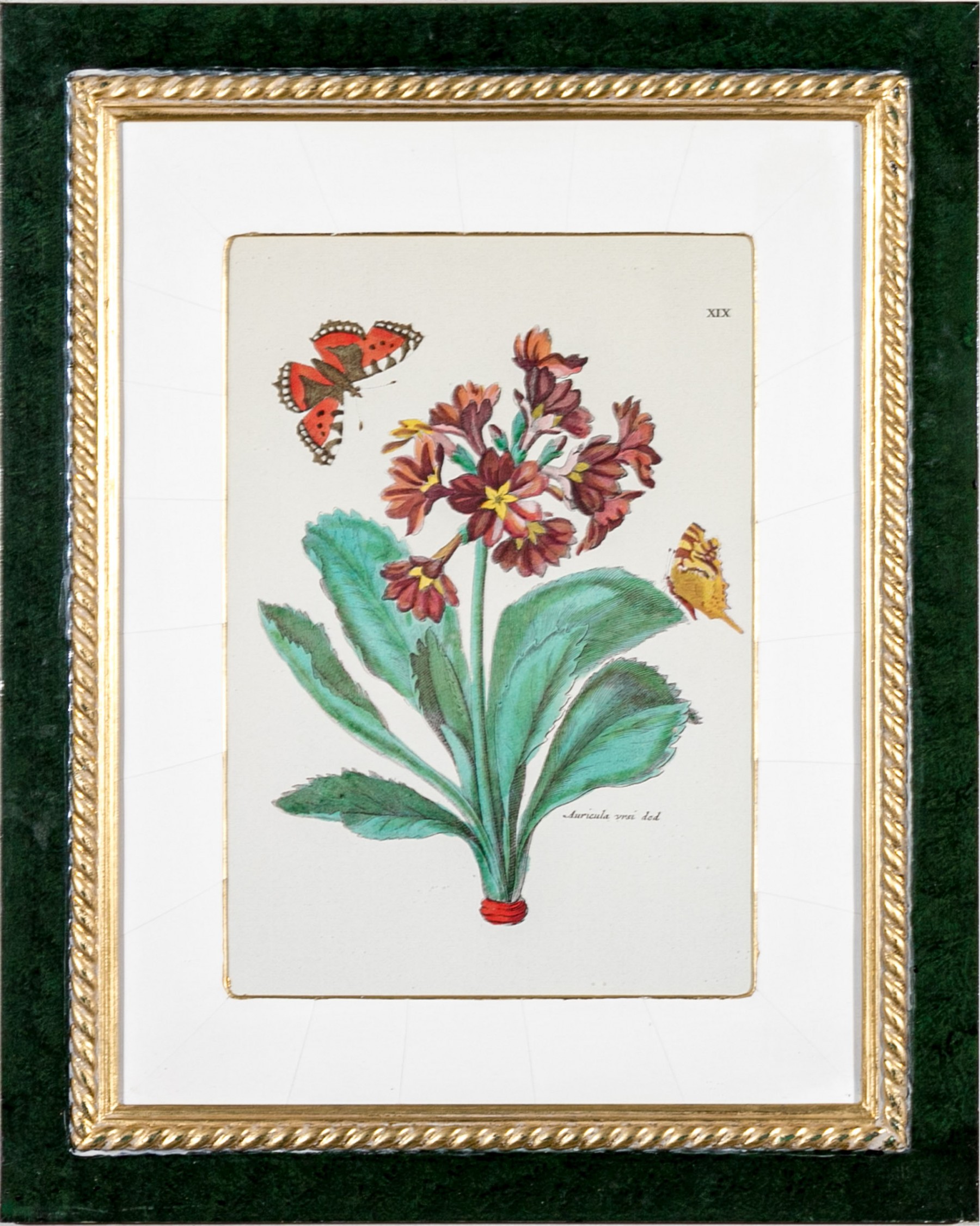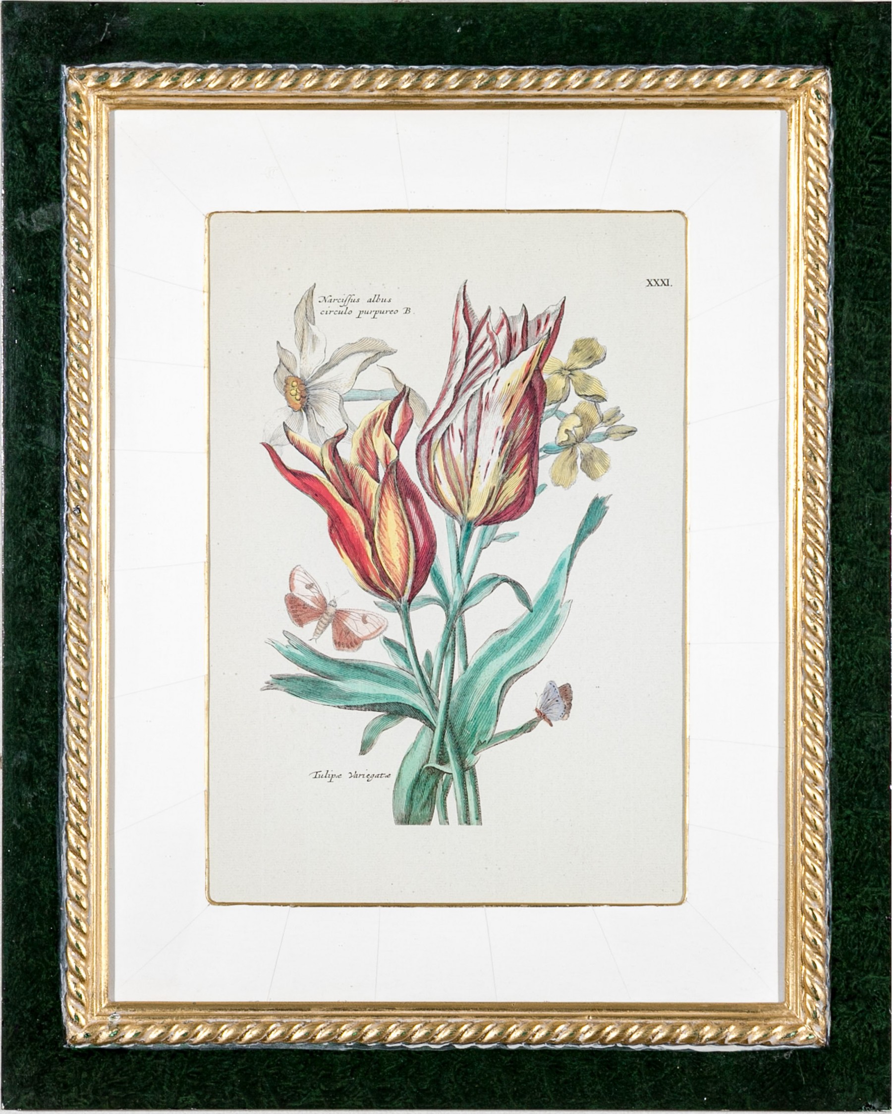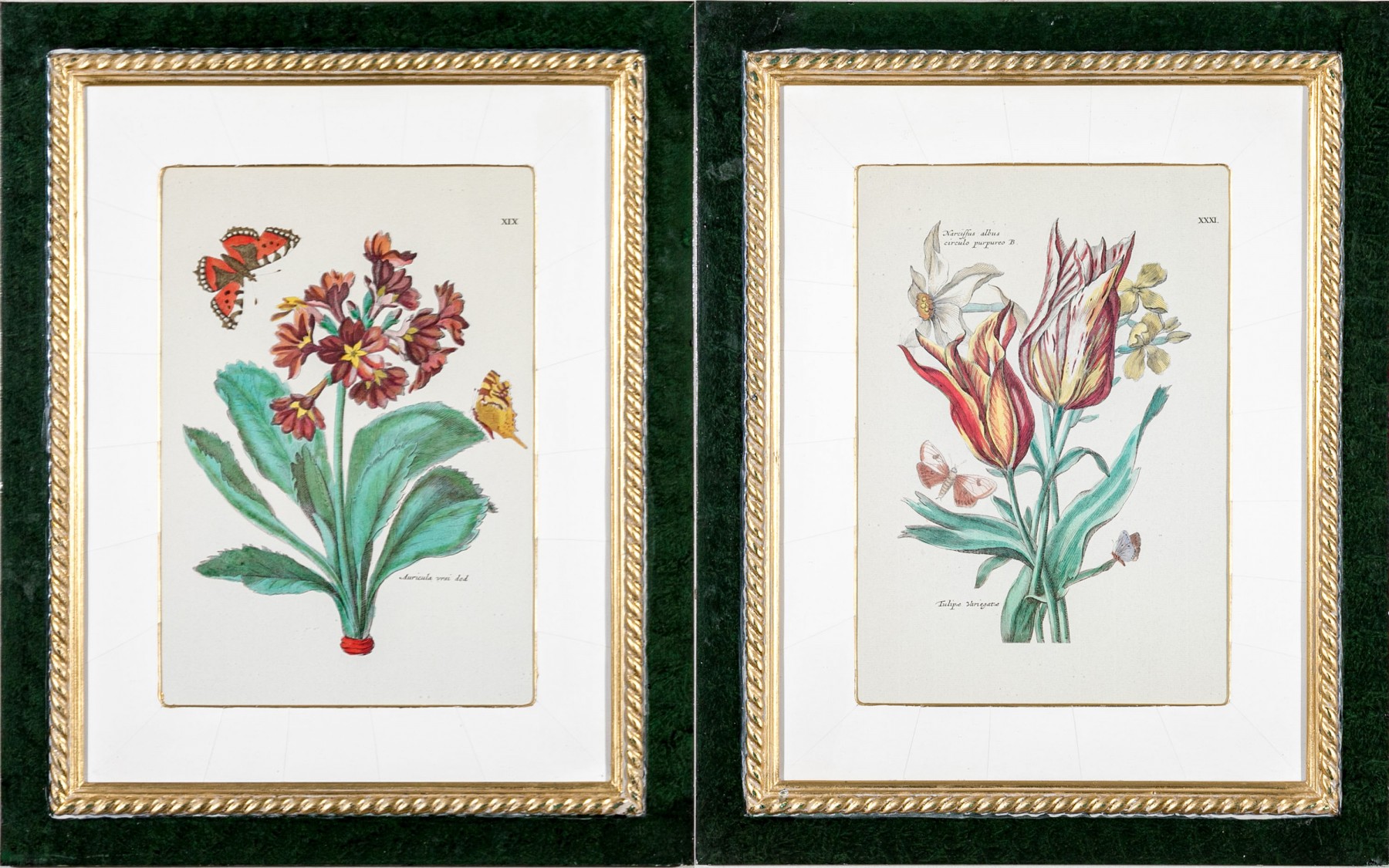 After antique originals. Featuring red and yellow tulips and orange-red auriculas. Presented in fine dark green faux marble and antiqued gilt trimmed Trowbridge frames with glass.
