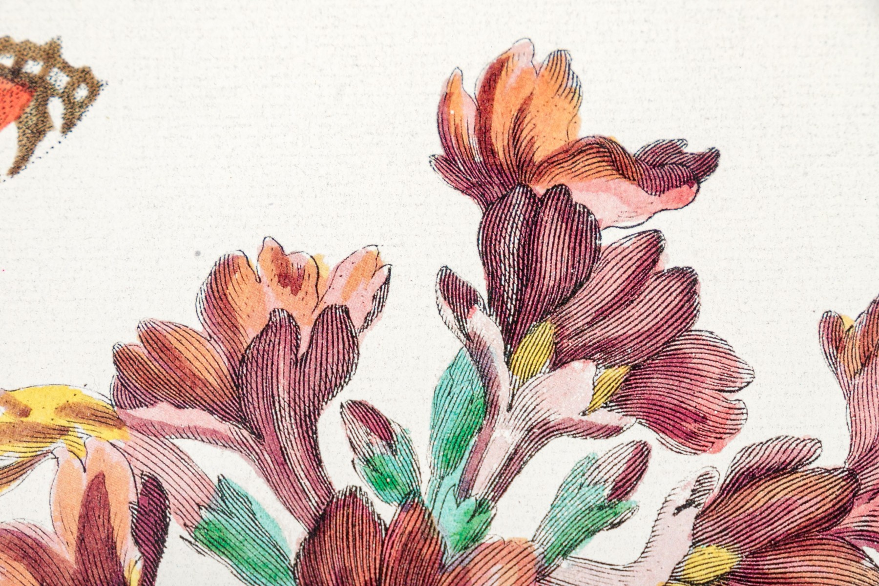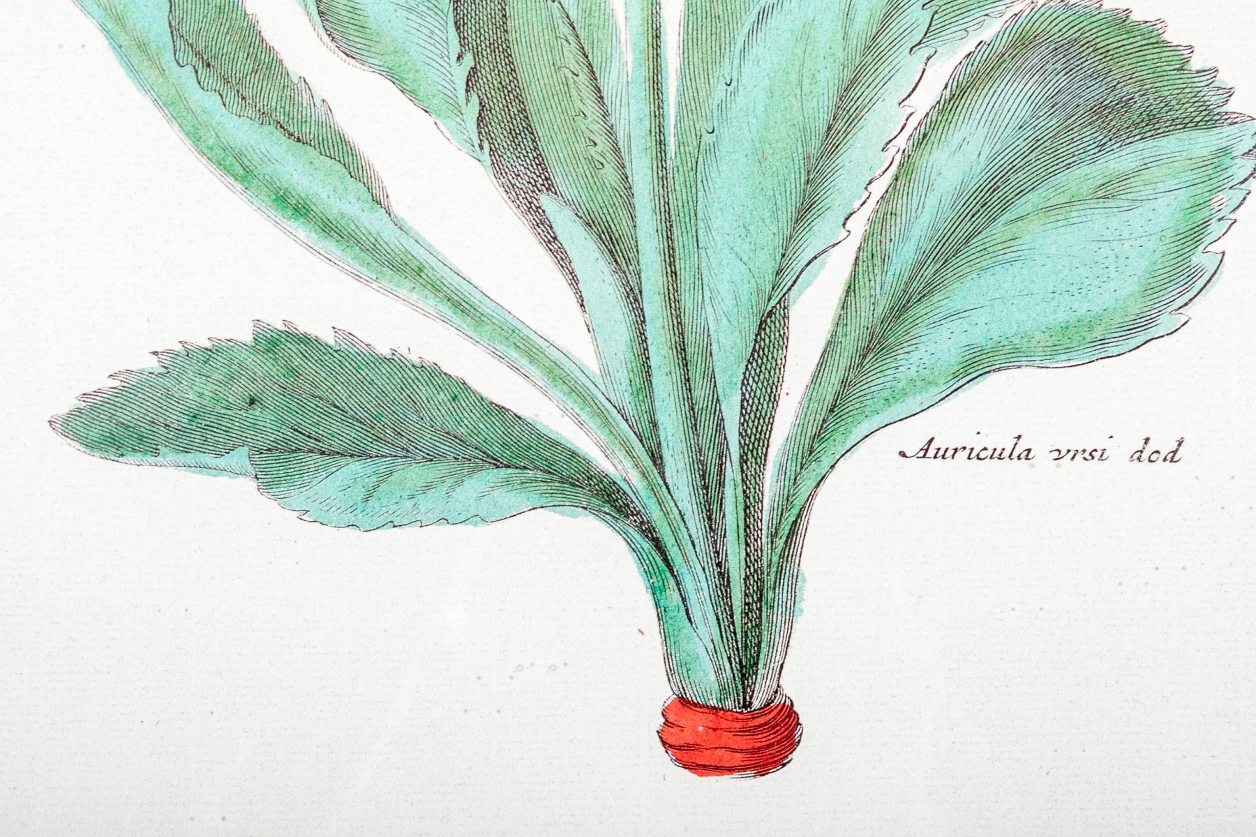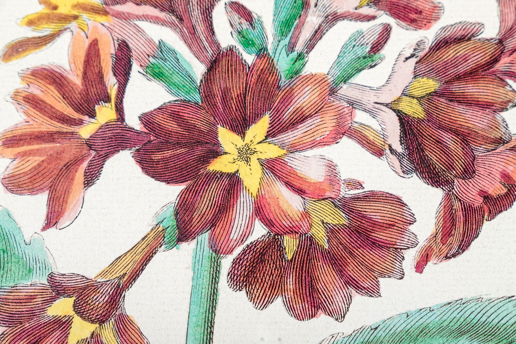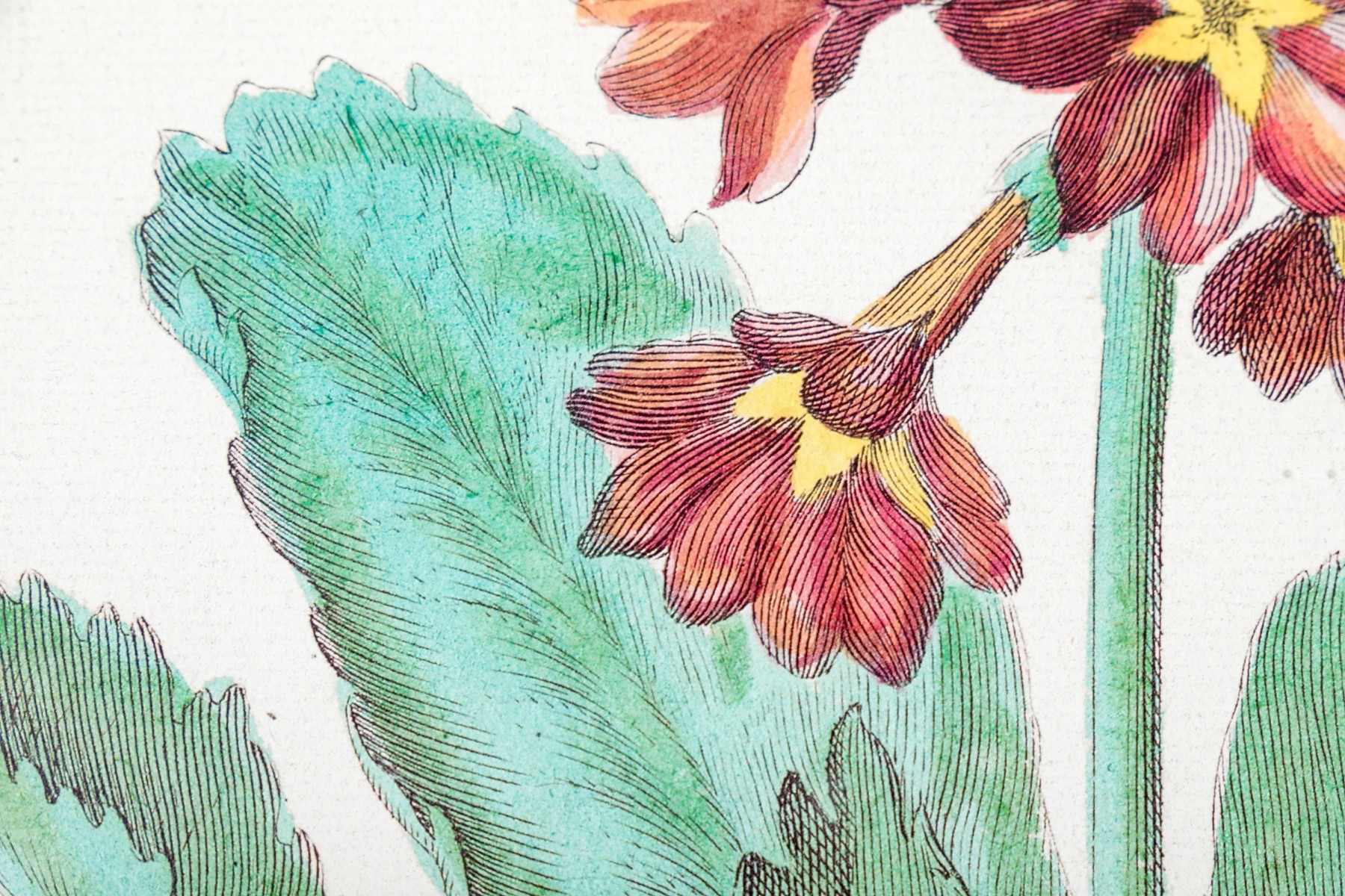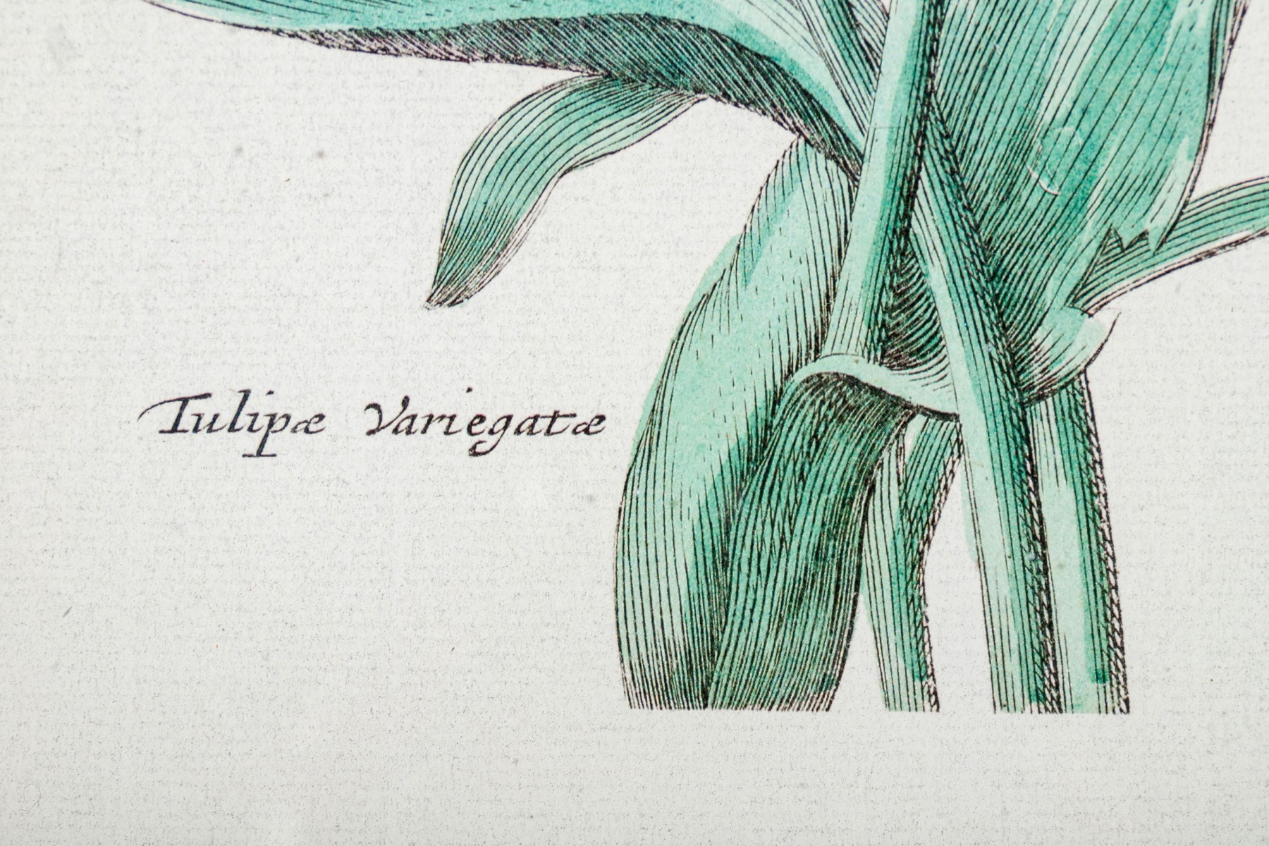 After antique originals. Featuring red and yellow tulips and orange-red auriculas. Presented in fine dark green faux marble and antiqued gilt trimmed Trowbridge frames with glass.