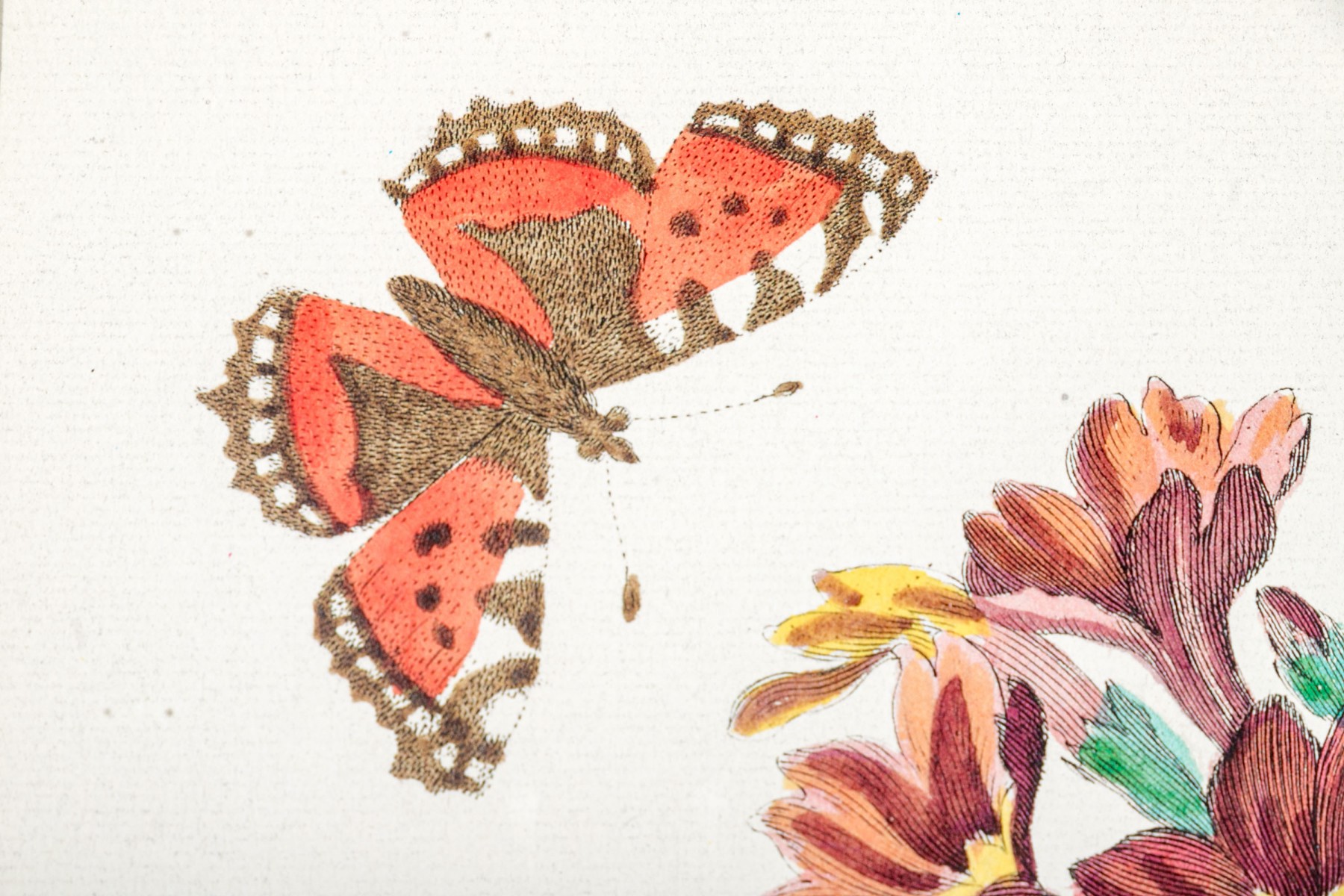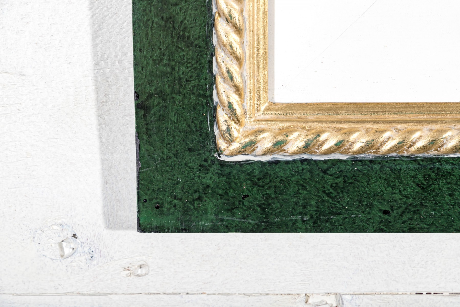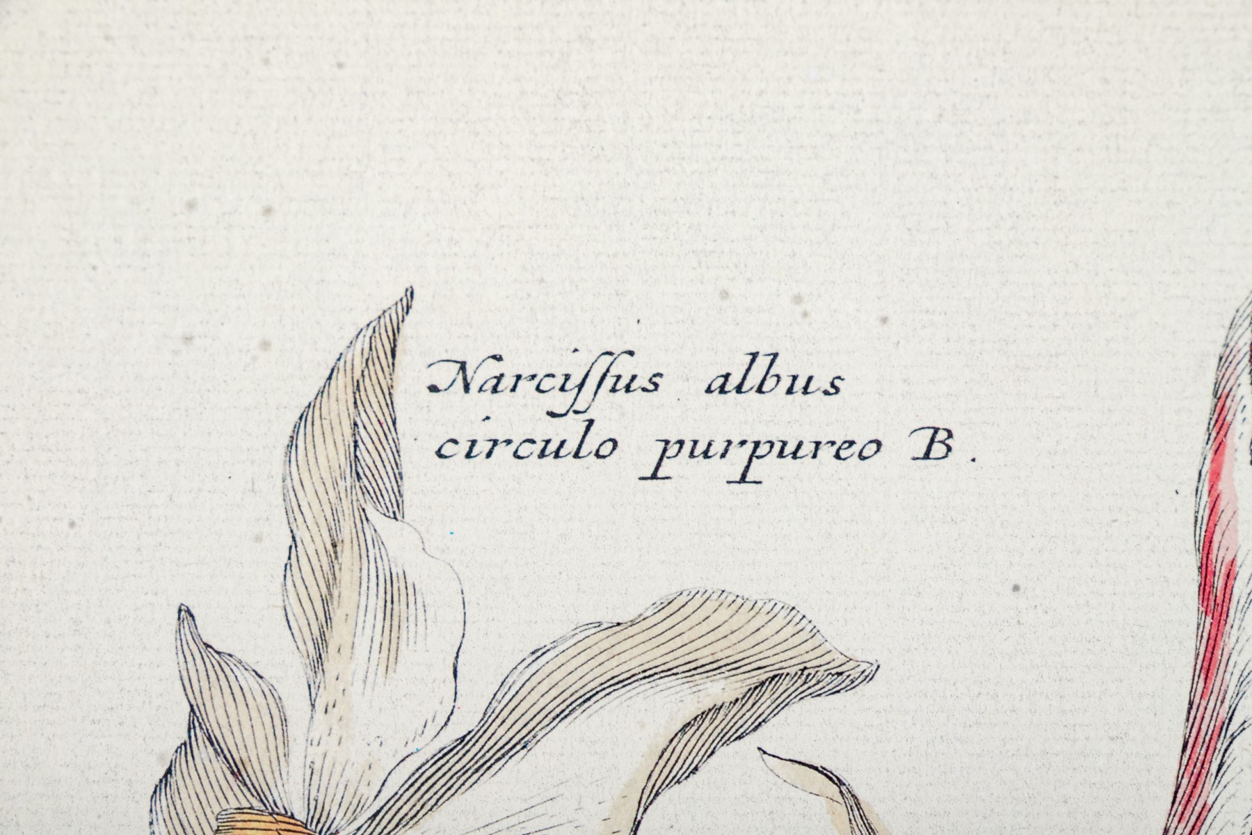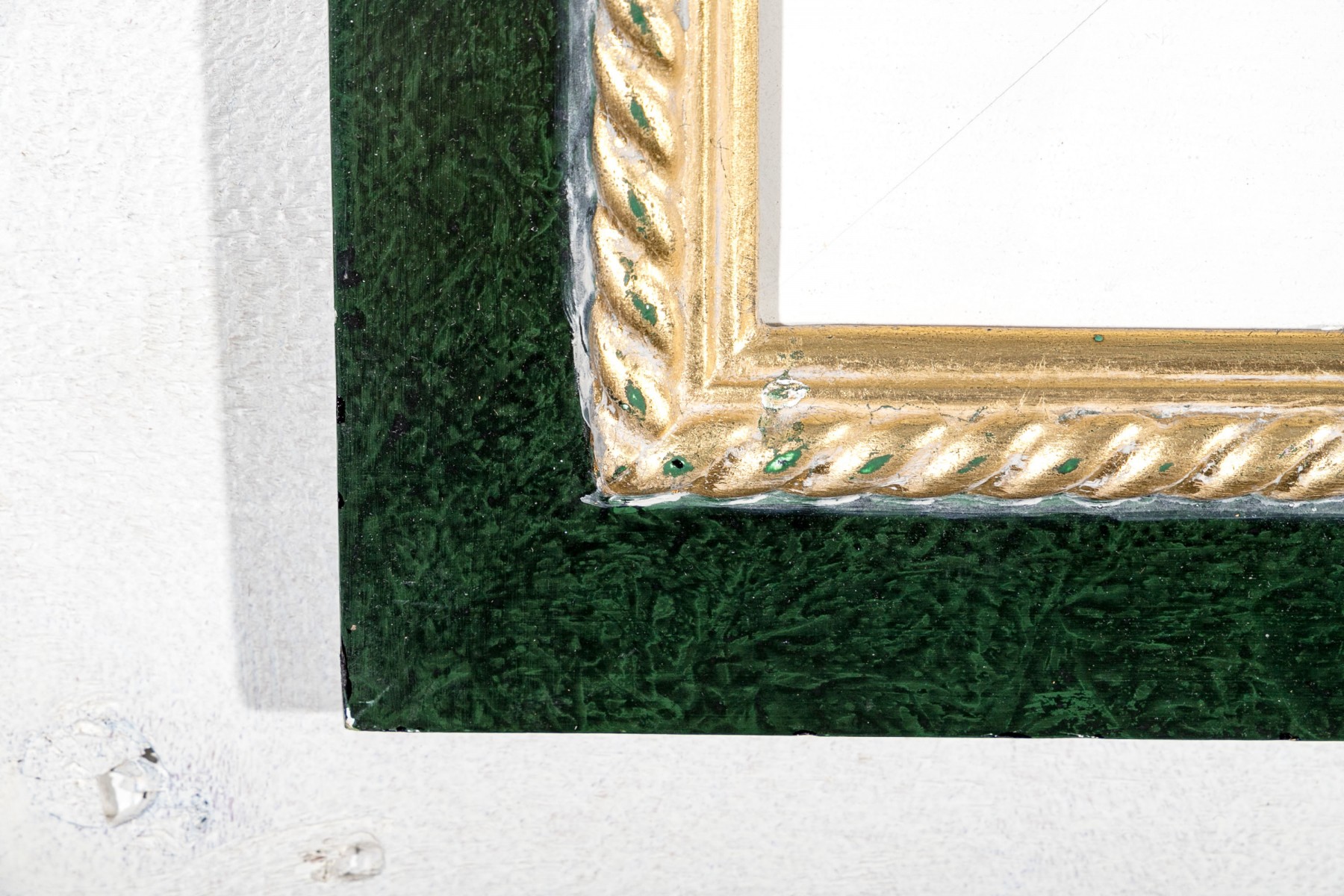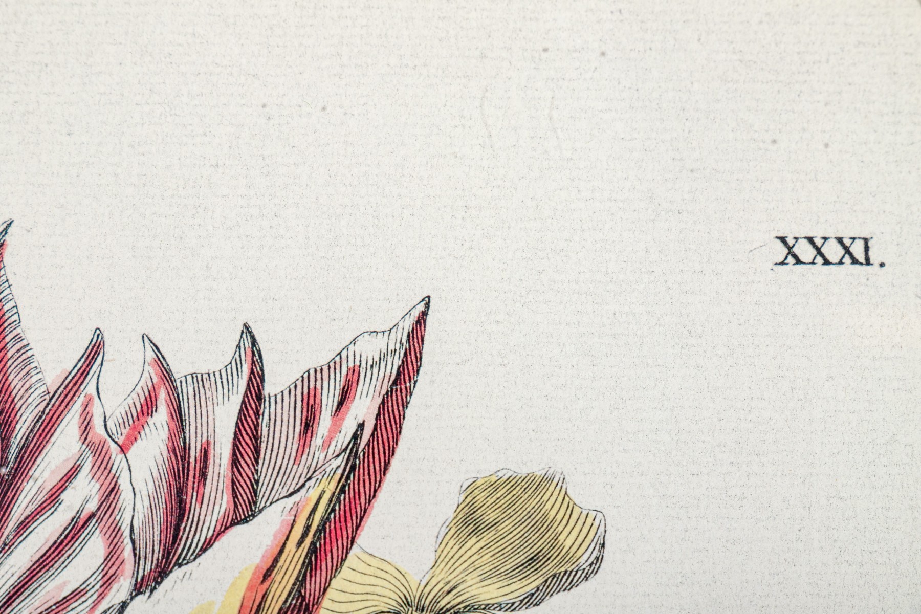 After antique originals. Featuring red and yellow tulips and orange-red auriculas. Presented in fine dark green faux marble and antiqued gilt trimmed Trowbridge frames with glass.