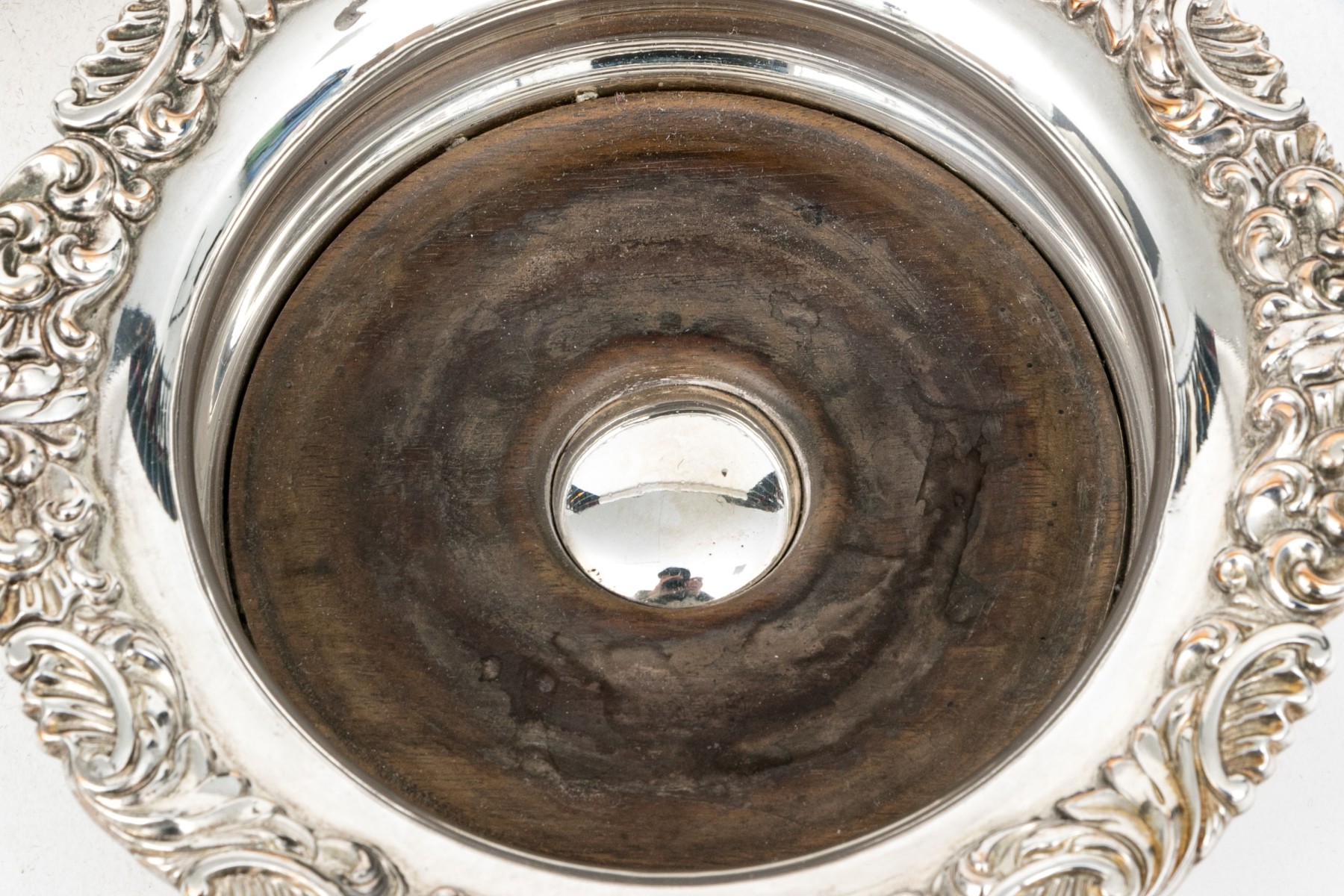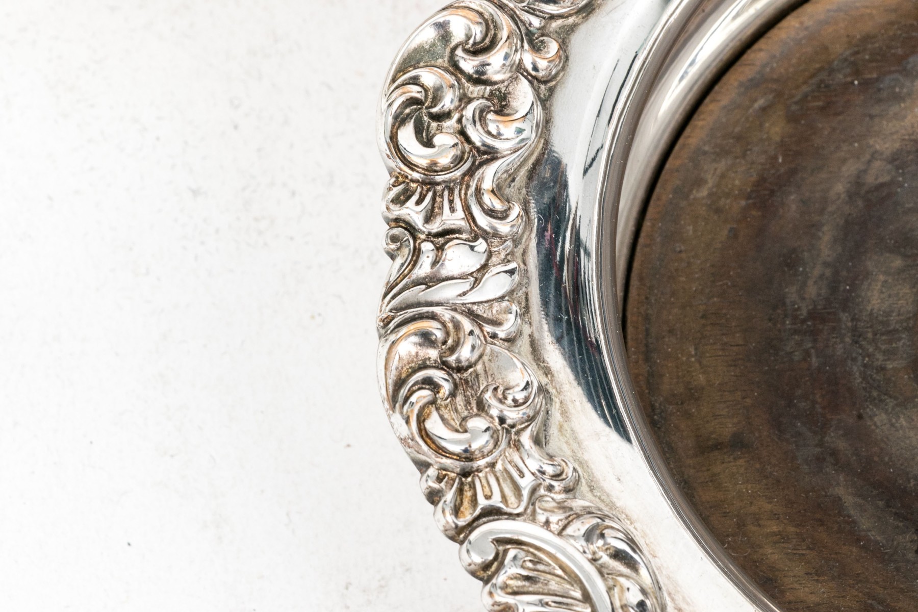 Both with fine raised foliate scrolled rims in a re-plated highly polished finish with wooden centers.