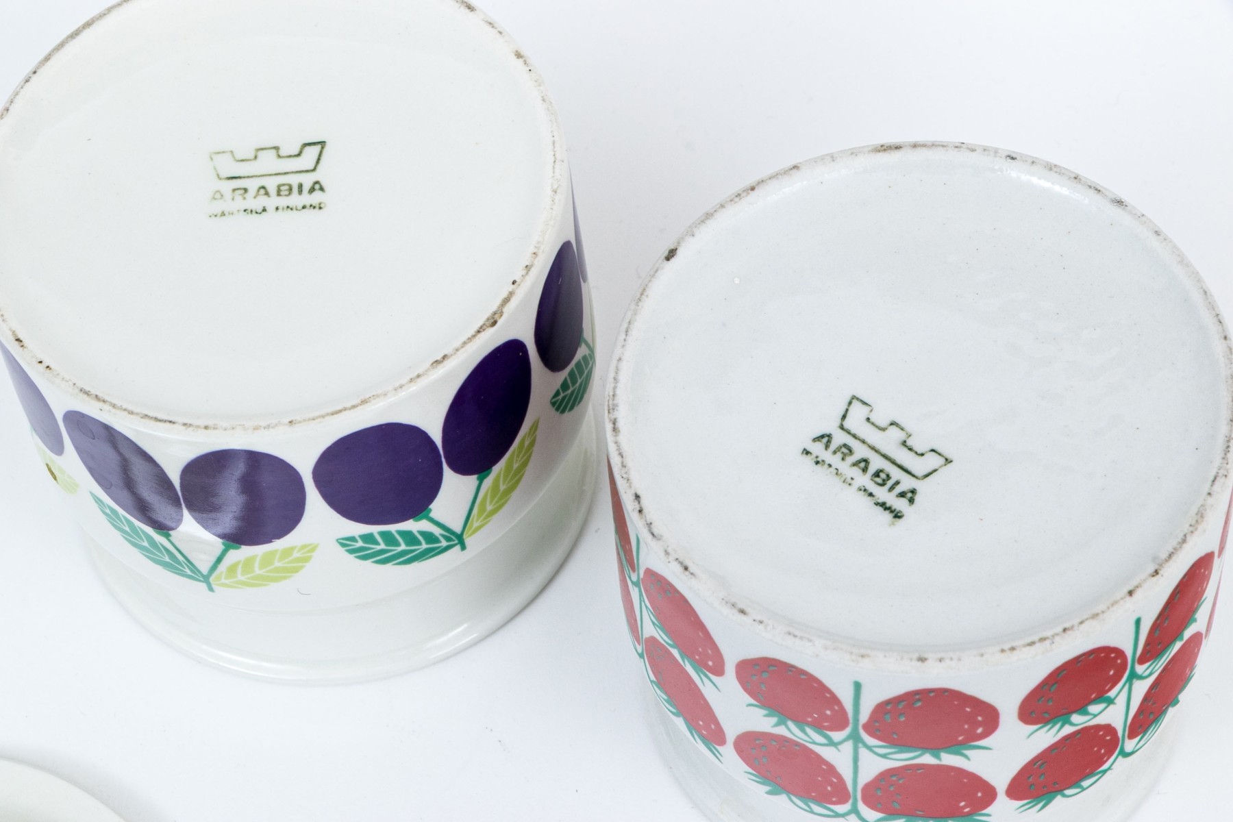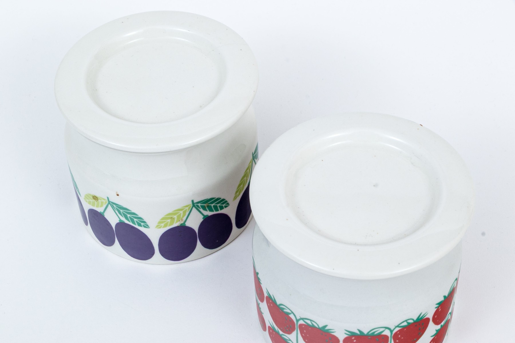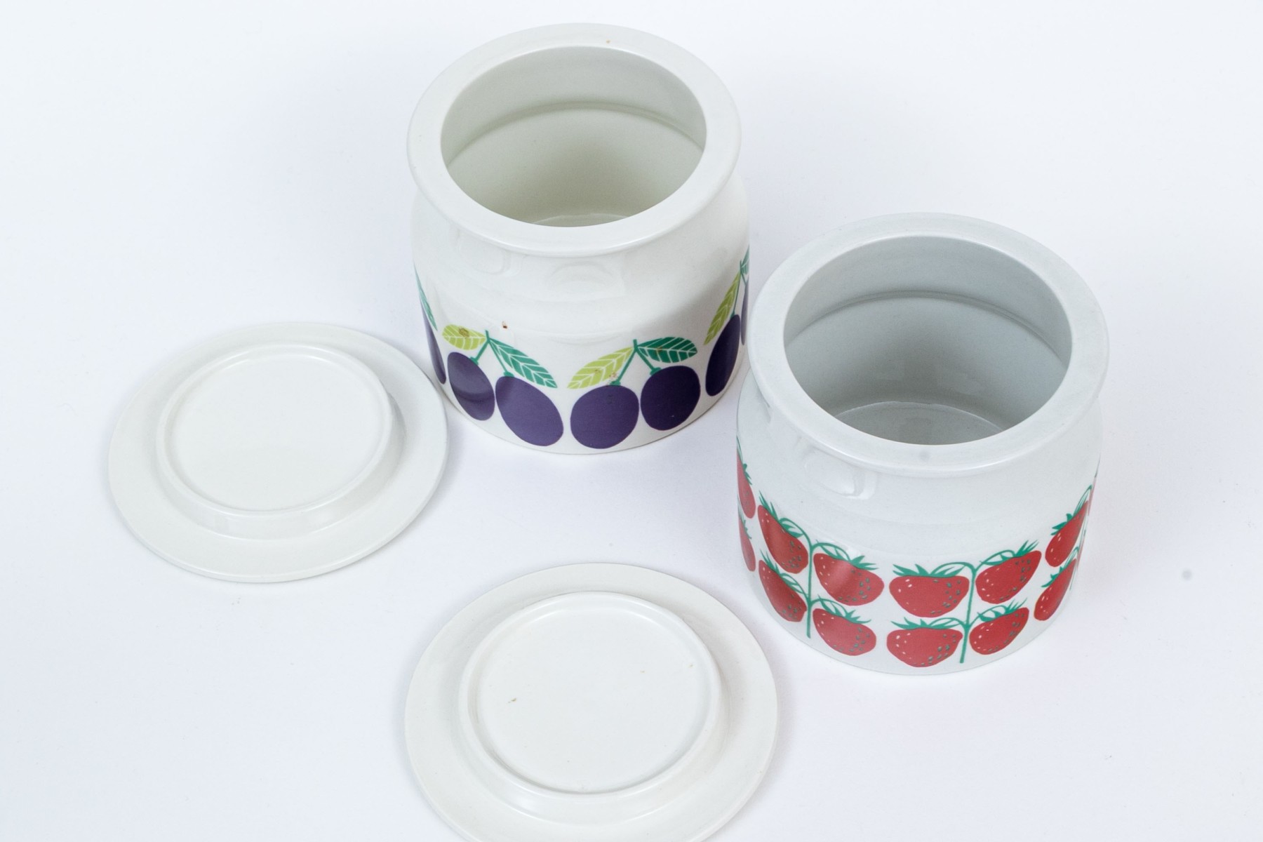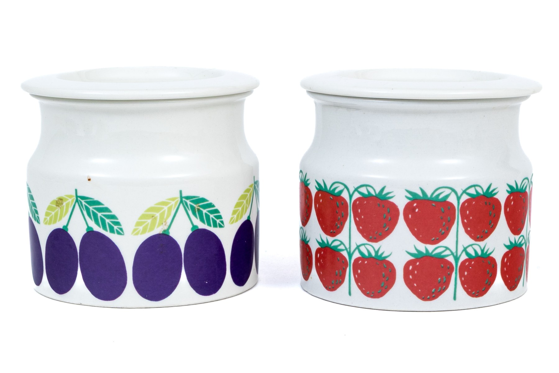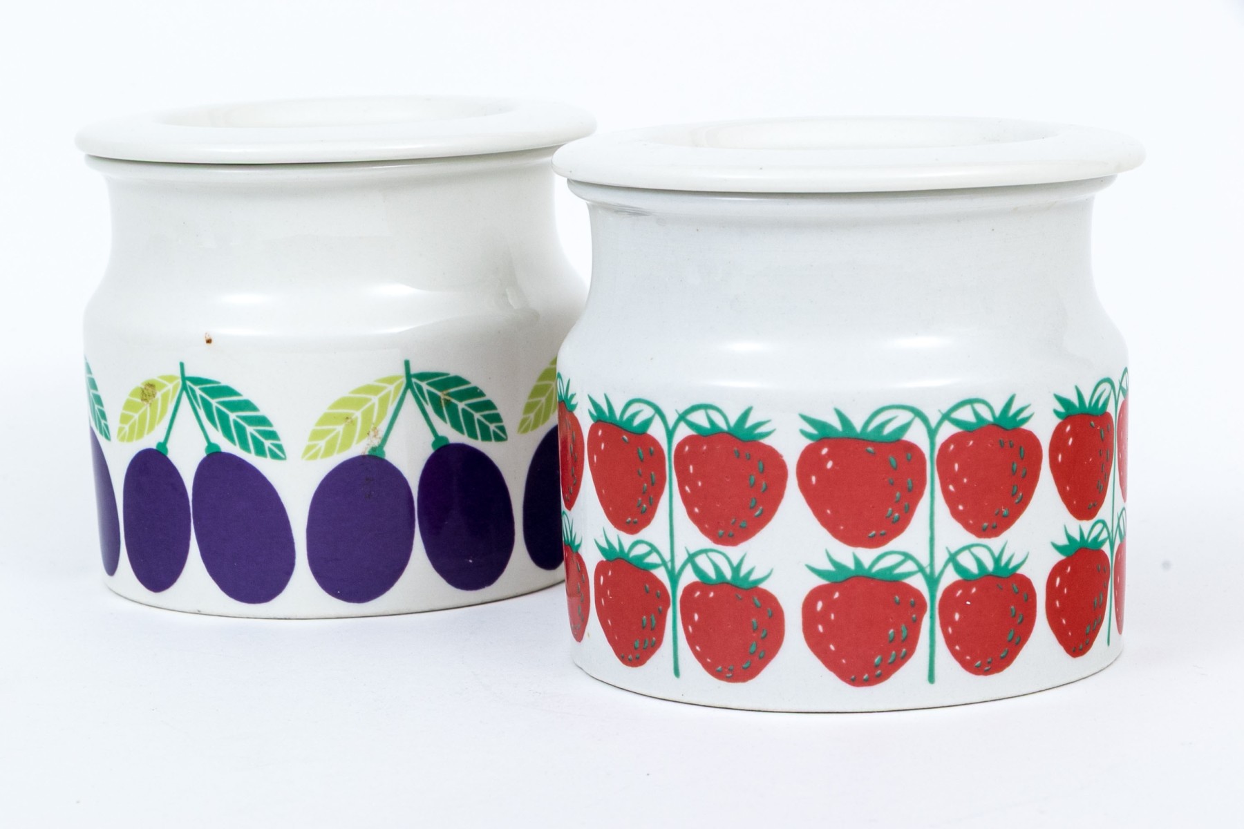 A fun pair of Finnish Arabia ceramic lidded jars. One with strawberries decoration and the second with plums decoration, with lids to each. Marked underfoot.