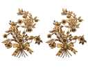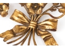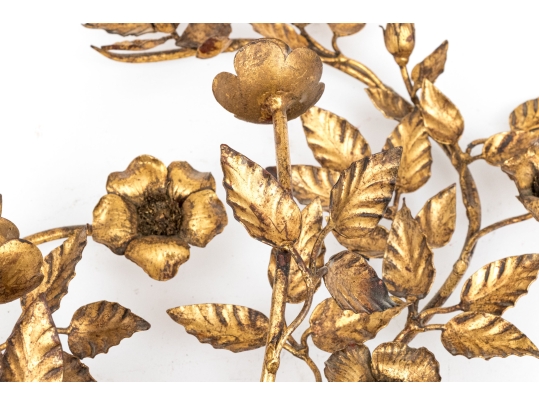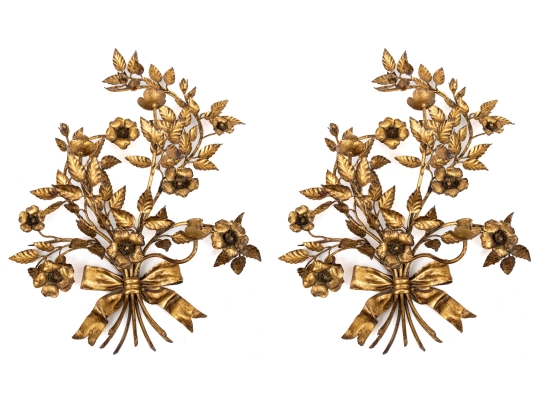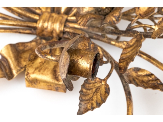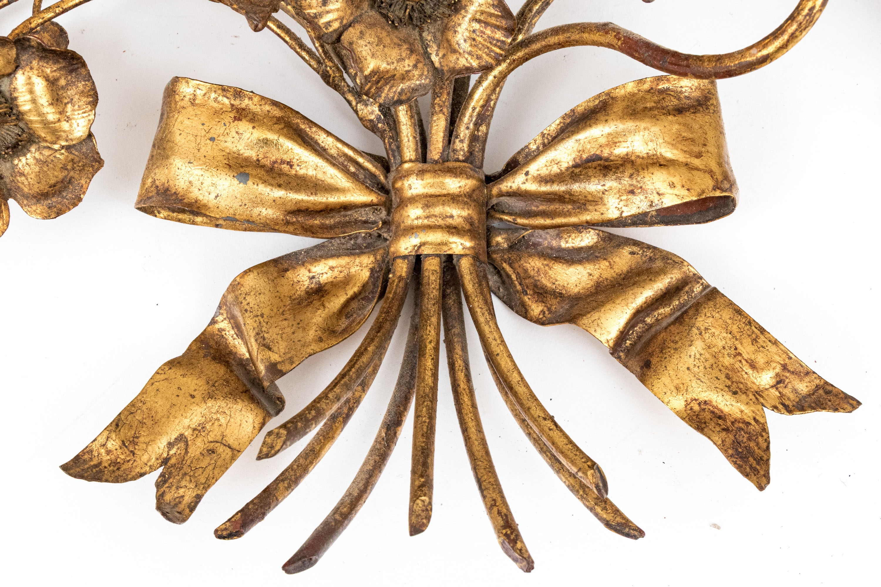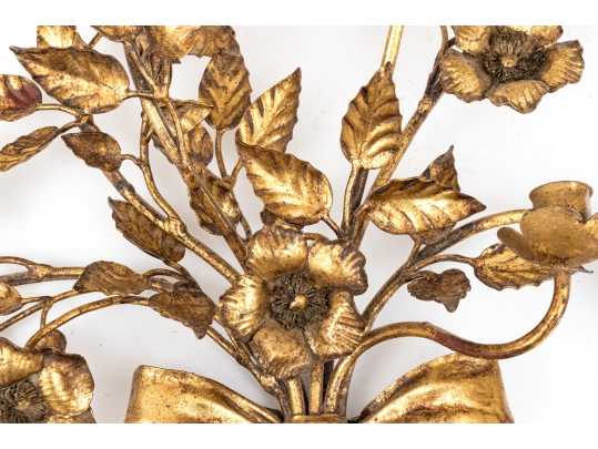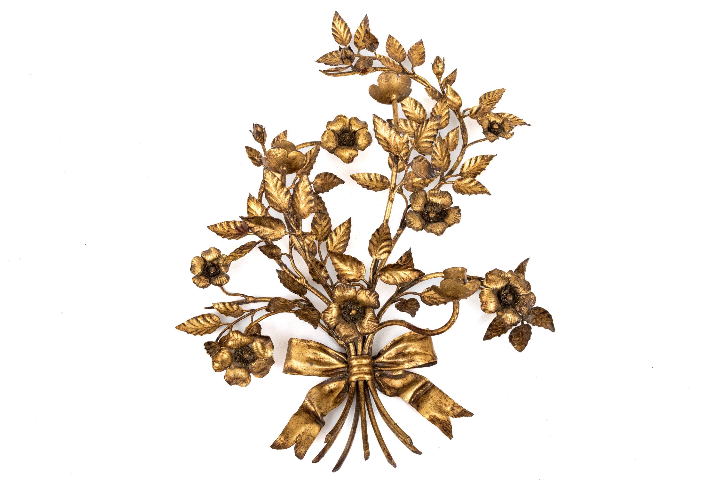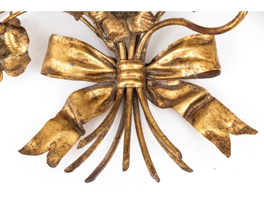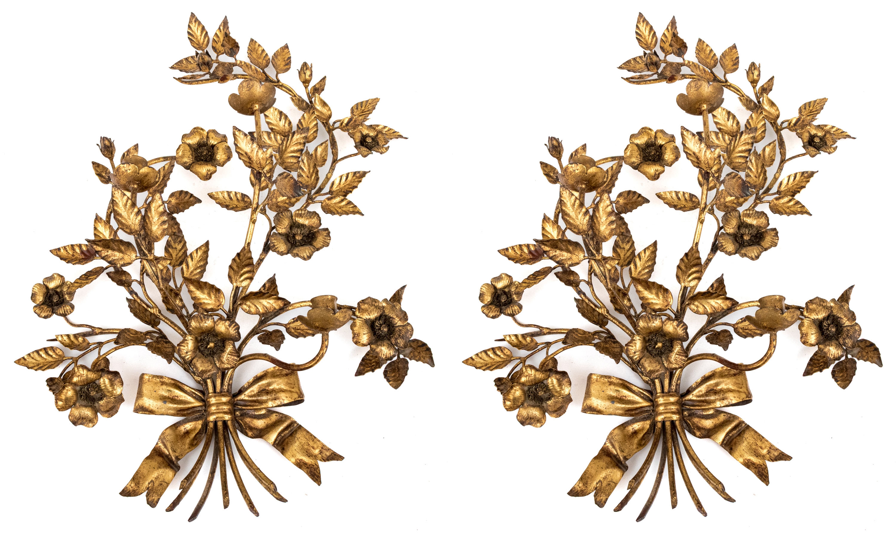 A pair of Florentine gilt metal wall sconces with floral bouquet motifs incorporating winding vines, pointed leaves, and three petaled sconces for candles. The stems meet at the center bottom with large ribbon bow.