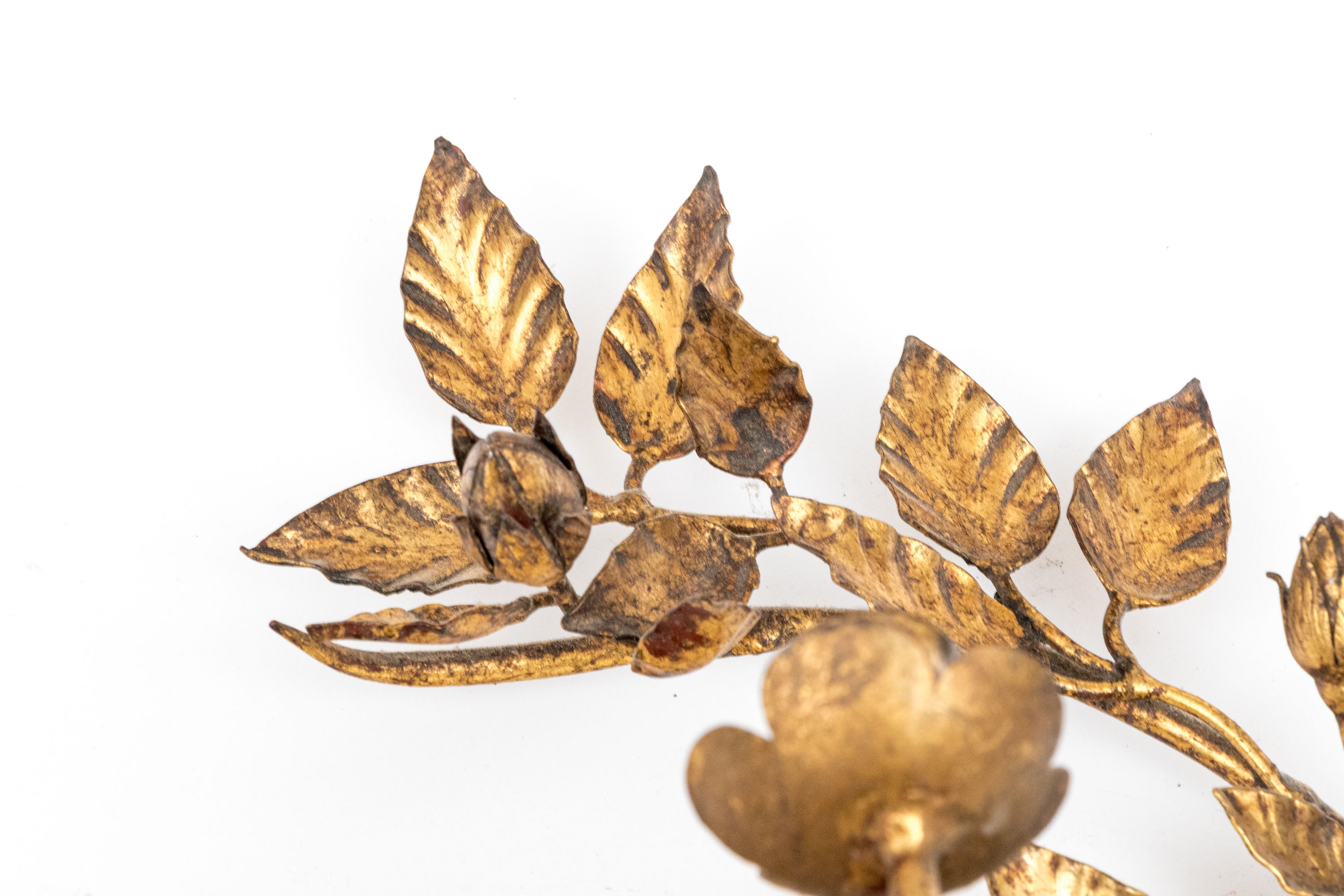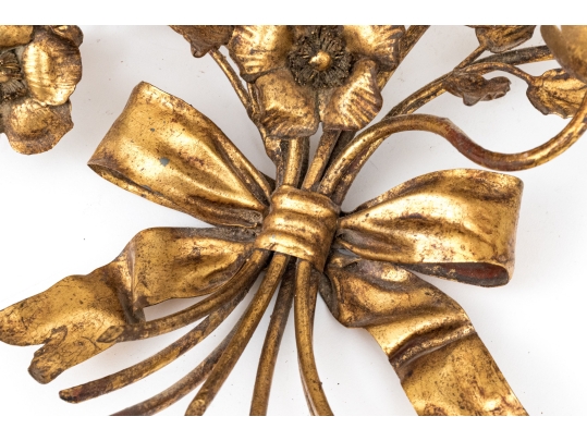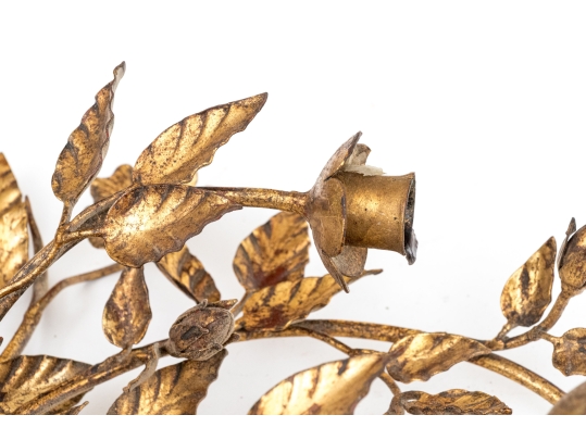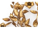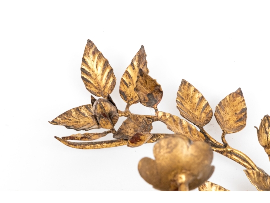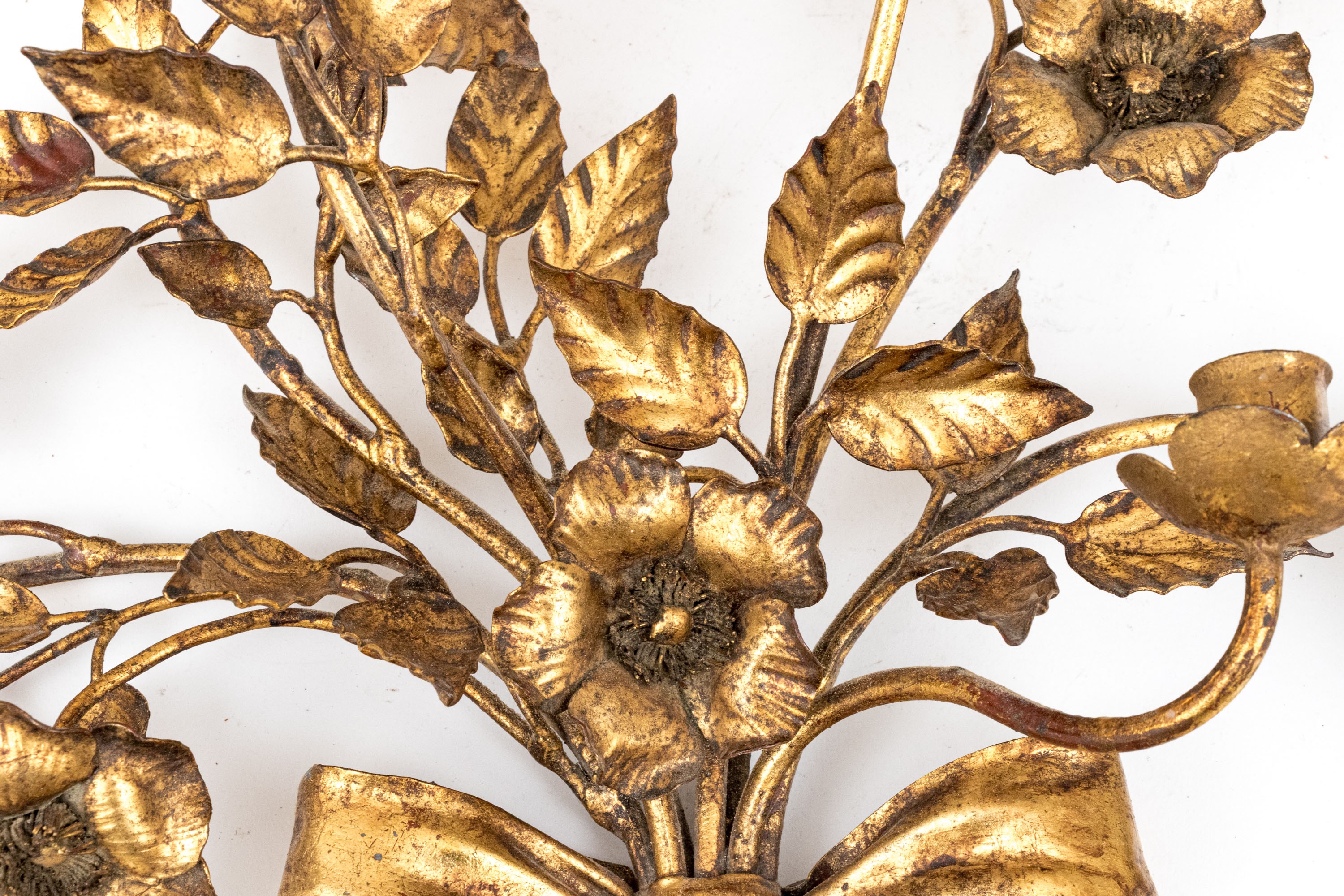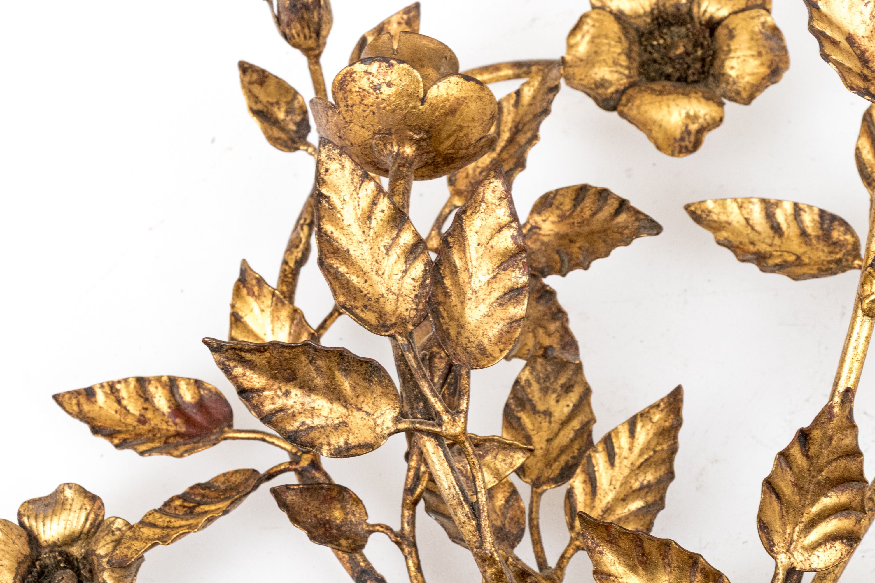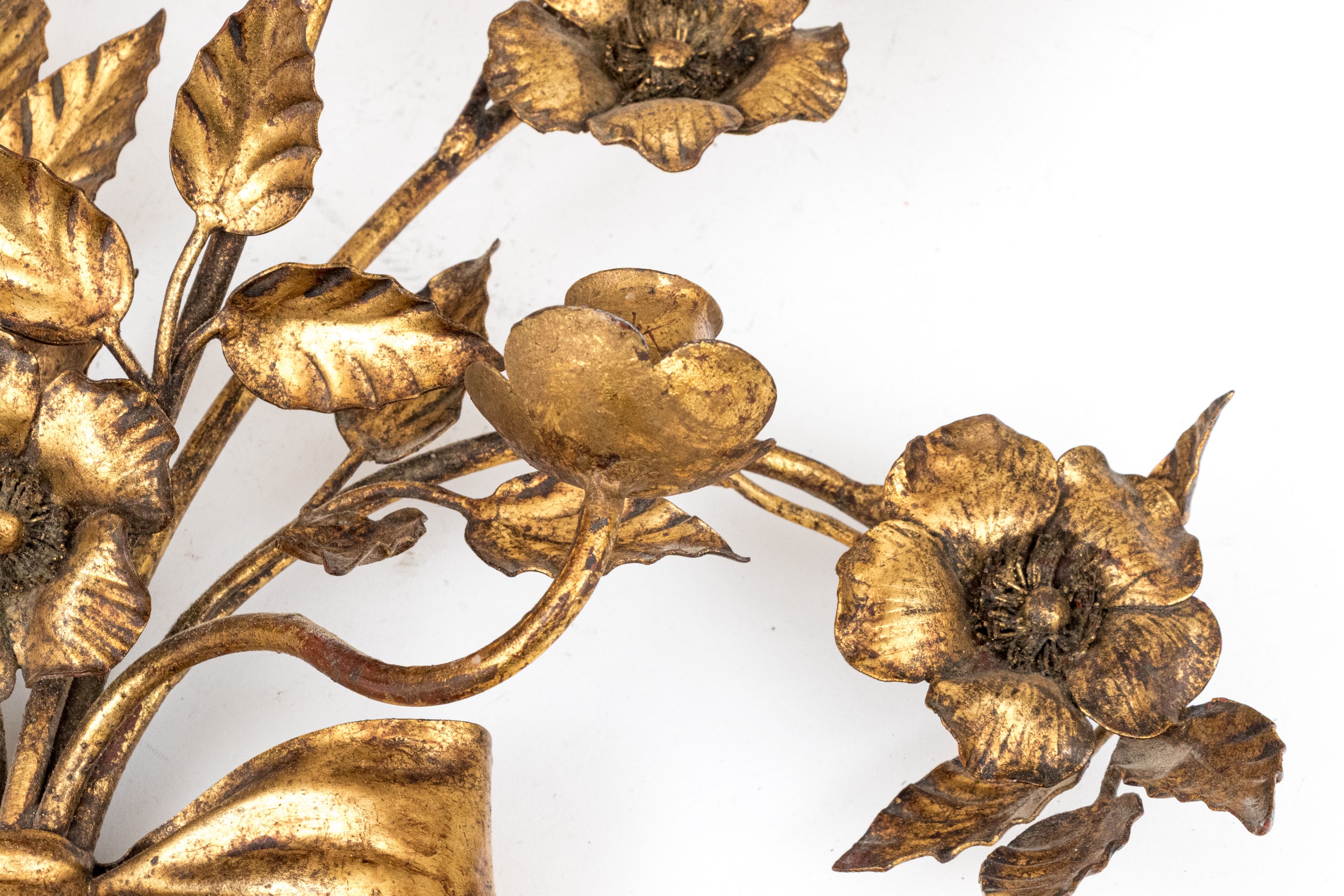 A pair of Florentine gilt metal wall sconces with floral bouquet motifs incorporating winding vines, pointed leaves, and three petaled sconces for candles. The stems meet at the center bottom with large ribbon bow.