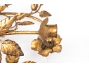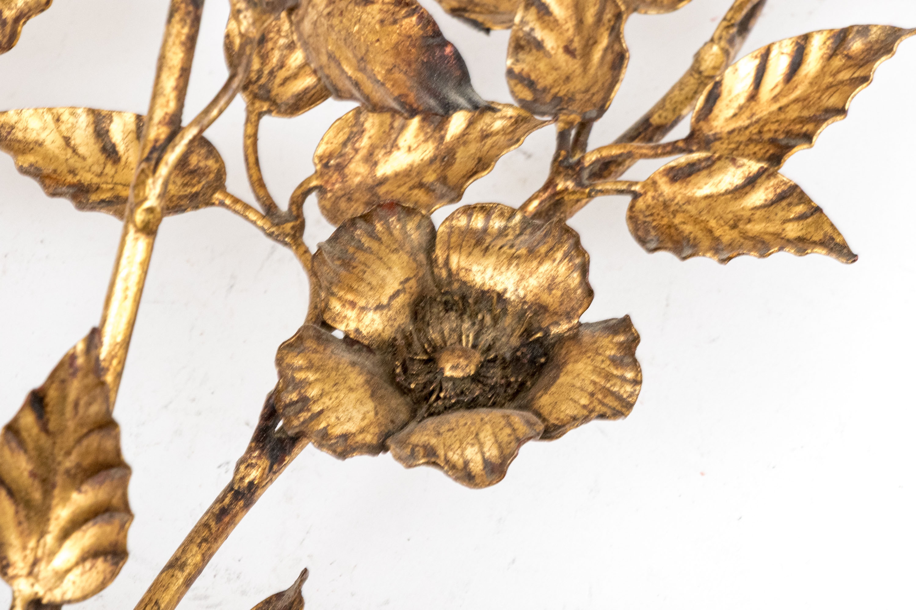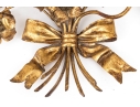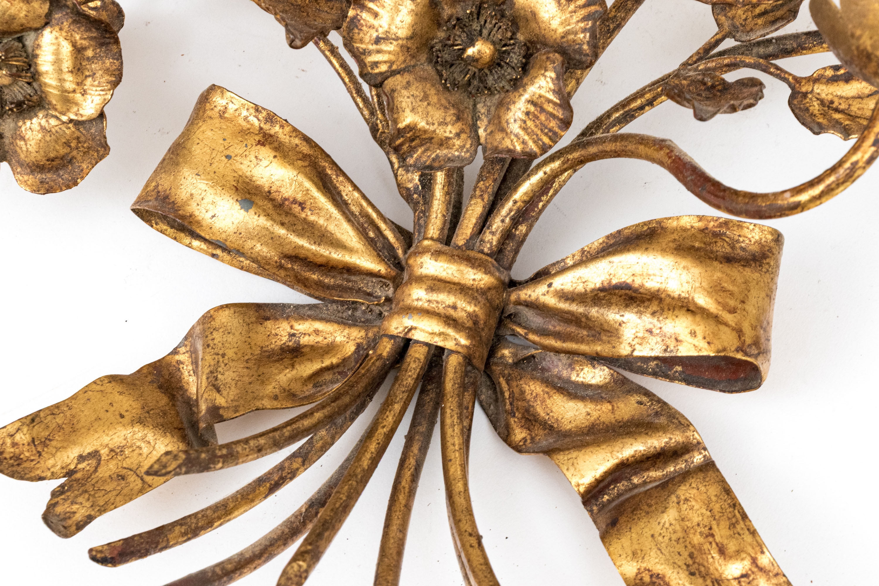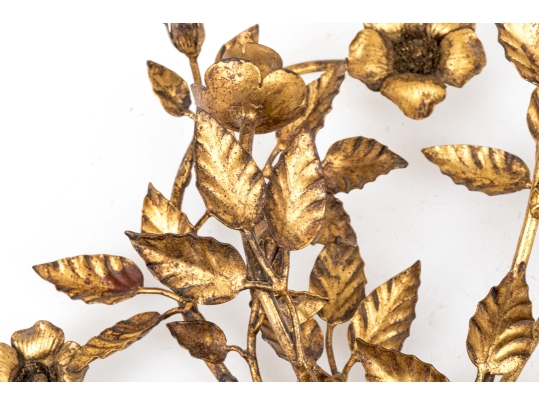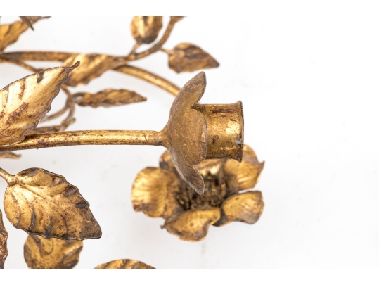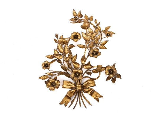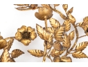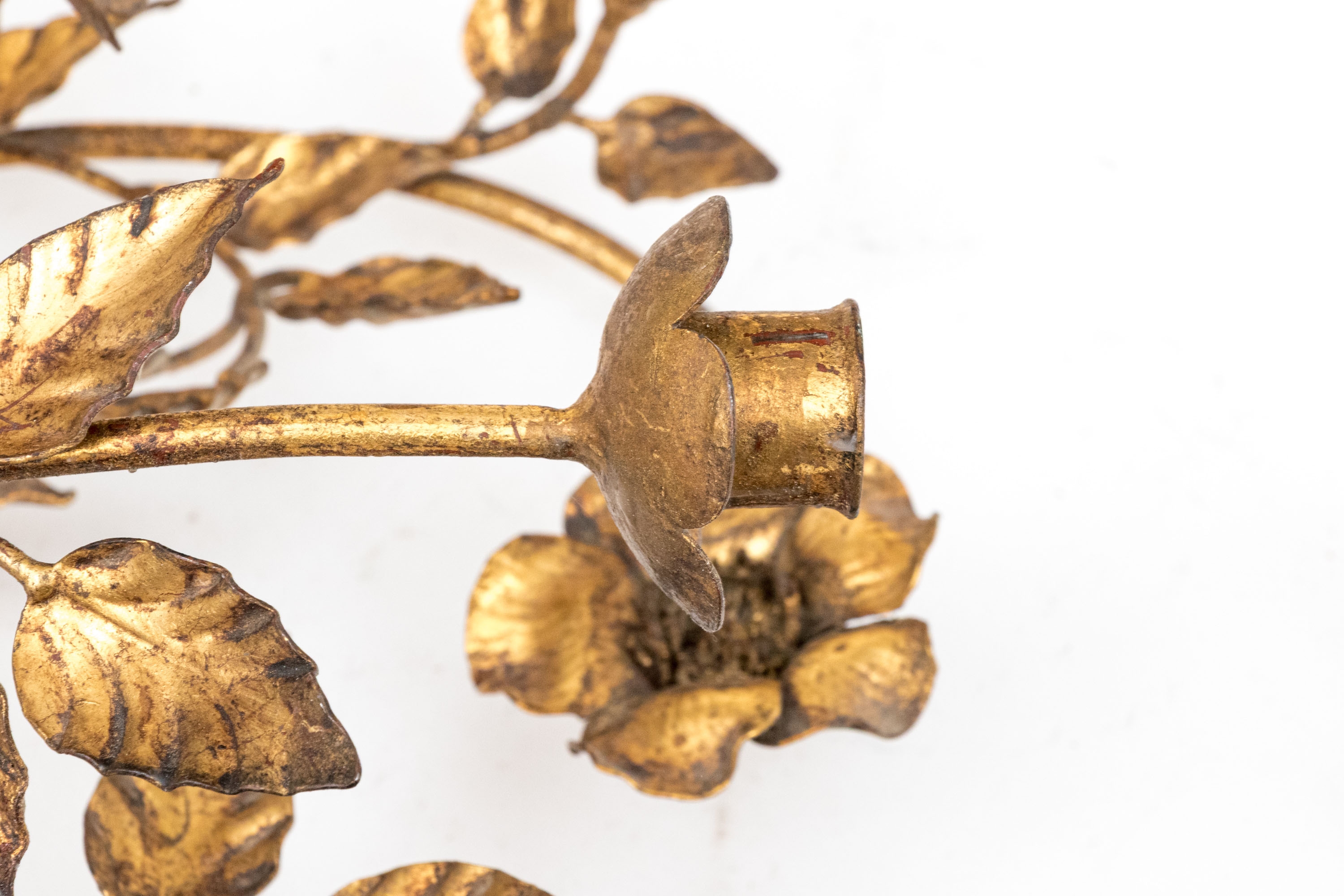 A pair of Florentine gilt metal wall sconces with floral bouquet motifs incorporating winding vines, pointed leaves, and three petaled sconces for candles. The stems meet at the center bottom with large ribbon bow.